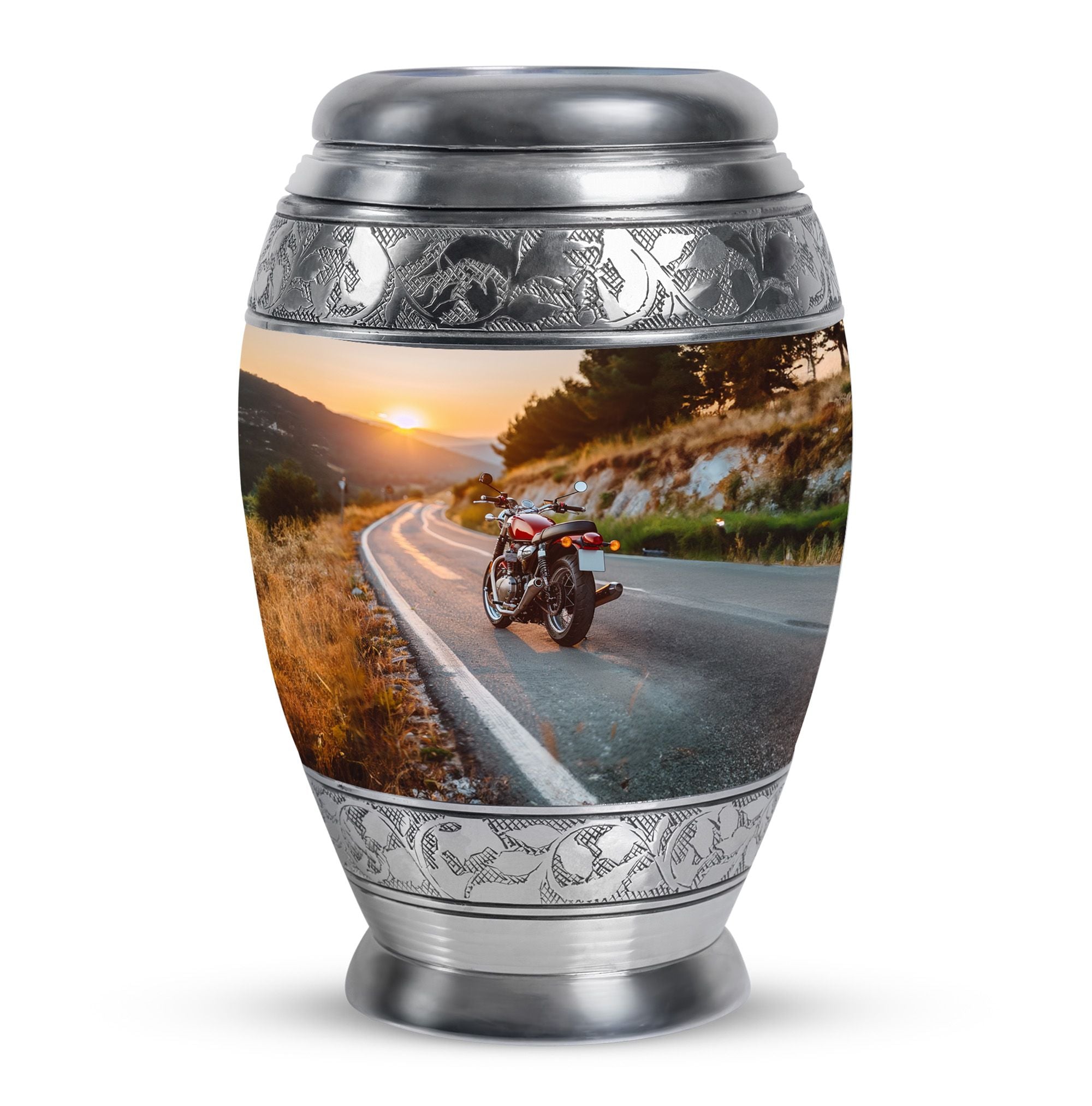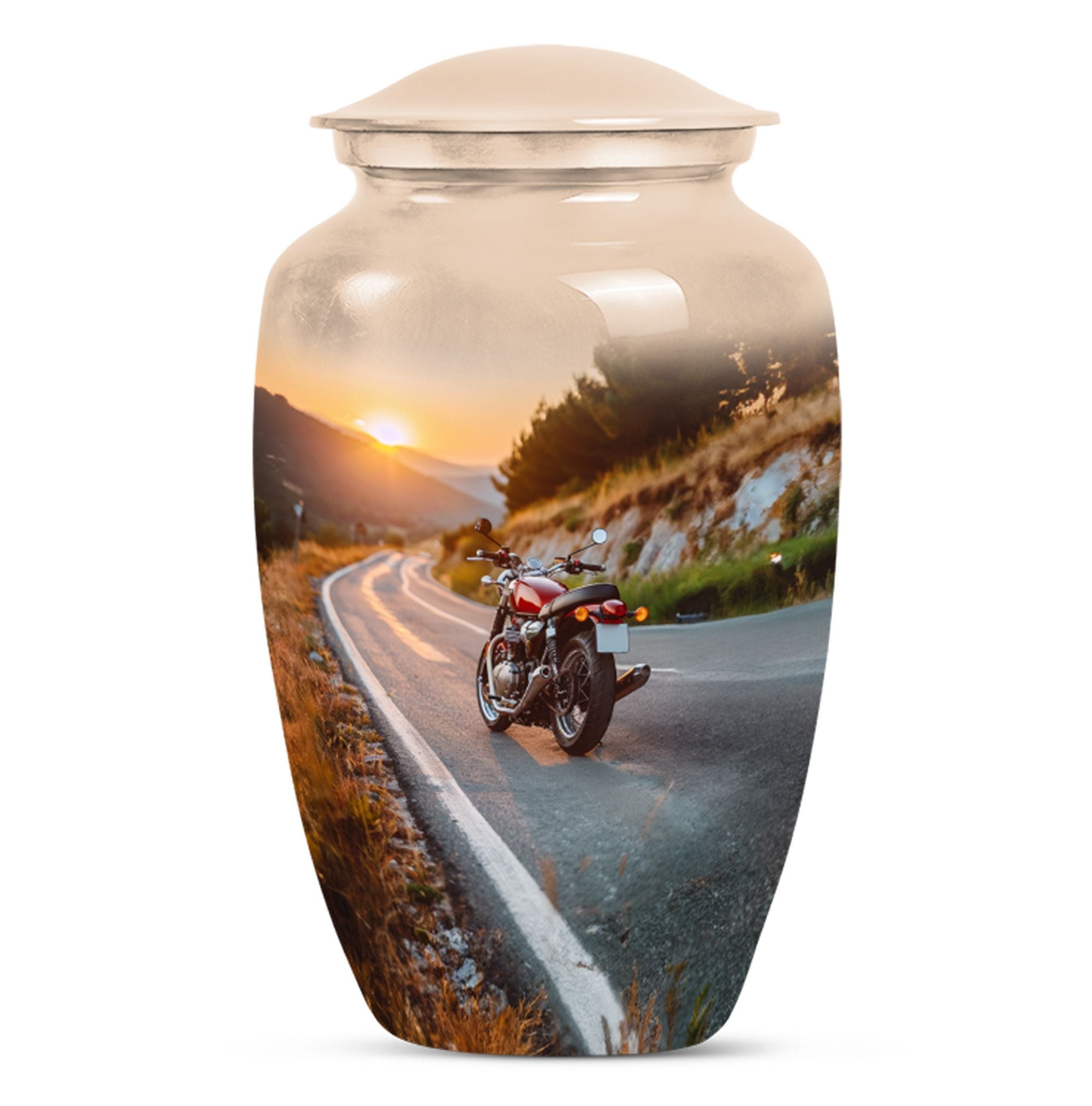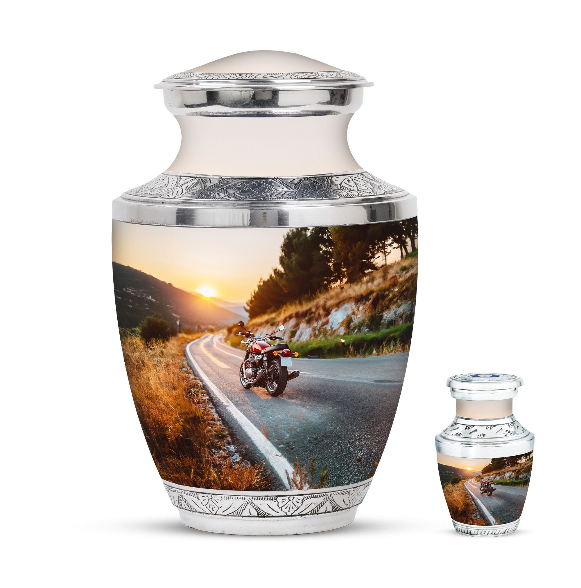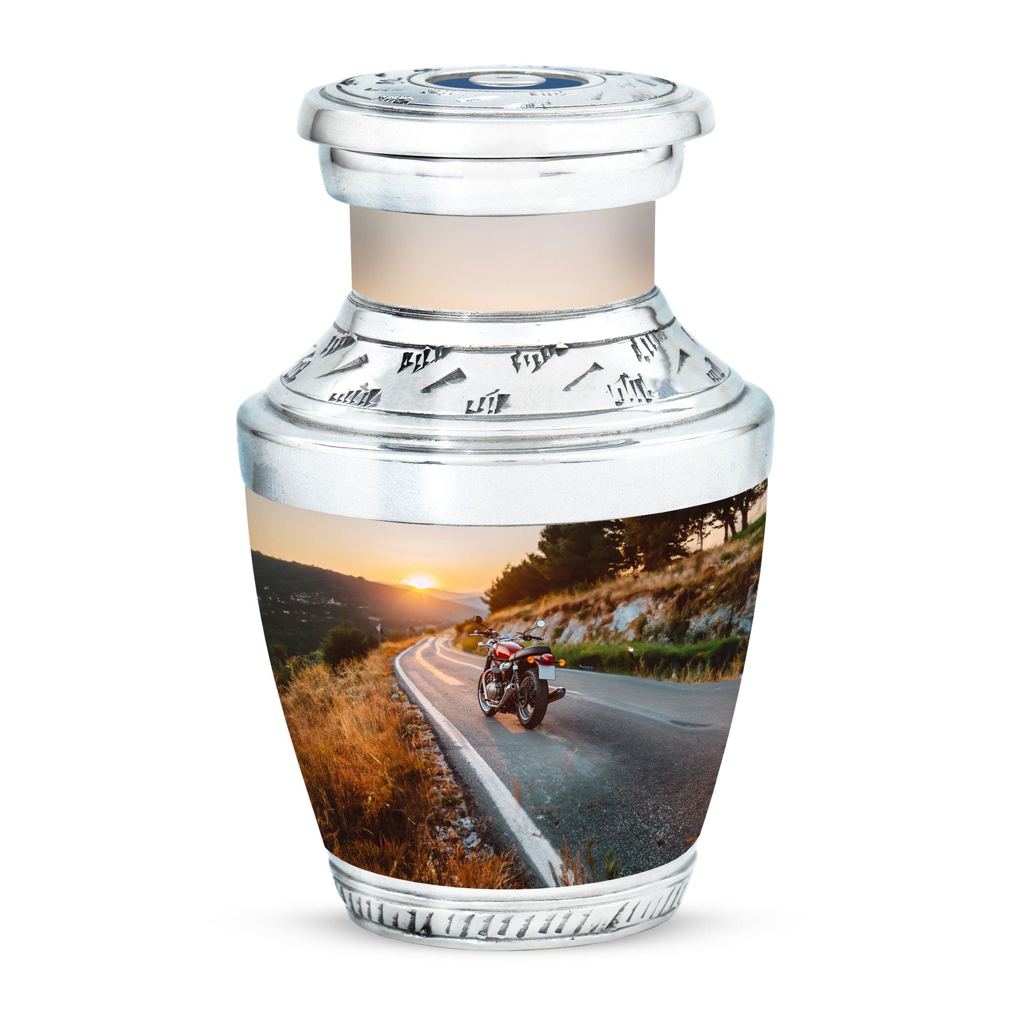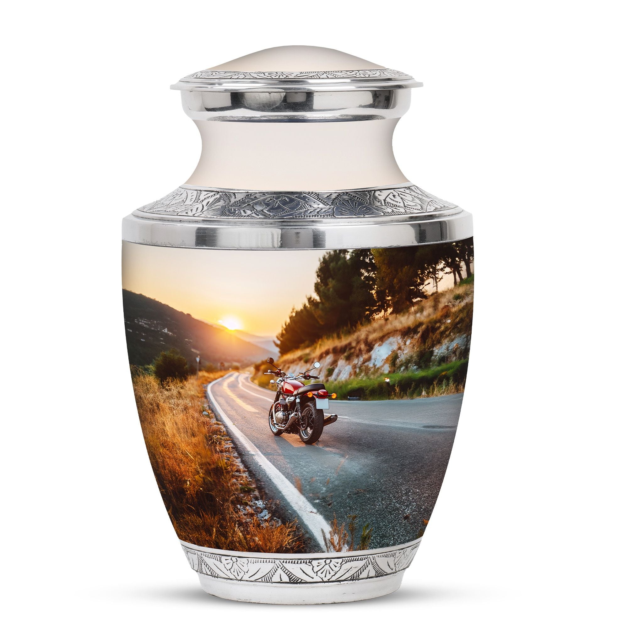 Crafted with high-quality aluminium, this urn showcases a detailed motorbike design against a roadways theme, symbolizing adventure and eternal memories. Its secure screw-top lid ensures safe storage, making it versatile as a small urn for ashes for women, mini urn for ashes for women, or even mini small urns for men. Families seeking cremation urns for women or adult urns for human ashes men will find this design both meaningful and dignified.
