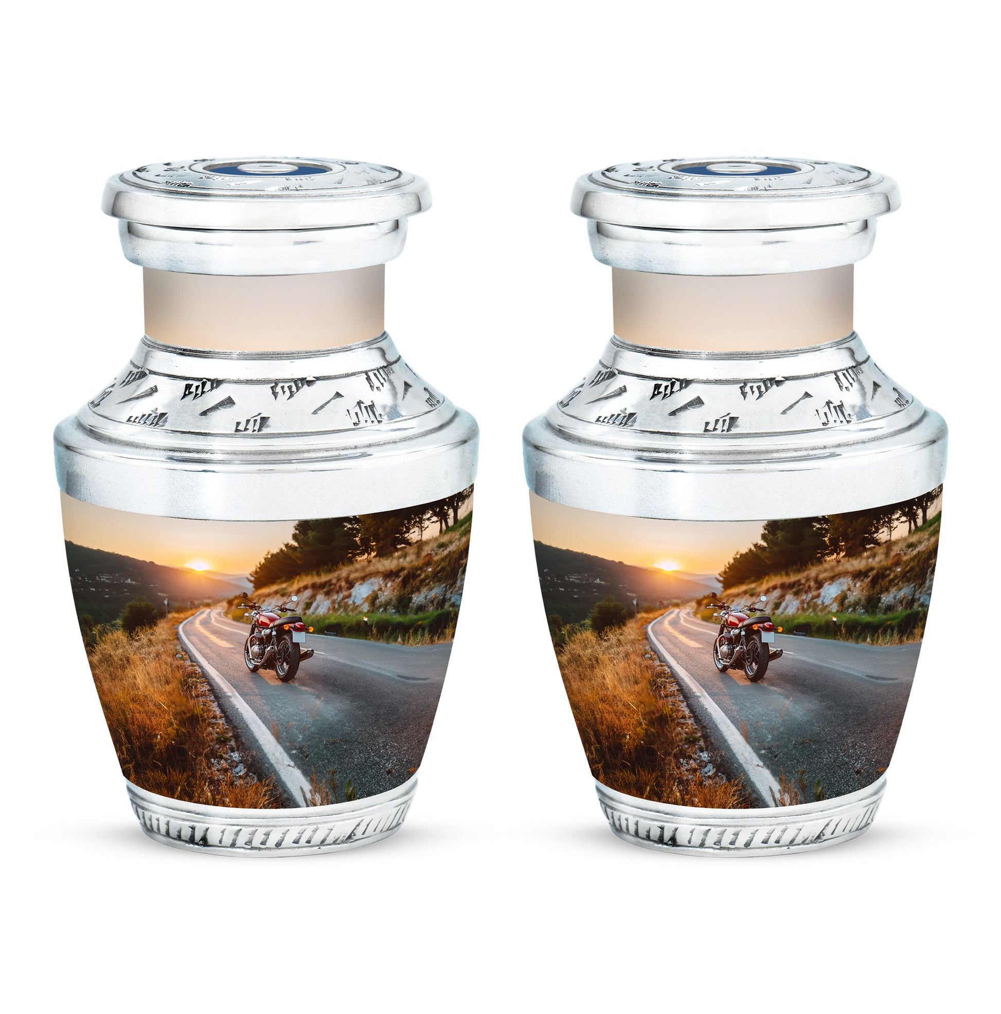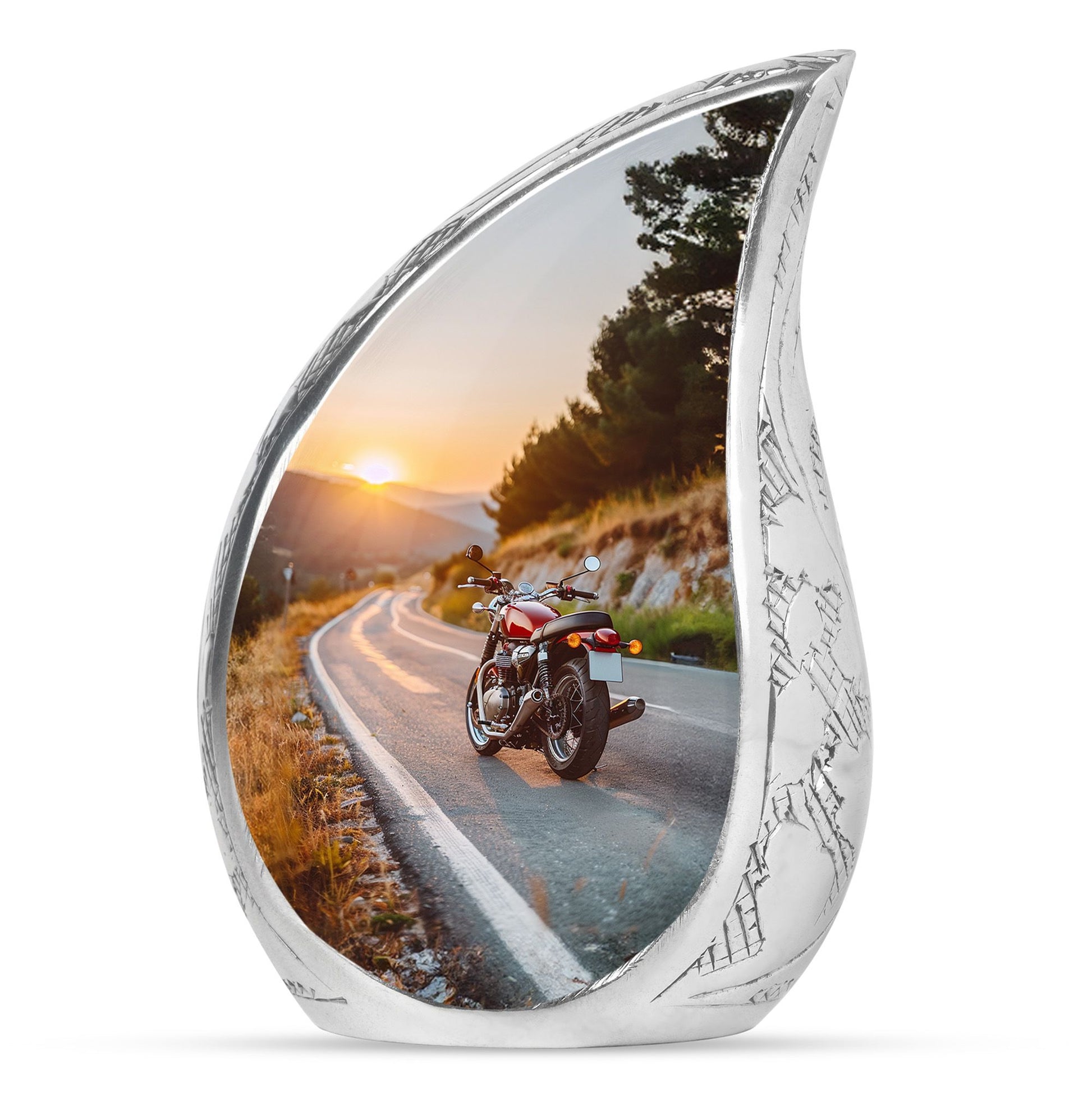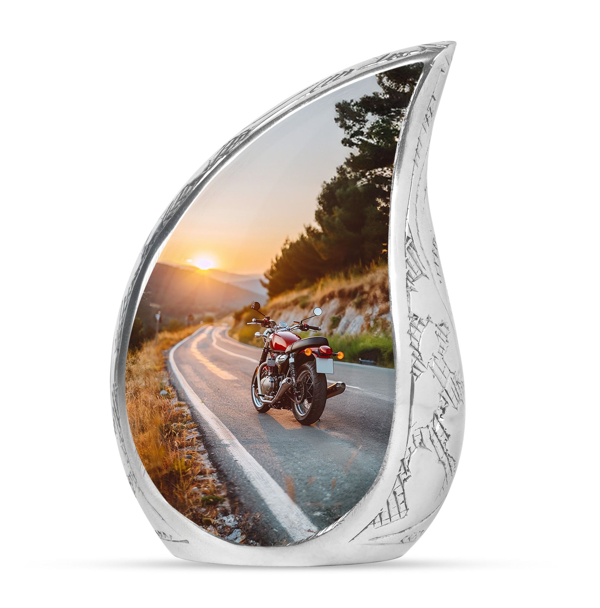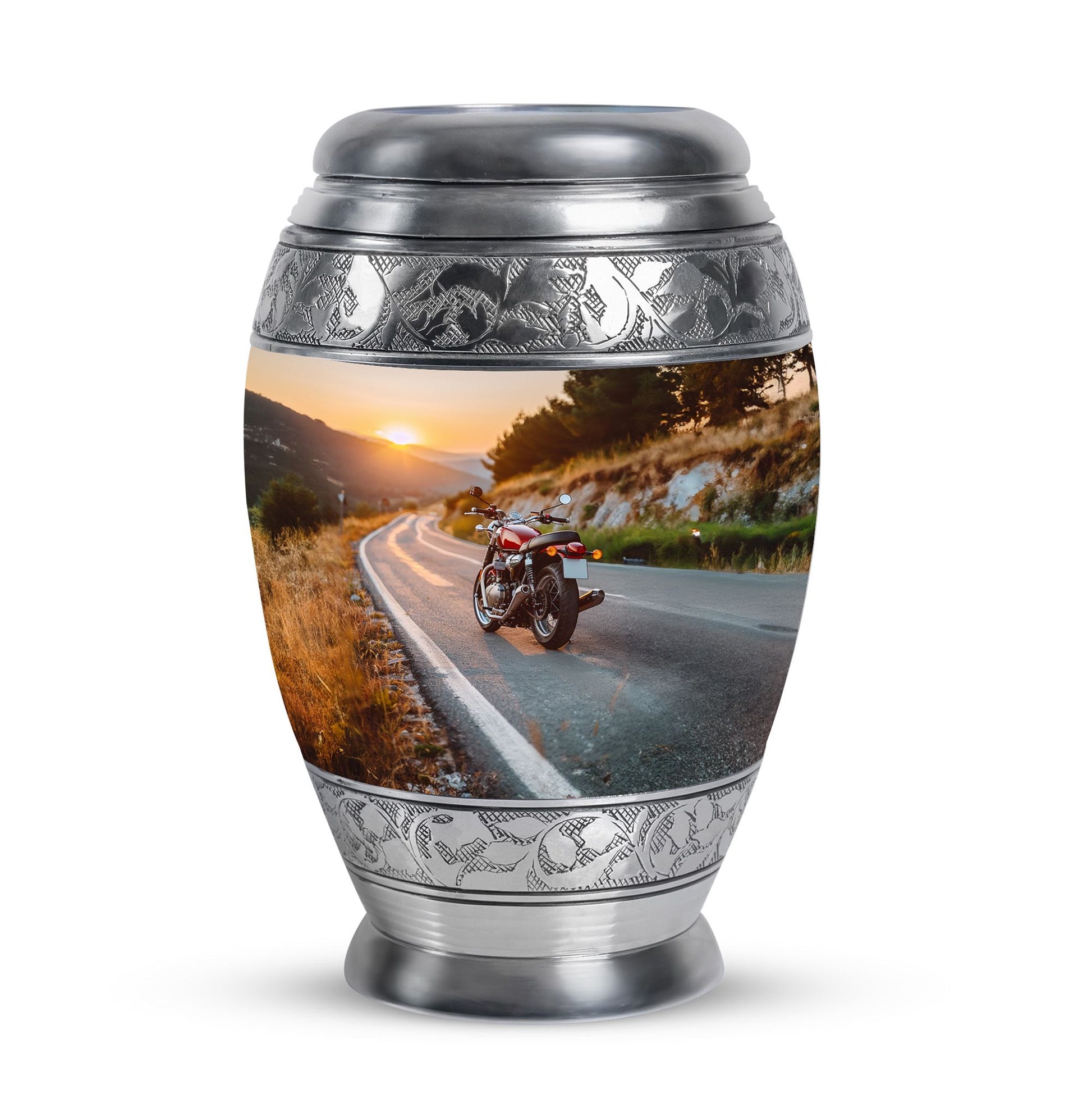 Crafted with high-quality aluminium, this urn showcases a detailed motorbike design against a roadways theme, symbolizing adventure and eternal memories. Its secure screw-top lid ensures safe storage, making it versatile as a small urn for ashes for women, mini urn for ashes for women, or even mini small urns for men. Families seeking cremation urns for women or adult urns for human ashes men will find this design both meaningful and dignified.