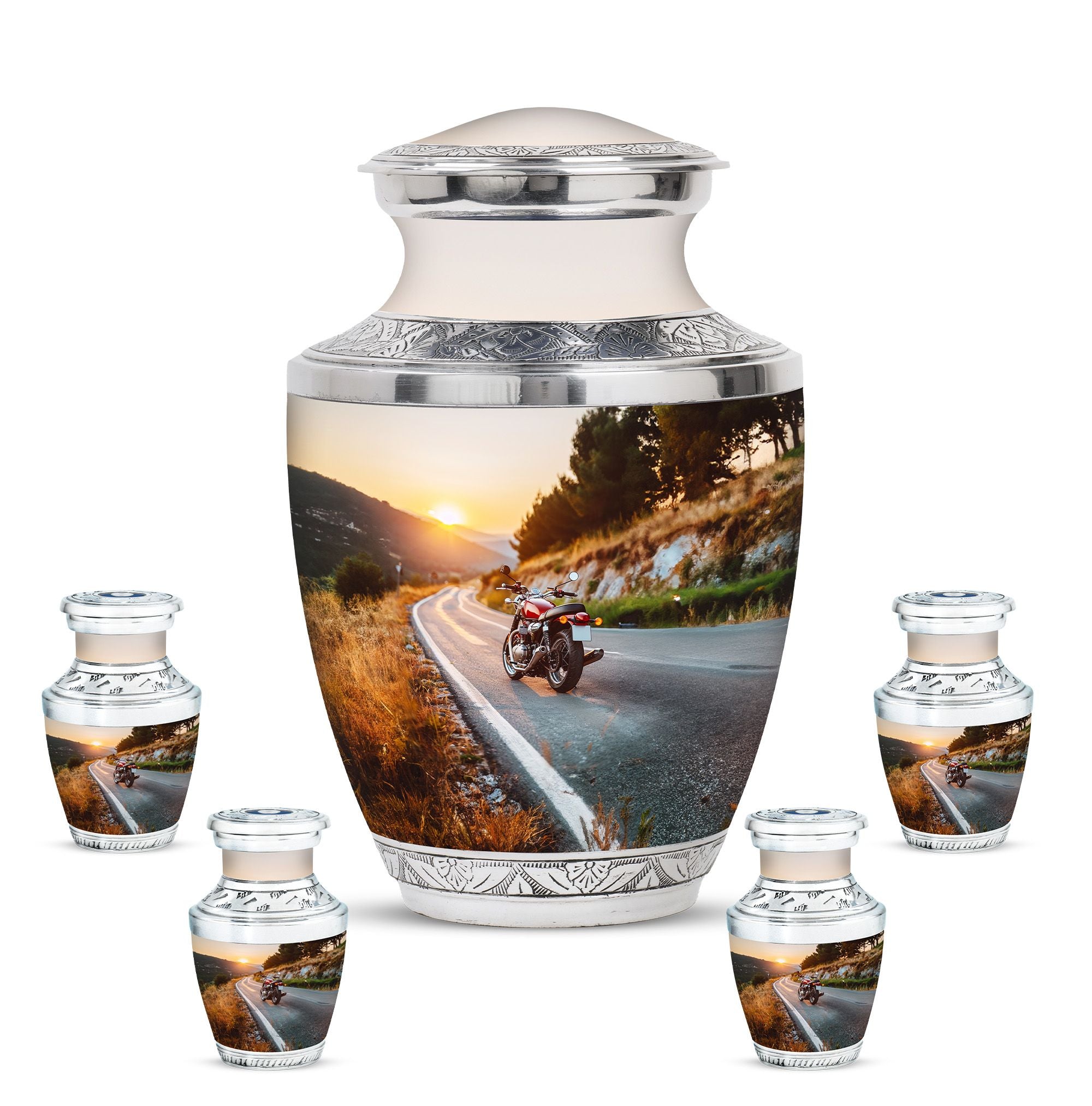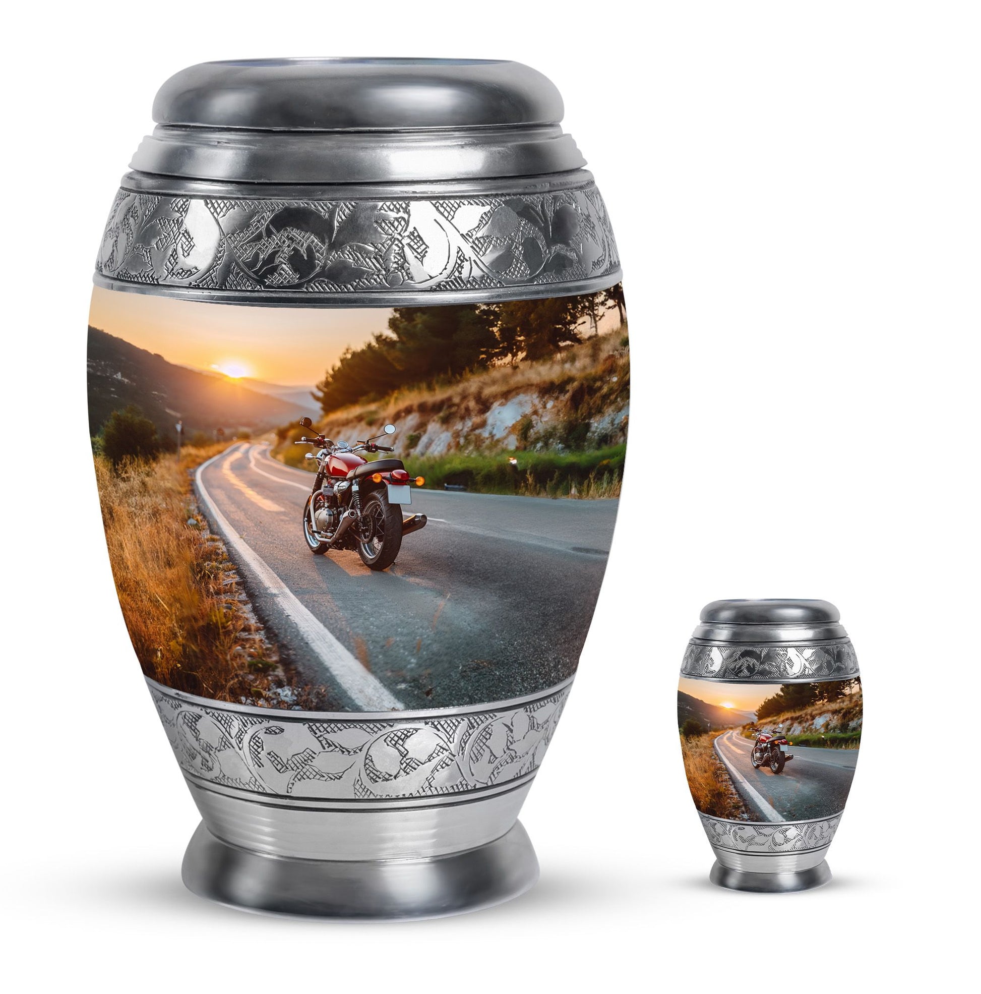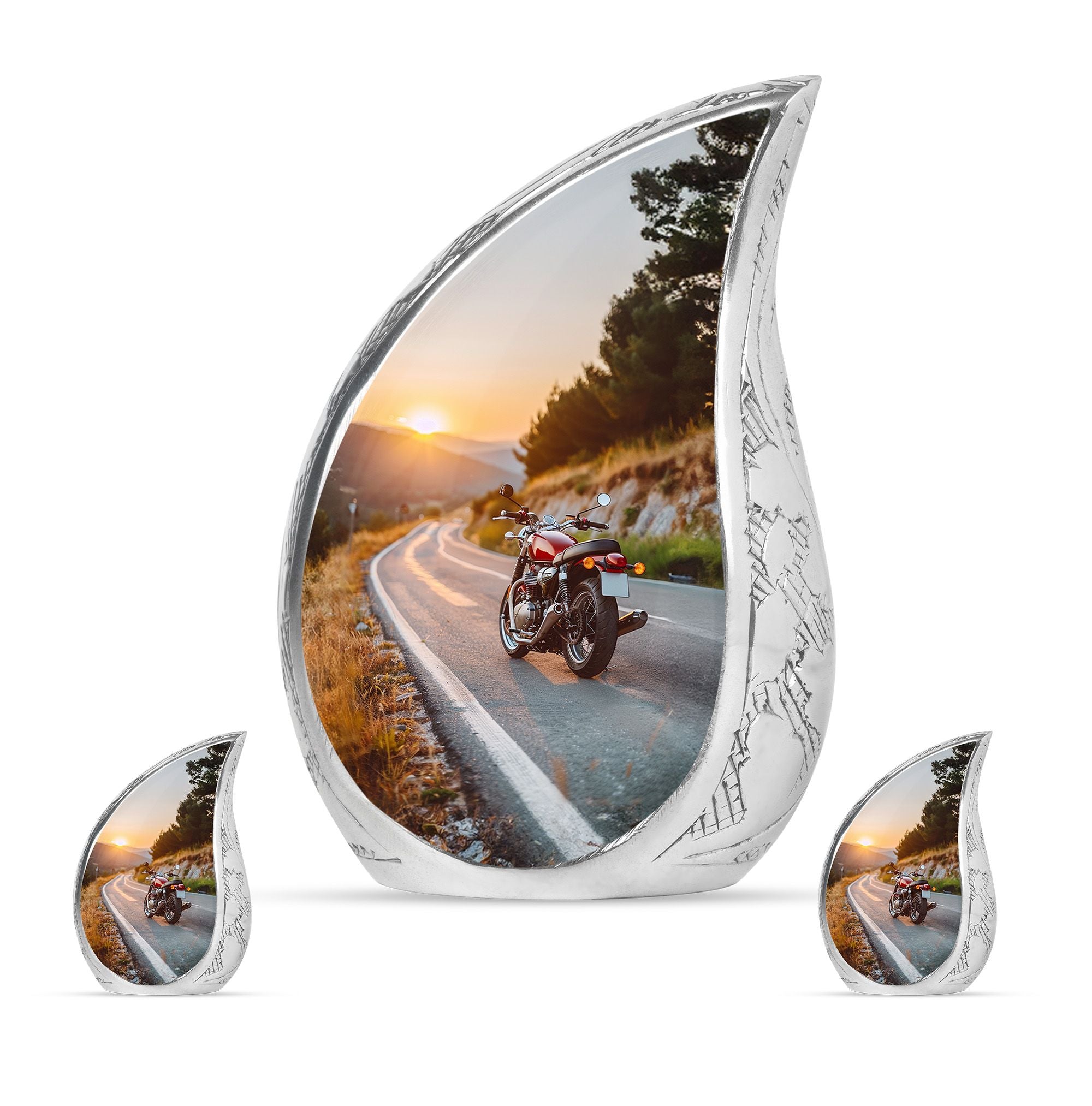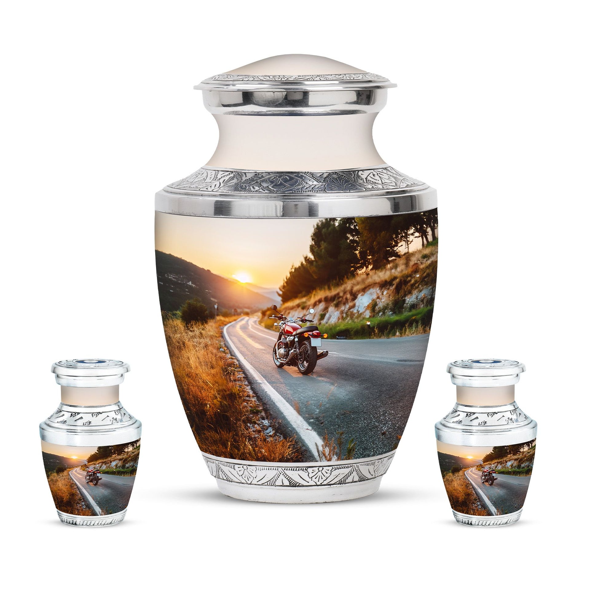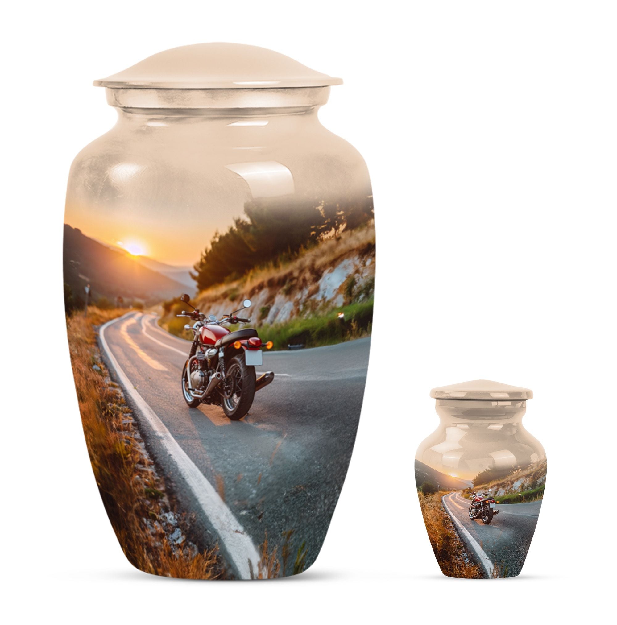 Crafted with high-quality aluminium, this urn showcases a detailed motorbike design against a roadways theme, symbolizing adventure and eternal memories. Its secure screw-top lid ensures safe storage, making it versatile as a small urn for ashes for women, mini urn for ashes for women, or even mini small urns for men. Families seeking cremation urns for women or adult urns for human ashes men will find this design both meaningful and dignified.