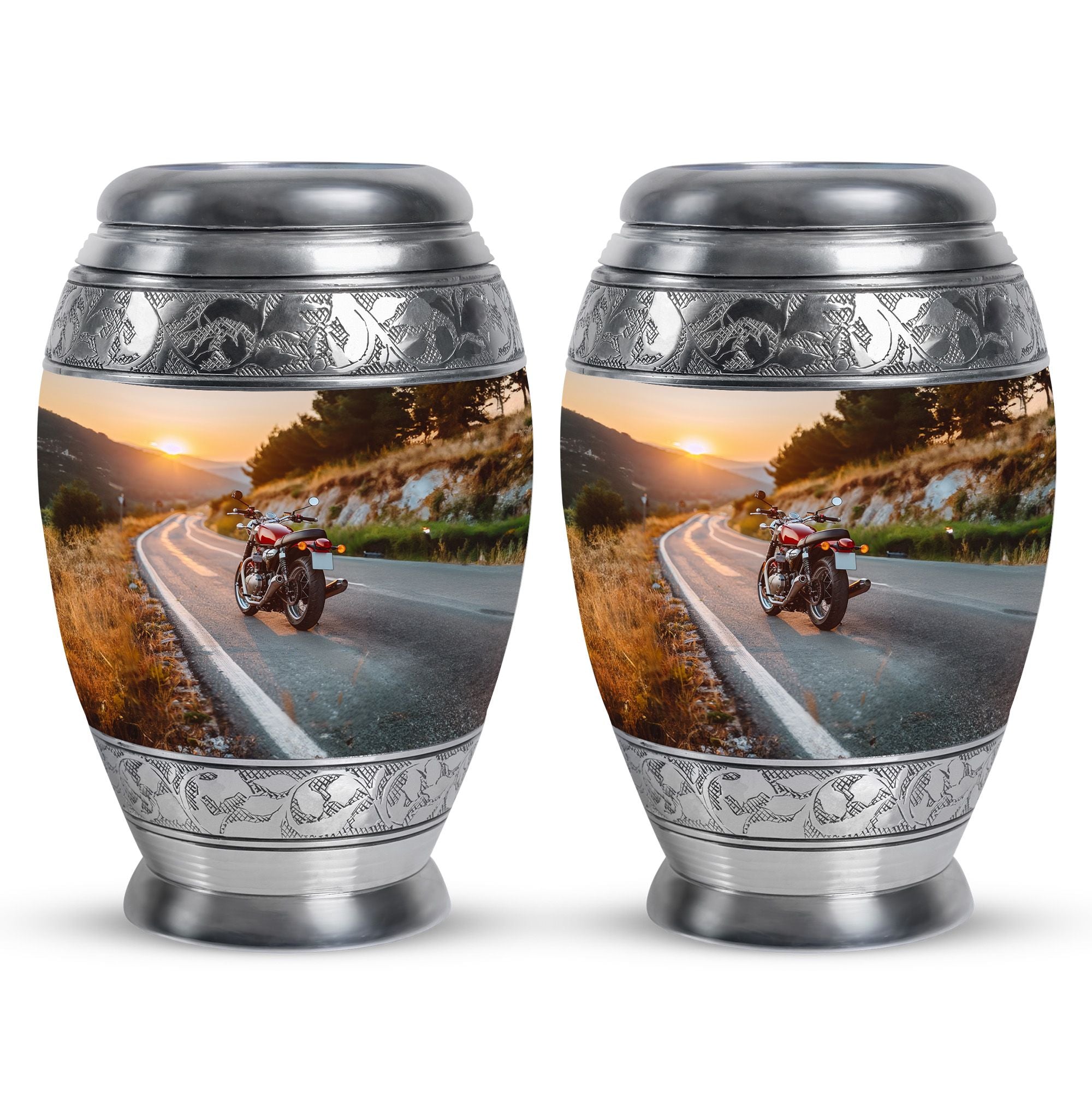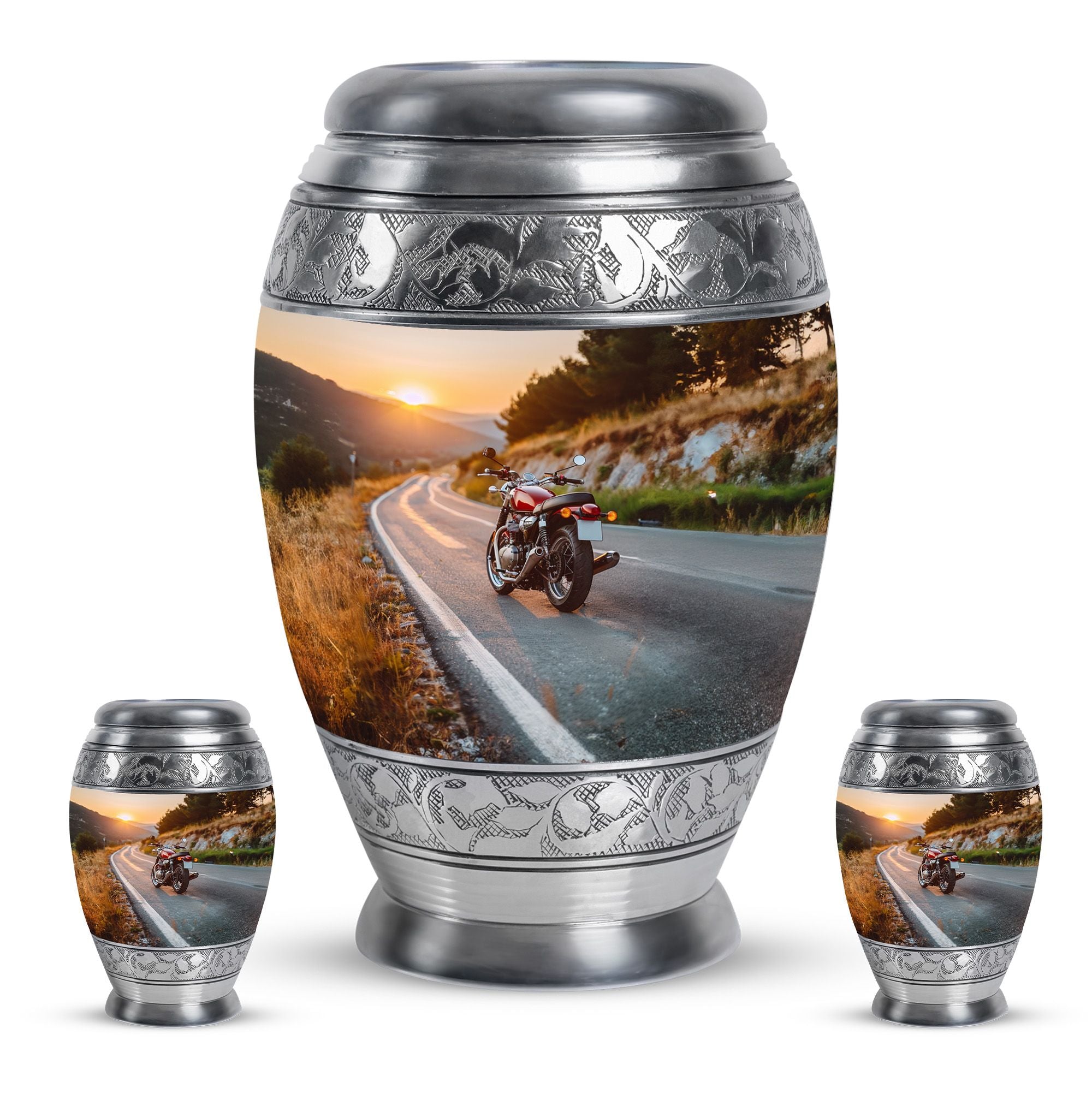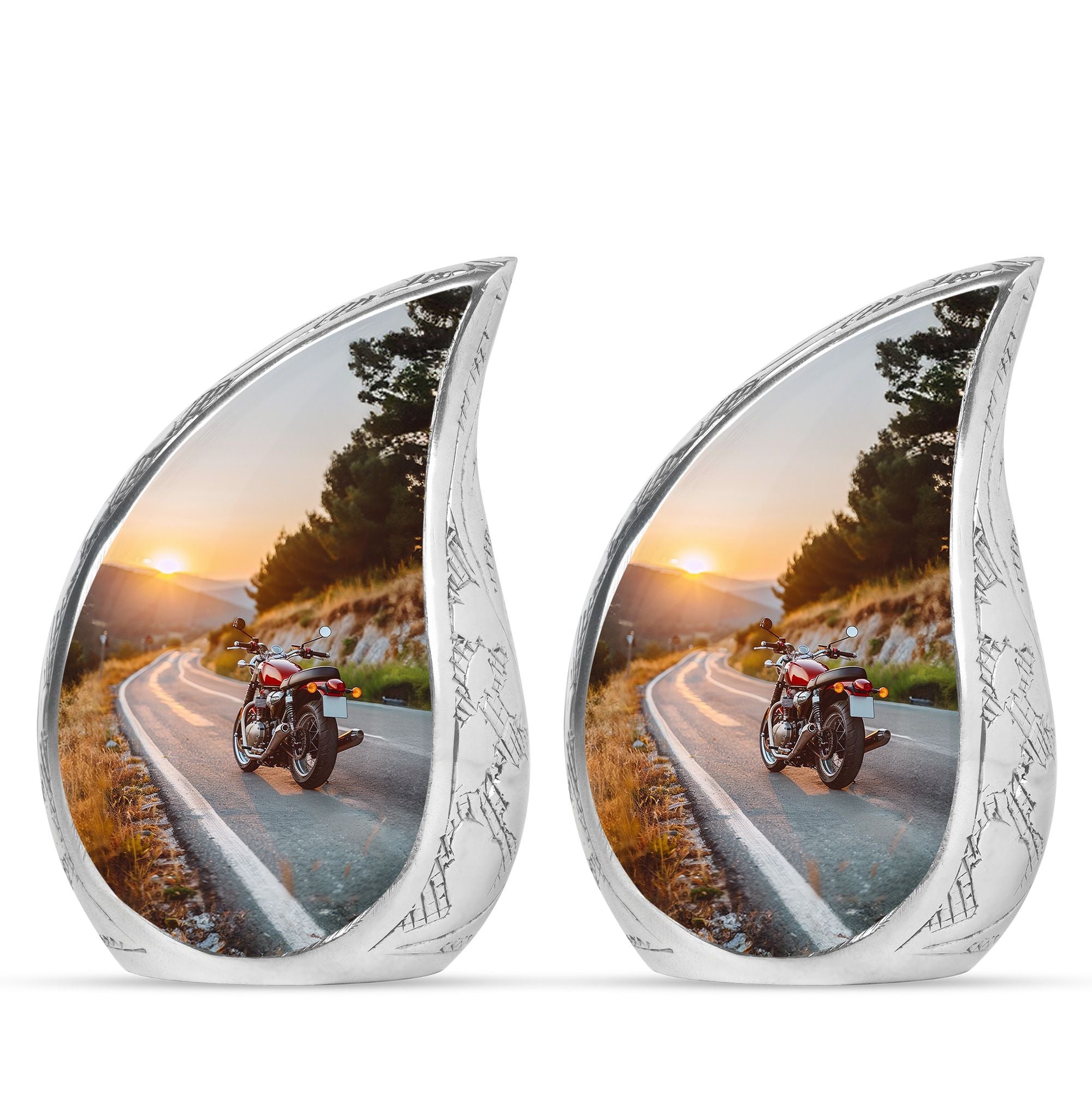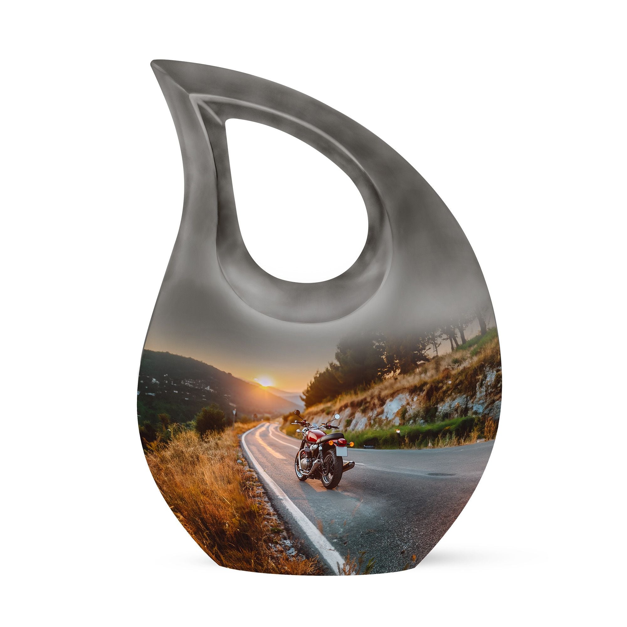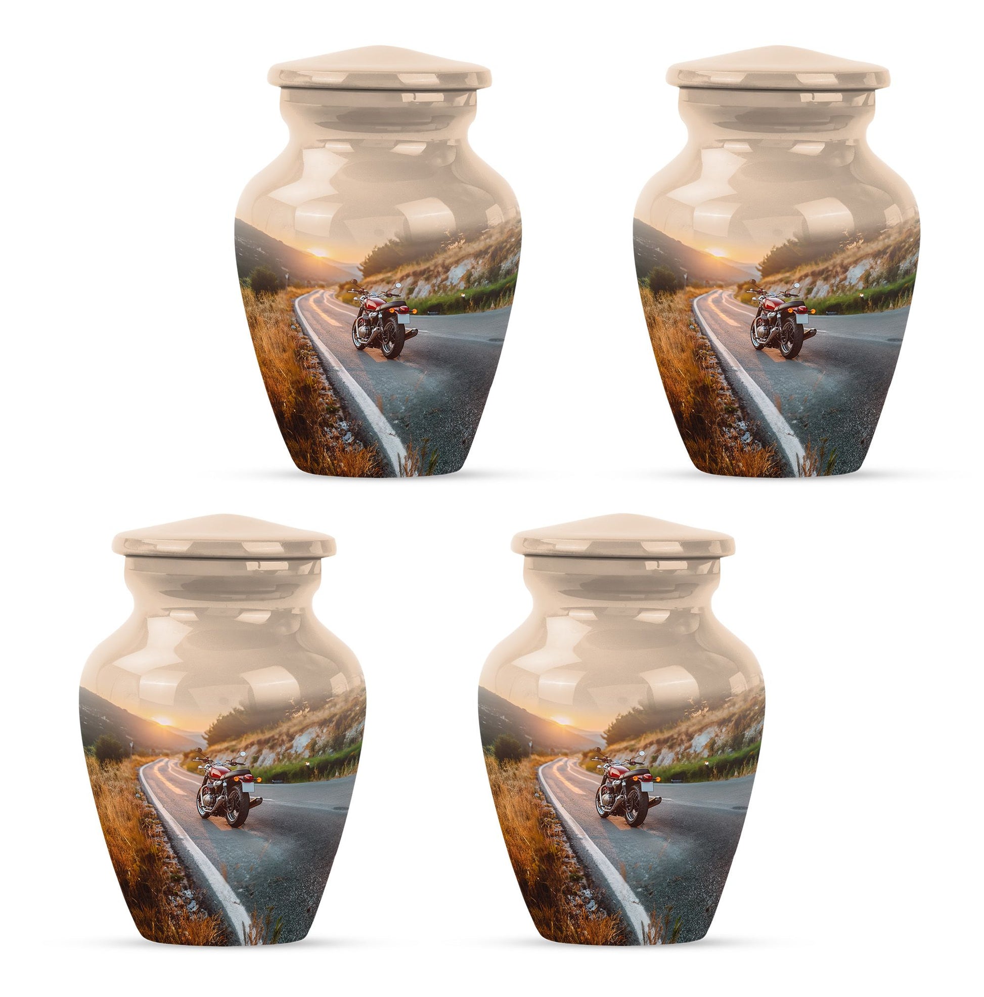Crafted with high-quality aluminium, this urn showcases a detailed motorbike design against a roadways theme, symbolizing adventure and eternal memories. Its secure screw-top lid ensures safe storage, making it versatile as a small urn for ashes for women, mini urn for ashes for women, or even mini small urns for men. Families seeking cremation urns for women or adult urns for human ashes men will find this design both meaningful and dignified.