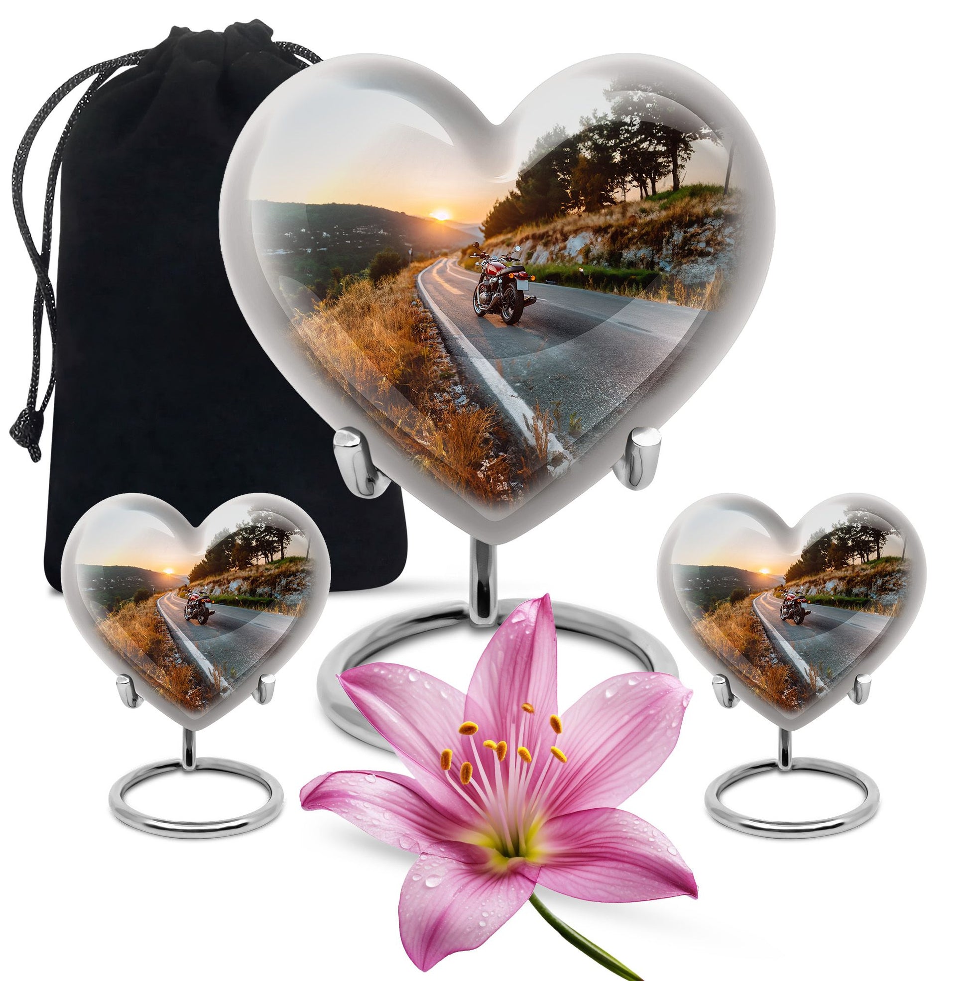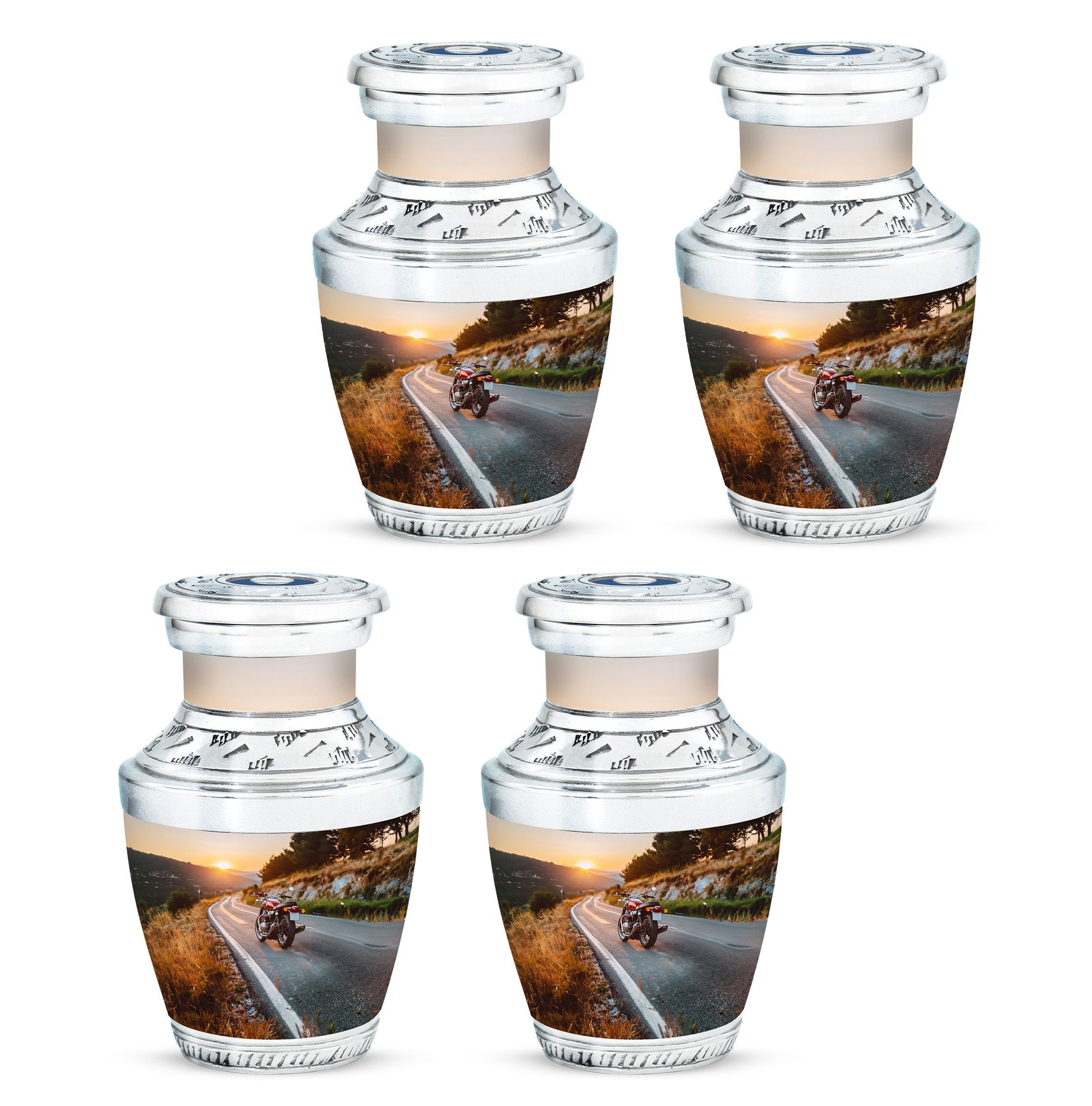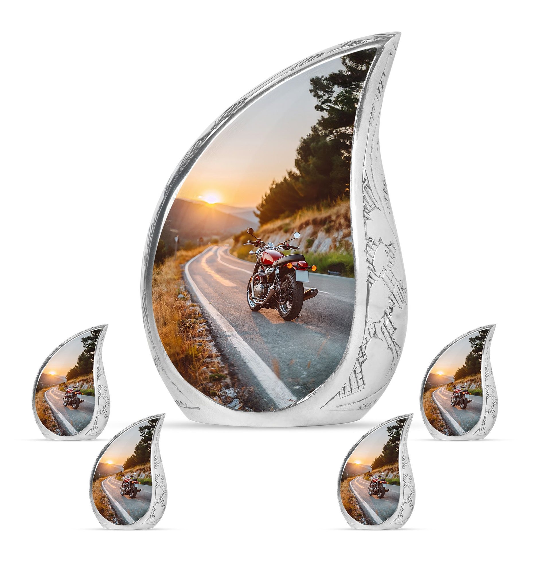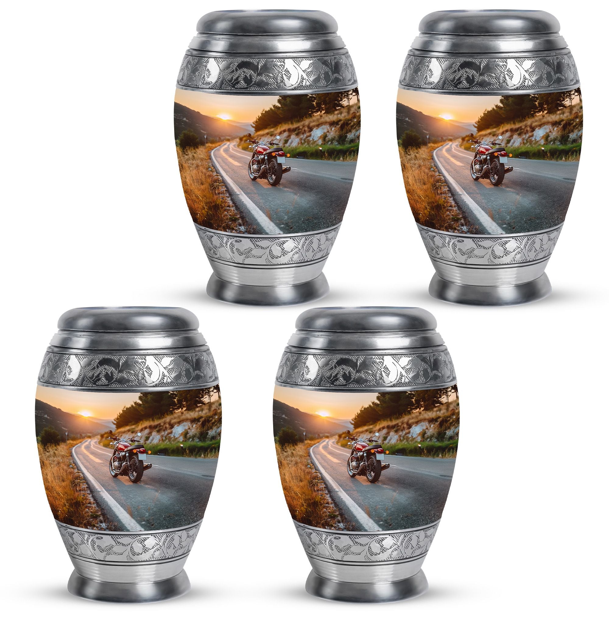 Crafted with high-quality aluminium, this urn showcases a detailed motorbike design against a roadways theme, symbolizing adventure and eternal memories. Its secure screw-top lid ensures safe storage, making it versatile as a small urn for ashes for women, mini urn for ashes for women, or even mini small urns for men. Families seeking cremation urns for women or adult urns for human ashes men will find this design both meaningful and dignified.