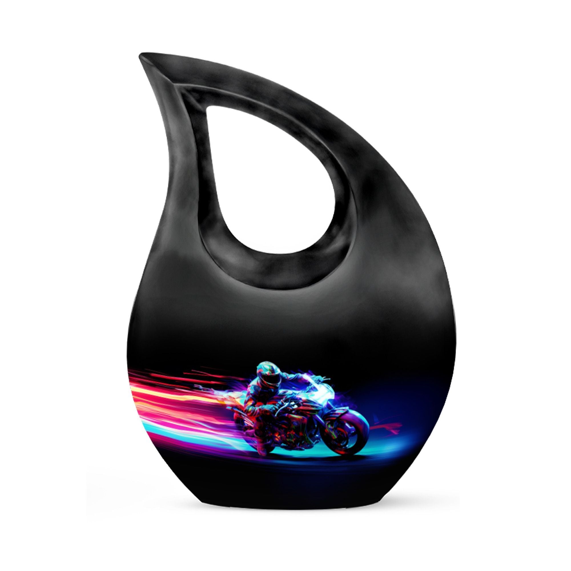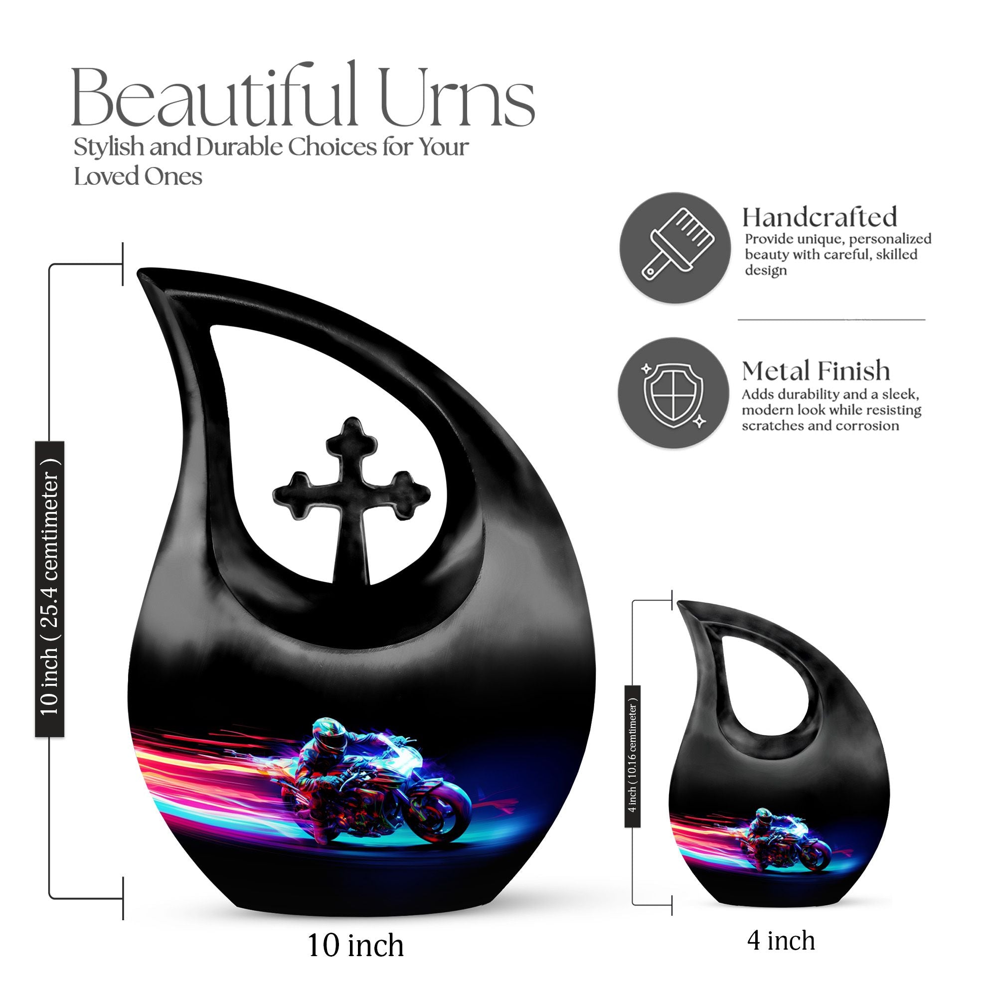 Introducing our exquisite Racing Flame Motorbike Urn - a poignant tribute to your beloved one's love for speed. Expertly crafted from high-quality aluminium, this piece from our collection of Large Urns reveals an attention to detail that commemorates life beautifully. Being 10 inches in height and weighing 3.3 pounds, it has a capacity of 200 cubic inches, making it suitable for storing human ashes respectfully. The urn is framed by a unique Cross Drop pattern, merging elegance with resilience. Our product offers a customization feature, allowing you to immortalize your loved heartstring with engraved names, making this urn even more meaningful. The urn comes with a velvet pouch, handling the containment of ashes with the dignity they deserve. Our Racing Flame Motorbike Urn is not just a memorial urn, but a token of enduring love and memory. Preserve the memories of your loved one with our Small Memorial Urns, designed not only for adults but also for seniors cradling precious sentiments.