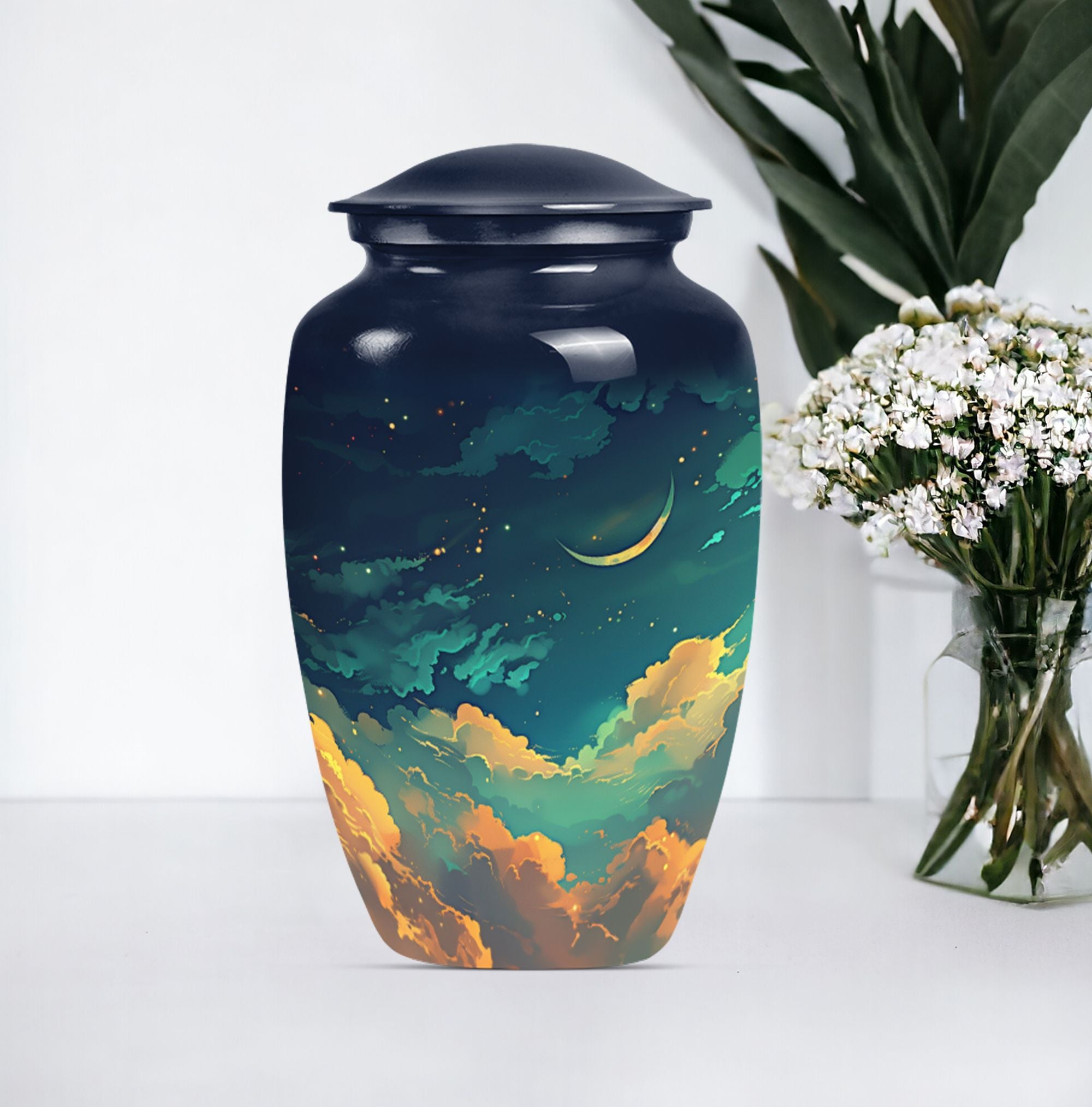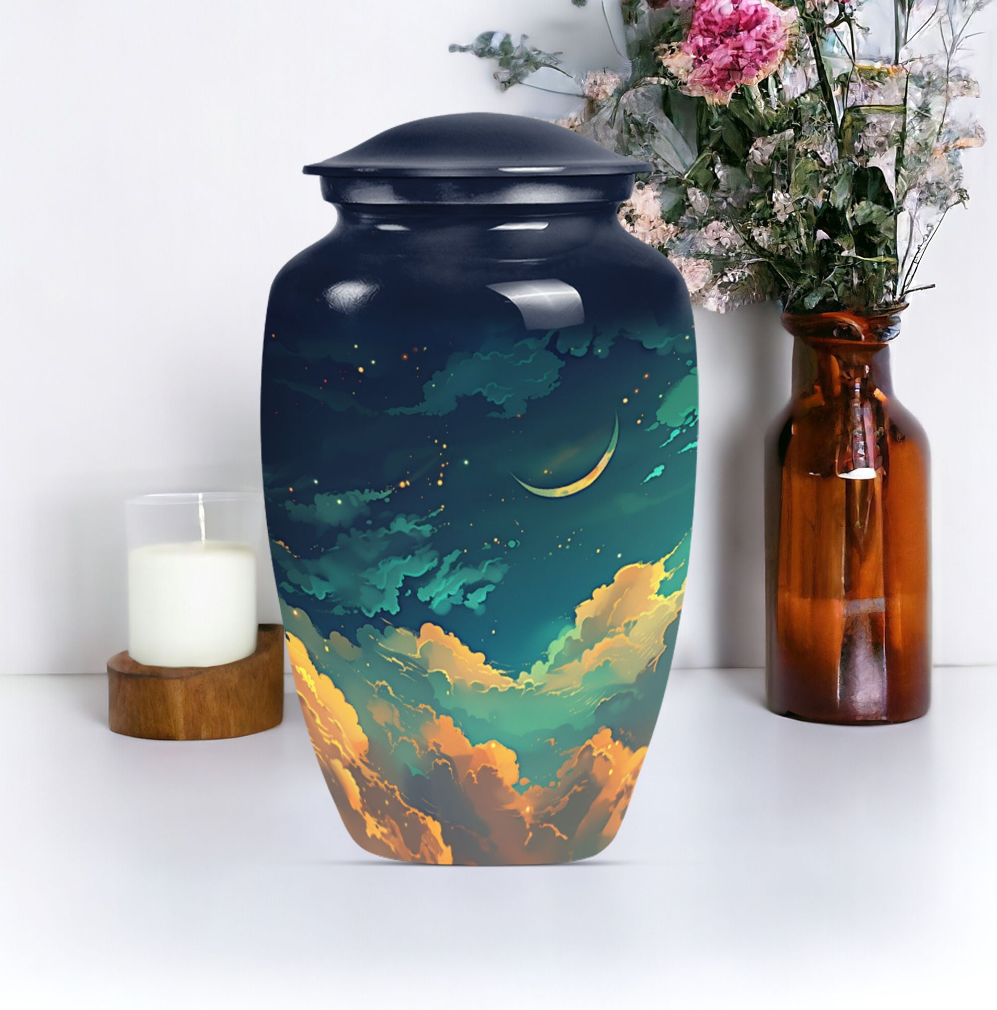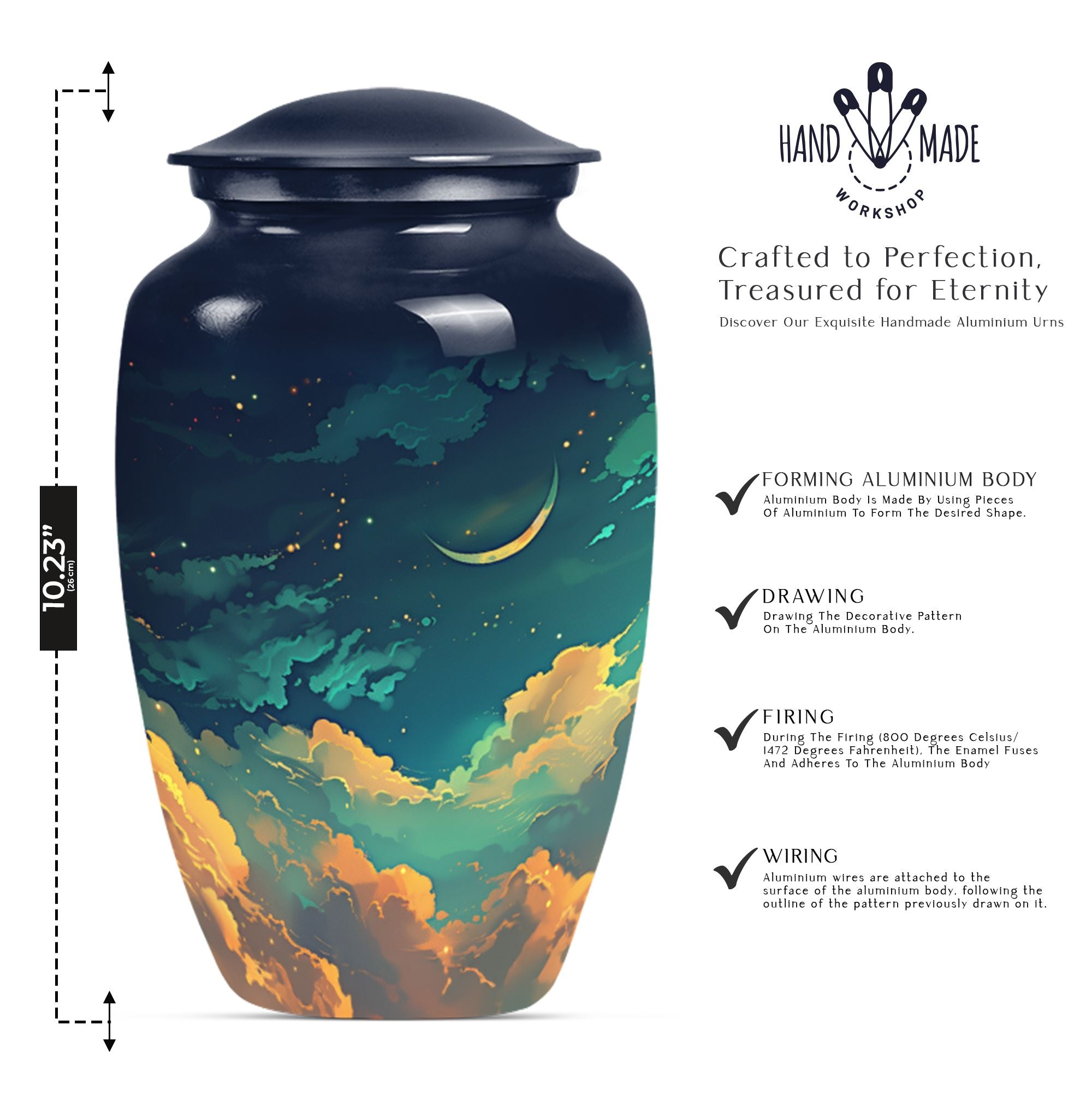 Experience a comforting sense of tranquility and reverence with our meticulously crafted 10-inch butterfly-themed clouds urn. This large burial urn for human ashes offers spacious capacity of 200 cubic inches, making it the perfect memorial space for your loved ones. The classic urn design adds a touch of elegance and timeless beauty to any space it occupies. Constructed using durable and lightweight aluminum, this urn measures at 10 inches in height and weighs just 3.3 pounds. Offering an intimate way to remember and honor your departed loved ones, its customization feature allows personalization with engraved names, adding a unique touch to this sacred memorial piece. The package includes a soft velvet pouch for safe containment of ashes. Add this sophisticated and meaningful Adult Memorial urn to your cart today. Perfect for any ceremonial tribute, this might be the missing piece in your search for 'cremation urns for human ashes', 'funeral large urns', or 'adult urn'. Tailored with a finesse, it is more than a memorial product, it's a testament of your everlasting love and memories.