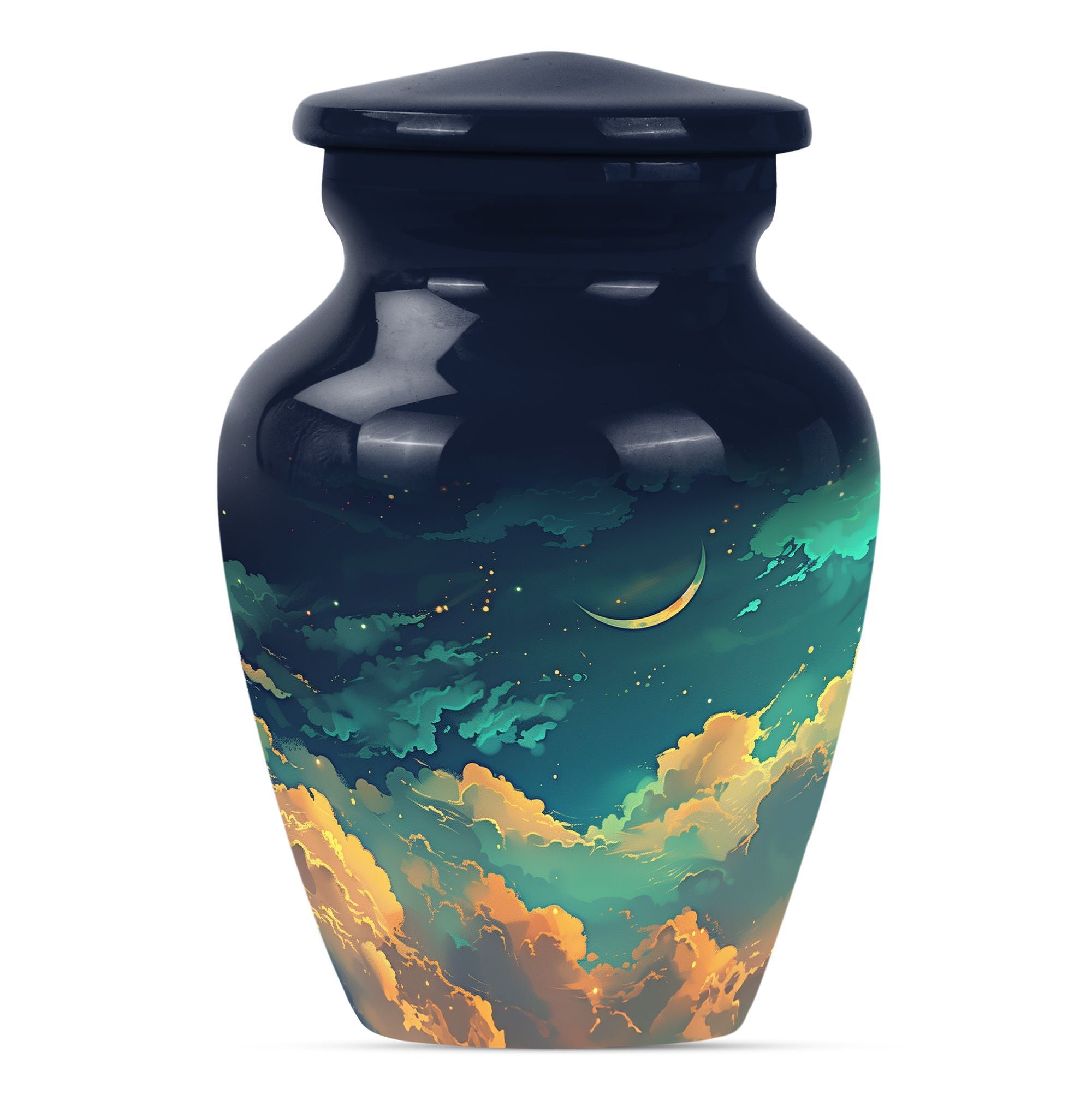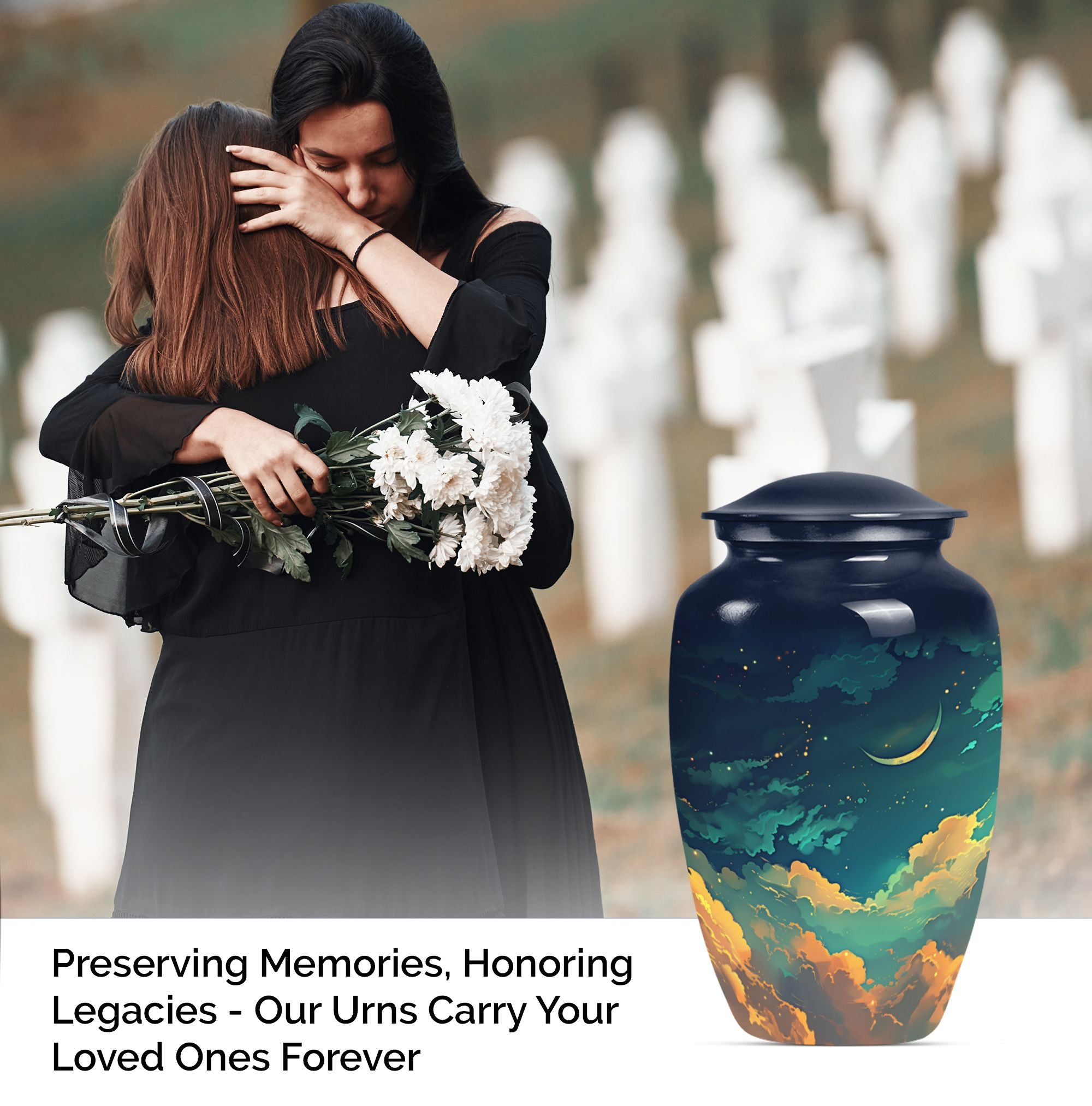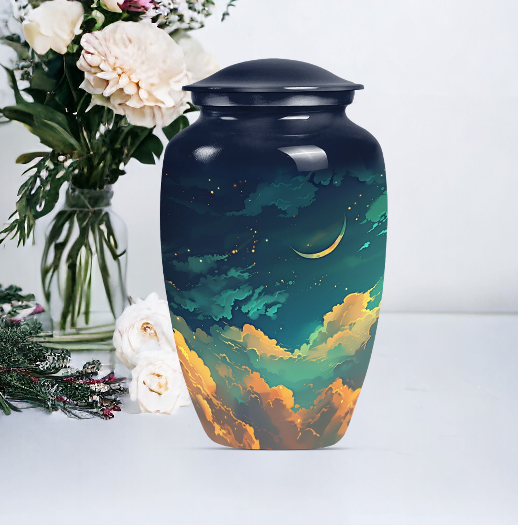Experience a comforting sense of tranquility and reverence with our meticulously crafted 10-inch butterfly-themed clouds urn. This large burial urn for human ashes offers spacious capacity of 200 cubic inches, making it the perfect memorial space for your loved ones. The classic urn design adds a touch of elegance and timeless beauty to any space it occupies. Constructed using durable and lightweight aluminum, this urn measures at 10 inches in height and weighs just 3.3 pounds. Offering an intimate way to remember and honor your departed loved ones, its customization feature allows personalization with engraved names, adding a unique touch to this sacred memorial piece. The package includes a soft velvet pouch for safe containment of ashes. Add this sophisticated and meaningful Adult Memorial urn to your cart today. Perfect for any ceremonial tribute, this might be the missing piece in your search for 'cremation urns for human ashes', 'funeral large urns', or 'adult urn'. Tailored with a finesse, it is more than a memorial product, it's a testament of your everlasting love and memories.