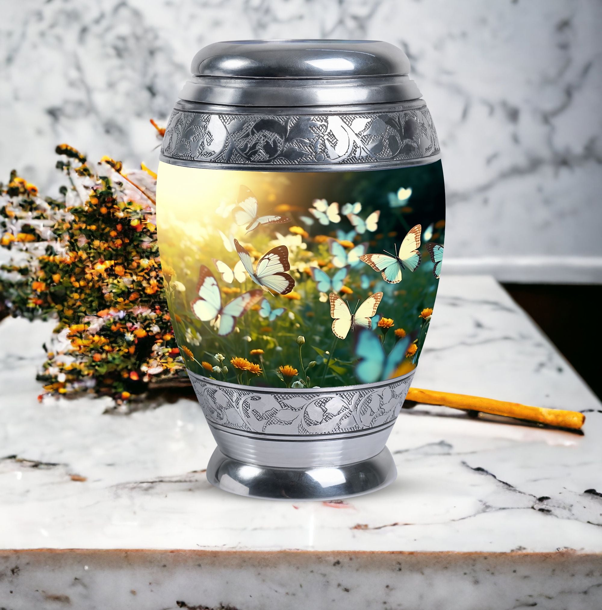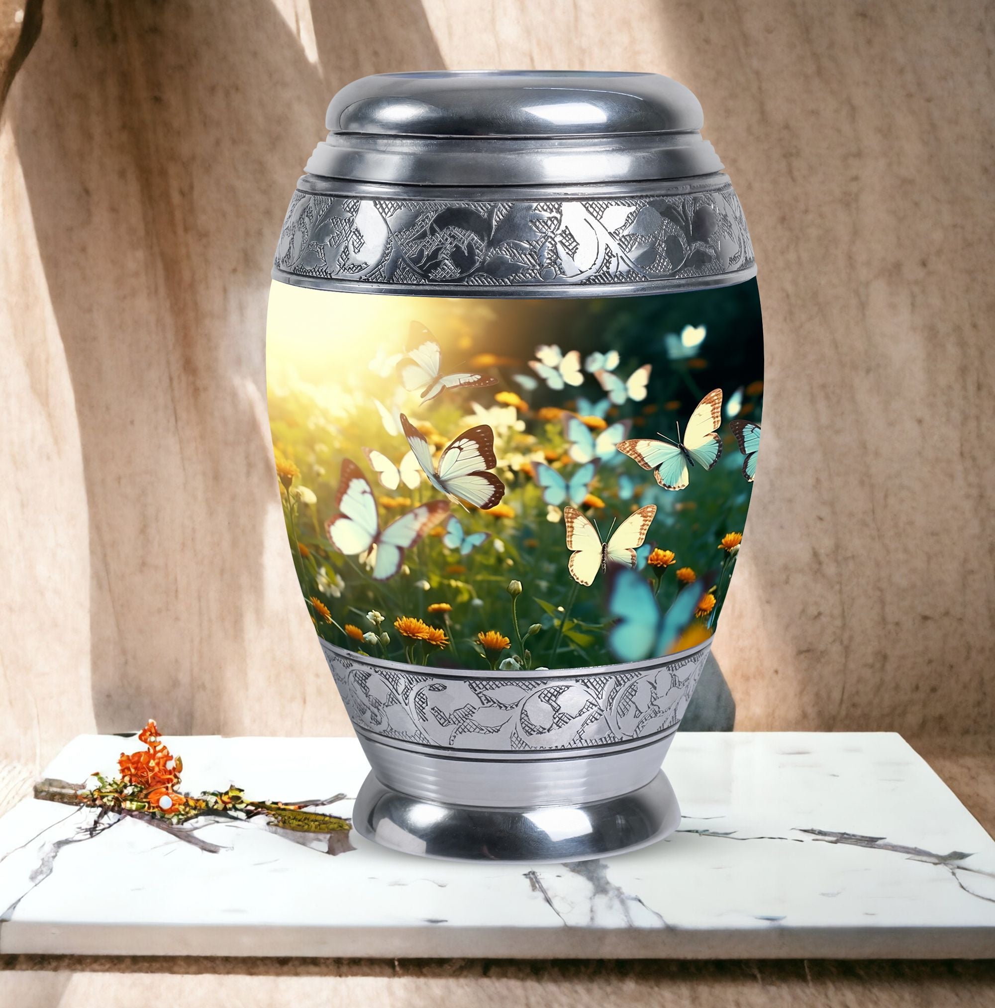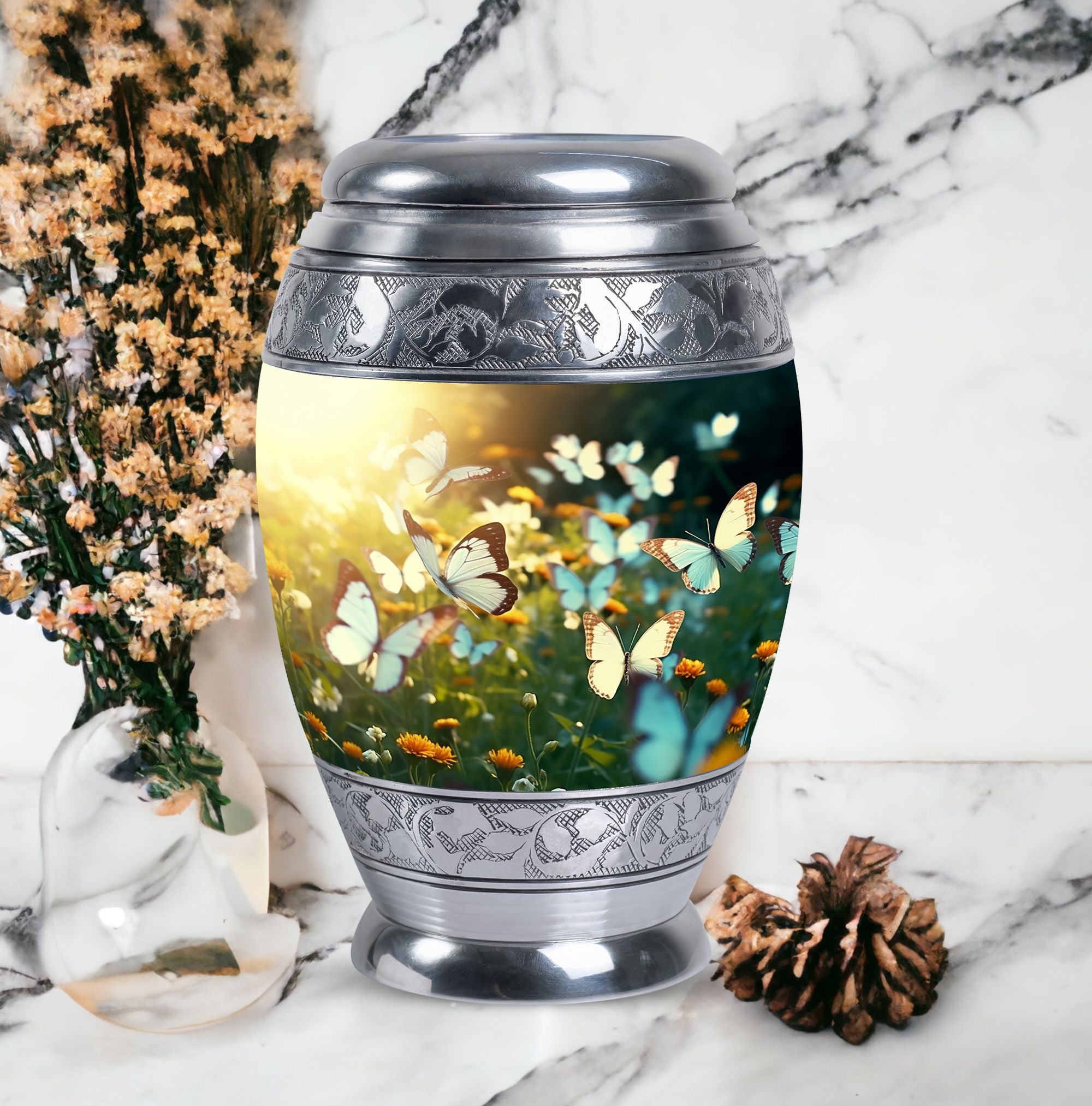 Introducing our exquisite 'Butterflies Fly Sunset Urn' - a divine and sentimental option for safeguarding the ashes of your beloved adult female. This beautifully crafted Urn for Human Remains manifests a tranquil sunset, signifying the serene transition into the next realm while vibrant butterflies etch the narrative of a spirited and fulfilling life lived. This urn is not just a vessel for ashes, but a cherished piece of art, signifying undying love and respect for the departed. Our ashes urns excel in preserving the quintessence of your loved one with dignity and honor. Designed especially for burial, this urn provides a fitting tribute to the fond memories of your departed. Render your loved one the honor they deserve during the memorial ceremony with our 'Butterflies Fly Sunset Urn'. A token of love, warmth, and reminiscence, this urn echoes comfort during times of sorrow and loss.