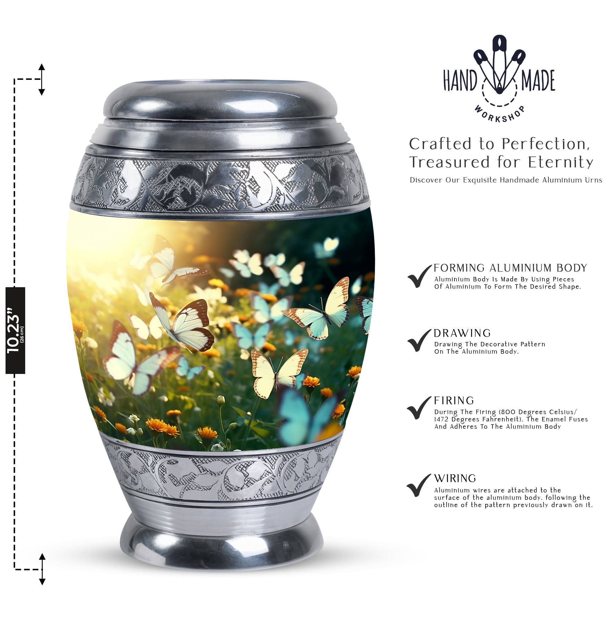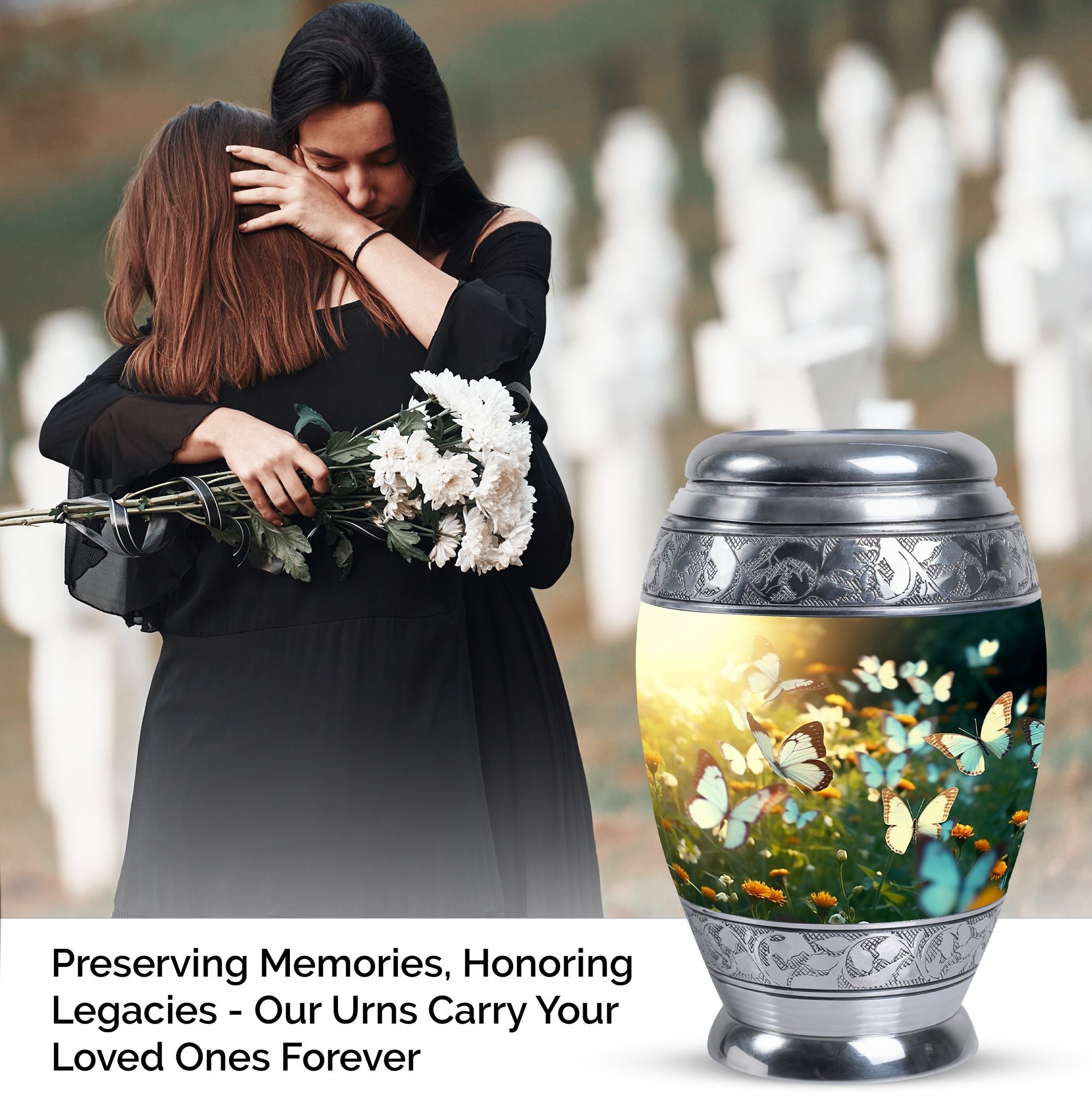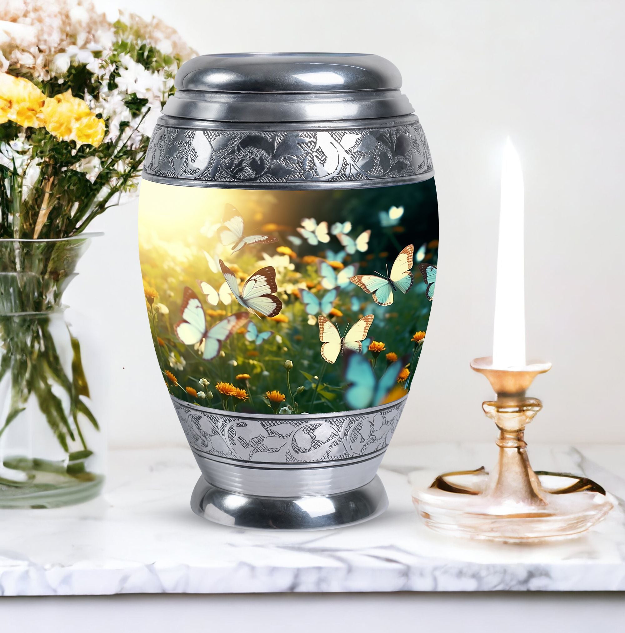 Introducing our exquisite 'Butterflies Fly Sunset Urn' - a divine and sentimental option for safeguarding the ashes of your beloved adult female. This beautifully crafted Urn for Human Remains manifests a tranquil sunset, signifying the serene transition into the next realm while vibrant butterflies etch the narrative of a spirited and fulfilling life lived. This urn is not just a vessel for ashes, but a cherished piece of art, signifying undying love and respect for the departed. Our ashes urns excel in preserving the quintessence of your loved one with dignity and honor. Designed especially for burial, this urn provides a fitting tribute to the fond memories of your departed. Render your loved one the honor they deserve during the memorial ceremony with our 'Butterflies Fly Sunset Urn'. A token of love, warmth, and reminiscence, this urn echoes comfort during times of sorrow and loss.