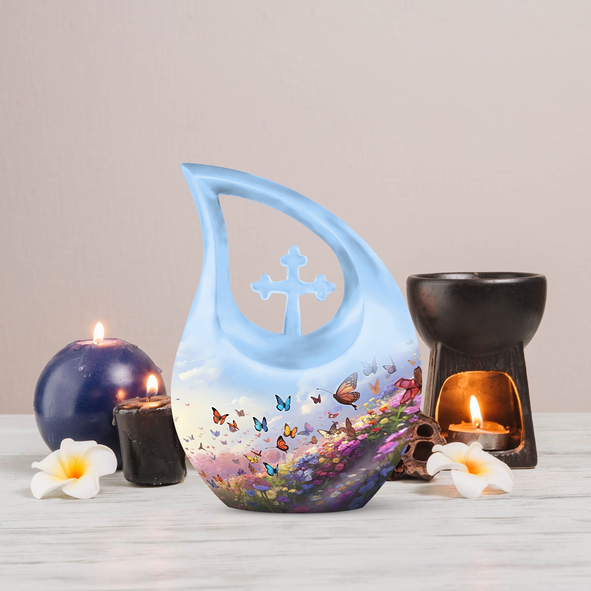 Cherish the memory of a departed loved one with our unique Butterfly Urn. Made from quality Aluminium, this Large Urn is designed with a beautiful Cross Drop motif and is themed around serene butterflies. Being 10 inches in height and with a capacity of 200 cubic inches, it comfortably accommodates ashes, while the included velvet pouch ensures secure containment. Weighing just 3.3 pounds, it's easy to carry and place as desired. Personalize this elegant memorial urn with engraved names, adding an even deeper sense of connection and sentiment towards your loved one. This keepsake cremation urn not only provides a dignified remembrance but also beautifully blends in with any decor, giving it a touch of solitude. With meticulously detailed butterflies and a soft velvet pouch included, this embodied symbol of love and remembrance can become a beacon of cherished memories. Perfect for commemorating a personality whose love fluttered around like a butterfly, this urn is more than a memorial item. Keywords: Butterfly Urn, Garden Urn, Keepsake Cremation Urns, Personalized Urns For Human Ashes.