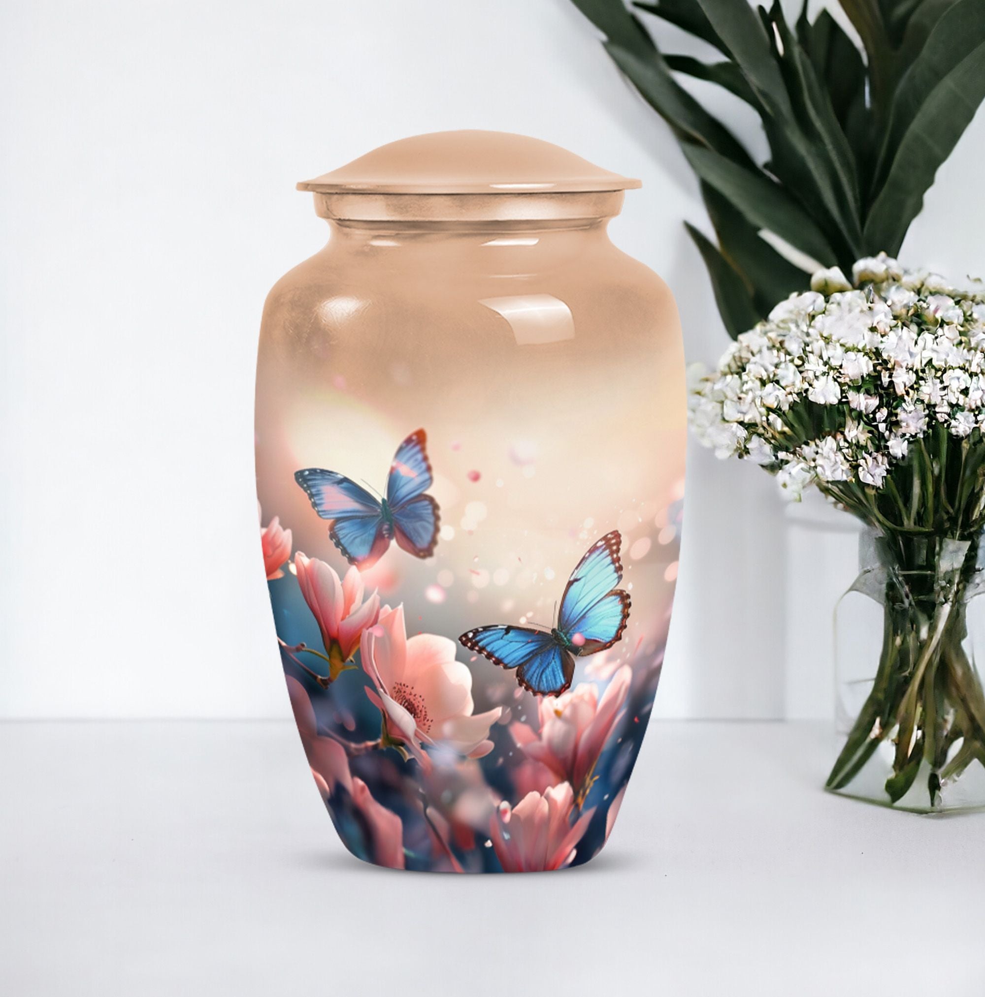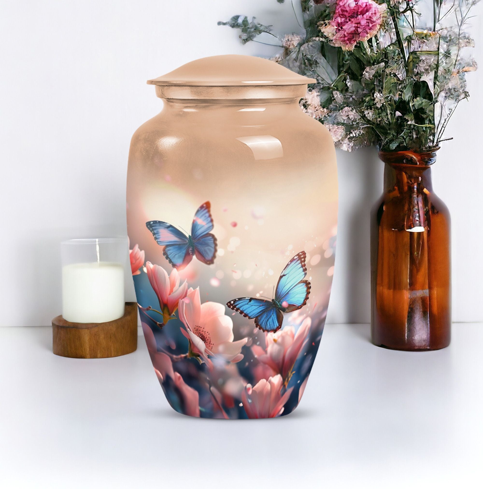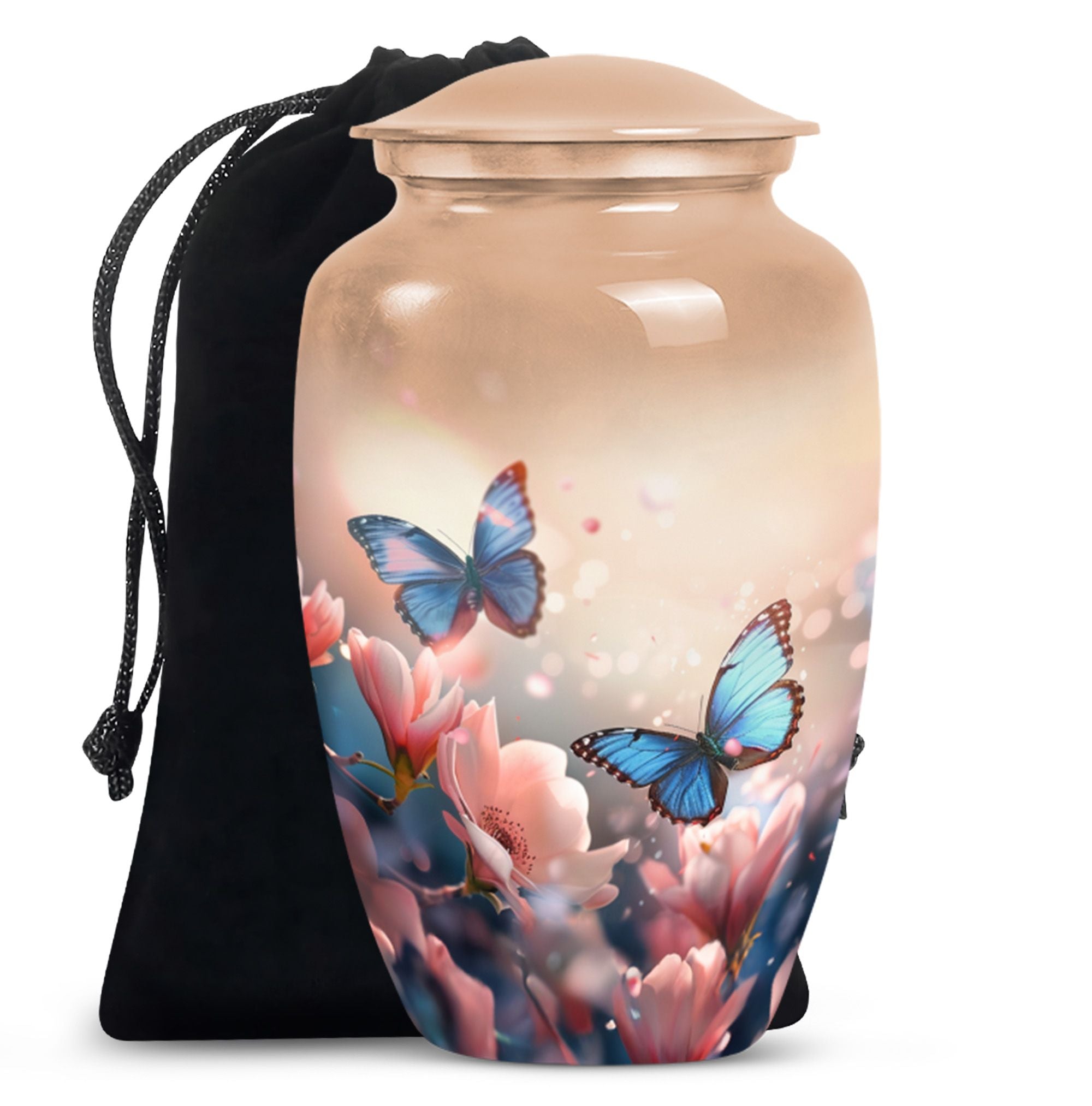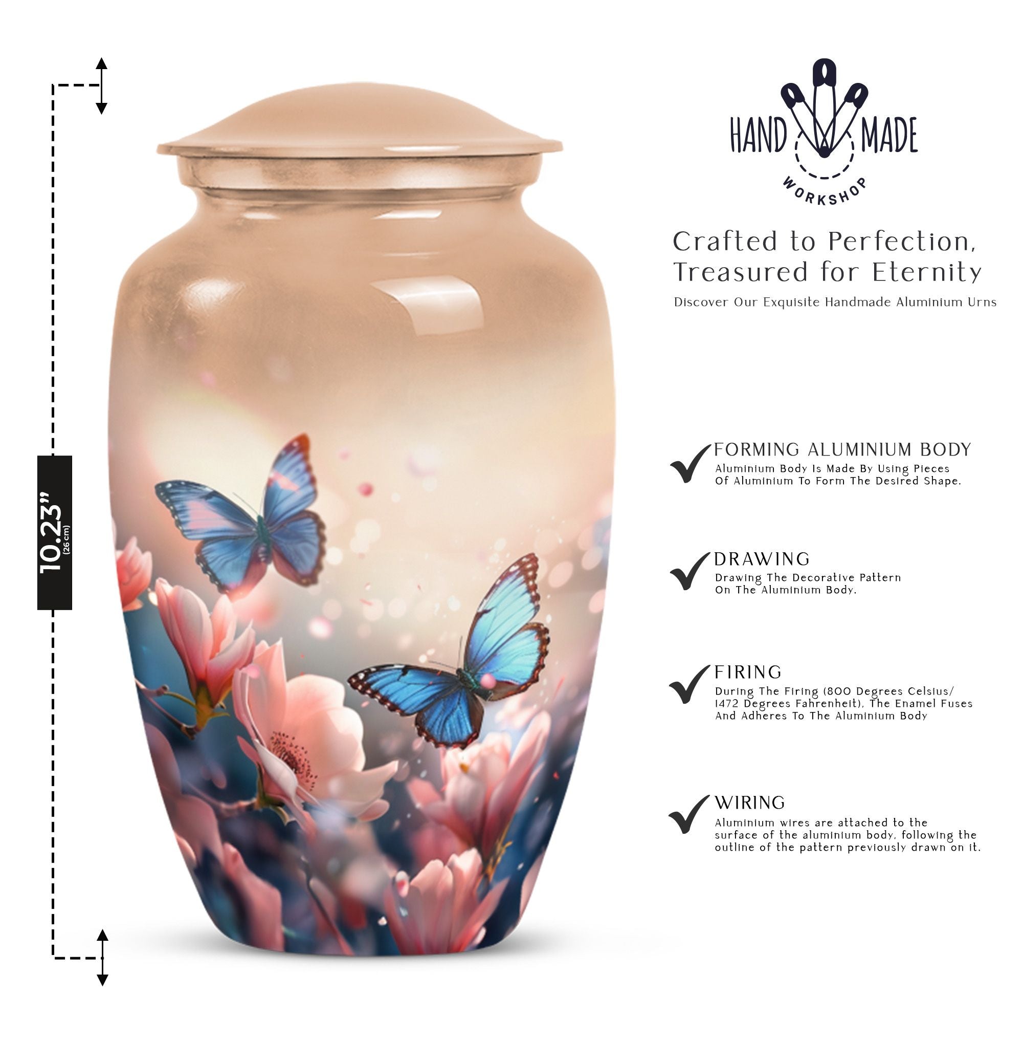 Show your love and honor for your departed loved one with our meticulously crafted Butterfly Cremation Urn. This Large Urn, made from Aluminium, stands at 10 inches and weighs a sturdy 3.3 pounds. Its abstract theme will suit any decor, and the 200 cubic inch capacity guarantees secure containment for ashes. For added convenience and grace, each butterfly urn comes with a velvet pouch, perfect for safe-keeping. Personalize this funeral urn for ashes for men with engraved names to embody a truly unique memory. An absolute favorite in the category of Memorial human urns for ashes and Traditional urns, this urn subtly blends functionality and aesthetics. This butterfly urn is more than merely a repository; it serves as a lasting emblem of love and tribute.
