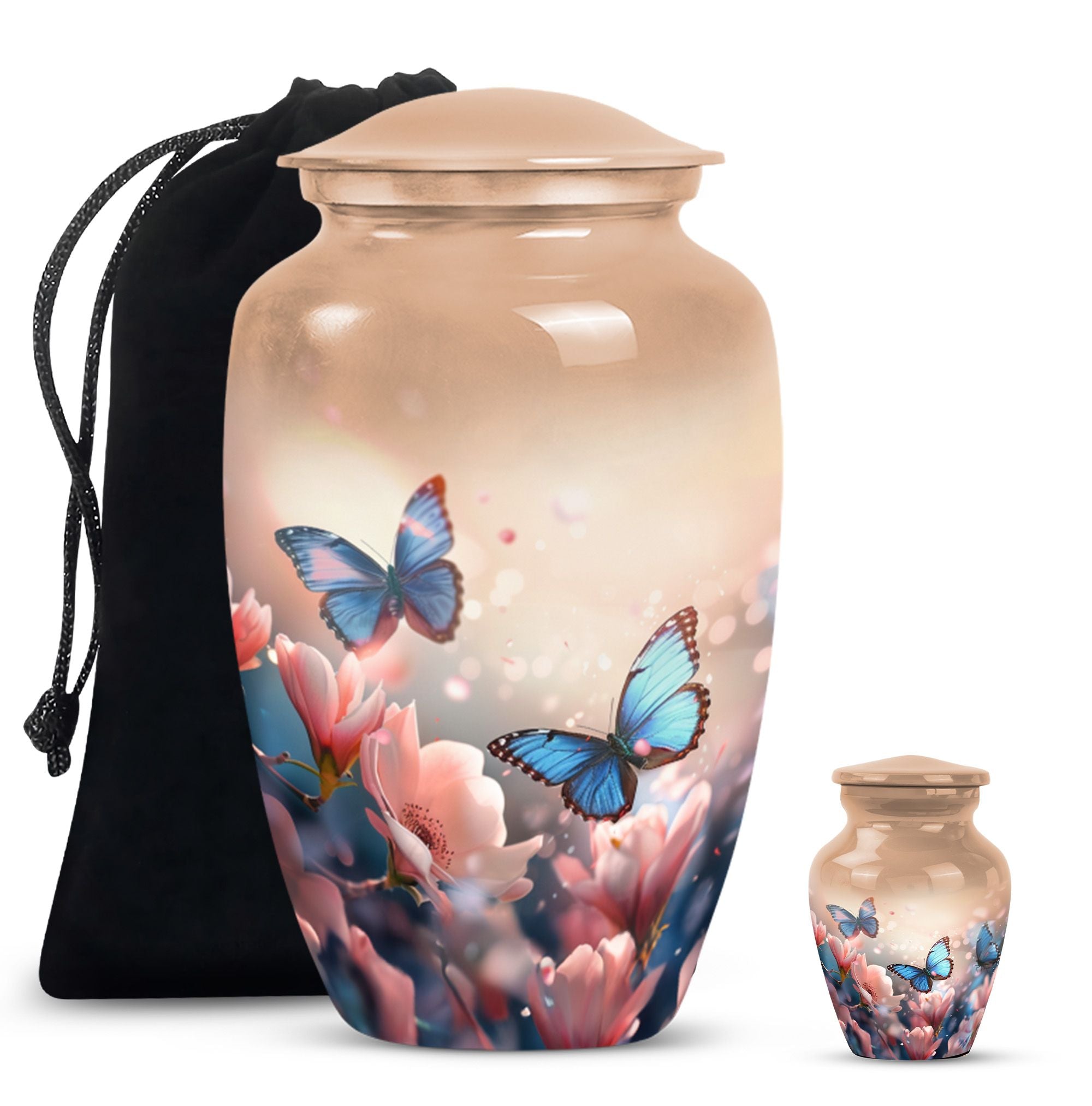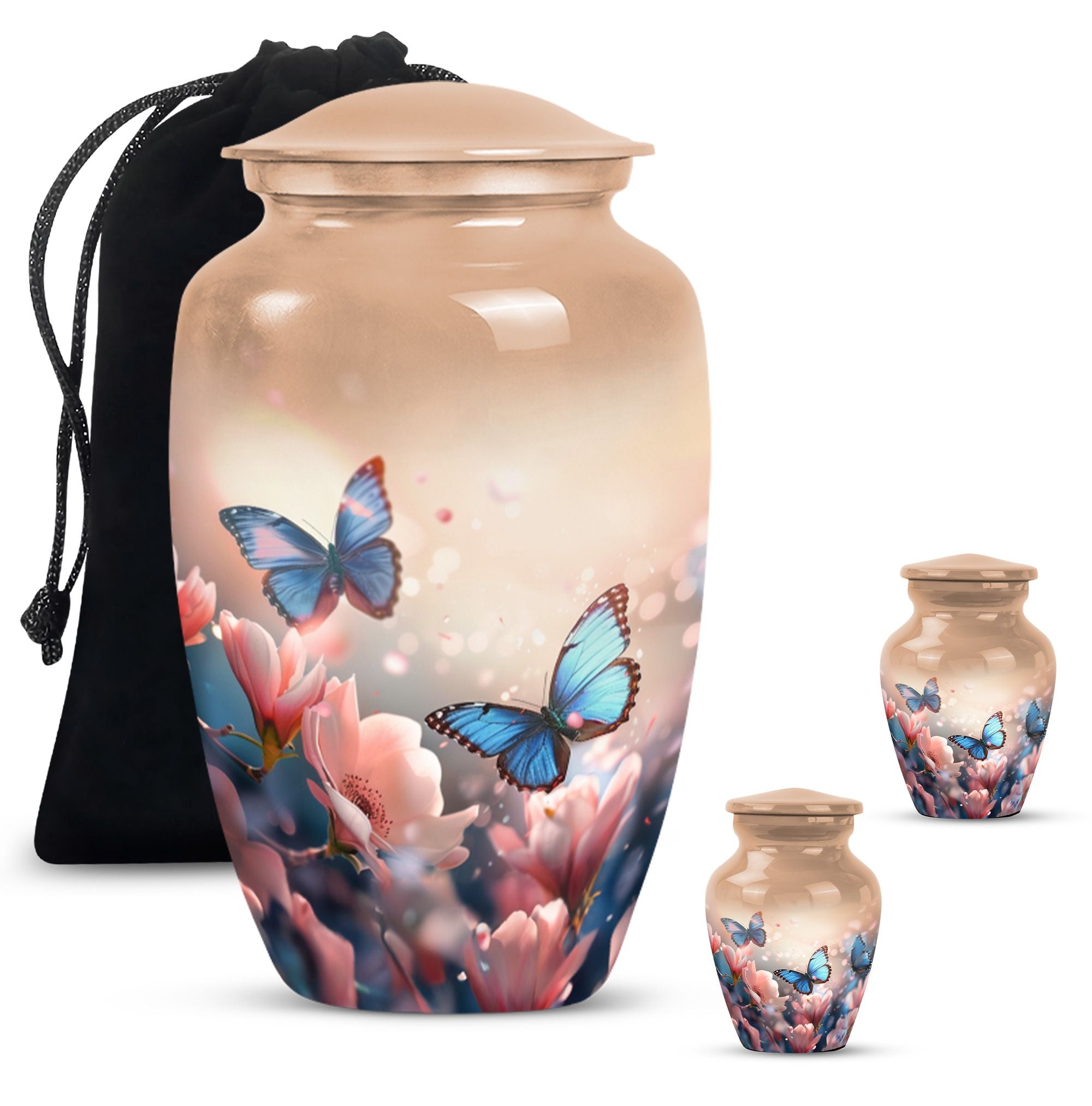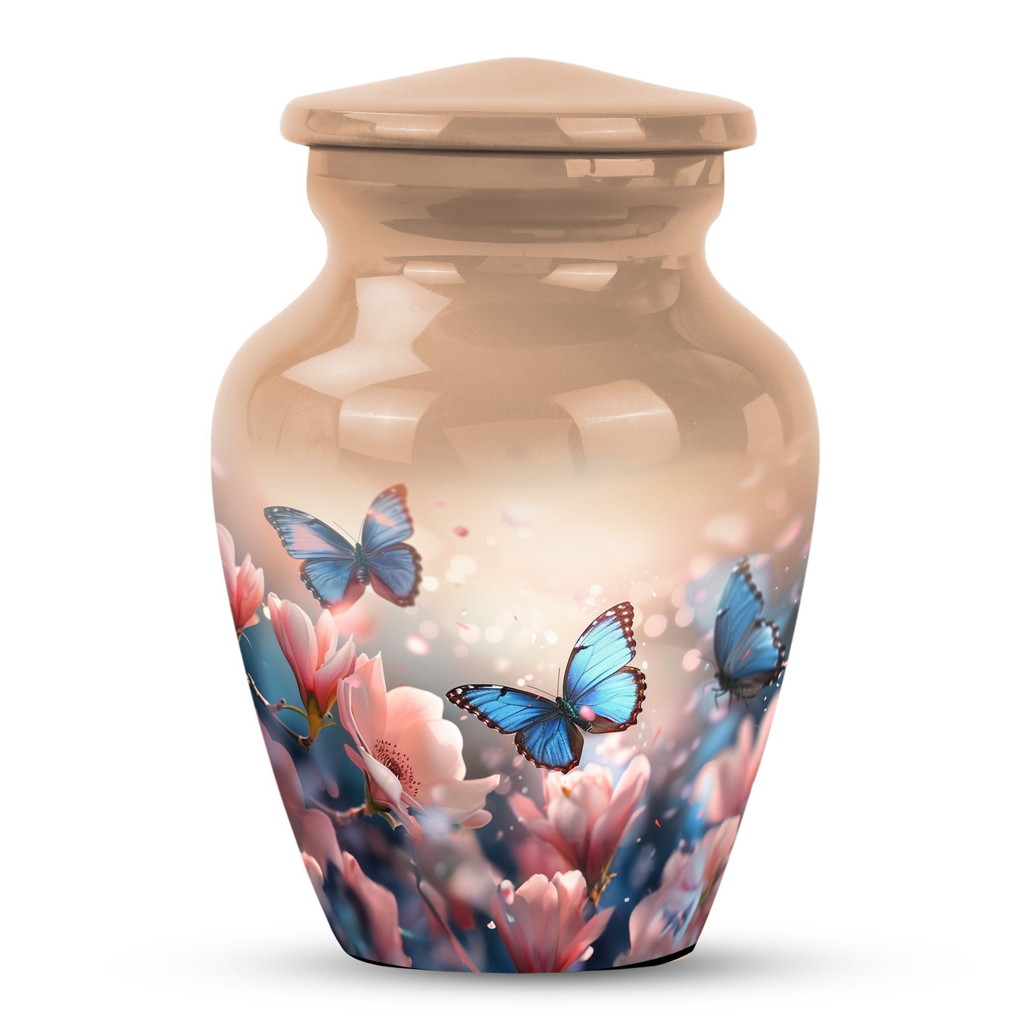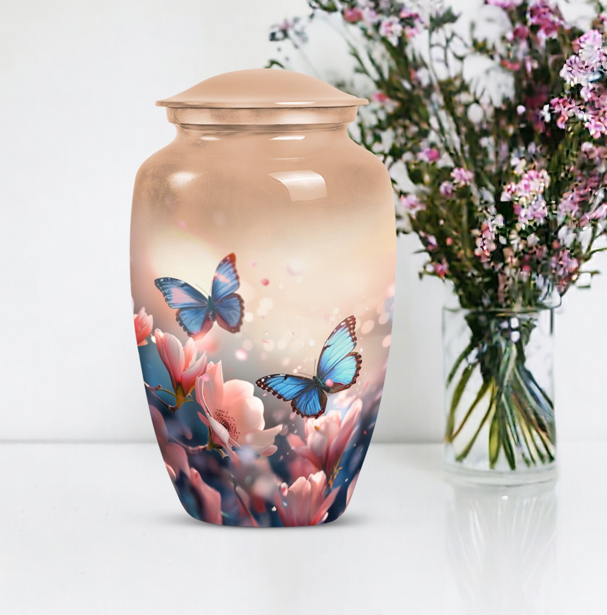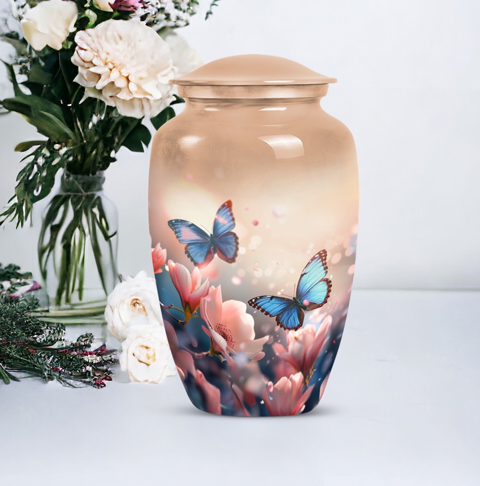 Show your love and honor for your departed loved one with our meticulously crafted Butterfly Cremation Urn. This Large Urn, made from Aluminium, stands at 10 inches and weighs a sturdy 3.3 pounds. Its abstract theme will suit any decor, and the 200 cubic inch capacity guarantees secure containment for ashes. For added convenience and grace, each butterfly urn comes with a velvet pouch, perfect for safe-keeping. Personalize this funeral urn for ashes for men with engraved names to embody a truly unique memory. An absolute favorite in the category of Memorial human urns for ashes and Traditional urns, this urn subtly blends functionality and aesthetics. This butterfly urn is more than merely a repository; it serves as a lasting emblem of love and tribute.