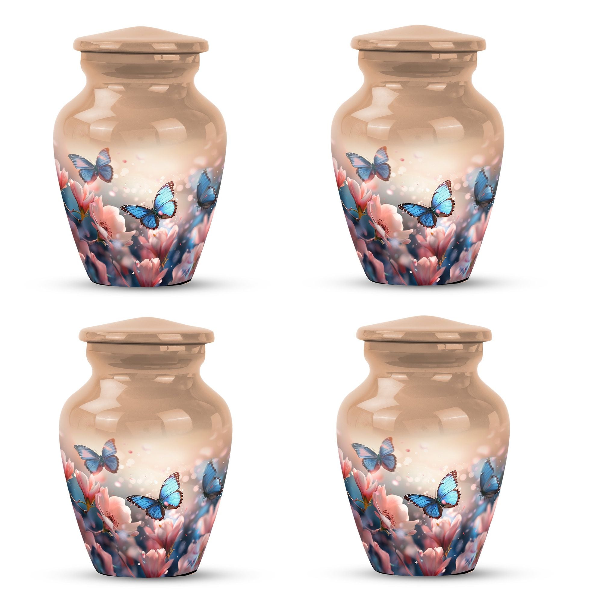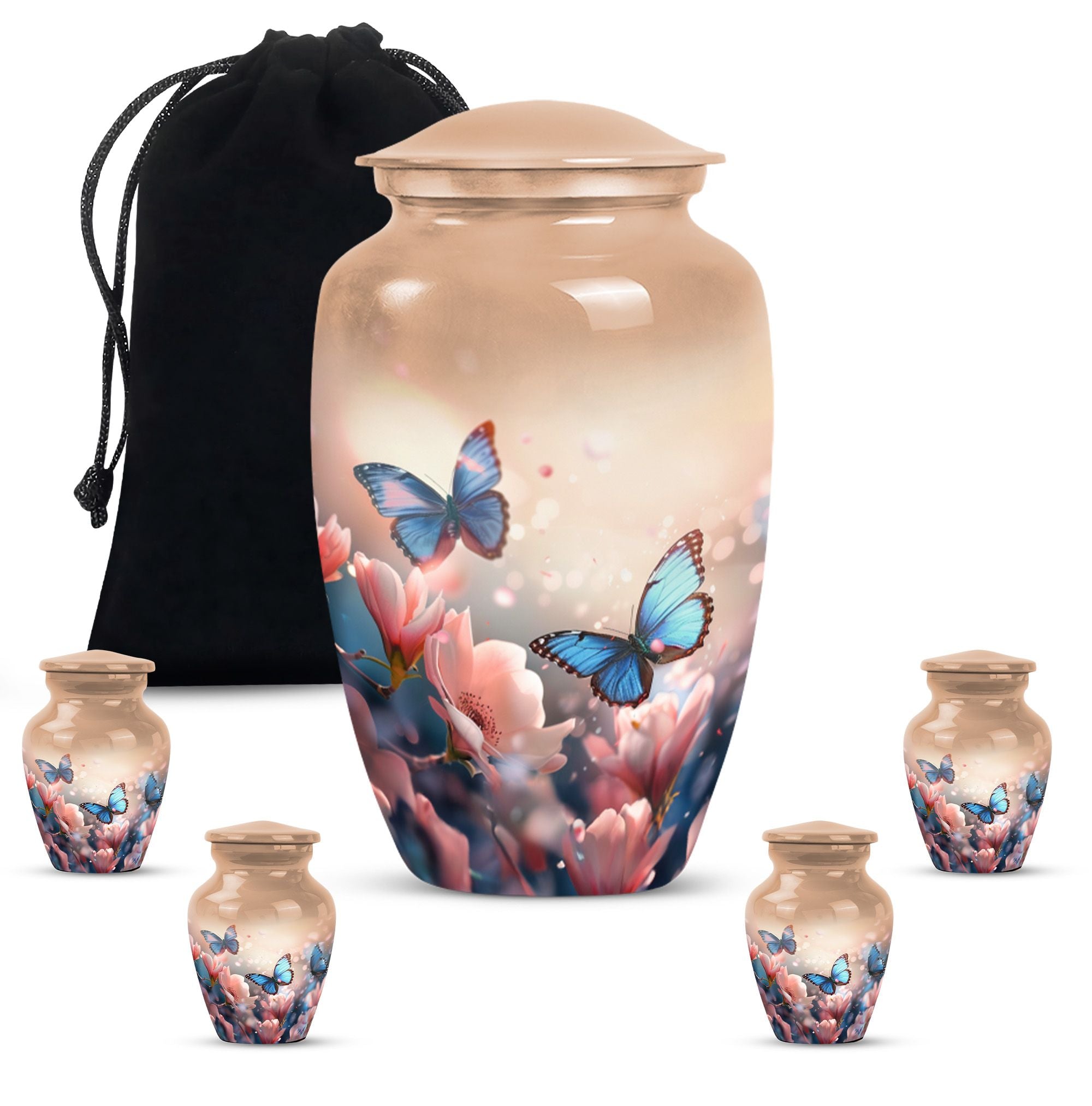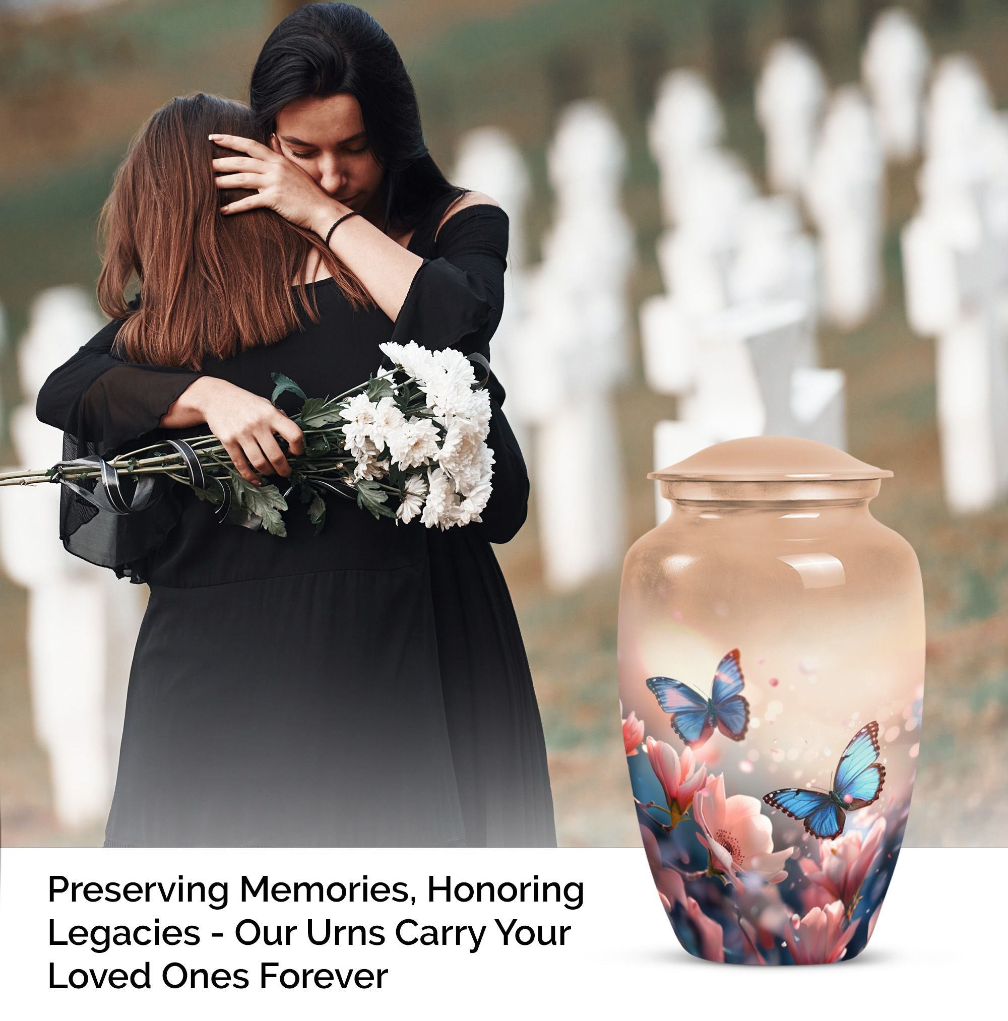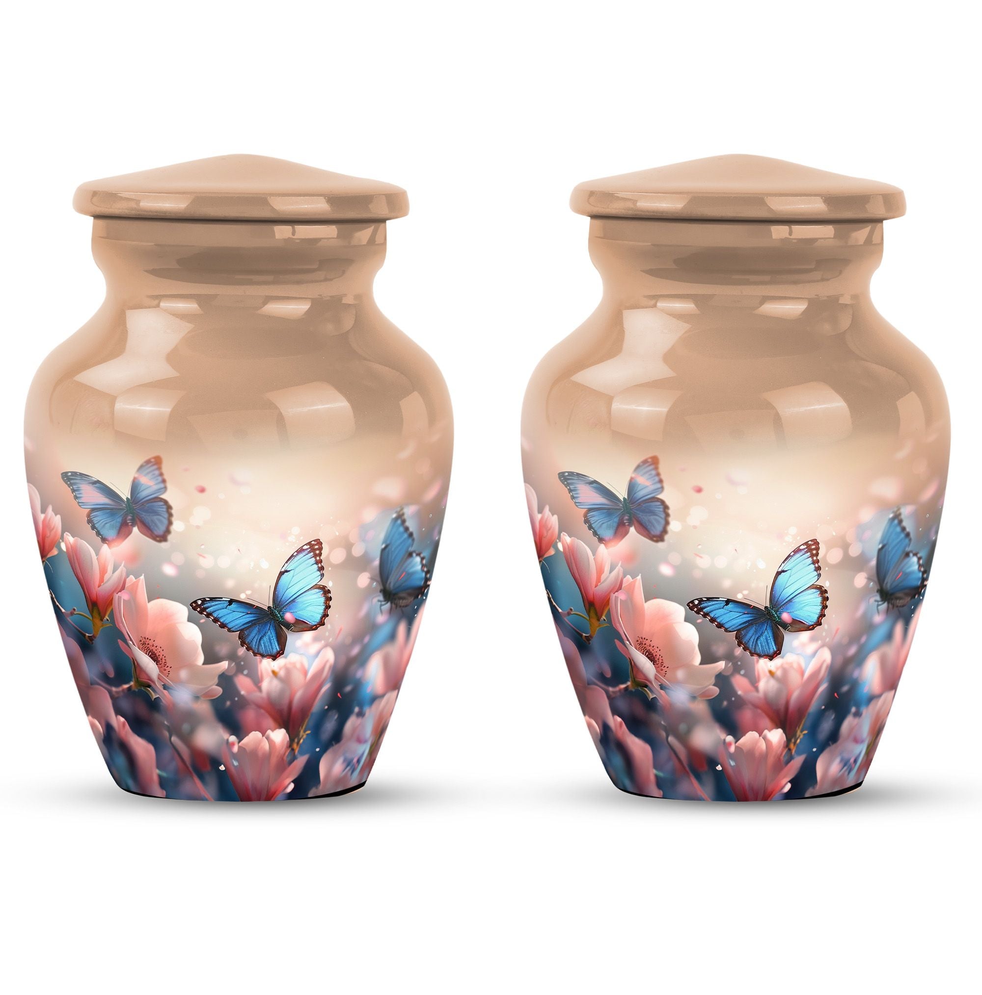 Show your love and honor for your departed loved one with our meticulously crafted Butterfly Cremation Urn. This Large Urn, made from Aluminium, stands at 10 inches and weighs a sturdy 3.3 pounds. Its abstract theme will suit any decor, and the 200 cubic inch capacity guarantees secure containment for ashes. For added convenience and grace, each butterfly urn comes with a velvet pouch, perfect for safe-keeping. Personalize this funeral urn for ashes for men with engraved names to embody a truly unique memory. An absolute favorite in the category of Memorial human urns for ashes and Traditional urns, this urn subtly blends functionality and aesthetics. This butterfly urn is more than merely a repository; it serves as a lasting emblem of love and tribute.