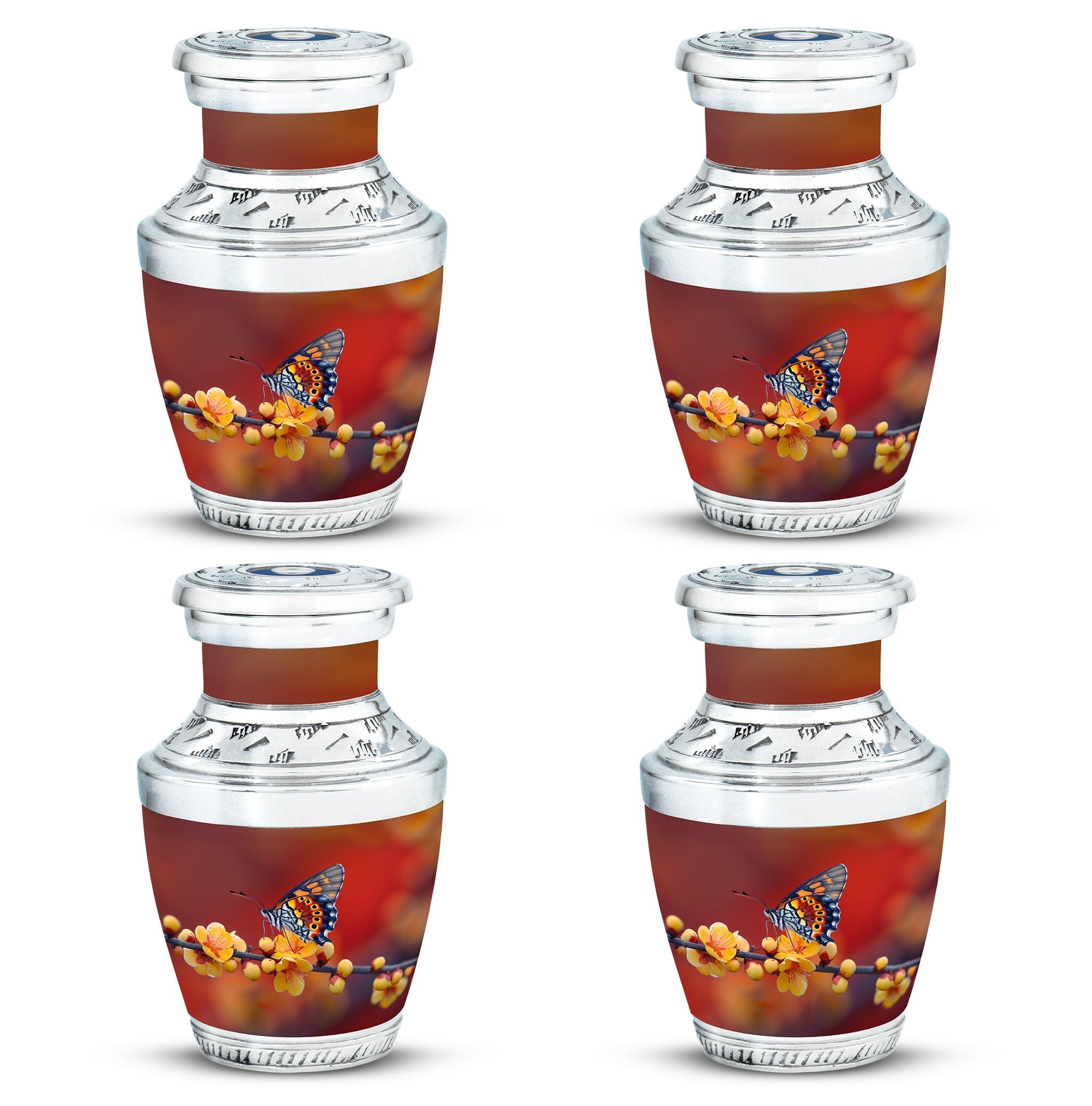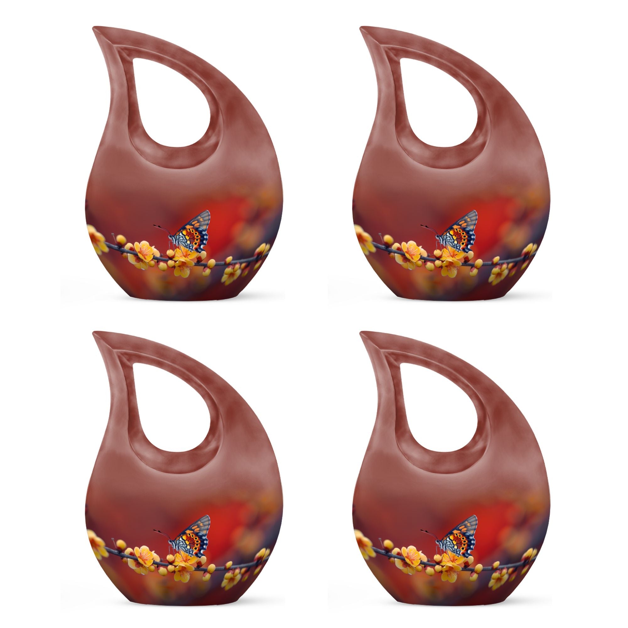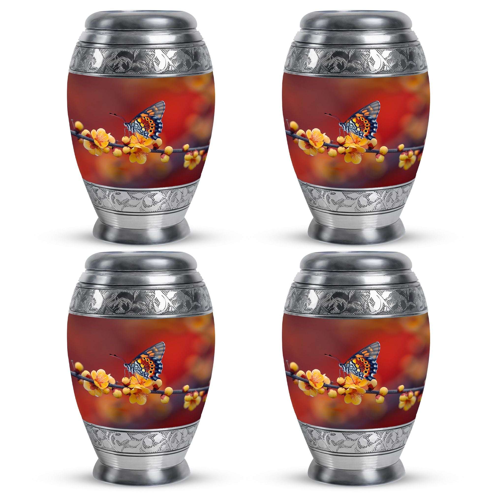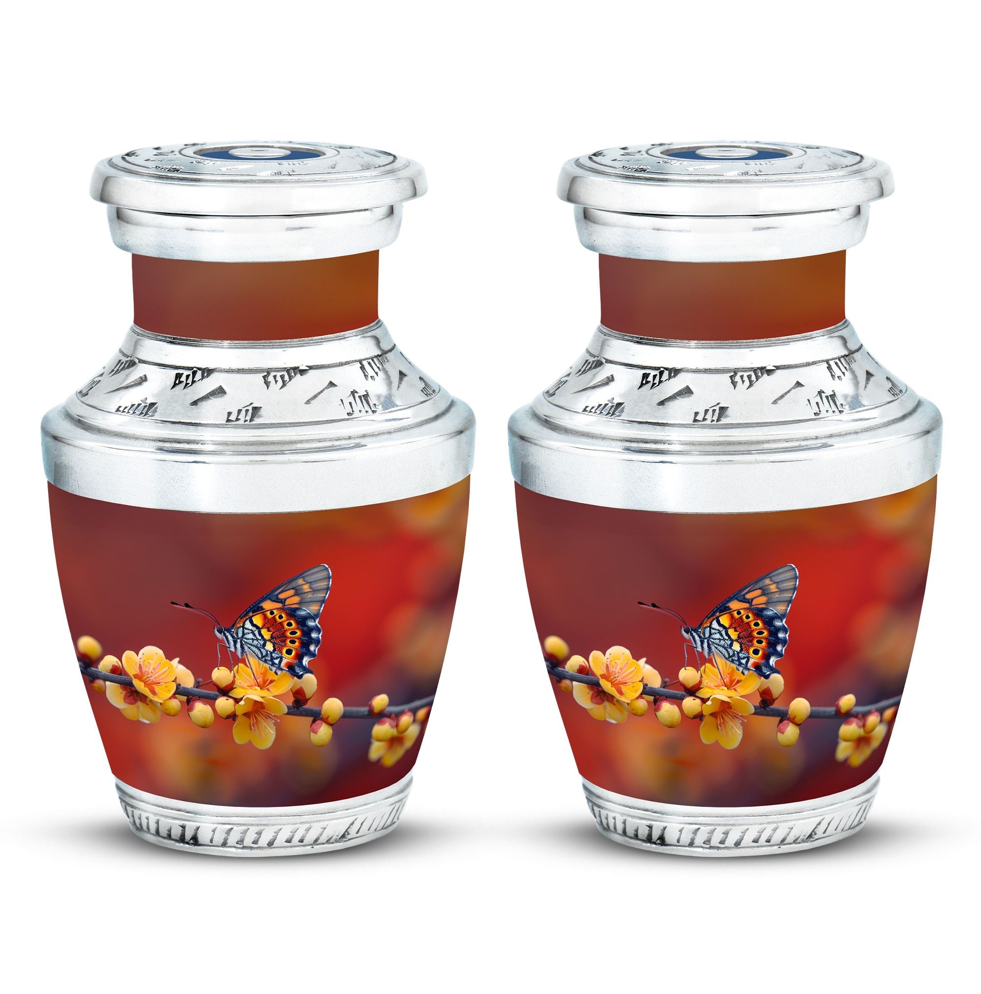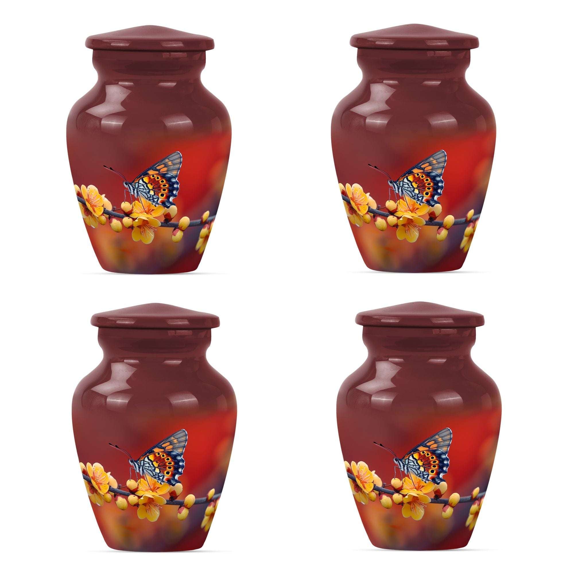 Made from durable aluminum, this urn blends resilience with artistry. The rich red finish paired with delicate yellow floral butterfly detailing symbolizes love, renewal, and eternal connection. Its secure screw-top lid ensures ashes remain safe, making it ideal for use at home, in a memorial niche, or as part of a burial service. Families often pair this urn with mini urns for human ashes adult male or large urns for female & male to share remembrance among relatives.