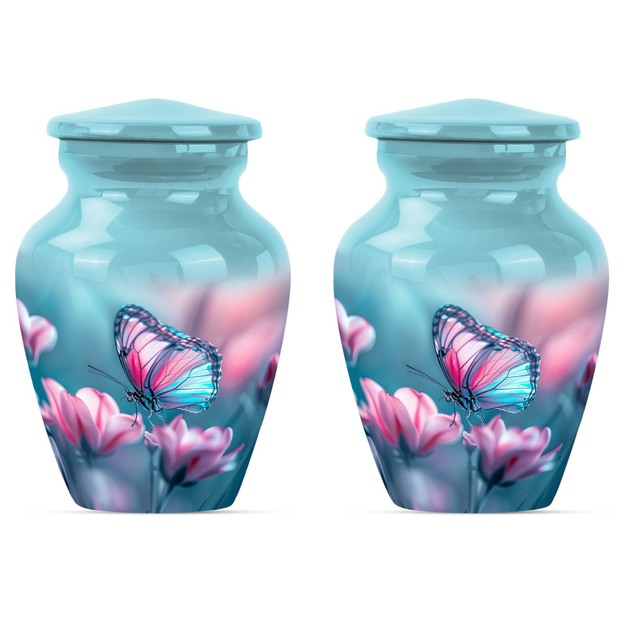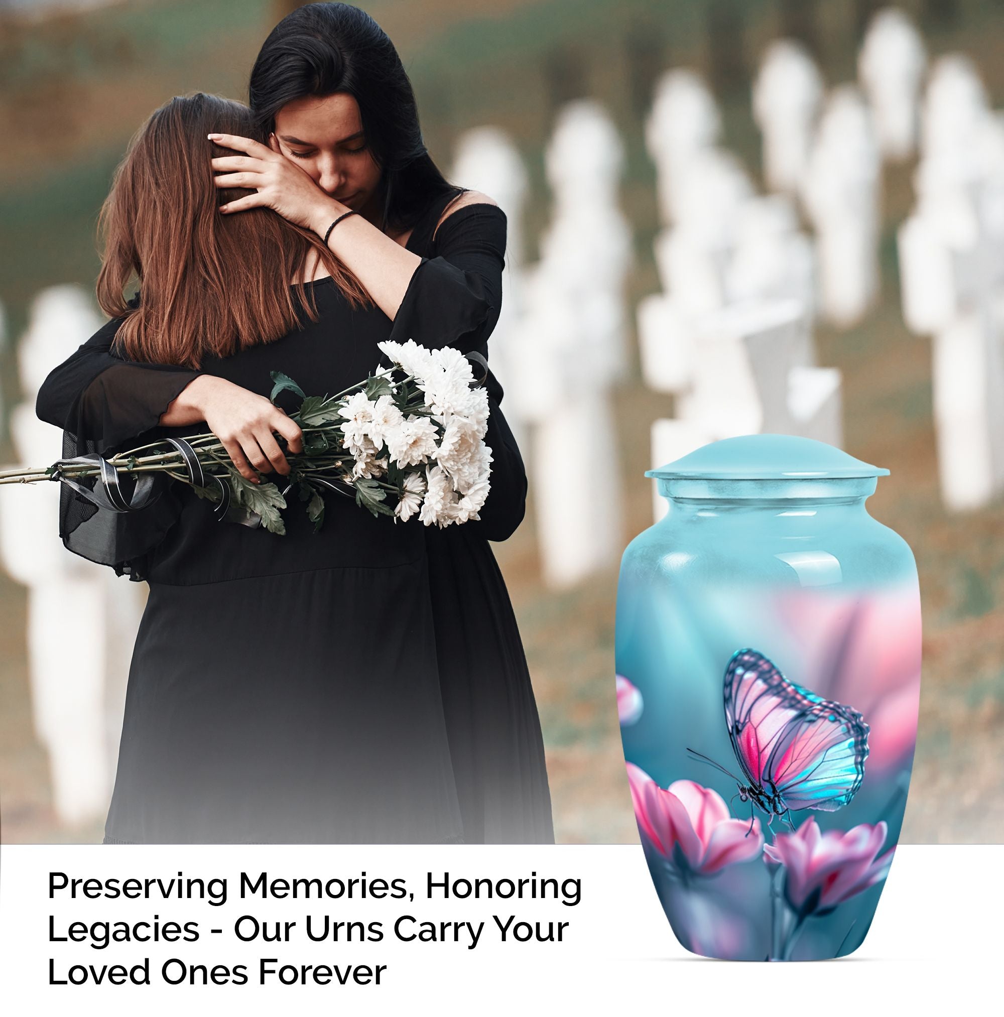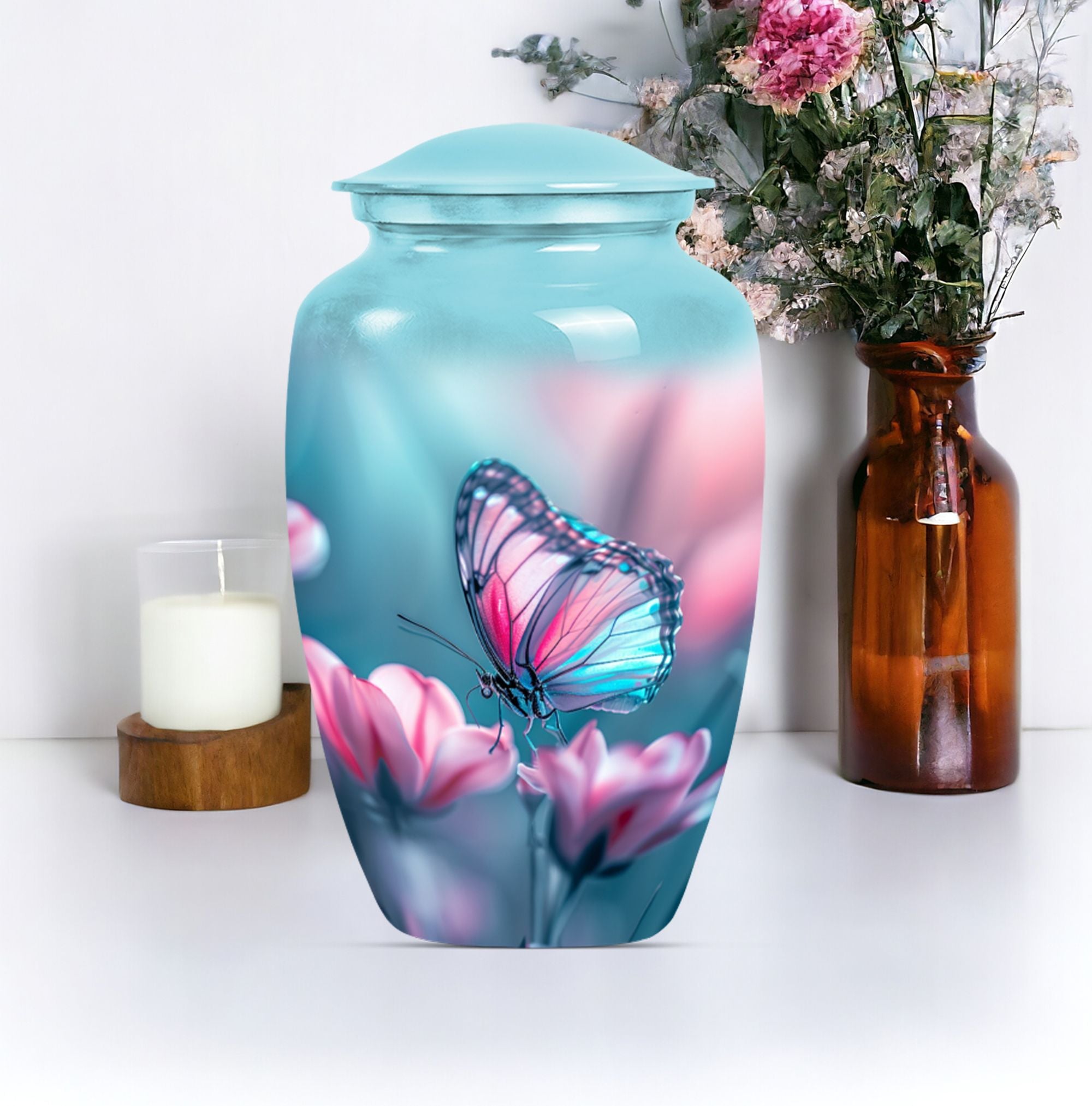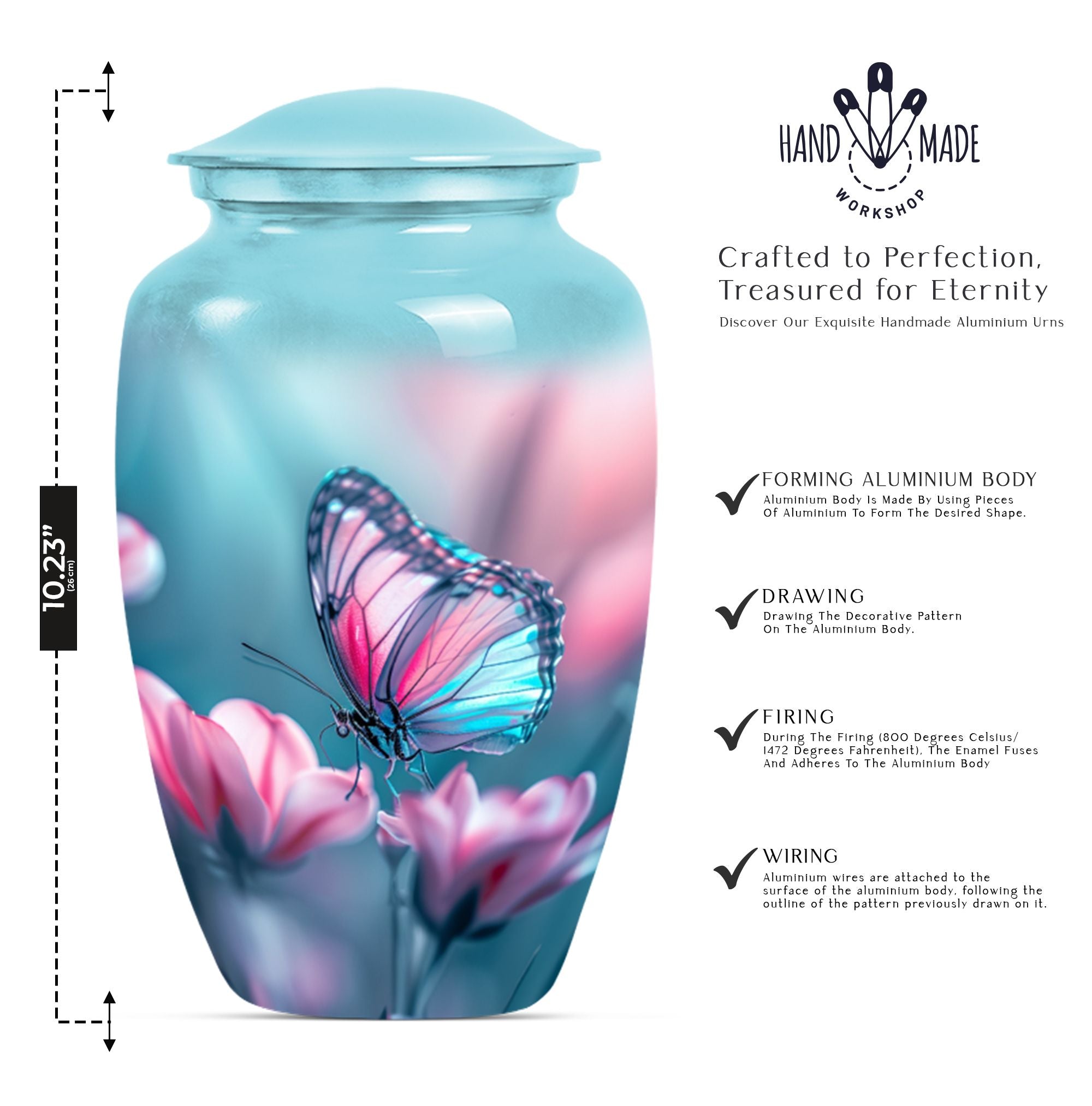 We present to you our large 10-inch butterfly urn, delicately crafted with aluminum, a perfect option for memorial ceremonies and an exquisite substitute for funeral burial urns for adult human ashes. Weighing just 3.3 pounds and standing 10 inches tall, its capacity is ample for safe containment, accommodating up to 200 cubic inches of ashes. The elegance and serenity reflected in the butterfly theme impeccably echo the everlasting memory of your loved one. As an added personal touch, customization options are available to engrave names on the urn, making it an even more intimate memorial tribute. The urn comes with a velvet pouch, ensuring secure storage and respect for the sacred contents. With its utility and significance, it can serve as a shaped shelf, a burial large urn, or a keepsake for human ashes. These exceptional characteristics place these urns as a compelling choice for those looking for burial alternatives, turning the mourning period into a celebration of the life lived. This distinctive butterfly urn will resonate with all those searching for 'memorial urns' or 'cremation urn human ashes.'