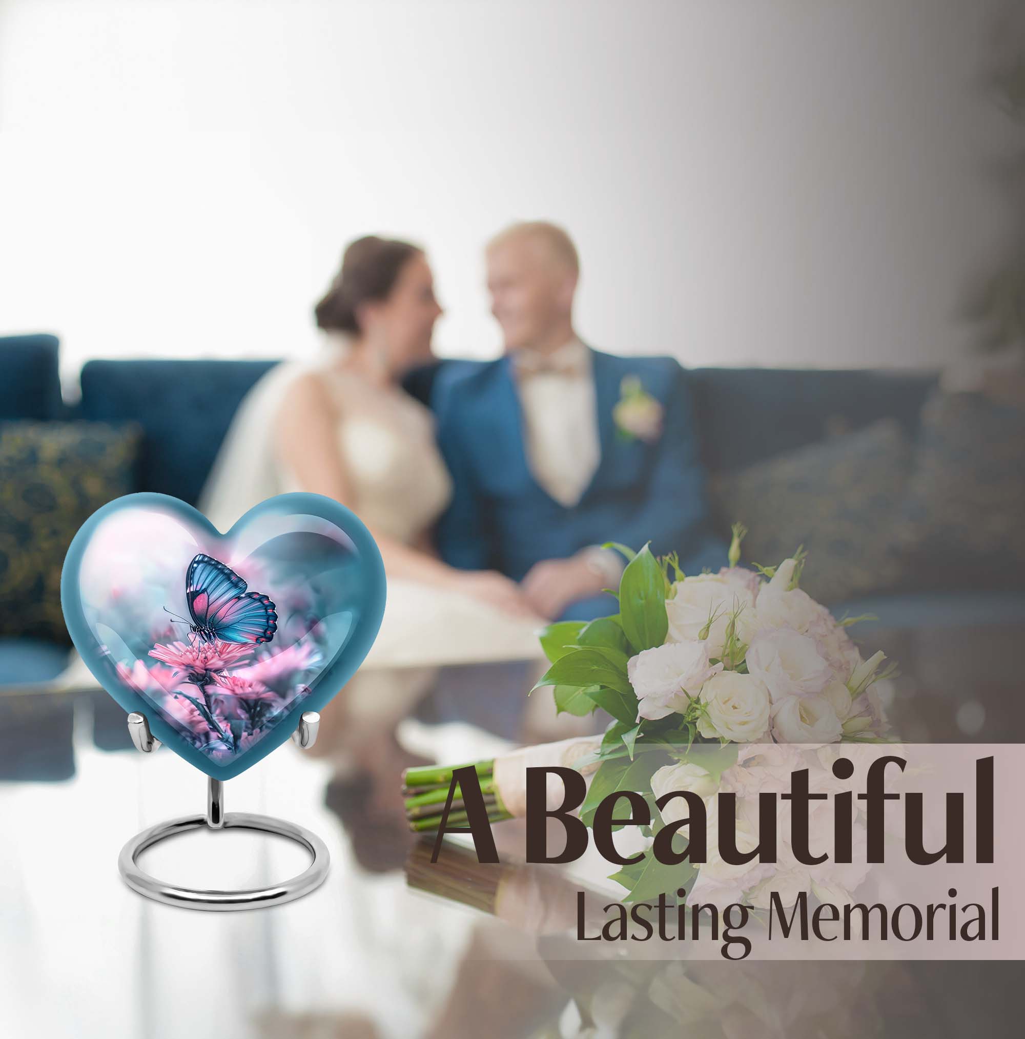 This beautifully conceived 10-inch butterfly urn captures the poignant essence of remembrance in a sophisticated yet deeply personal way. Made of high-quality aluminium, it weighs a solid 3.3 pounds and includes an abstract theme designed to encapsulate your feelings perfectly. This large urn has a 200 cubic inch capacity, enough to respectfully hold your dearly departed's ashes. The highlight lies in the ability to personalize this urn with engraved names, making it a truly unique sentiment to your lost loved one. Packaged with a velvet pouch, it ensures the containment of the ashes, safe and intact. As an alternative to traditional burial urns, this product holds appeal for those looking for modern urns or metal mandir for home. The heart urn design, tied together with the butterfly and memorial urns theme, is ideally suitable for adult female ashes or human ashes. Experience a touch of consolation during this hard time with this distinctive keepsake.
