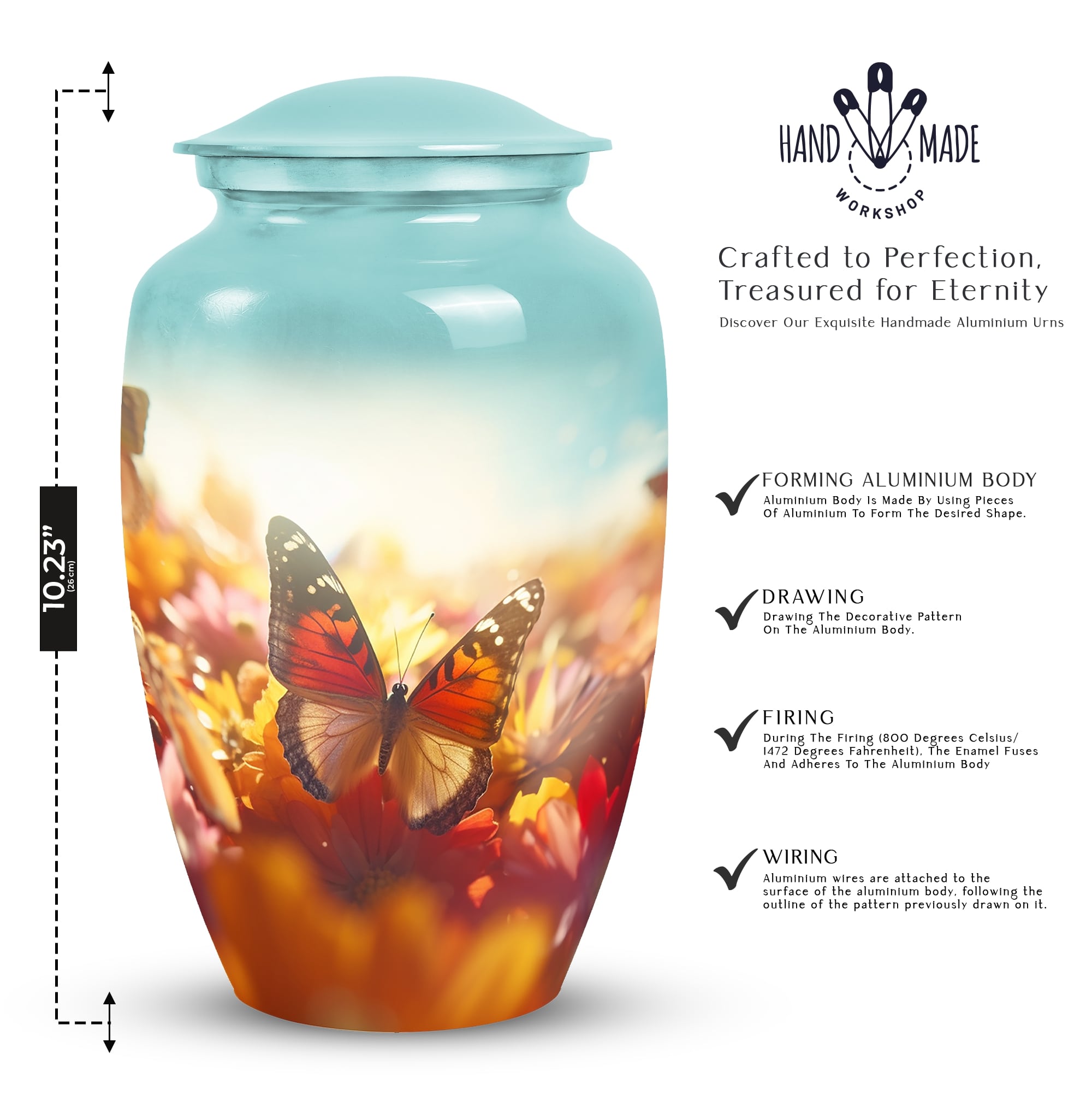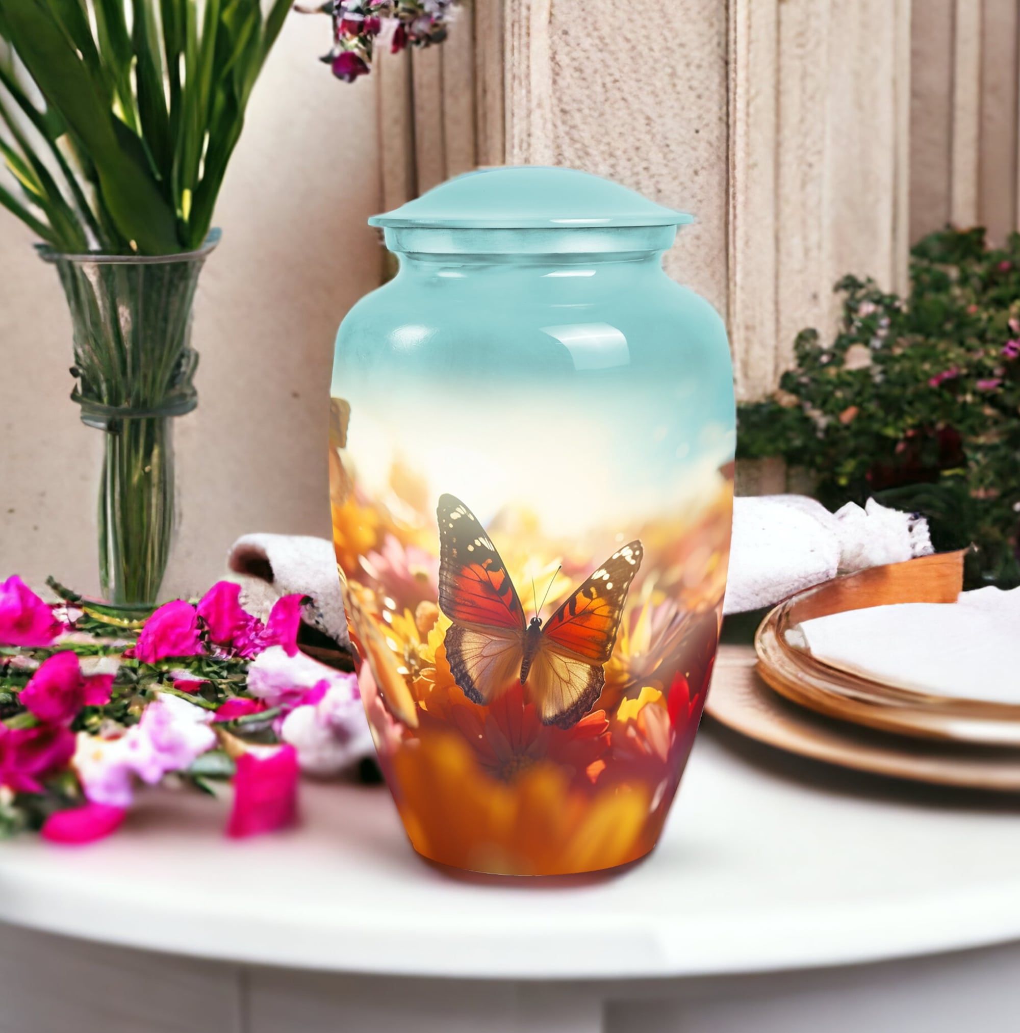 The Vibrant Butterfly Urns for Adult Male Ashes – Gloomy Peaceful Memorial Urn represents serenity, transformation, and eternal love. Its subtle yet vibrant butterfly motif creates a comforting symbol of remembrance, offering families a beautiful way to honor their loved one.