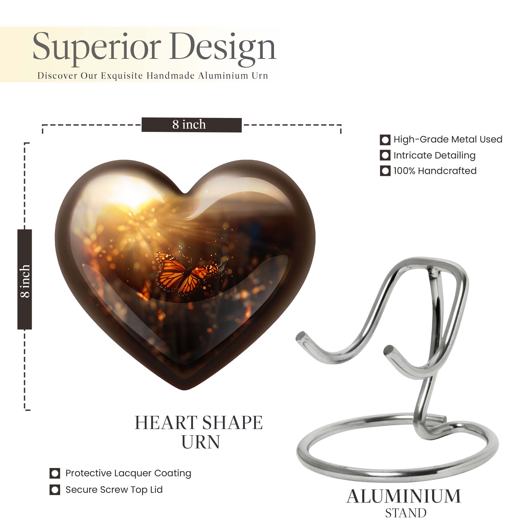 Cherish the memory of a loved one with our butterfly-themed burial large urn. Standing 10 inches in height, this heart urn provides ample room for remembrance with a capacity of 200 cubic inches. Forged from sturdy aluminum, it weighs 3.3 pounds, guaranteeing longevity as time onward flows. The urn portrays a heartwarming theme of a Wolf Howling, tailored to evoke fond memories and gradually heal your heart. This large urn complements your decor and serves as a gentle reminder of their immortal presence in our hearts. You can also choose to make it more special by personalizing with engraved names, making this urn a unique memorial for your loved one. Arriving with a velvet pouch for containment of ashes, this urn is an ideal match for keywords such as 'memorial urns for ashes adult male', 'funeral extra large urn', 'keeping the humans urn ashes', and 'cremation urns for adult ashes women'. Celebrate the eternal bond and love with our captivating butterfly urn.