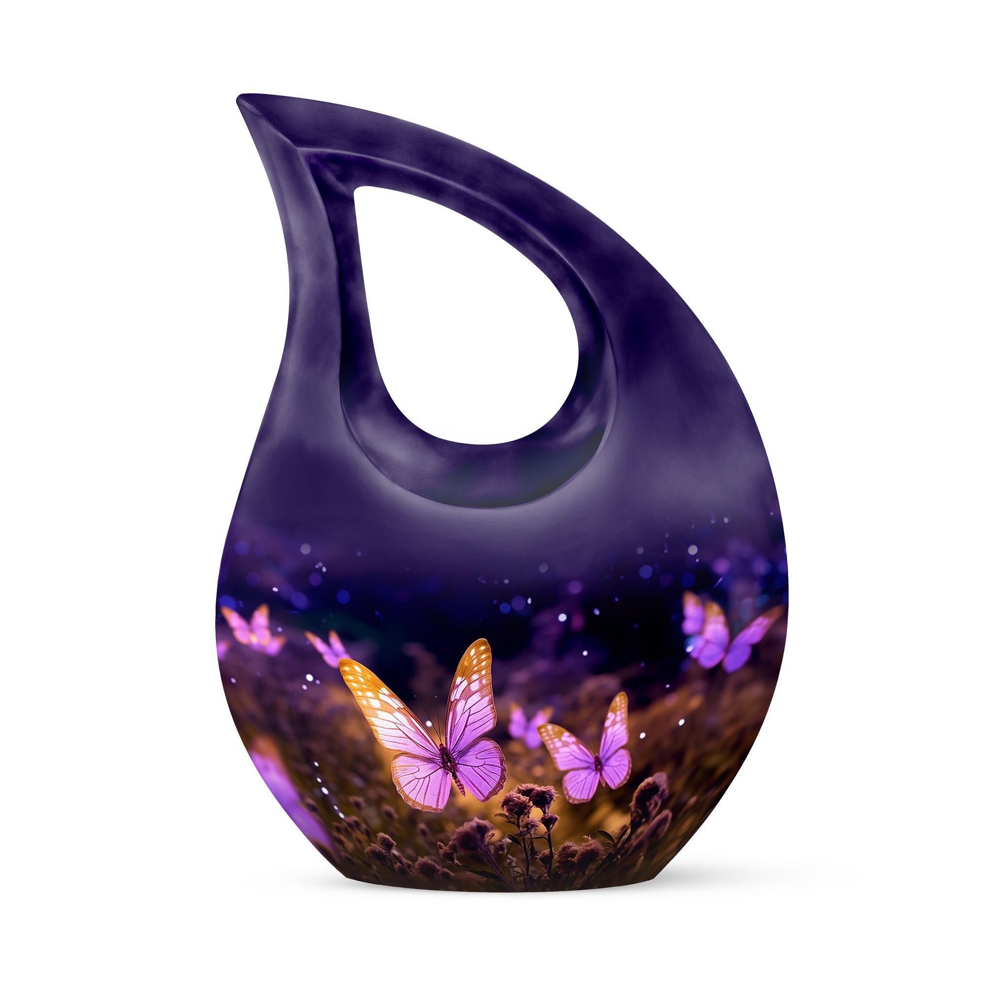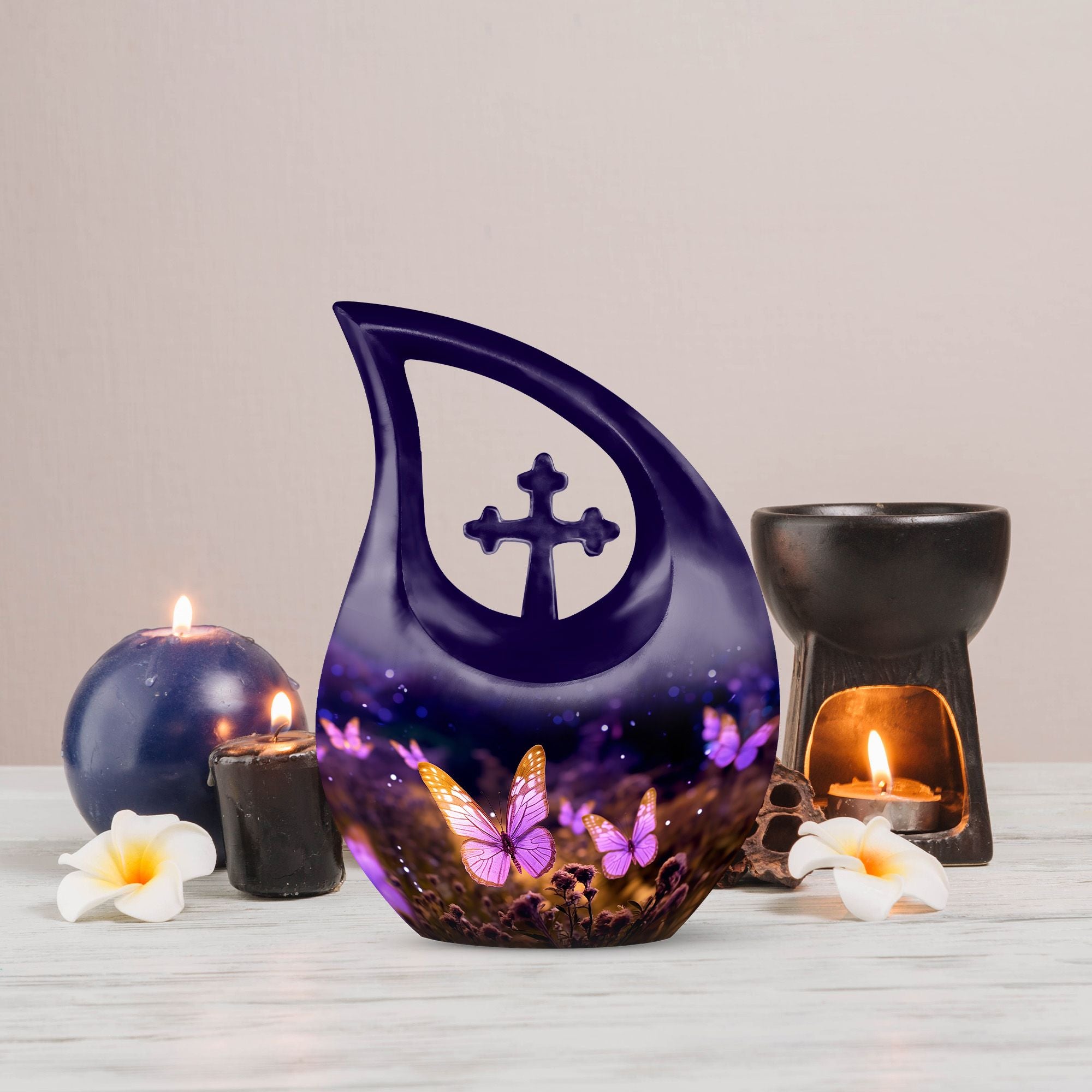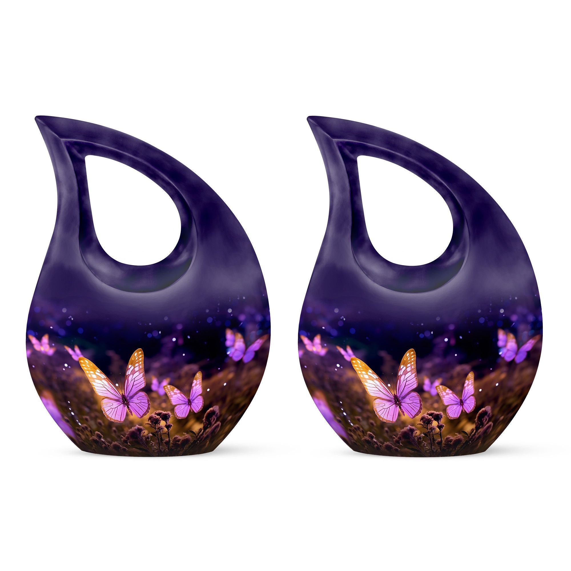 This magnificent Butterfly Urn is the ideal choice to honor your loved one. Crafted from sturdy aluminium, this large urn weighs 3.3 pounds and has a substantial 200 cubic inch capacity. The stately 10-inch height of the urn is commanding, yet balanced with its delicate 'Cross Drop' theme. As a sublime touch, we offer personalization options where names can be finely engraved on the urn surface, providing a heartfelt keepsake. Each urn comes with a velvet pouch for containing and preserving the ashes. Our urn is more than just a vessel, it serves as a tangible expression of love and serenity. Standout keyword phrases like 'memorial urns,' 'Butterfly urn for mom,' 'Double urn,' and 'Ashes into keepsakes' defines the monumental impact of this product. Elevating it further are terms like 'decorative urns for ashes' and 'Butterfly urns for ashes,' accentuating the aesthetic alongside function. Note: design aspects are not detailed as per instructions.