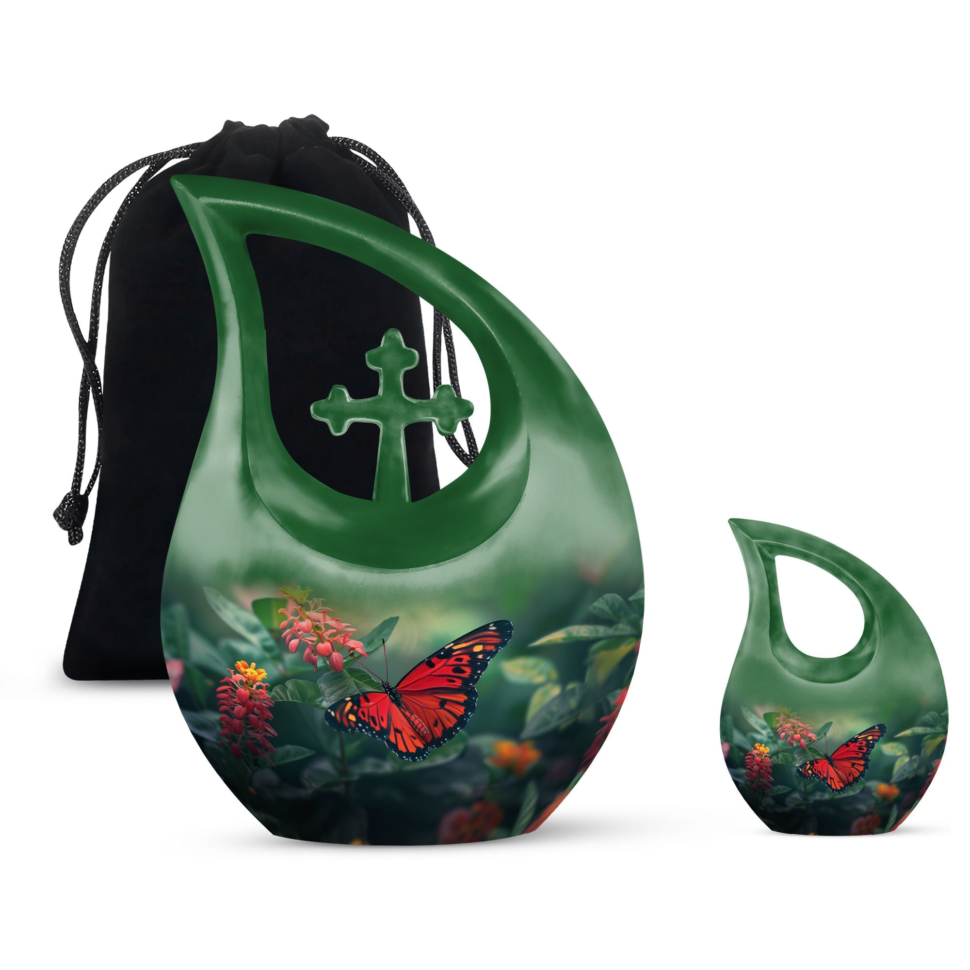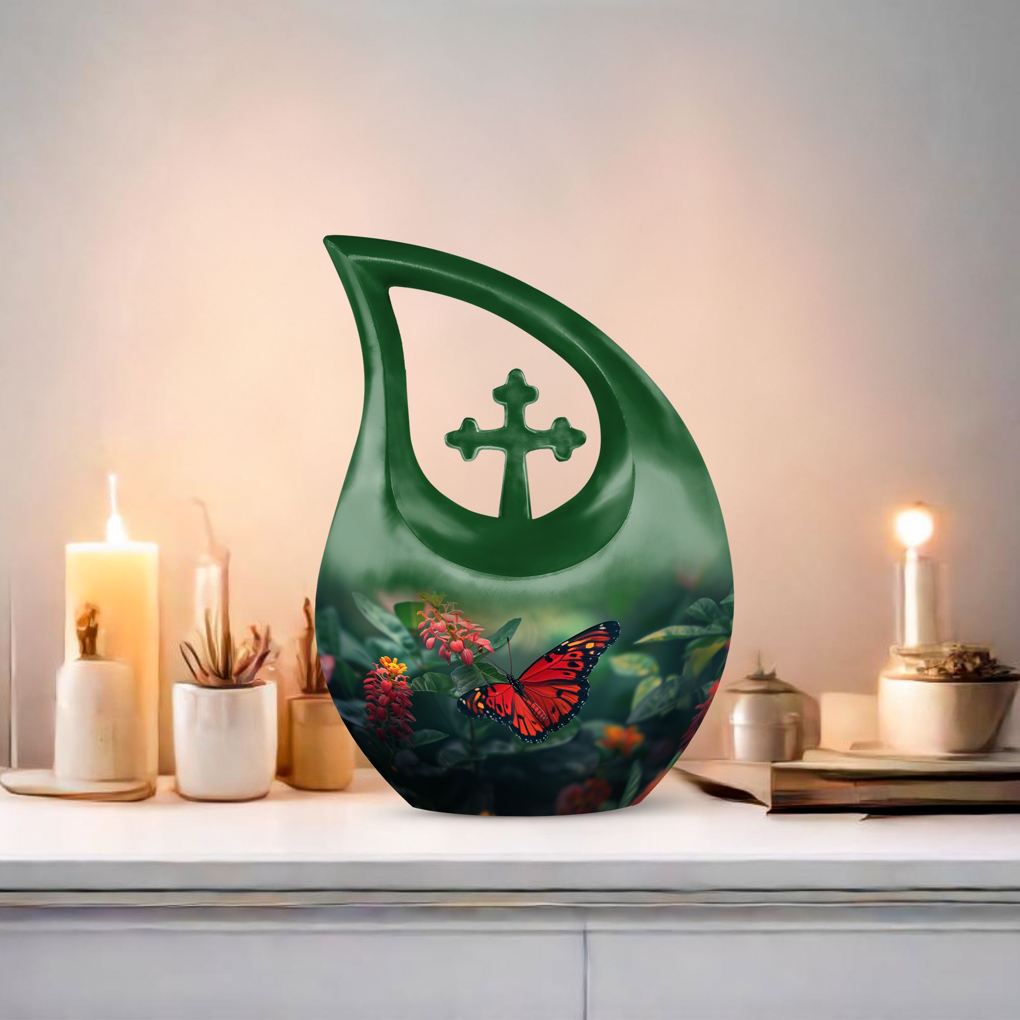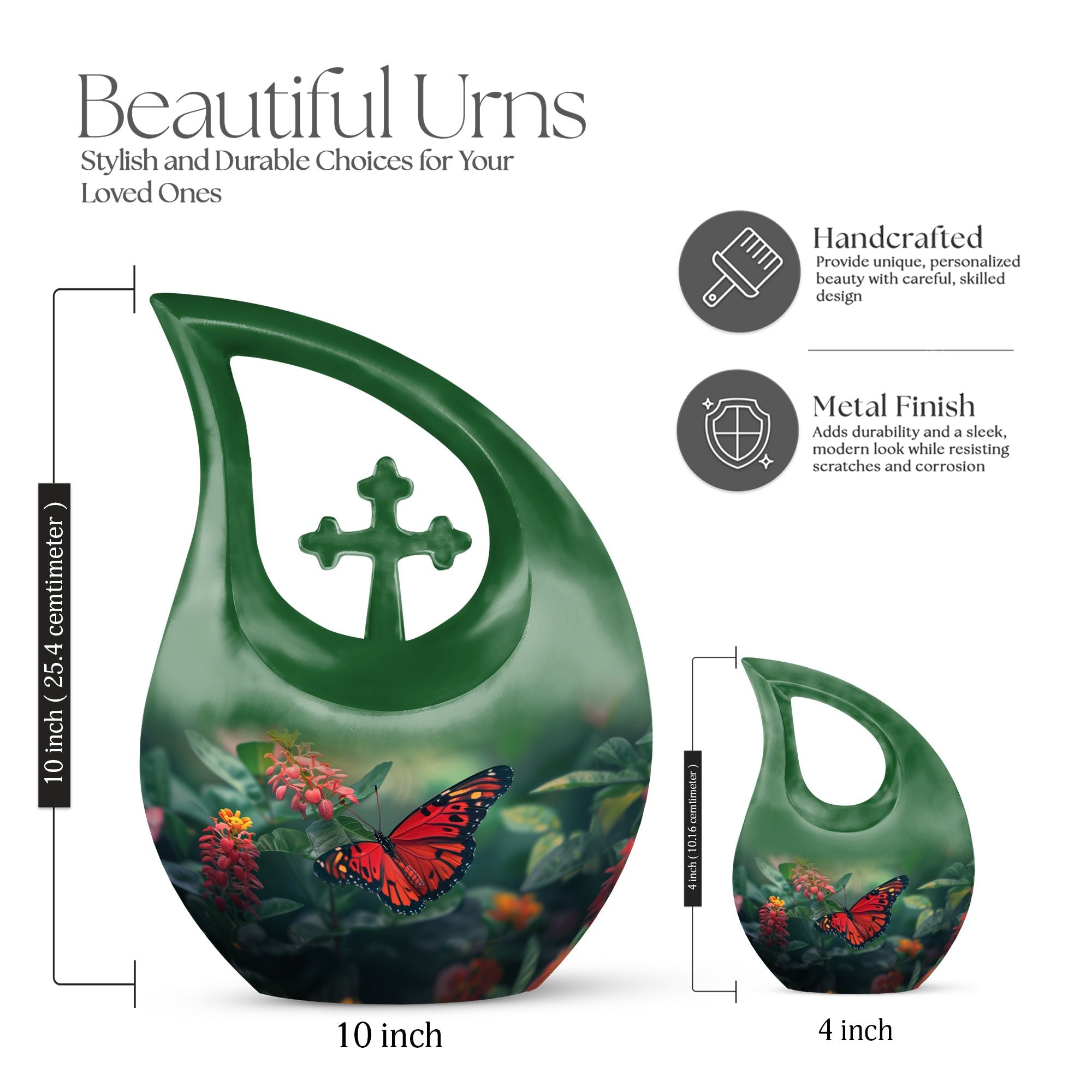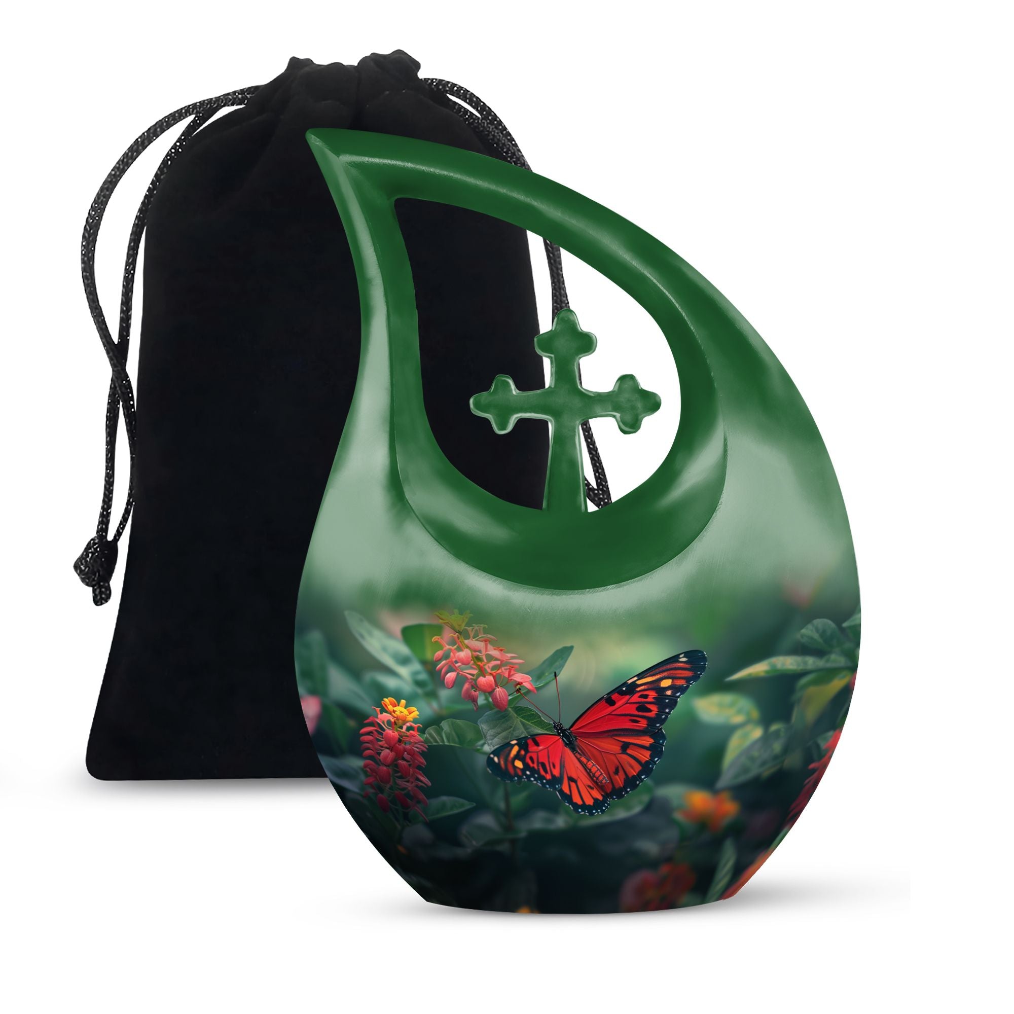 Experience heartfelt peace when you lay eyes on our Cross Drop Butterfly Urn. Fashioned from durable aluminium, this Large Urn stands proudly at a 10-inch height, with a weight of 3.3 pounds, and possesses a holding capacity of up to 200 cubic inches. Our Butterfly Urn is more than ordinary - it's a symbol of remembrance, love, and tribute. Facilitating a respectful last rite, it comes complete with a velvet pouch, ensuring a safe containment for the treasured ashes. Further adding to its charm, our urn can be personalized with engraved names, fostering an intimate and customized connection. Known for being an affordable cremation option, it is an epitome of economy and quality seamlessly blended. This Butterfly Urn signifies a cost-effective solution for those seeking cheap funeral urns. Capturing the essence of your loved one's spirit, our memorial urn is a testament to their beautiful journey.