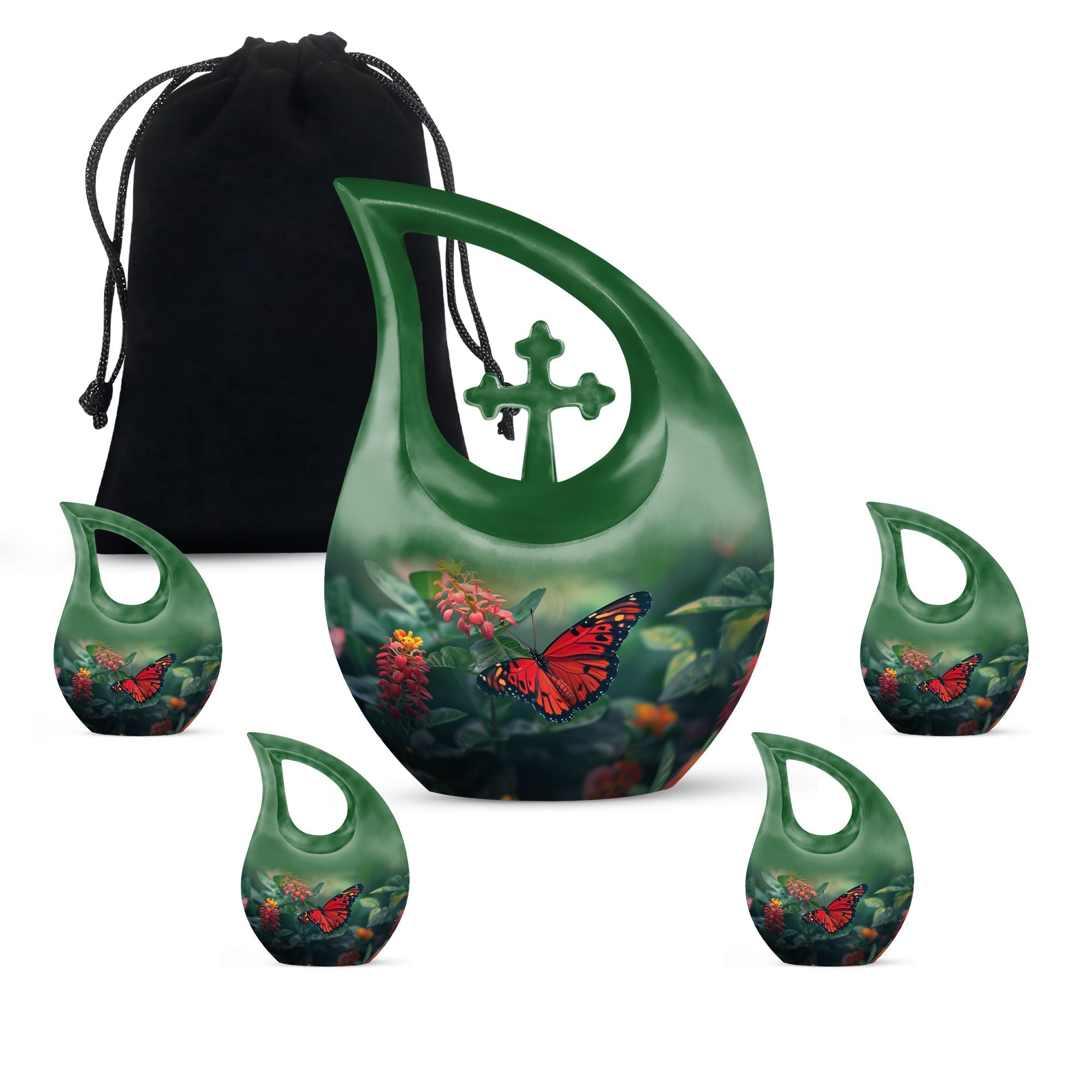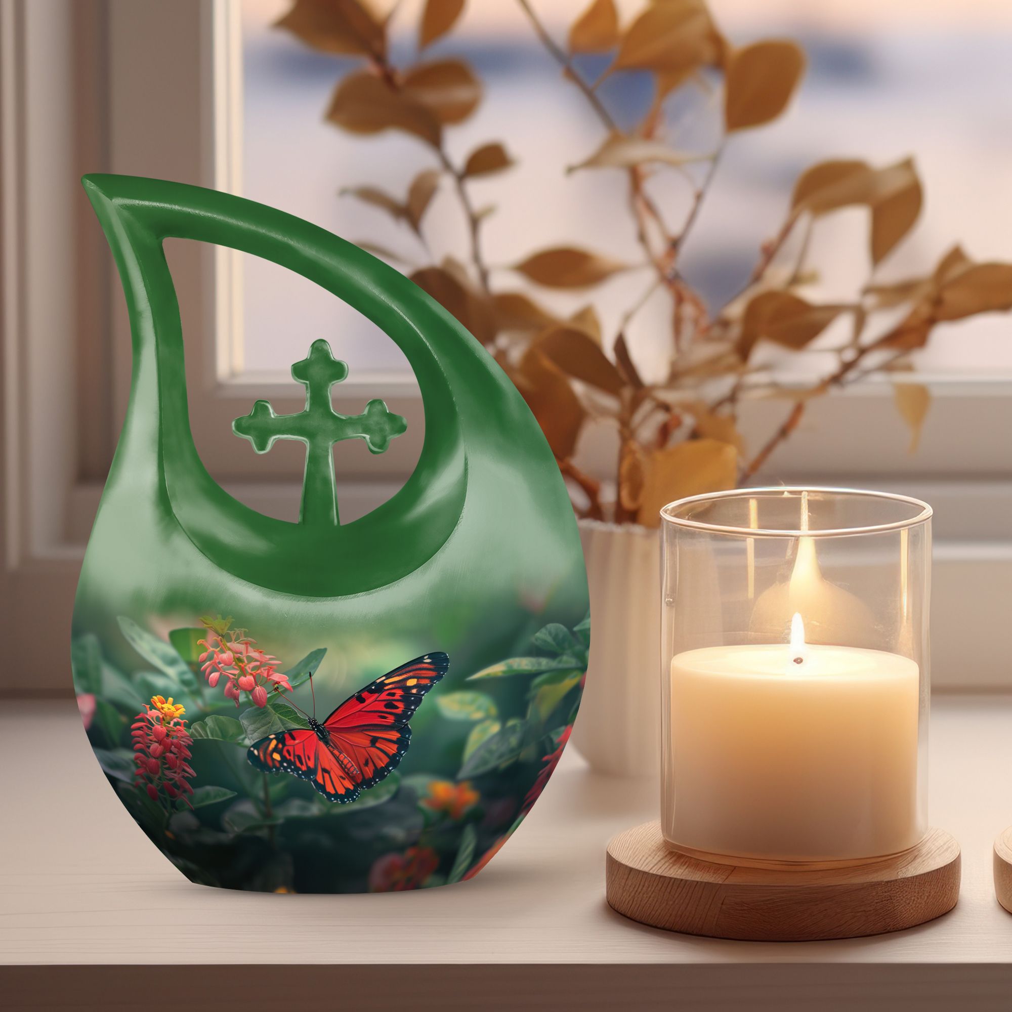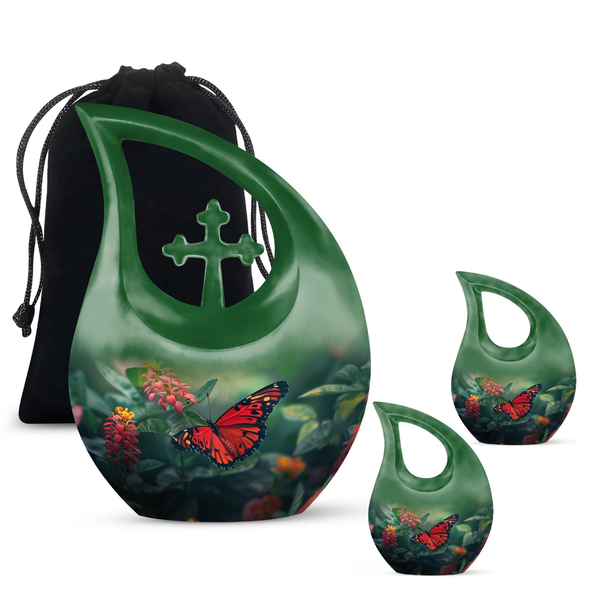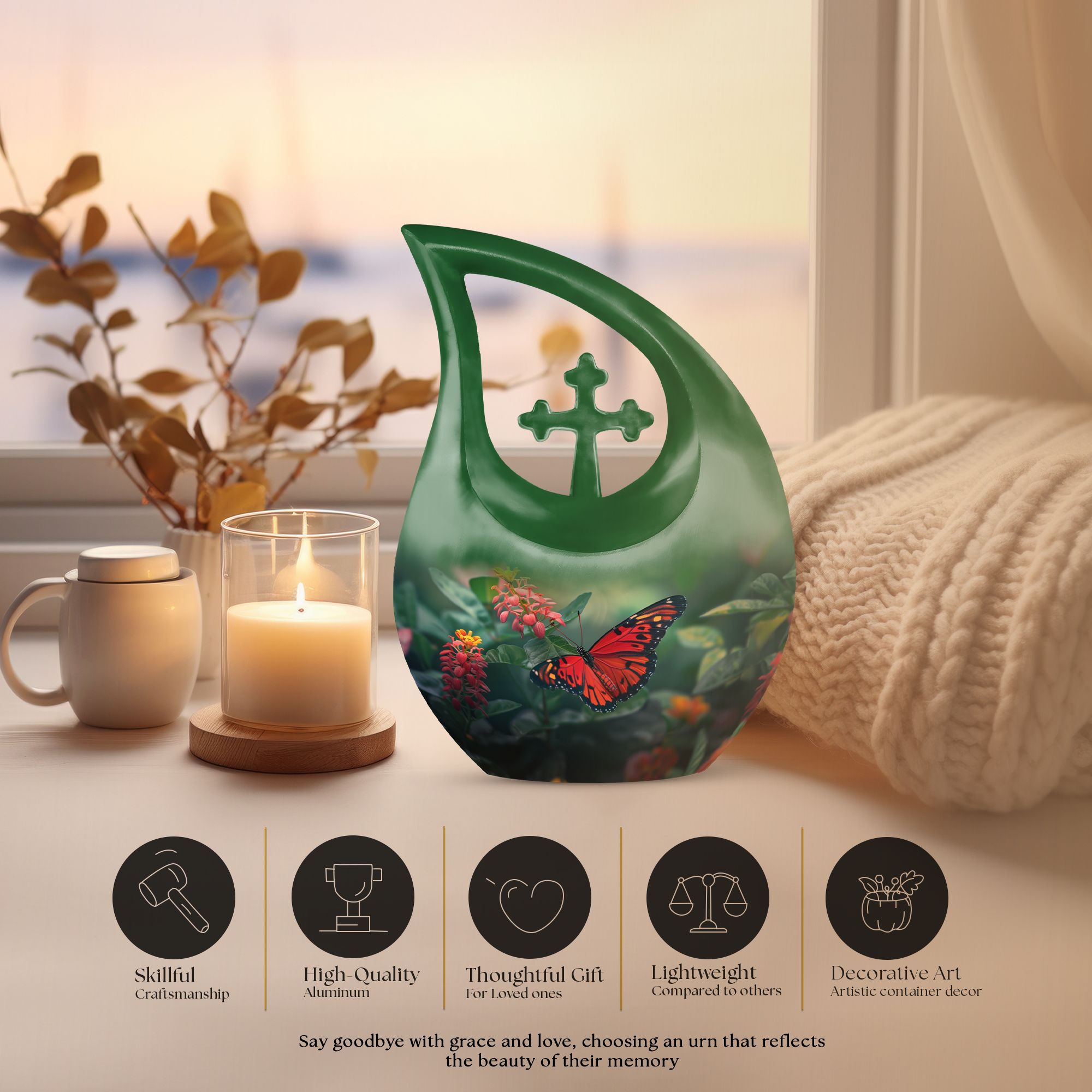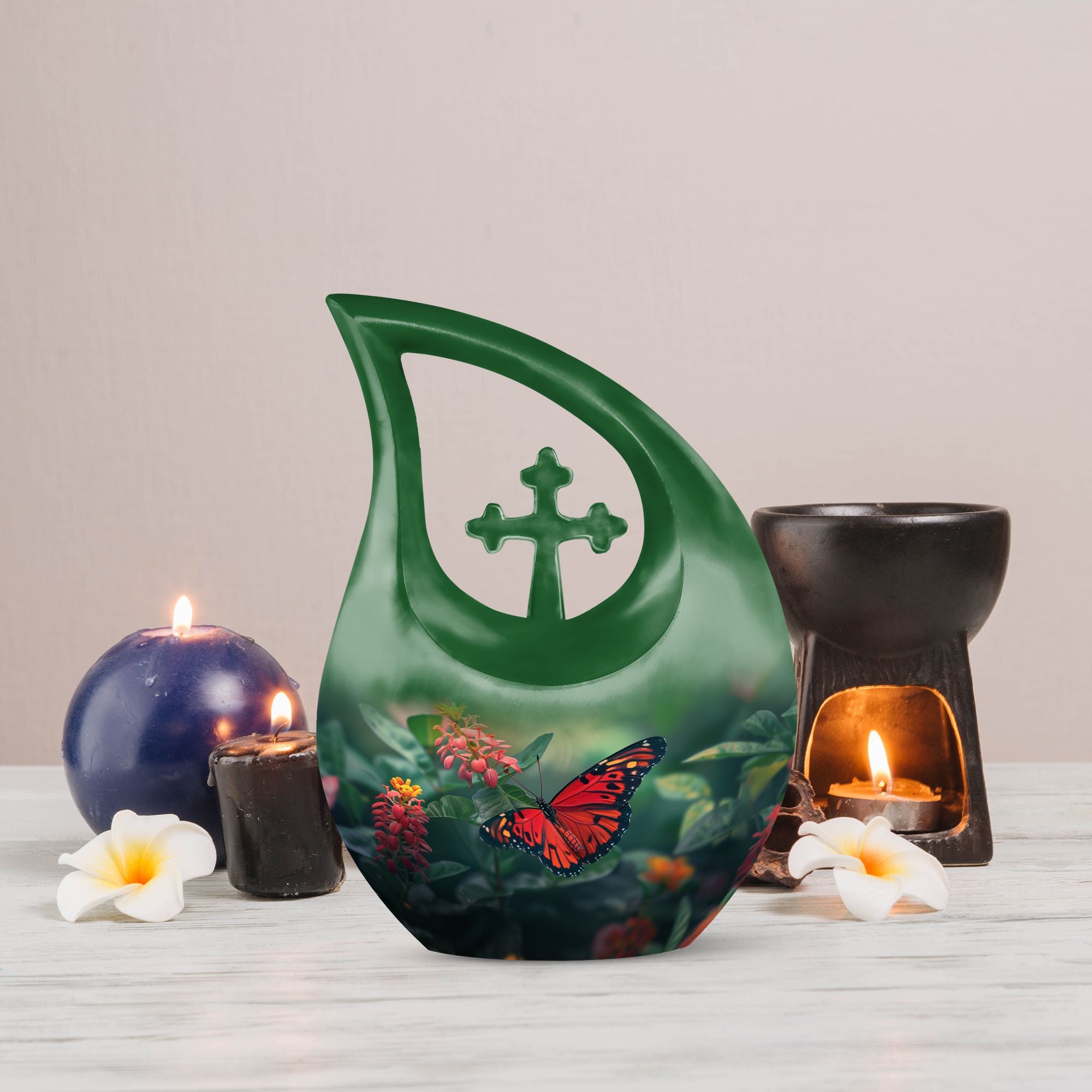 Experience heartfelt peace when you lay eyes on our Cross Drop Butterfly Urn. Fashioned from durable aluminium, this Large Urn stands proudly at a 10-inch height, with a weight of 3.3 pounds, and possesses a holding capacity of up to 200 cubic inches. Our Butterfly Urn is more than ordinary - it's a symbol of remembrance, love, and tribute. Facilitating a respectful last rite, it comes complete with a velvet pouch, ensuring a safe containment for the treasured ashes. Further adding to its charm, our urn can be personalized with engraved names, fostering an intimate and customized connection. Known for being an affordable cremation option, it is an epitome of economy and quality seamlessly blended. This Butterfly Urn signifies a cost-effective solution for those seeking cheap funeral urns. Capturing the essence of your loved one's spirit, our memorial urn is a testament to their beautiful journey.