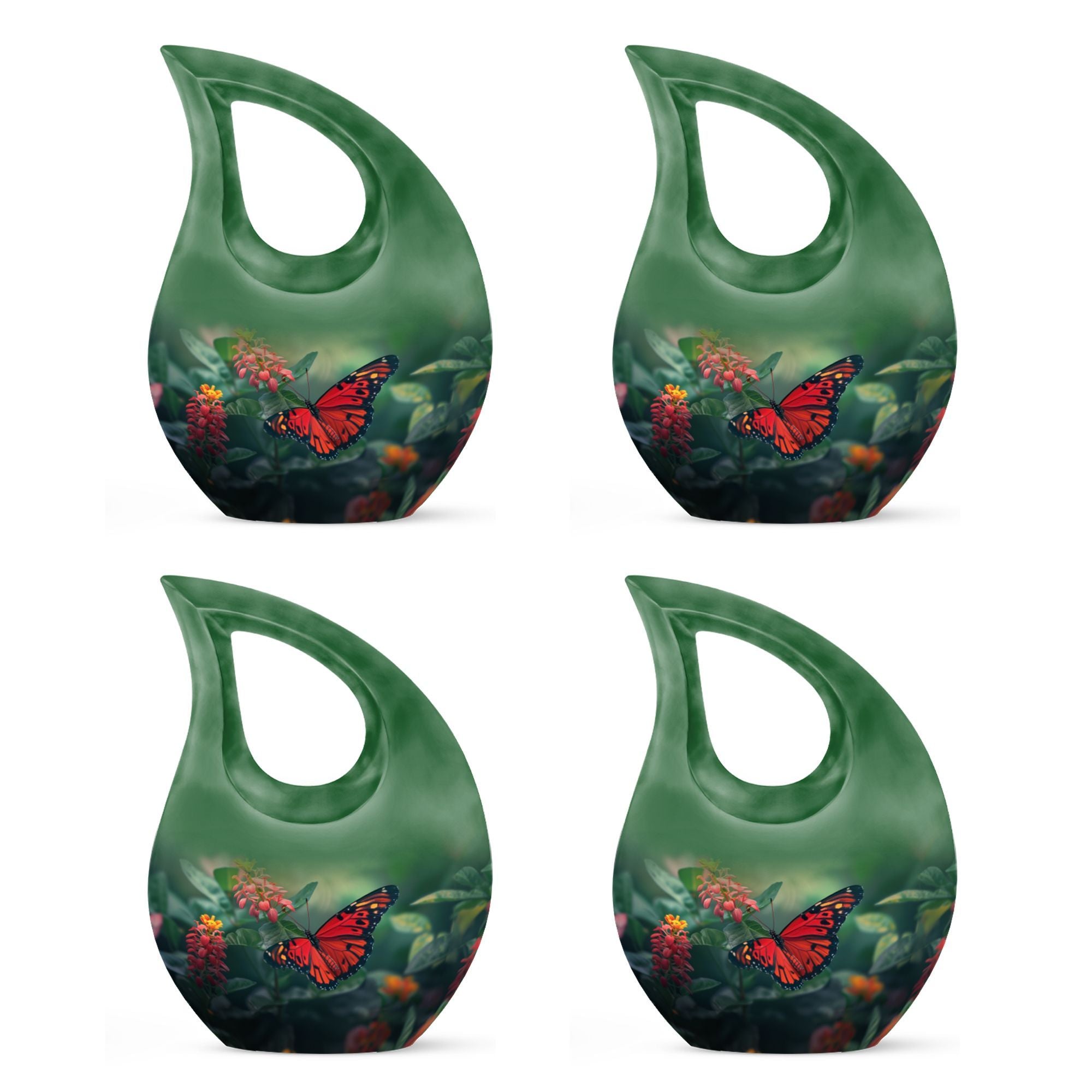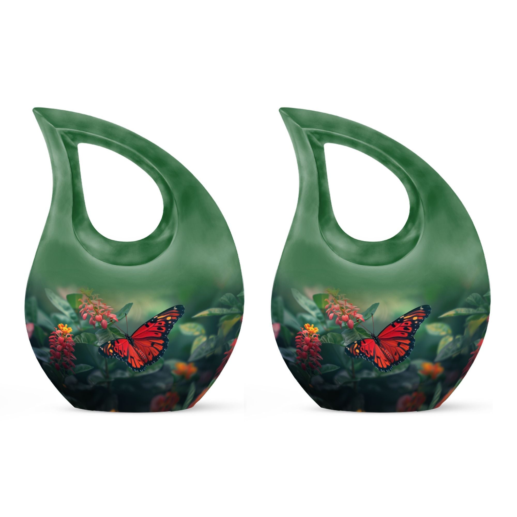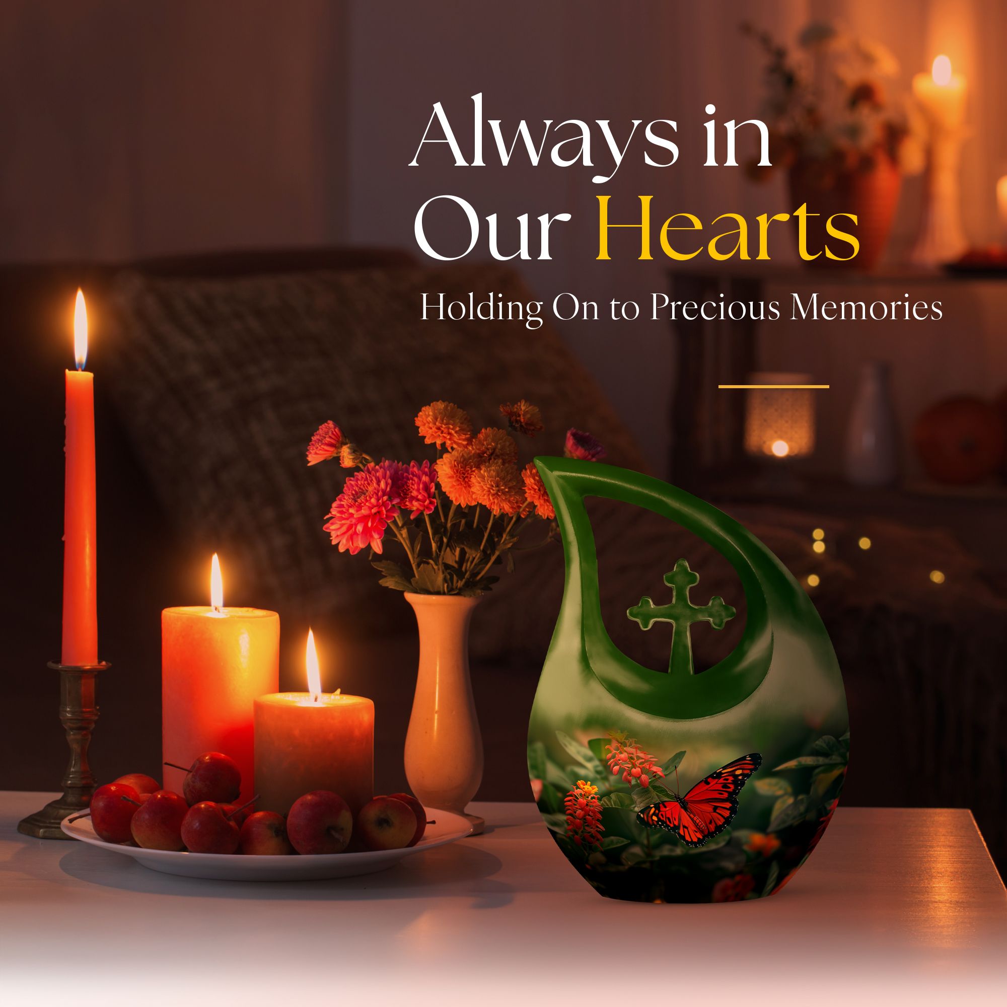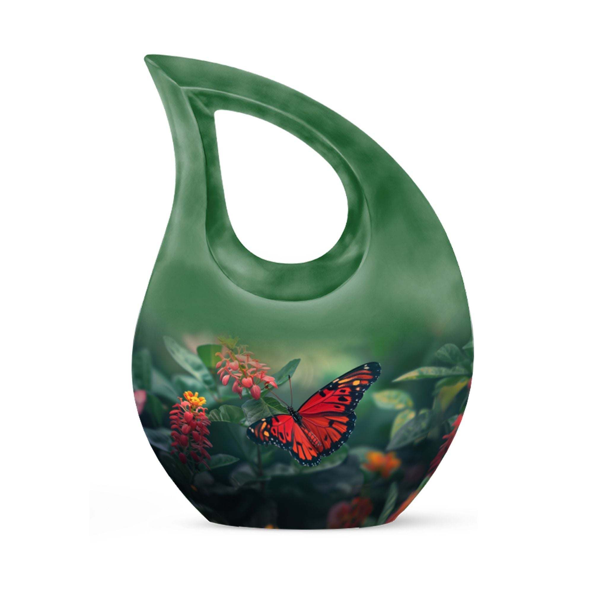 Experience heartfelt peace when you lay eyes on our Cross Drop Butterfly Urn. Fashioned from durable aluminium, this Large Urn stands proudly at a 10-inch height, with a weight of 3.3 pounds, and possesses a holding capacity of up to 200 cubic inches. Our Butterfly Urn is more than ordinary - it's a symbol of remembrance, love, and tribute. Facilitating a respectful last rite, it comes complete with a velvet pouch, ensuring a safe containment for the treasured ashes. Further adding to its charm, our urn can be personalized with engraved names, fostering an intimate and customized connection. Known for being an affordable cremation option, it is an epitome of economy and quality seamlessly blended. This Butterfly Urn signifies a cost-effective solution for those seeking cheap funeral urns. Capturing the essence of your loved one's spirit, our memorial urn is a testament to their beautiful journey.
