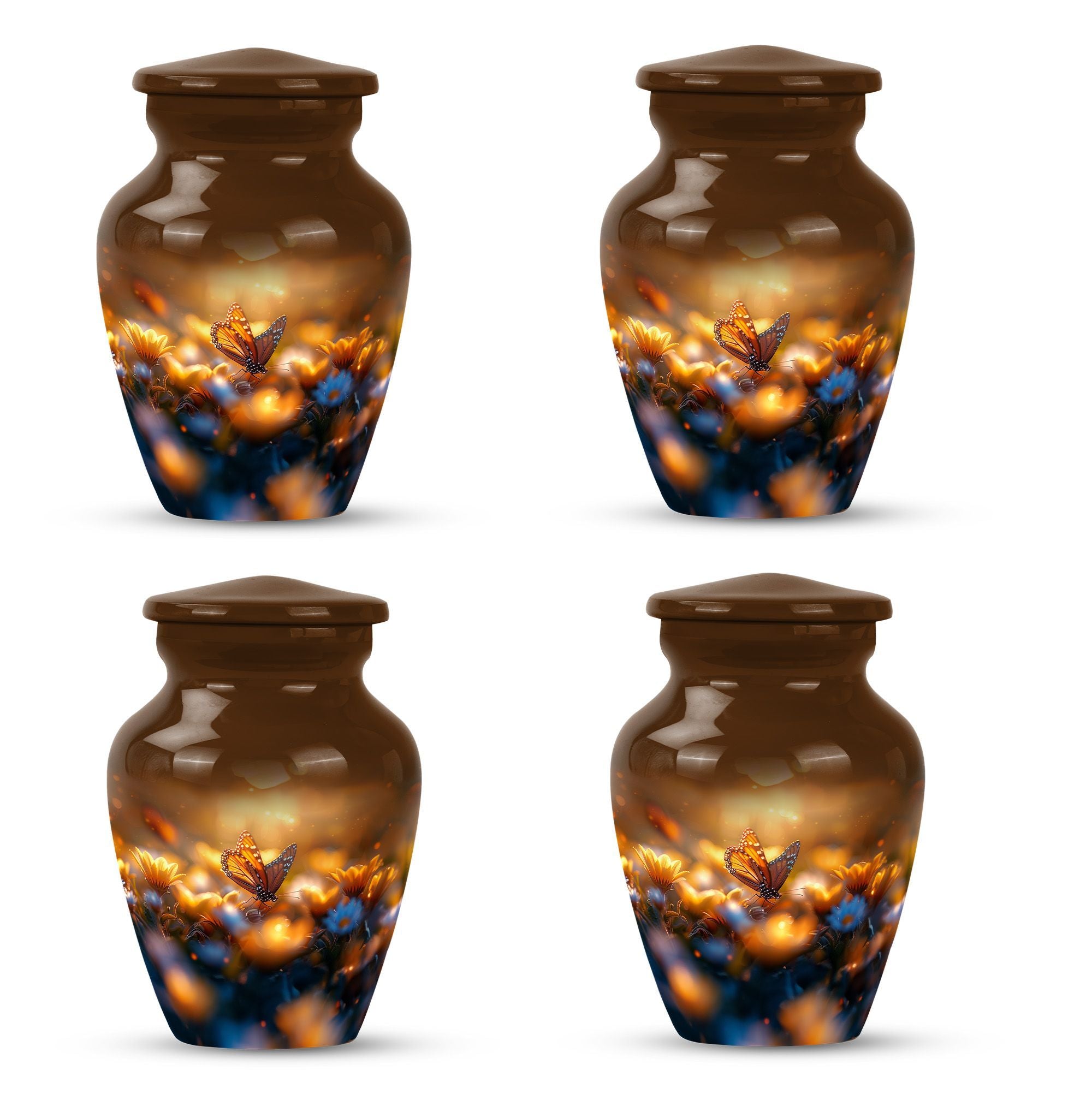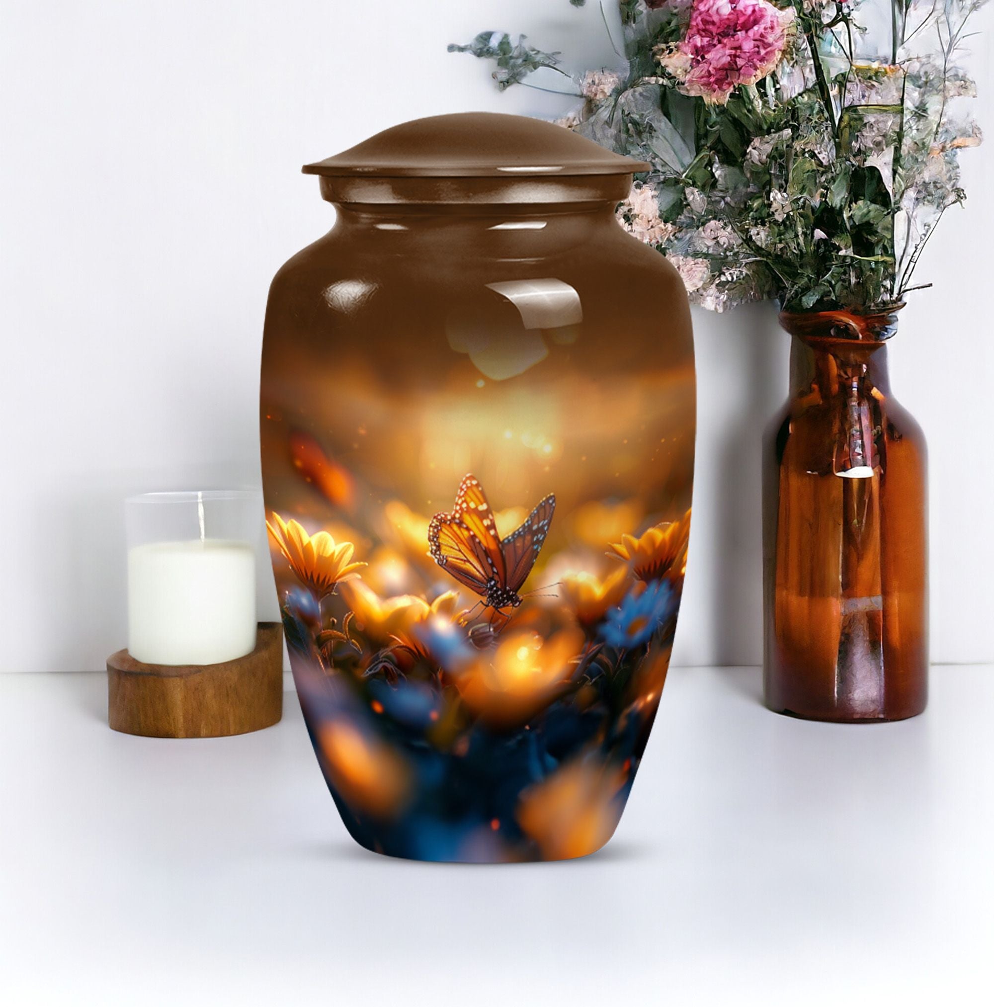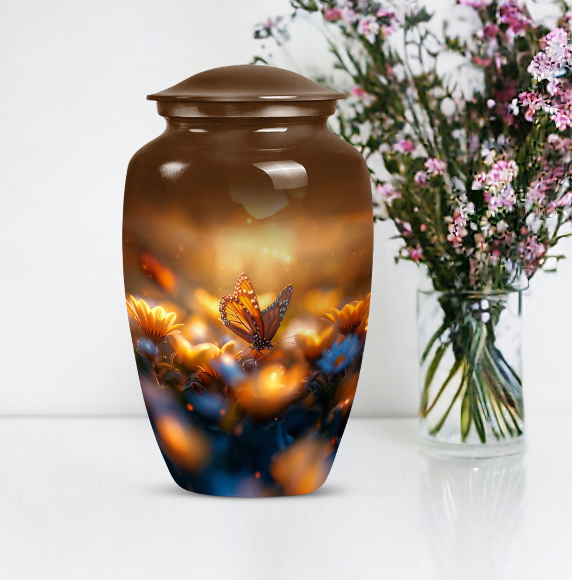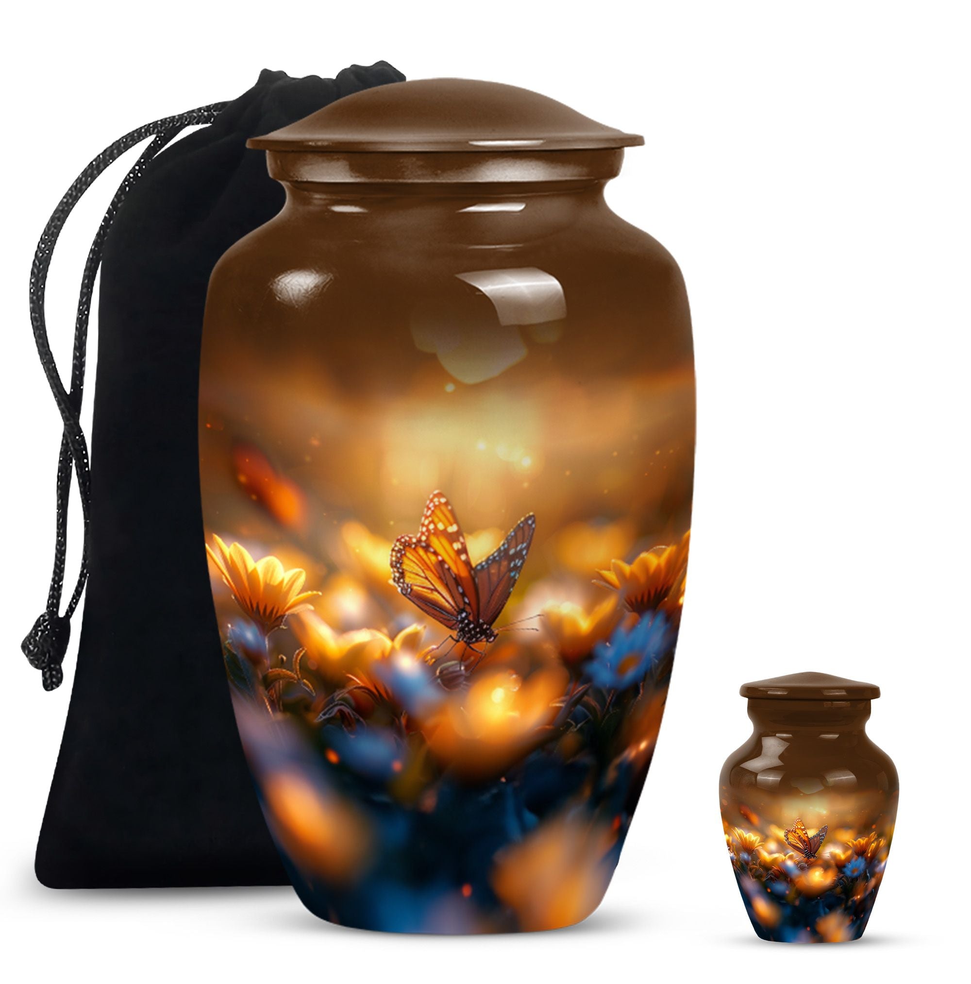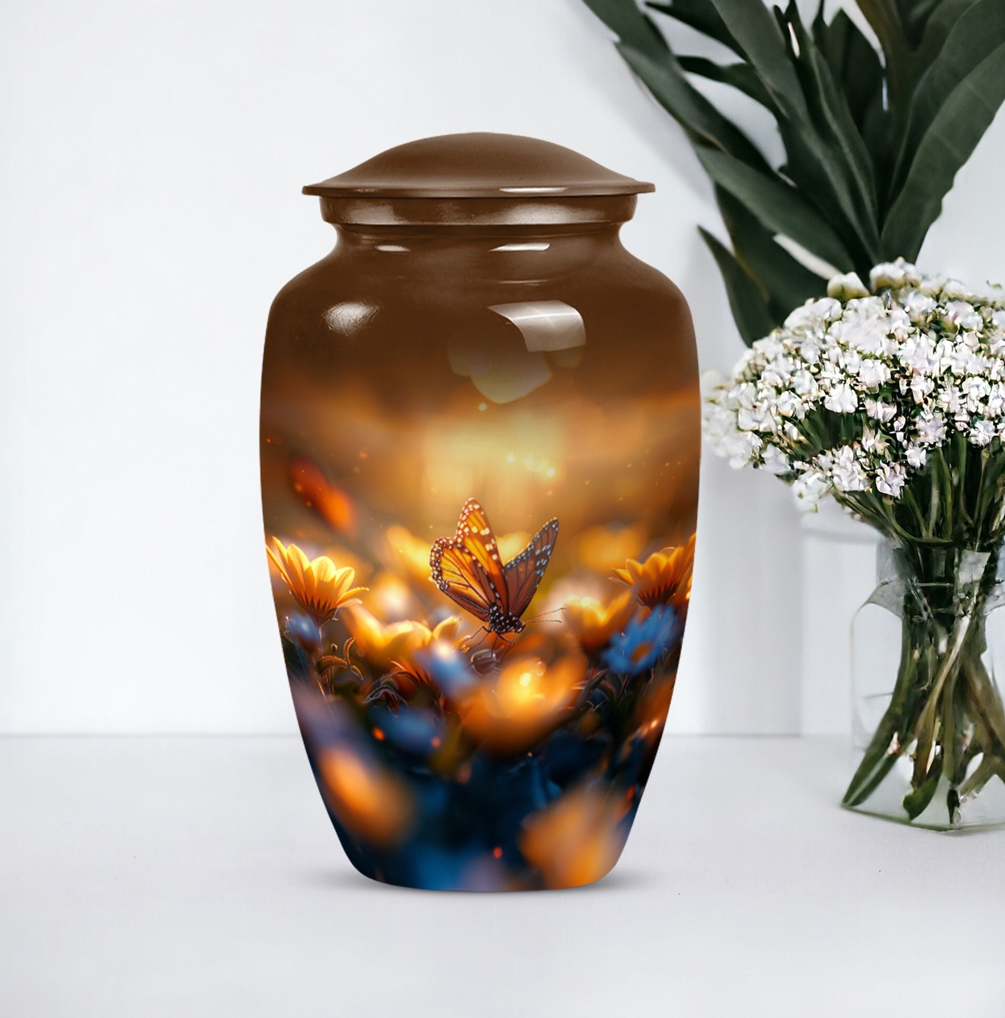 Evoke tranquility and remembrance with our distinguished 10-inch Butterfly Urn. Exuding eternal serenity, this large burial funeral urn is designed exclusively for adult ashes, be it for men or women. Etched with an abstract theme, this robust aluminium urn has an inherent strength to withstand burial in ground. It creates a captivating memorial for your loved one, elevating the traditional farewell ceremony to a profound emotional connection. The urn has an optimal capacity of 200 cubic inches, making it suitable for containing an average adult’s ashes comfortably. It weighs about 3.3 pounds, ensuring stability yet ease in handling. We also offer an opportunity to personalize this urn with engraved names, adding a unique touch to honor the cherished memory of your dear one. Included in your order is a soft velvet pouch specifically to maintain and contain the ashes. This cremation urn, often referred as 'memorial urn,' hence creating a timeless tribute to your beloved. Keywords include butterfly urn, burial funeral urns, large urn for ashes, ash adult ashes, women urn, earn cremation and metal urns, for a full range of the search options.