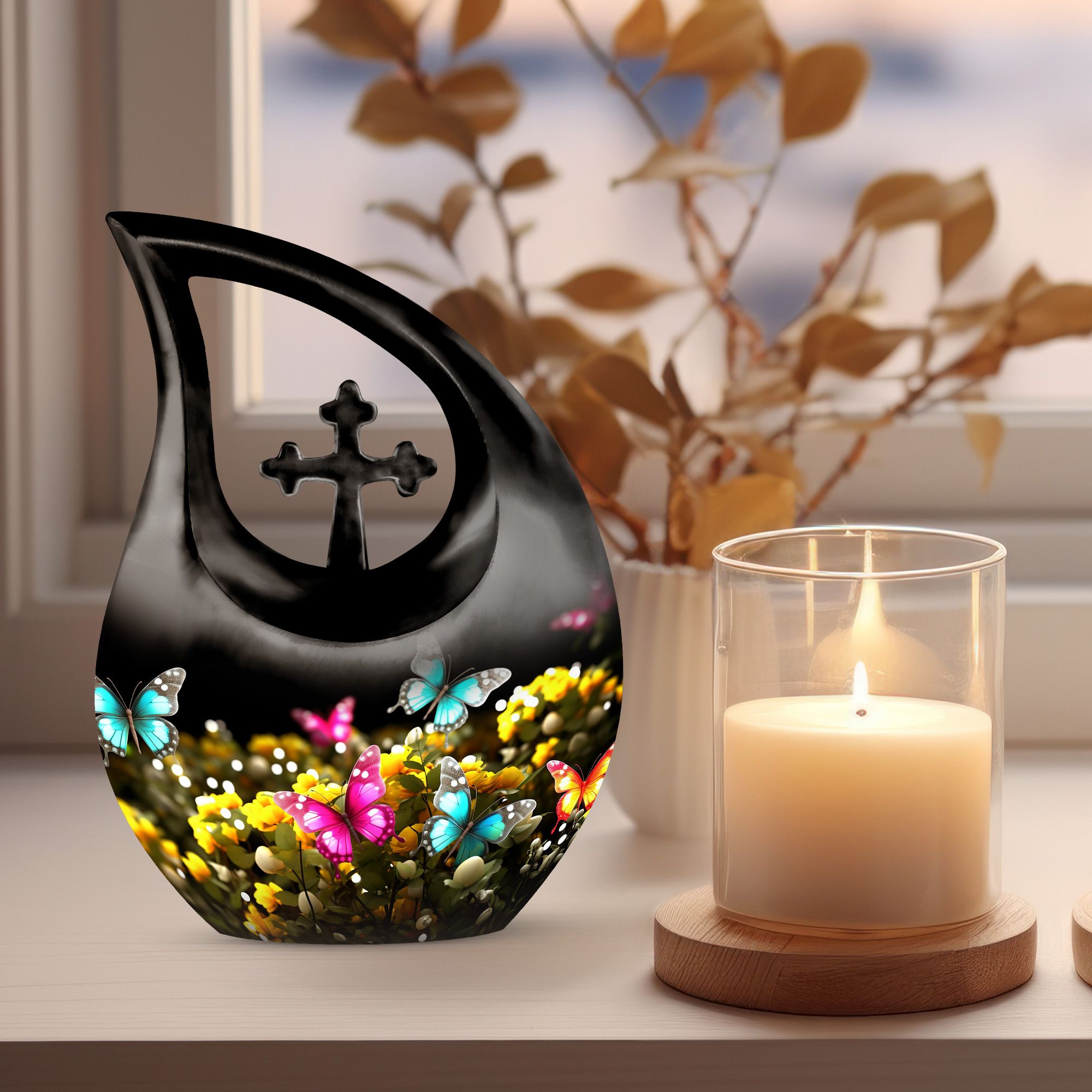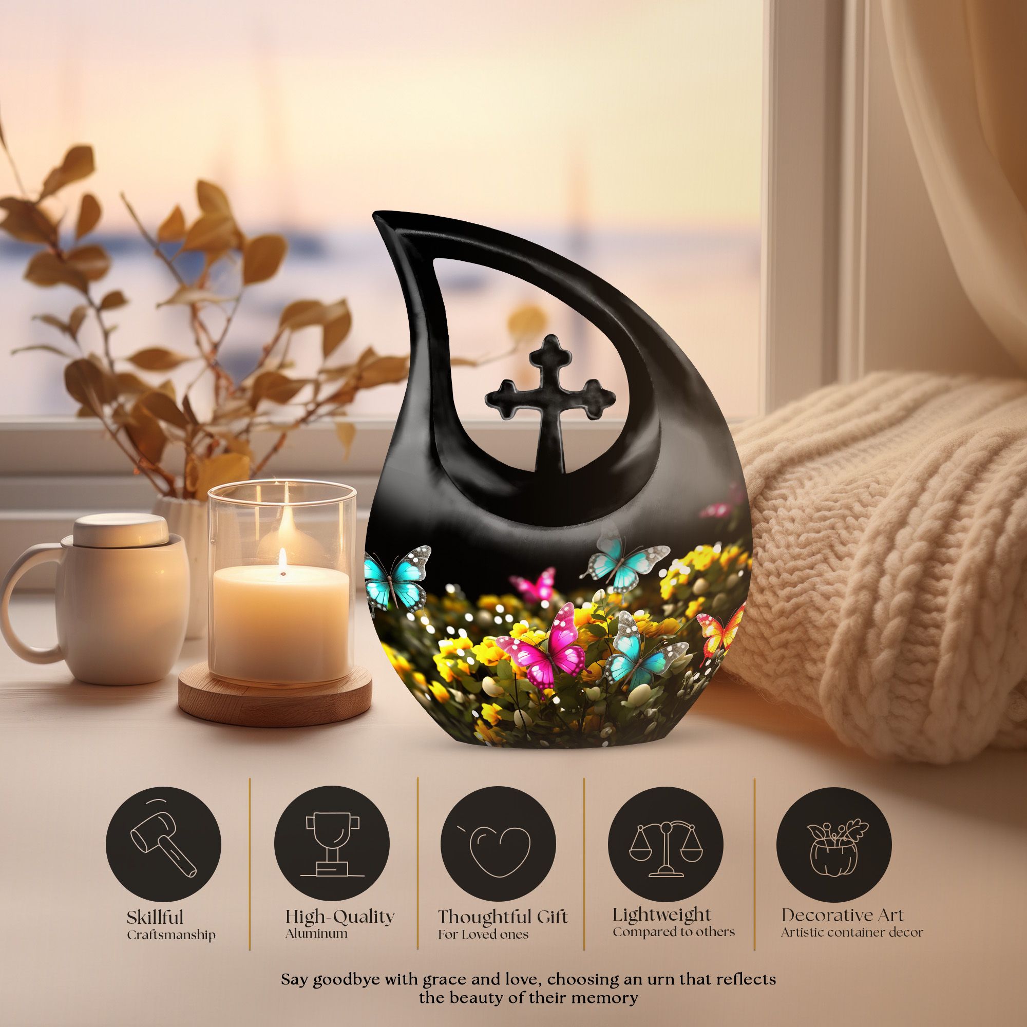 Crafted from high-quality aluminium, this colorful urn for human ashes features a secure screw-top lid and a vibrant butterfly design. Its versatile size makes it ideal as a small keepsake urn for human ashes, urn for ashes adult male or female, or personal urn for cherished remembrance.