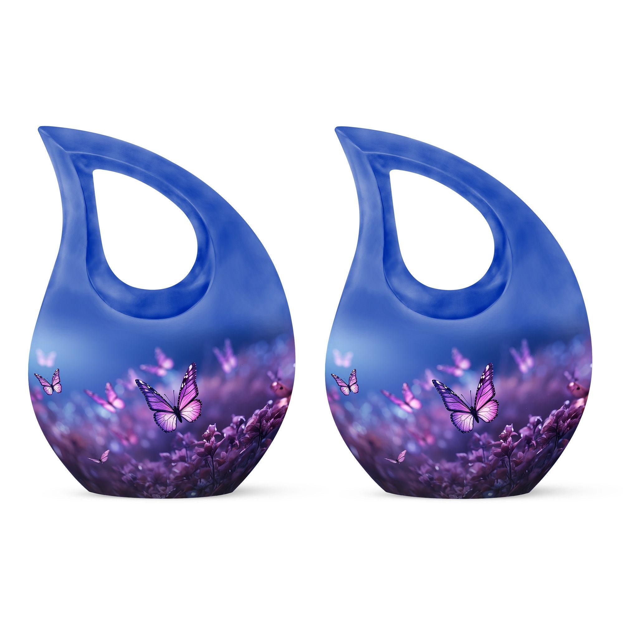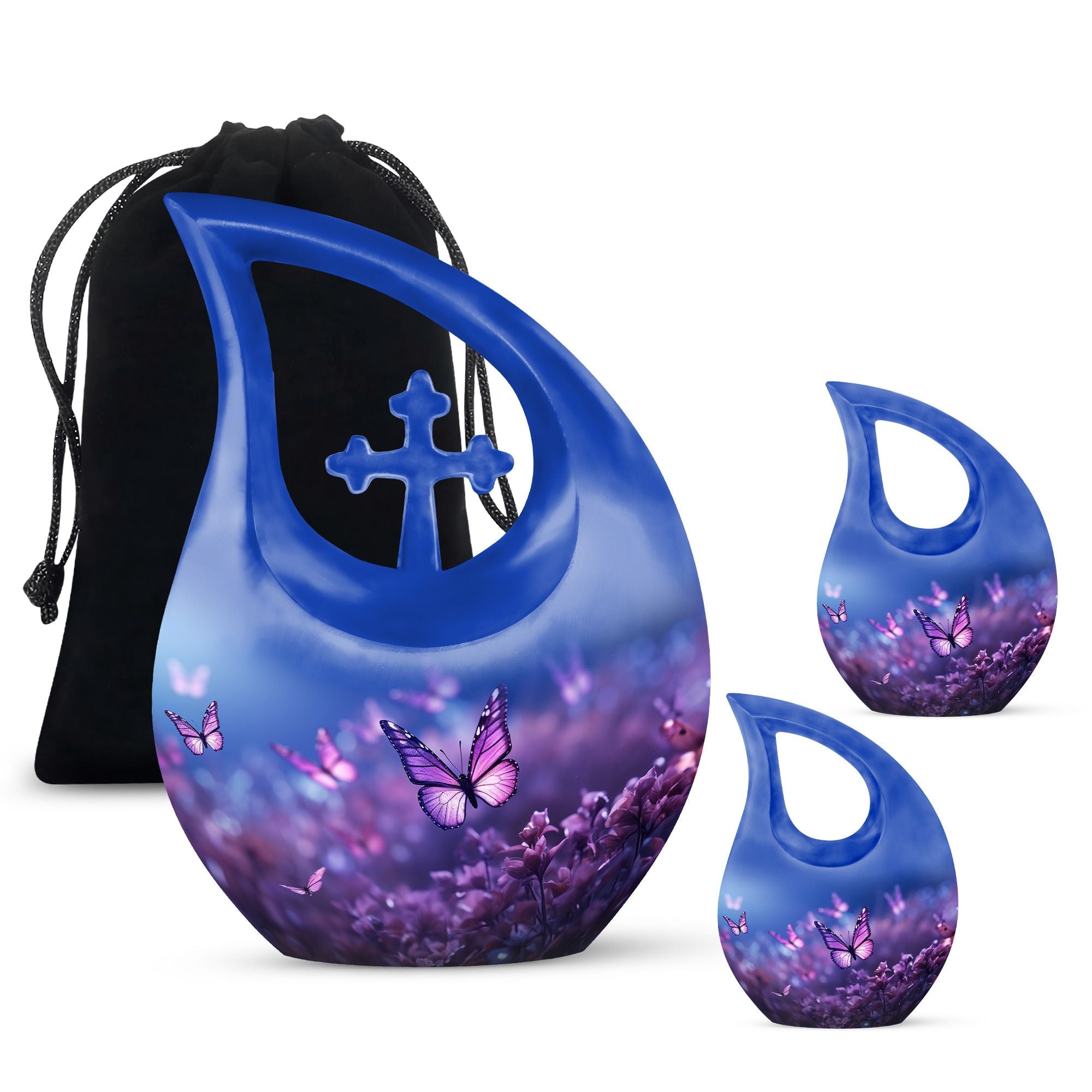 Seek comfort in honoring those cherished with this divine Butterfly Urn, an epitome of elegance and tranquility. Our cherished Large Urns are superbly crafted using top-notch quality aluminium, ensuring you have a durable, lasting tribute to your angels. Measuring at 10 inches in height with the capacity to hold 200 cubic inches, this urn truly embodies the spectrum of size, from grand to minute. This memorial urn possesses an evocative Cross Drop theme, delicately reminding you of your angels in heaven. Weighing just 3.3 pounds, it's easy to transport and place. All our urns come with a velvet pouch, creating a respectful containment for the ashes of your loved ones. Additionally, we offer personalization options, allowing you to engrave names and create a touching tribute. These urns are an excellent choice for those seeking Burial Urns or Remembrance Urns for ashes, providing a respectfully modern aesthetic. The 'Butterfly Urn' - a resonant memorial urn for those whose hearts continue to flutter in our lives even after they've taken flight.