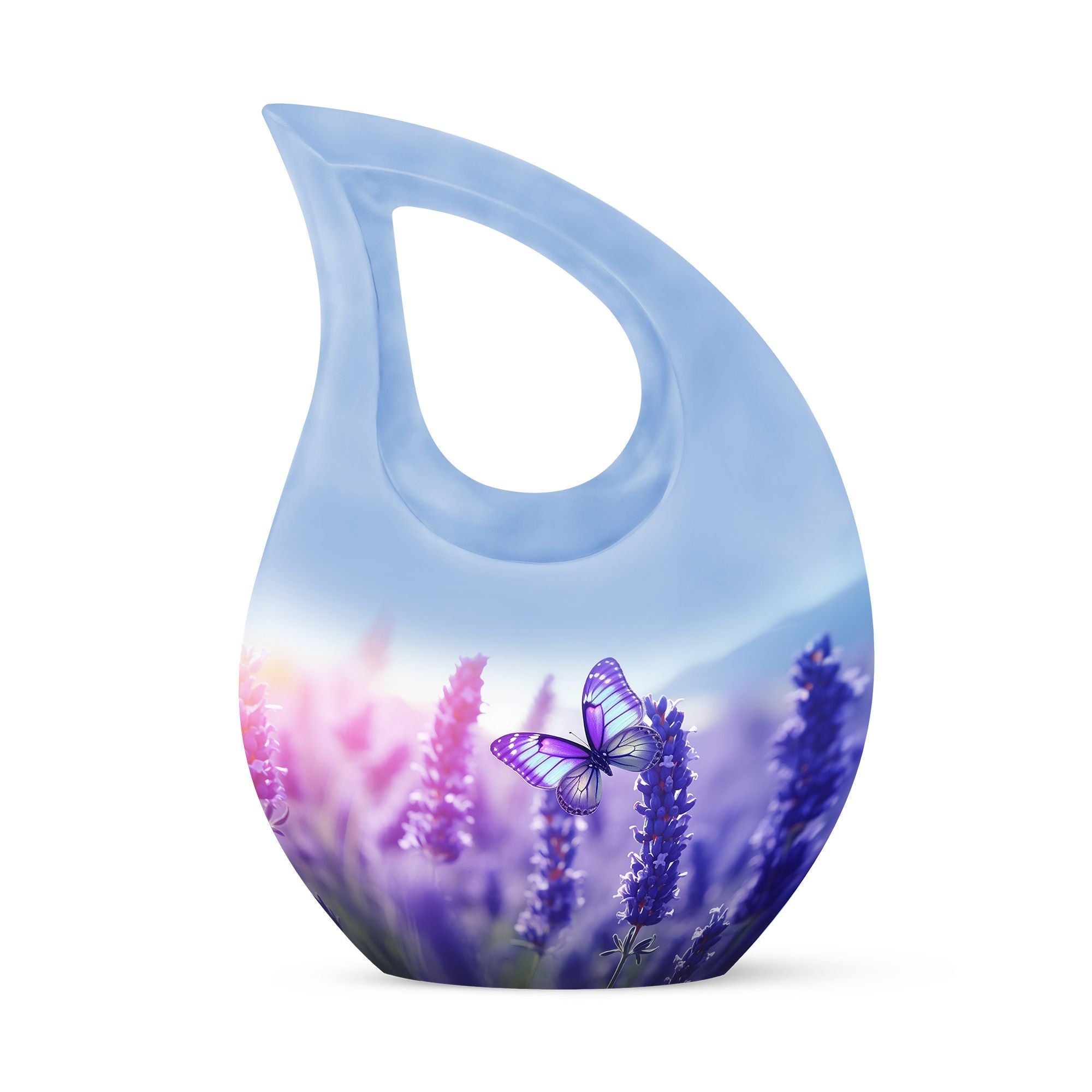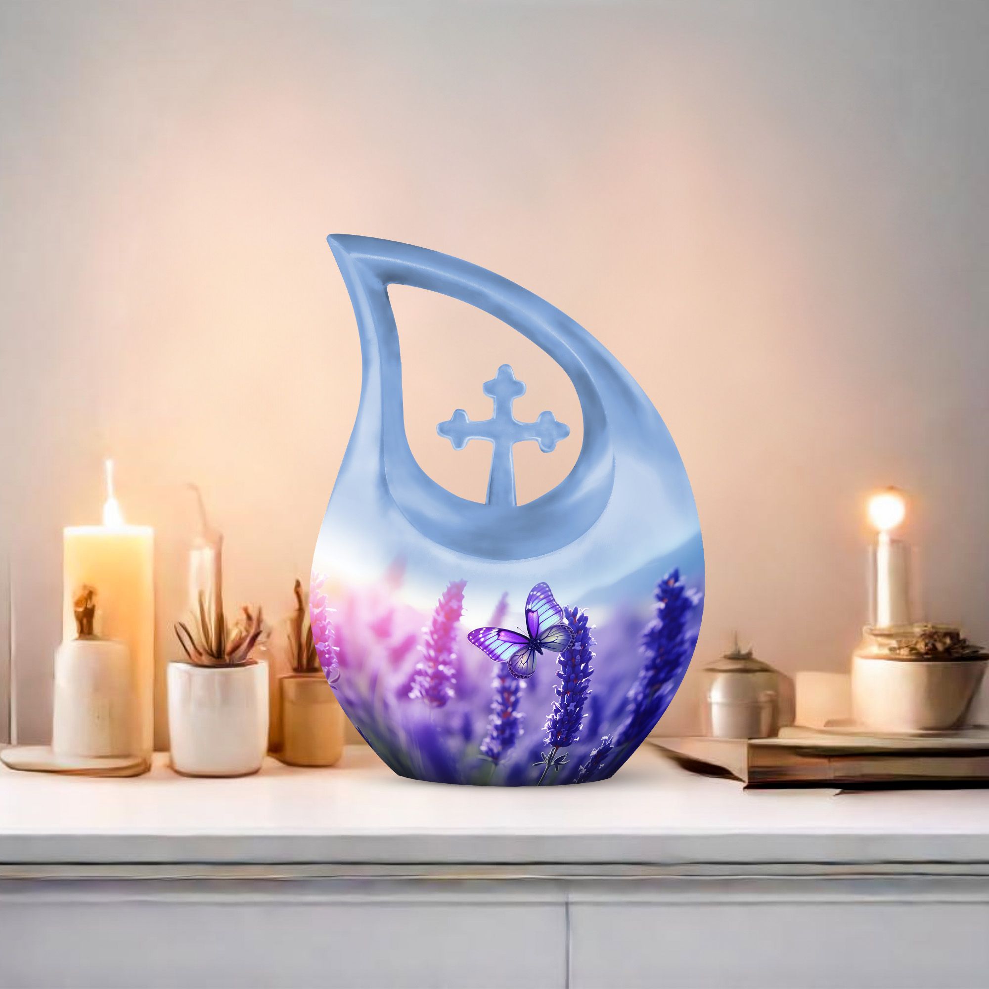 Experience a beloved symbol of transformation and hope with our 10-inch Butterfly Urn. Crafted from high-quality aluminium, the weight of this large urn is a sturdy 3.3 pounds, indicating quality and durability. The unique theme of a butterfly suits the item's purpose for meticulously holding onto precious memories. A stand-out feature of the urn is the 'Cross Drop' design. The capacity of 200 cubic inches comfortably houses the ashes of a loved one. Along with the urn, the package content includes a plush velvet pouch for respectfully containing the ashes. Offering a unique touch, we provide the option to personalize the urn with engraved names. The product perfectly encapsulates the search phrases 'Butterfly Urn', 'Cremation Vaults', 'memorial urns', 'Urns For Mom', 'Urns With Love', and 'Cremation Urns For Human Ashes'. Highlighting its beauty, this urn is more than a vessel, it's a respectful honouring of memories.
