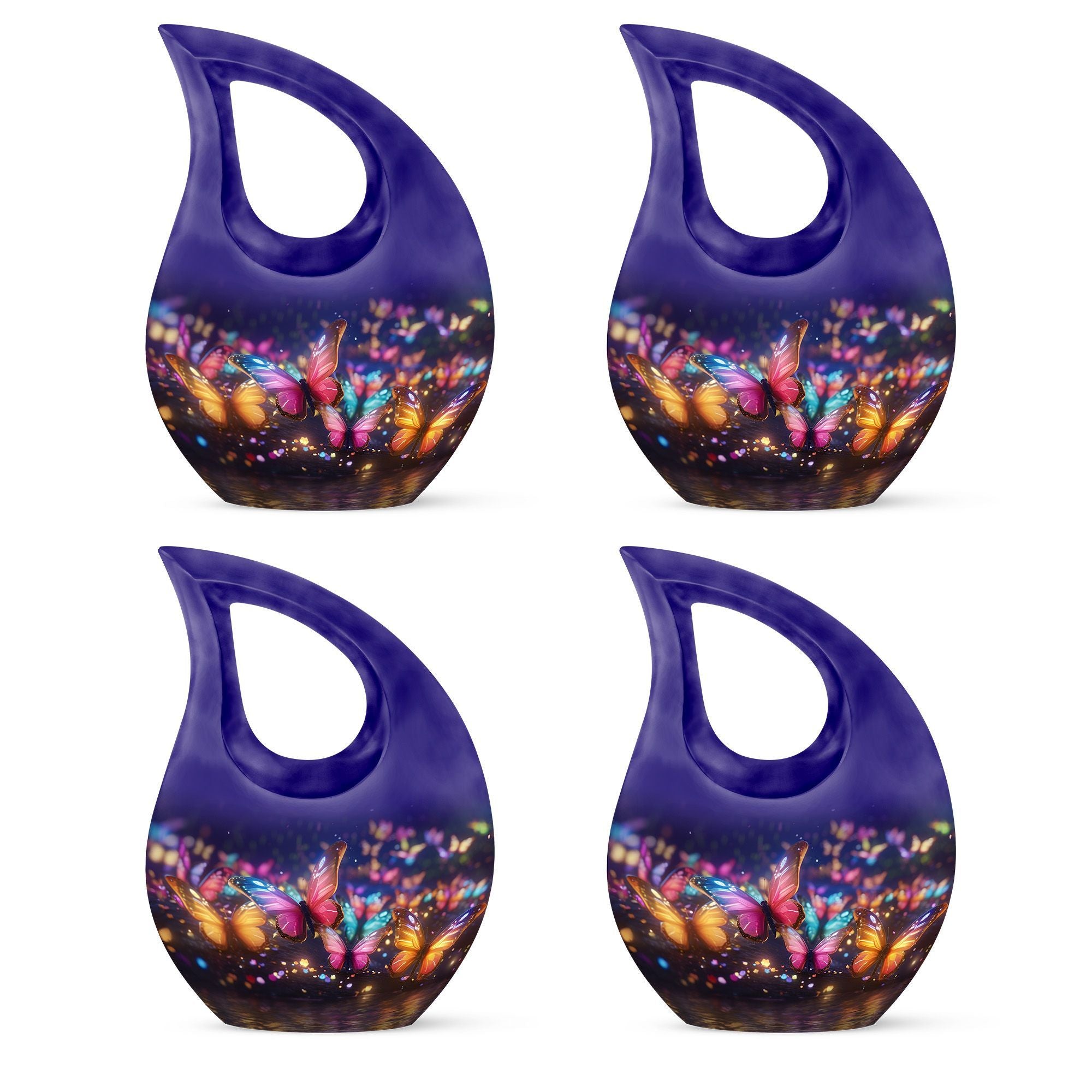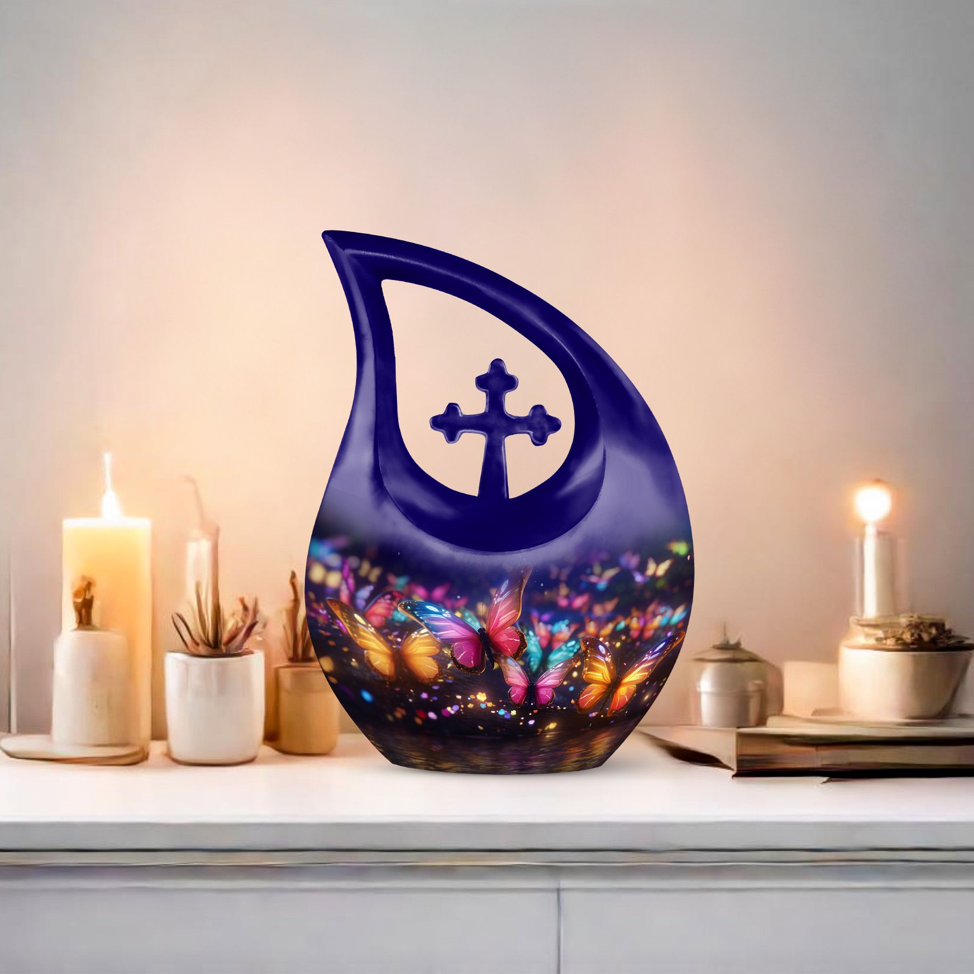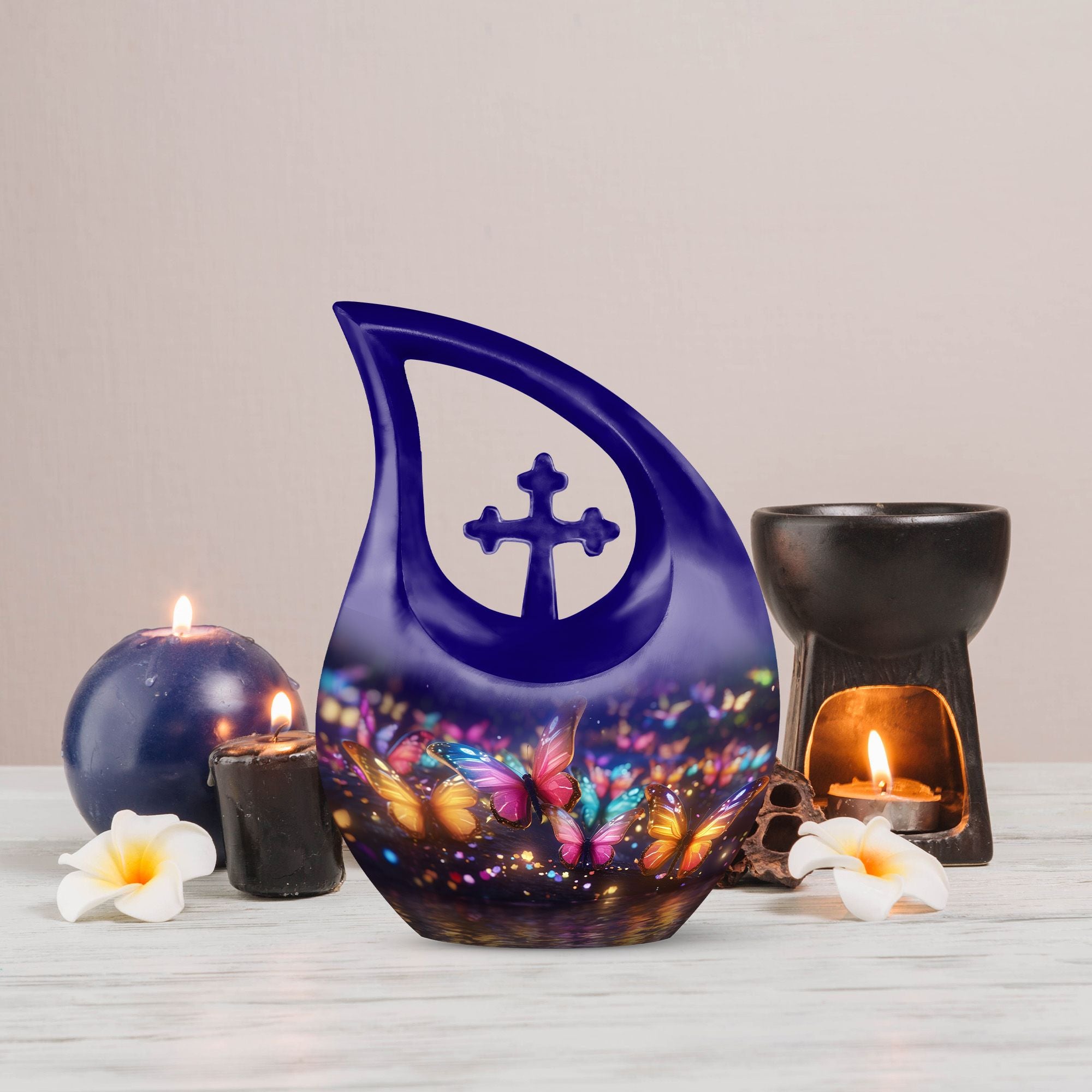 Adorned with a stunning Butterfly theme, this unique, large 'Butterfly Urn' captures the essence of serene beauty and tranquility. Standing proudly at 10 inches, the 'Cross Drop' design of the urn adds a touch of elegance—making it a compelling choice among beautiful urns and an exceptional piece for memorial ceremonies. The urn is crafted with care from premium-quality Aluminium material that lends it an air of unmatched longevity. It weighs a sturdy 3.3 pounds and houses a capacity of 200 cubic inches, ample space to safely encompass your beloved's remains. The package contents include a tastefully selected velvet pouch, offering a dignified containment for the ashes. Add a personal touch to this burial urn with your choice of engraved names—an homage to the cherished memories. So whether you're seeking a distinctive urn for mom or exploring full-size urns for human ashes, this decorative urn stands as an exquisite tribute to your cherished one.