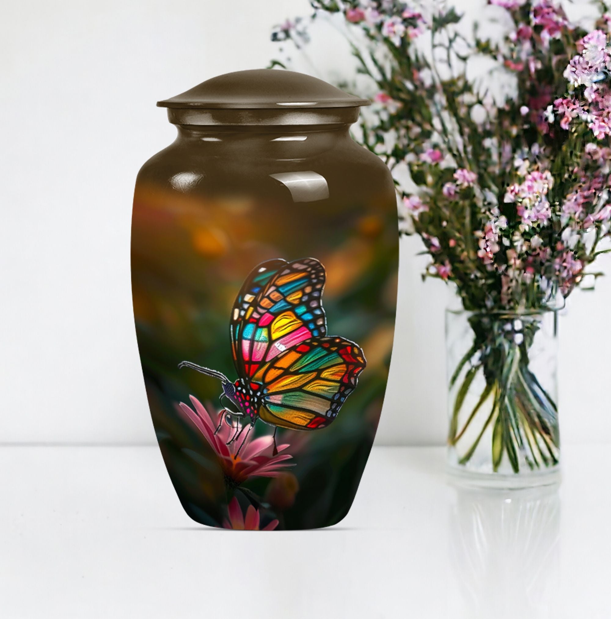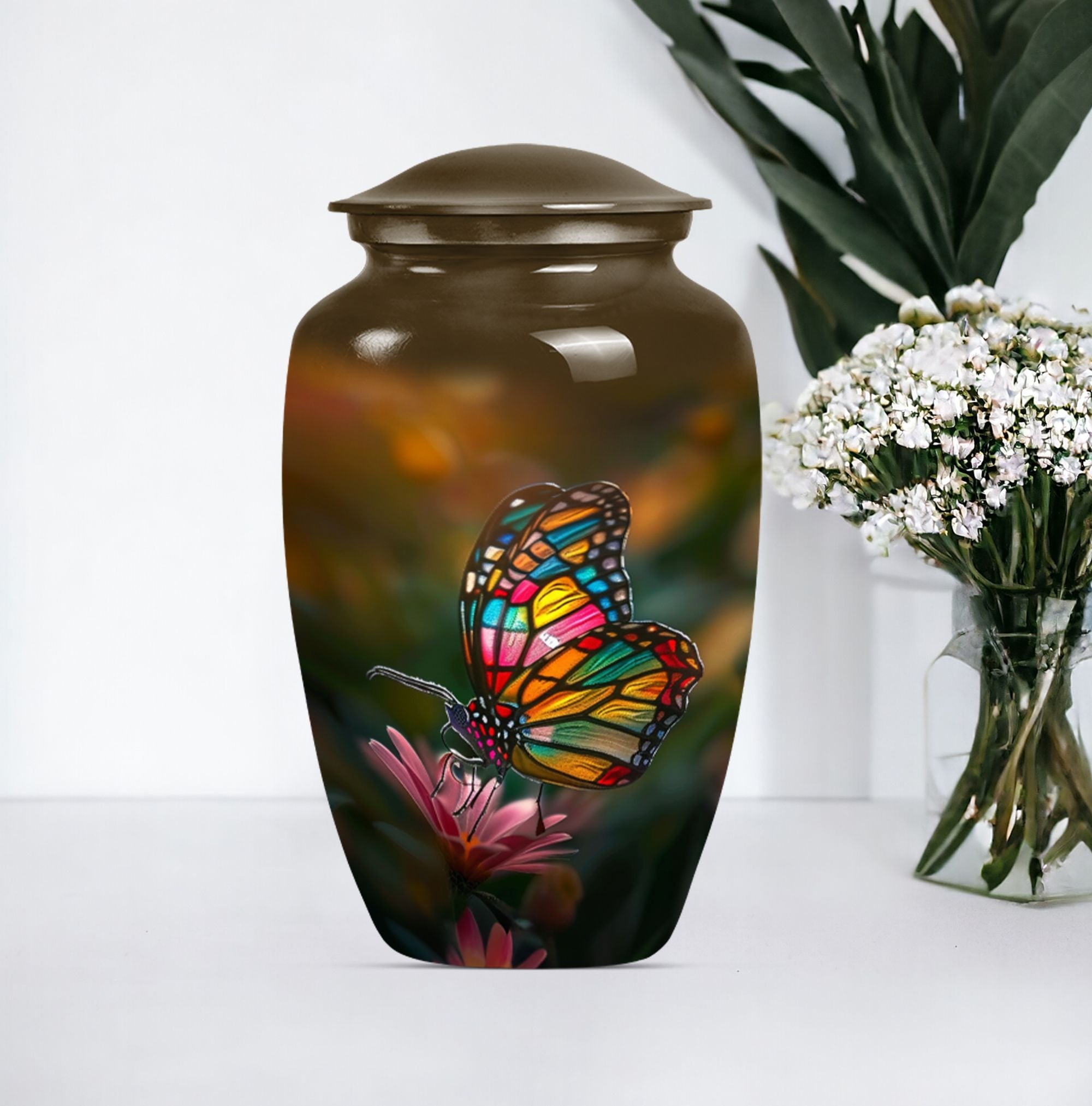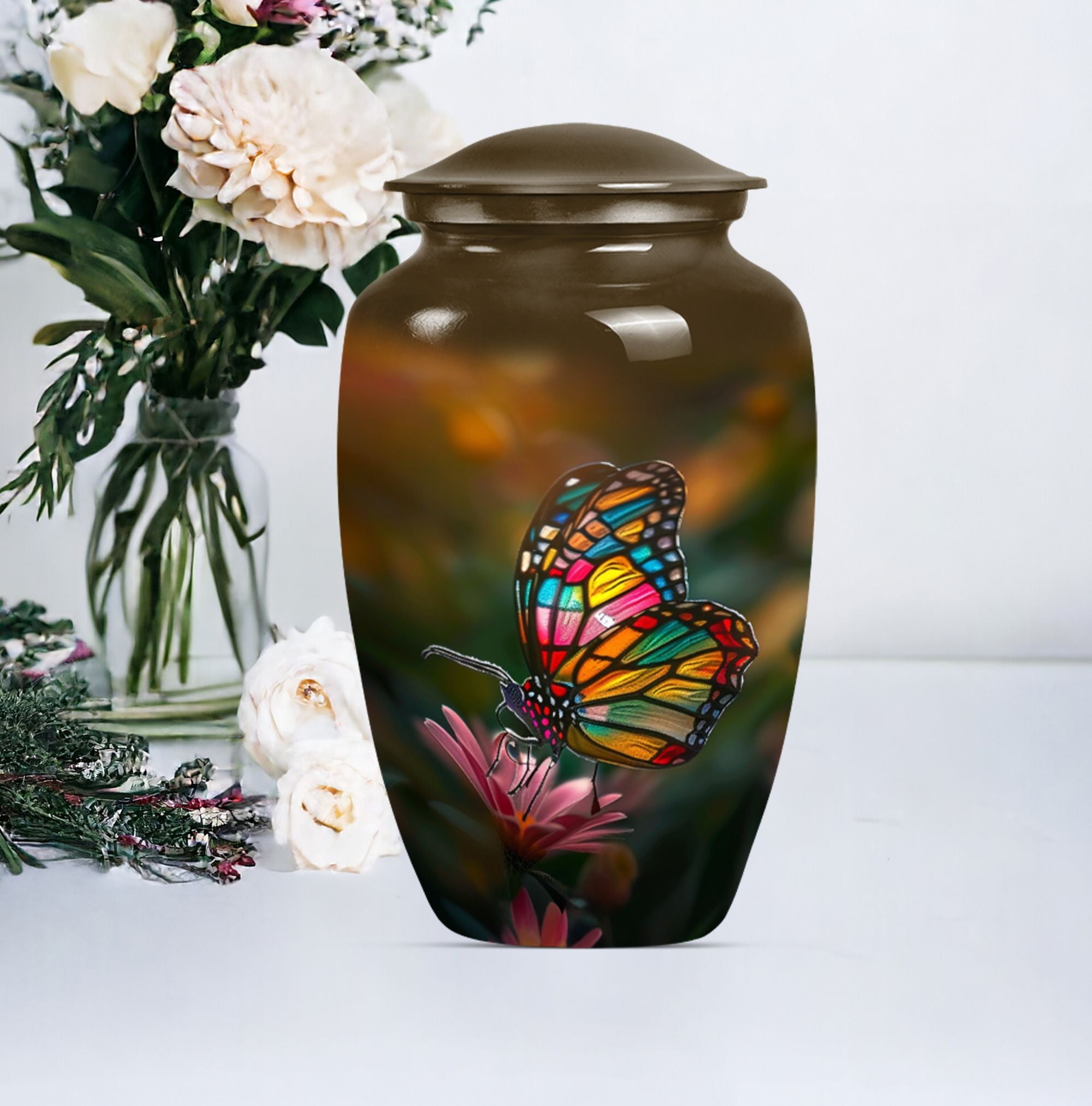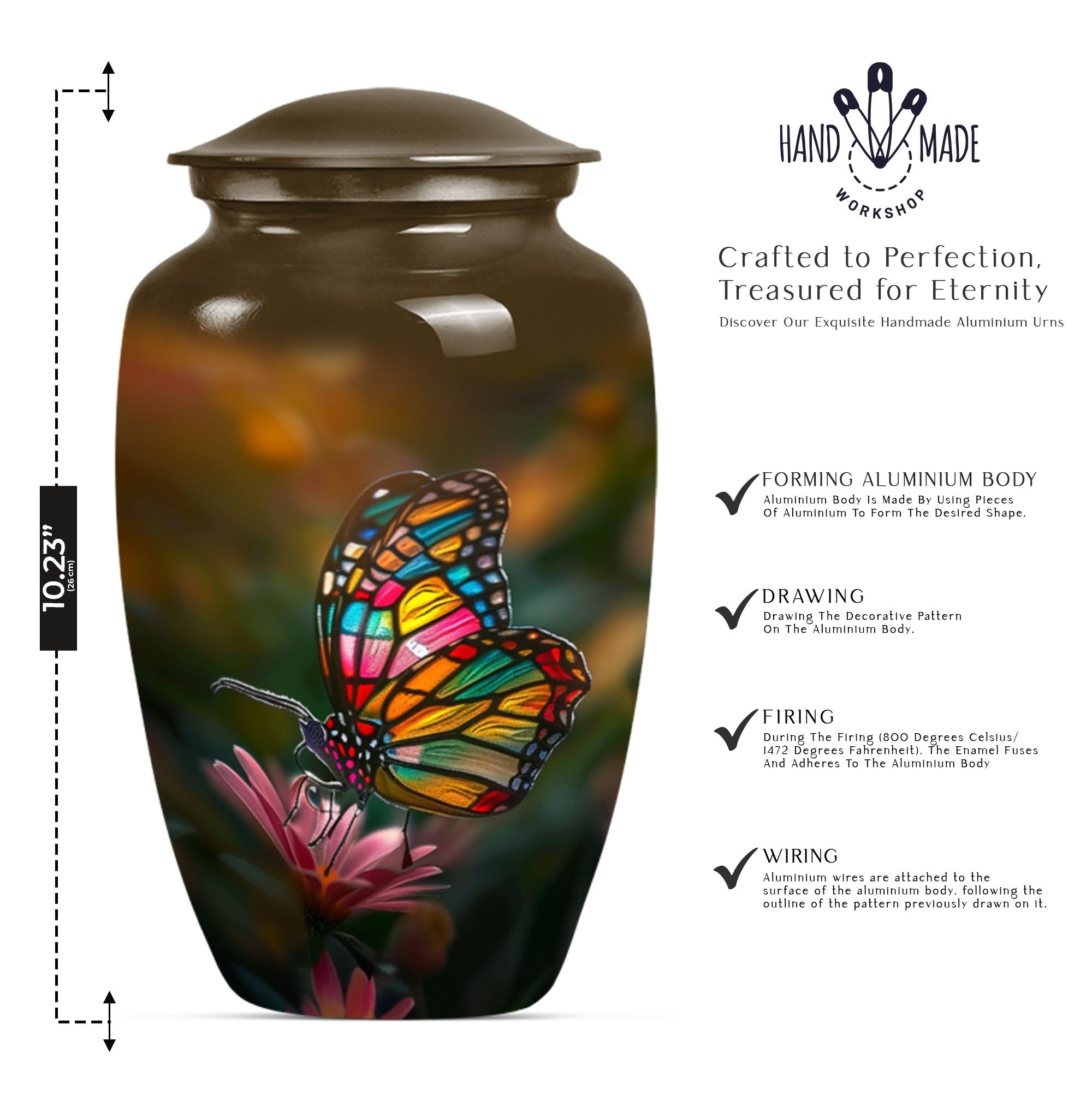 Honor your departed loved ones with our reverential butterfly urn - a perfect funeral burial urn that serves as a last place of rest. Designed in elegant classic urn style, it exhibits an embossed butterfly theme, symbolizing resilience, change, and hope. With a size of 10 inches and weighing 3.3 pounds, this aluminium urn has capacity to hold approximately 200 cubic inches of ashes. Built robust, this urn is more than a memorial, it's a tribute as substantial as your love. For added convenience, it includes a velvet pouch for containment of ashes. You can personalize this large urn as per your wishes by engraving names. Often sought after for ceremonies under 'Memorial large urns for human ashes, urn human ash urn ash, urn, and adult cremation urns', this piece stands out for its heartwarming significance and superior make. A cremation urn designed with care for remembrance of the departed.