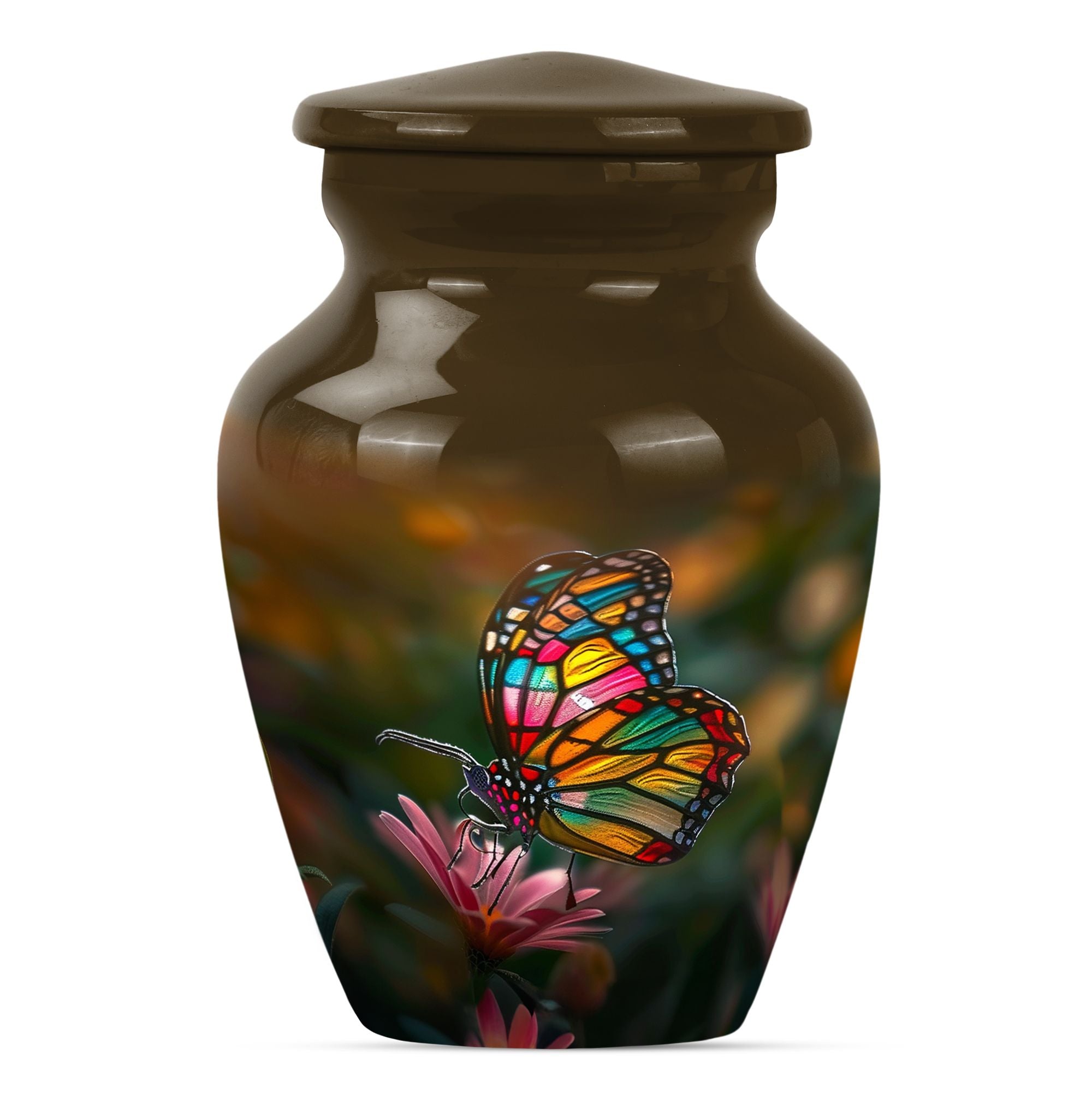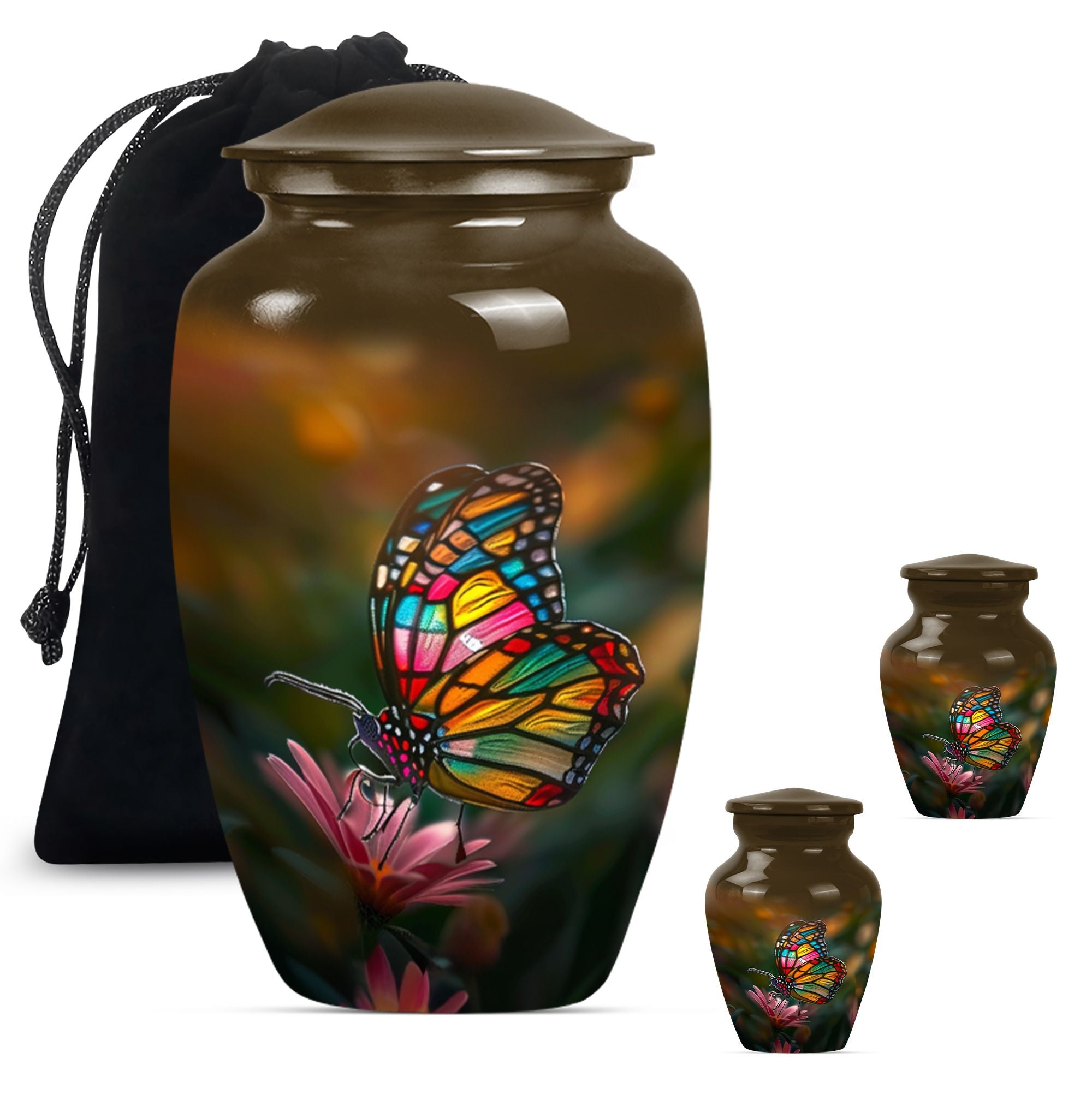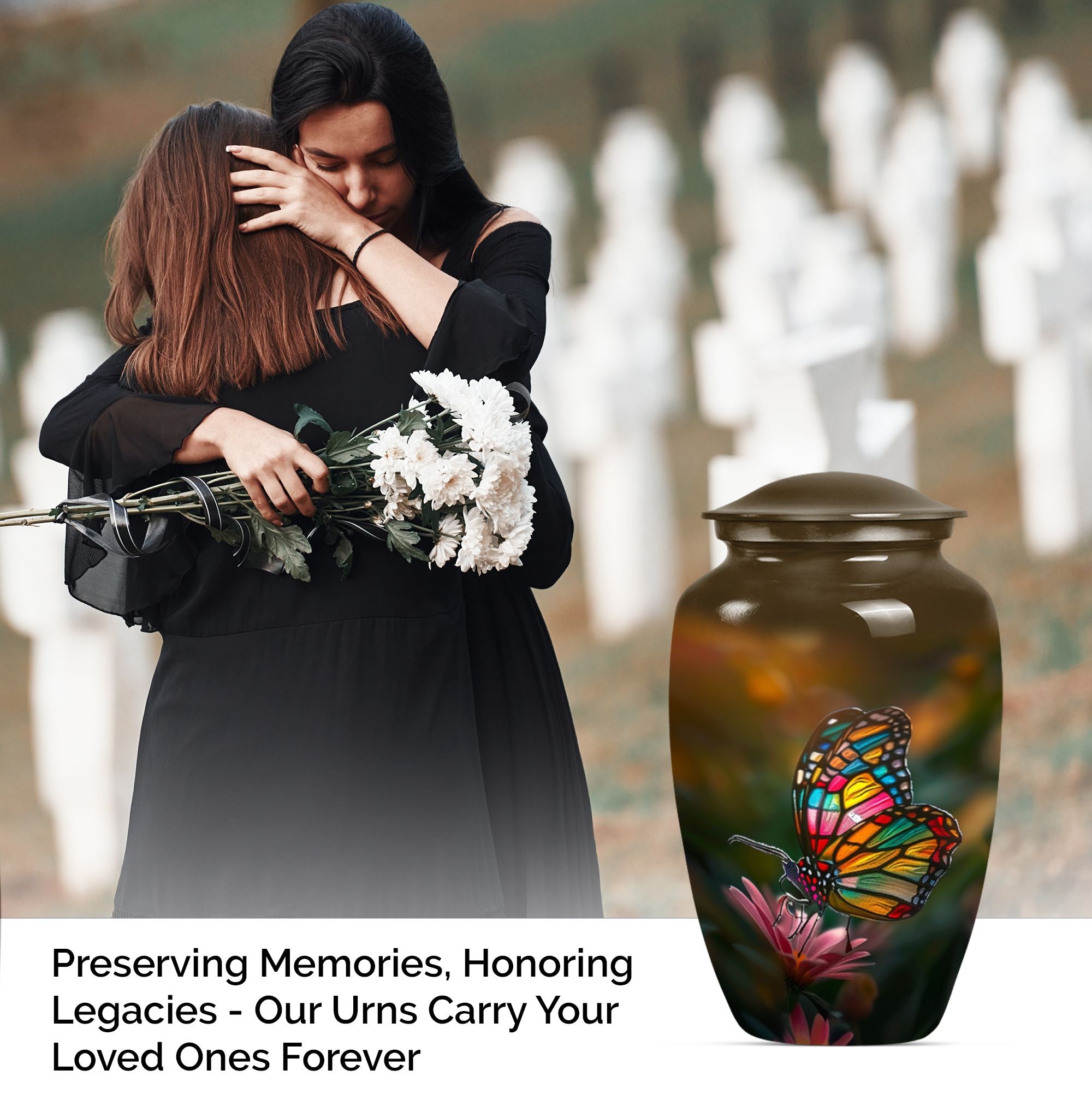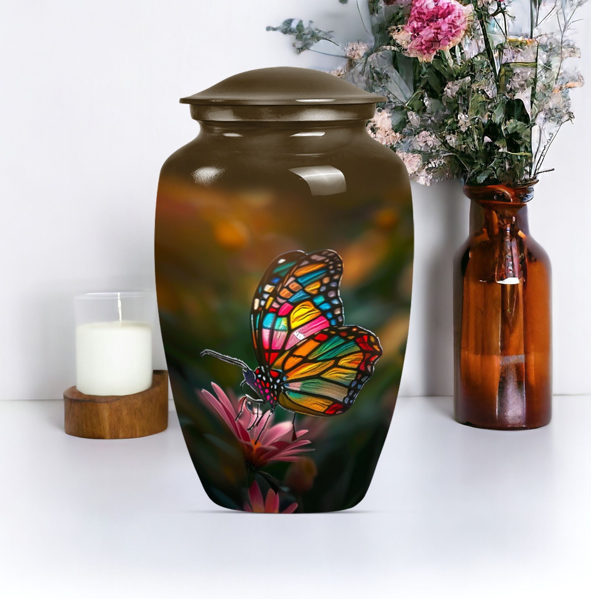 Honor your departed loved ones with our reverential butterfly urn - a perfect funeral burial urn that serves as a last place of rest. Designed in elegant classic urn style, it exhibits an embossed butterfly theme, symbolizing resilience, change, and hope. With a size of 10 inches and weighing 3.3 pounds, this aluminium urn has capacity to hold approximately 200 cubic inches of ashes. Built robust, this urn is more than a memorial, it's a tribute as substantial as your love. For added convenience, it includes a velvet pouch for containment of ashes. You can personalize this large urn as per your wishes by engraving names. Often sought after for ceremonies under 'Memorial large urns for human ashes, urn human ash urn ash, urn, and adult cremation urns', this piece stands out for its heartwarming significance and superior make. A cremation urn designed with care for remembrance of the departed.