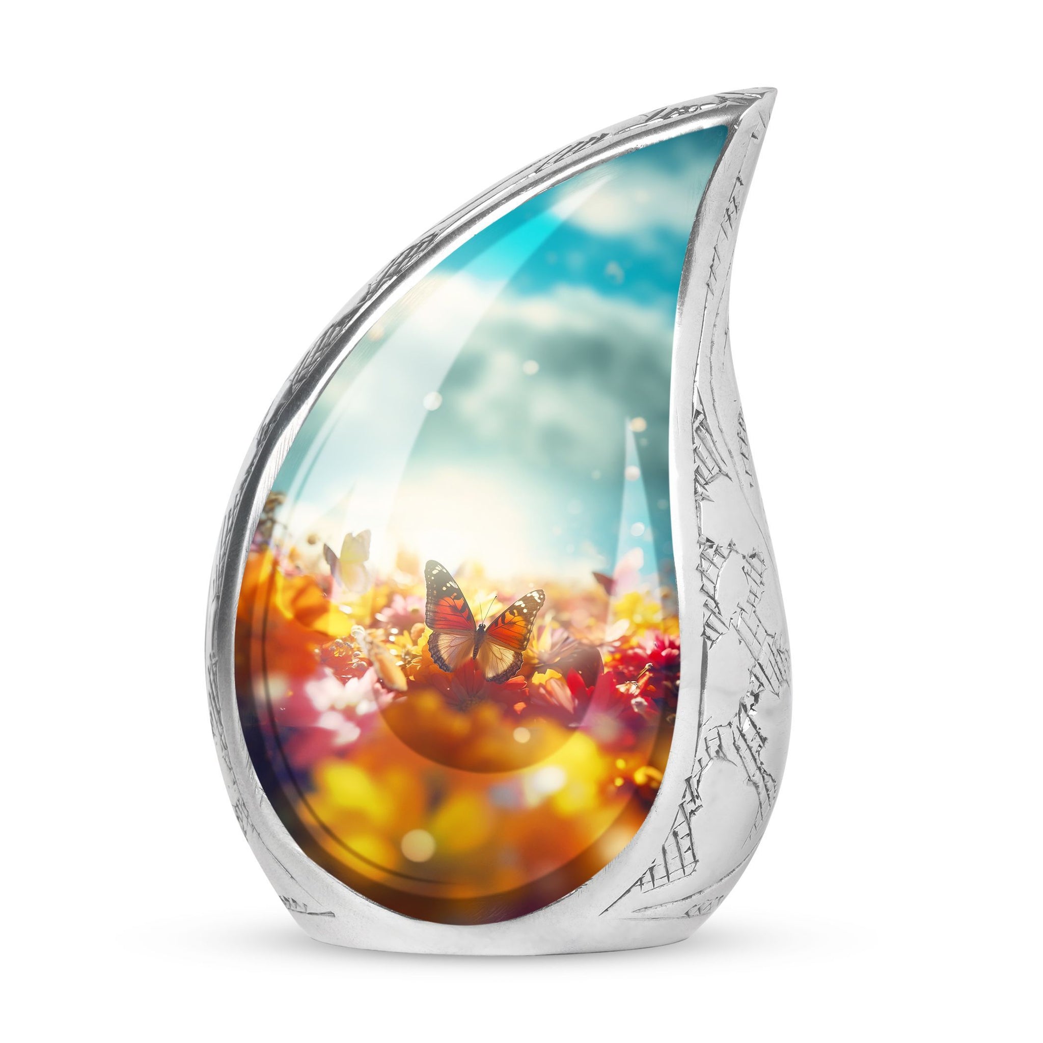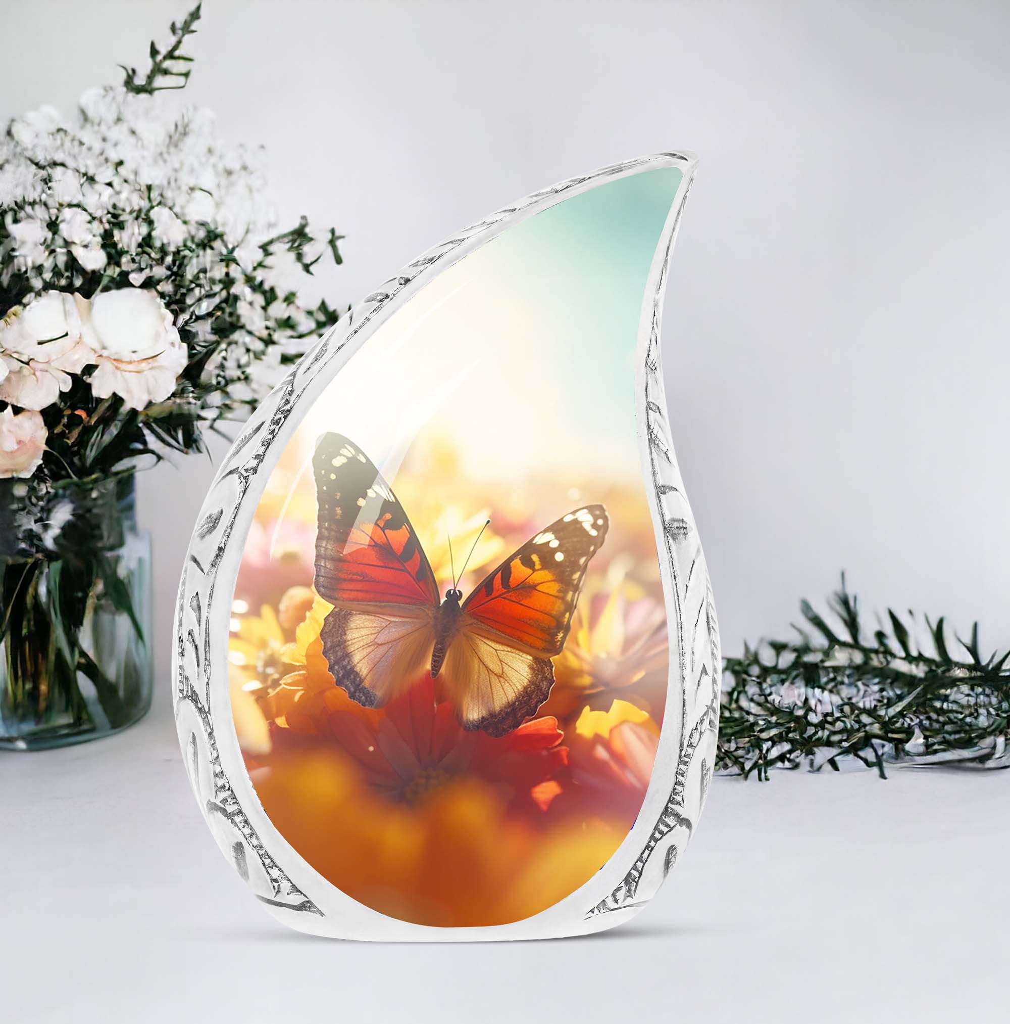 Embrace a timeless way to commemorate loved ones with this Colorful Butterflies Memorial Urn. Crafted from enduring aluminium, it is highly robust and designed to last. Measuring at 10 inches in height, it is a sizable and significant piece. With a weight of 3.3 pounds, its substantial feel provides a comforting symbol of presence. Subtle enough to blend in with any decor yet captivating enough to serve as a conversation piece, this urn truly marks an ideal memorial gift. The urn features a capacity of 200 cubic inches, ensuring ample space for containment and reverence. Indeed, every aspect of this large urn, from its classic design to its rich, personalized engraving, speaks of affectionate remembrance. It comes with a velvet pouch, providing not only a luxe touch but also a practical solution for containment of ashes.