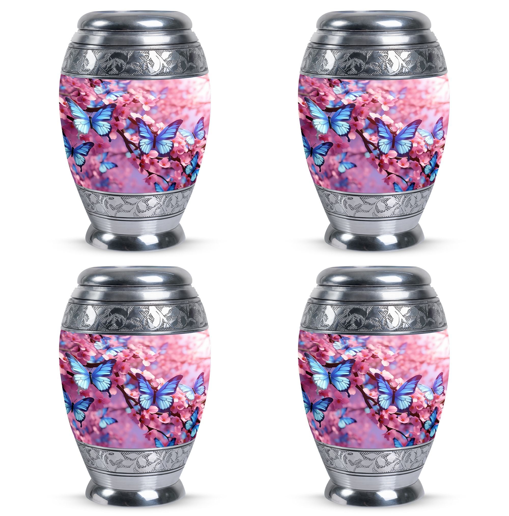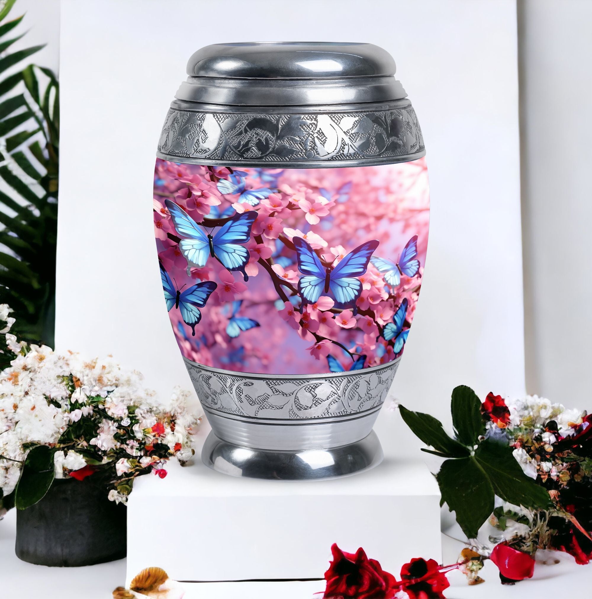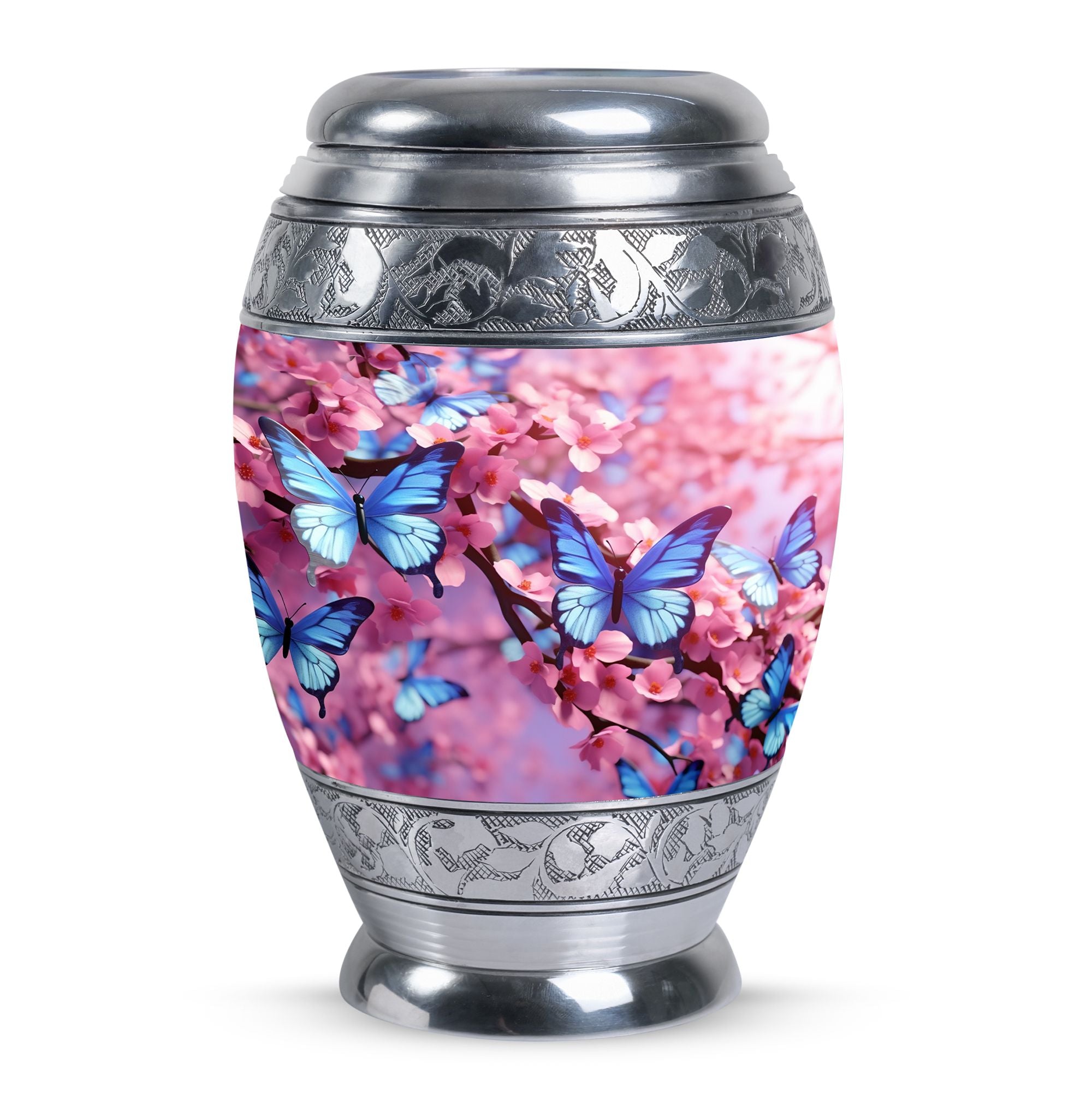 Our 'Colorful Butterflies Urn' is an exquisite choice for those looking for 'keepsake urns'. Sized at 3 inches, it's an aptly 'large urn' with an elegant 'classic urn' style. Crafted with superior 'aluminum,' it weighs 3.3 pounds and stands at a height of 10 inches, portraying a graceful presence. The urn has a remarkable capacity of 200 cubic inches, enough to hold the ashes of your loved ones securely. This 'cremation urn' comes bundled with a velvet pouch, providing a snug retention for the ashes. One of the exceptional features of this urn is the customization option. You can personalize it with engraved names, making it a memorable keepsake. Whether you are looking for 'Urns for Dad' or 'Decorative Urns for Human Ashes,' our Colorful Butterflies Urn can serve as a sophisticated statement piece. This 'modern urn' is a touching tribute for your loved one, presenting a unique way to remember and honor them.