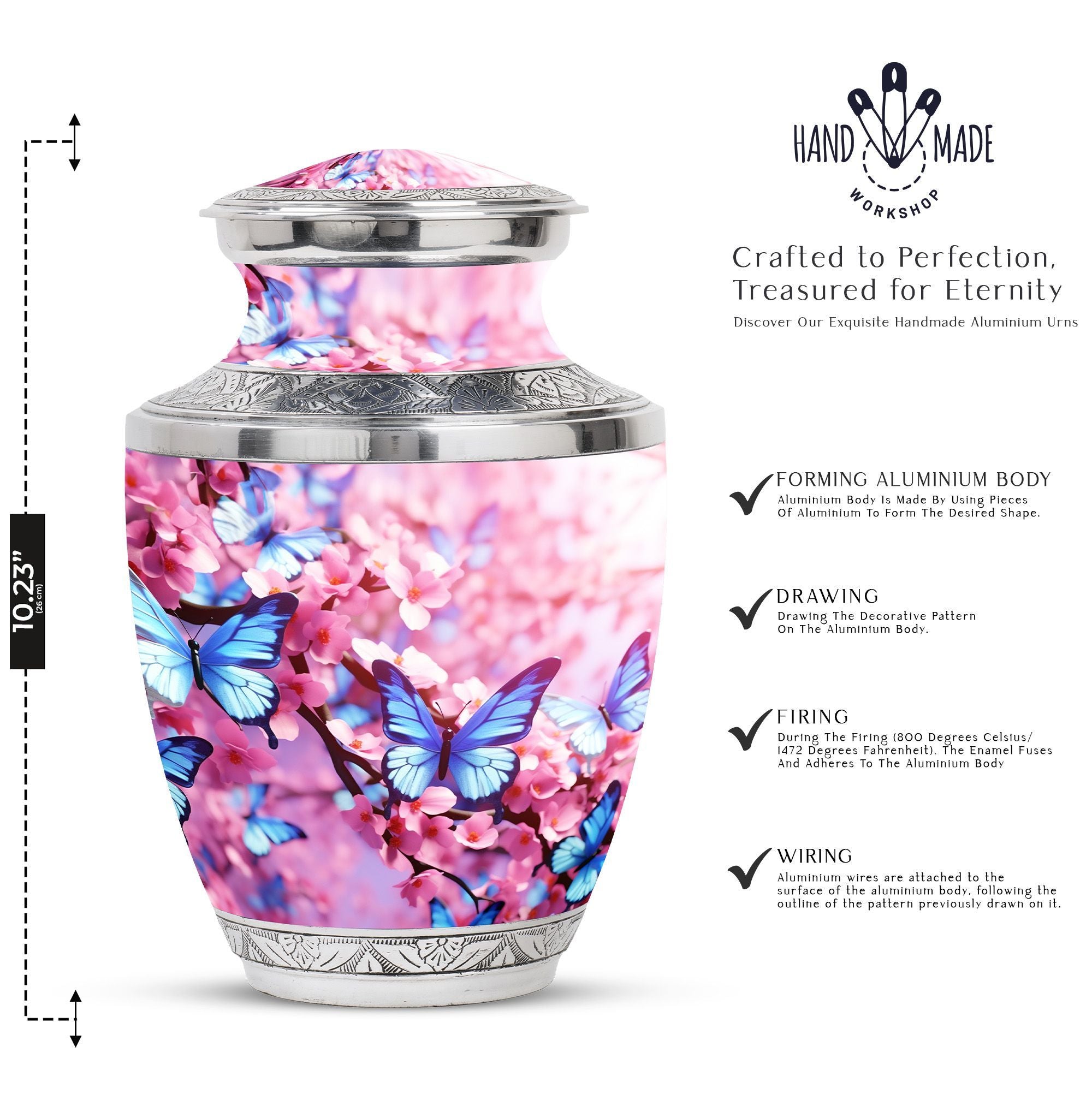 Celebrate and remember the precious life of a loved one with our Colorful Butterflies Urn - a keepsake urn of timeless beauty. Exuding a serene and classic demeanor, this aluminum-made, 3-inch large urn serves as an elegant memorial piece. Weighing a solid 3.3 pounds, it stands tall with a height of 10 inches and amply spacious with a capacity of 200 cubic inches to securely contain the ashes. The urn comes with a delicate velvet pouch, adding more convenience and a touch of class to this cremation urn. Making it unique, we offer customization options where you can personalize this decorative urn for human ashes by engraving names on it. The Colorful Butterflies Urn, perfect for burial ceremonies, is also an adept choice among other Urns for Dad or any beloved family members. With its modern design, it represents a transformative journey, much like the lifecycle of a butterfly.