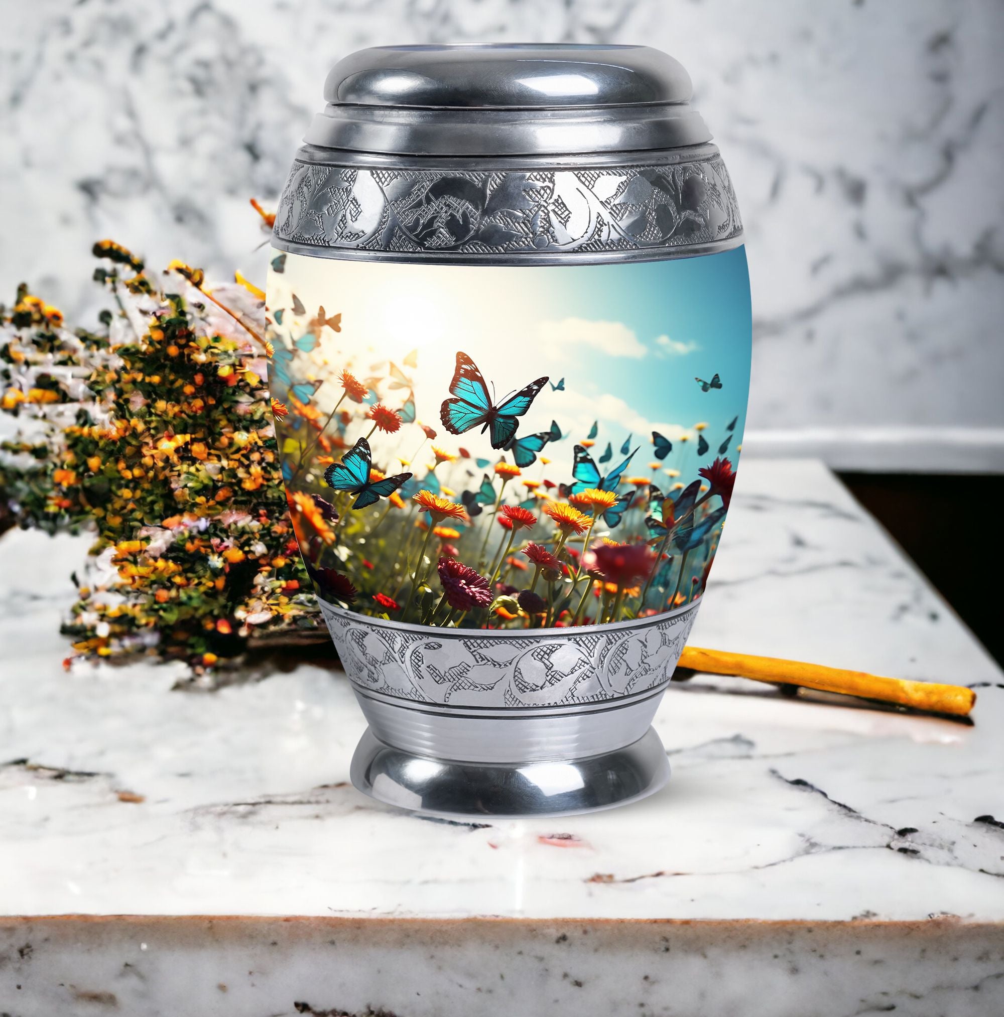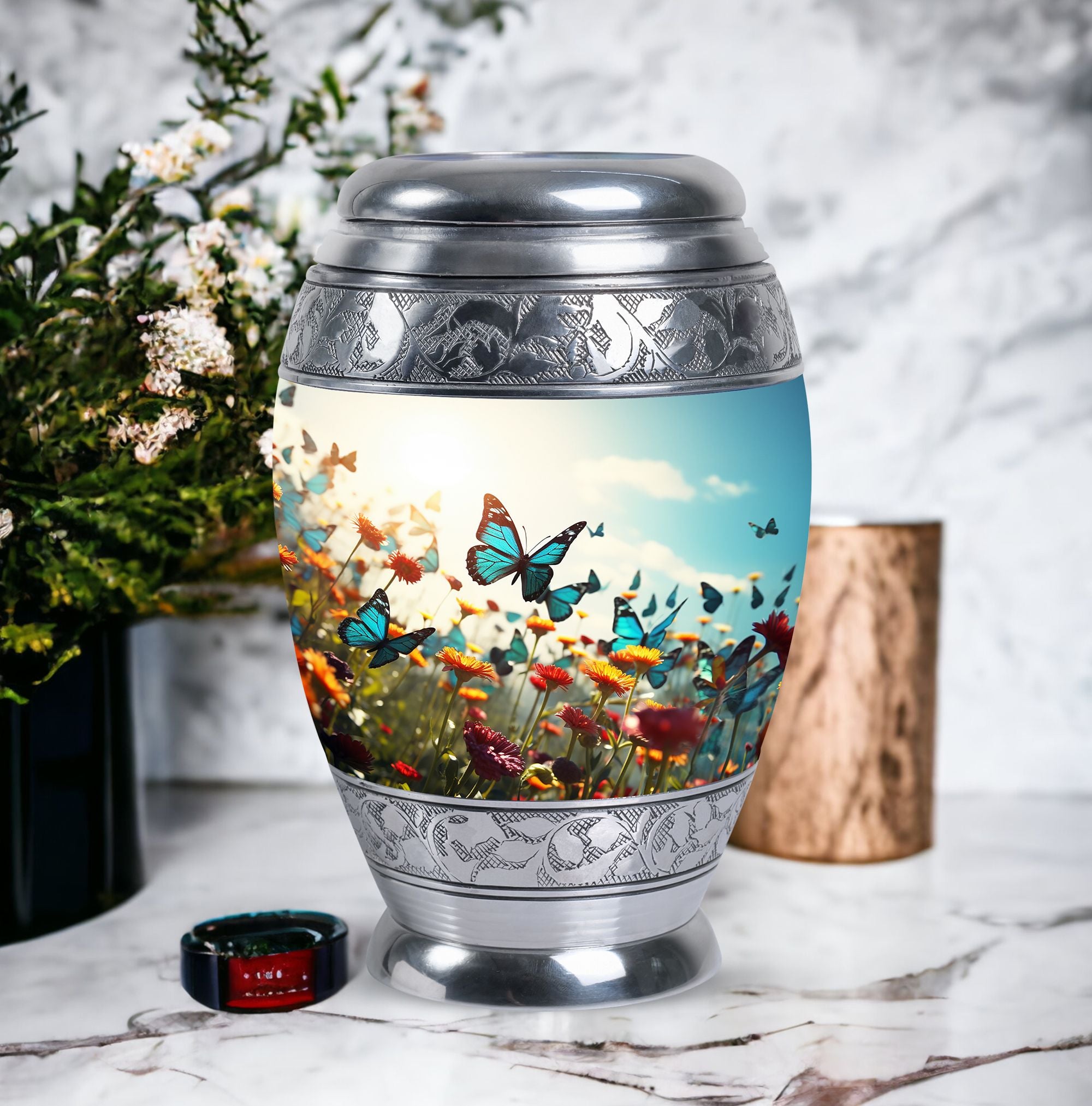 Experience tranquility and honor your loved ones' memory with our Colorful Butterflies Urn, an ideal choice for a dignified commemoration. An embodiment of serenity and devotion, this large urn allows you to lovingly encase the remains of your beloved in an aesthetic, heartwarmingly delicate container. Specially crafted for mothers, this urn ensures their memory continues to flutter in your heart, reflected in the softly adorned butterflies. This resplendent urn is sized aptly for human ashes, directly addressing the need for a sizable and beautifully crafted container. Our high-quality cremation ashes containers offer a visually poignant sentiment towards the legacies that have shaped your life. Shrouded with brilliant colours and exuding an air of peaceful dignity, this urn is a heartfelt expression of remembrance and respect for those that have significantly shaped our lives.