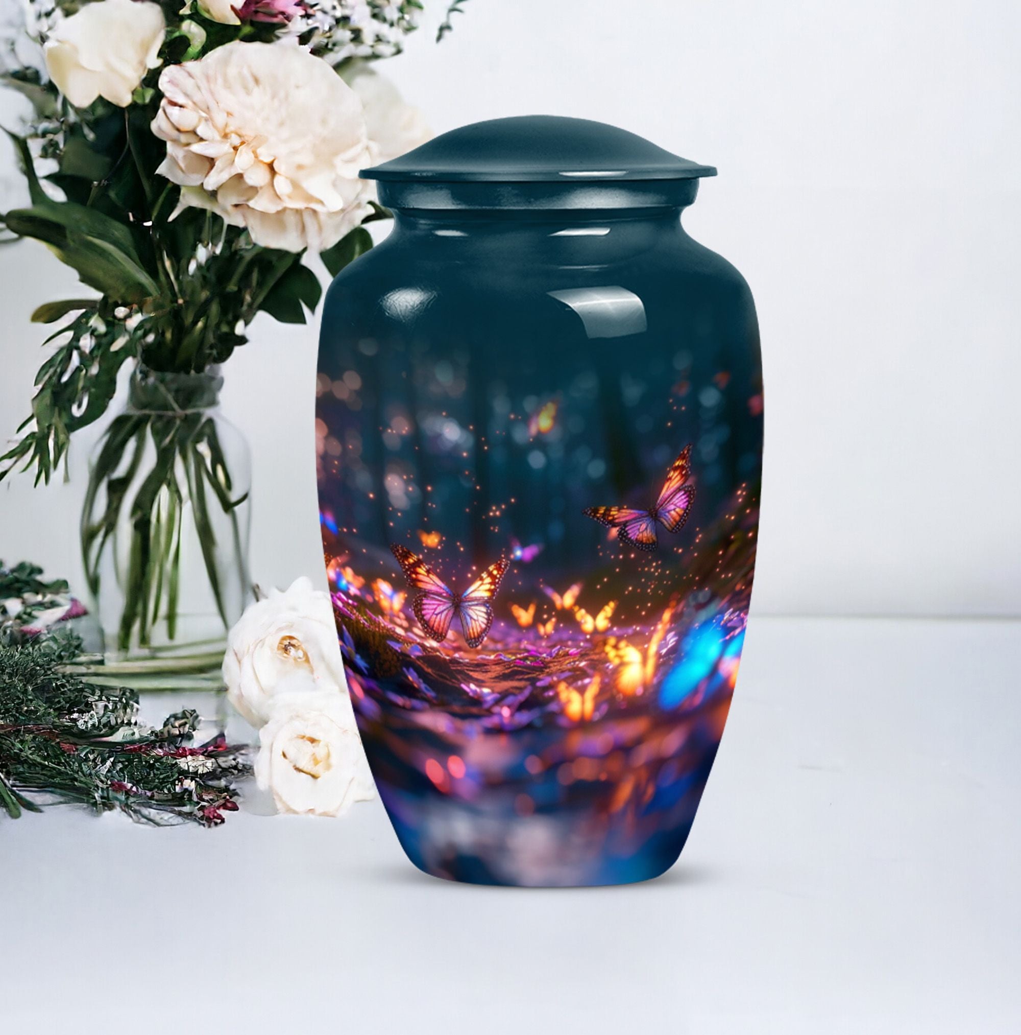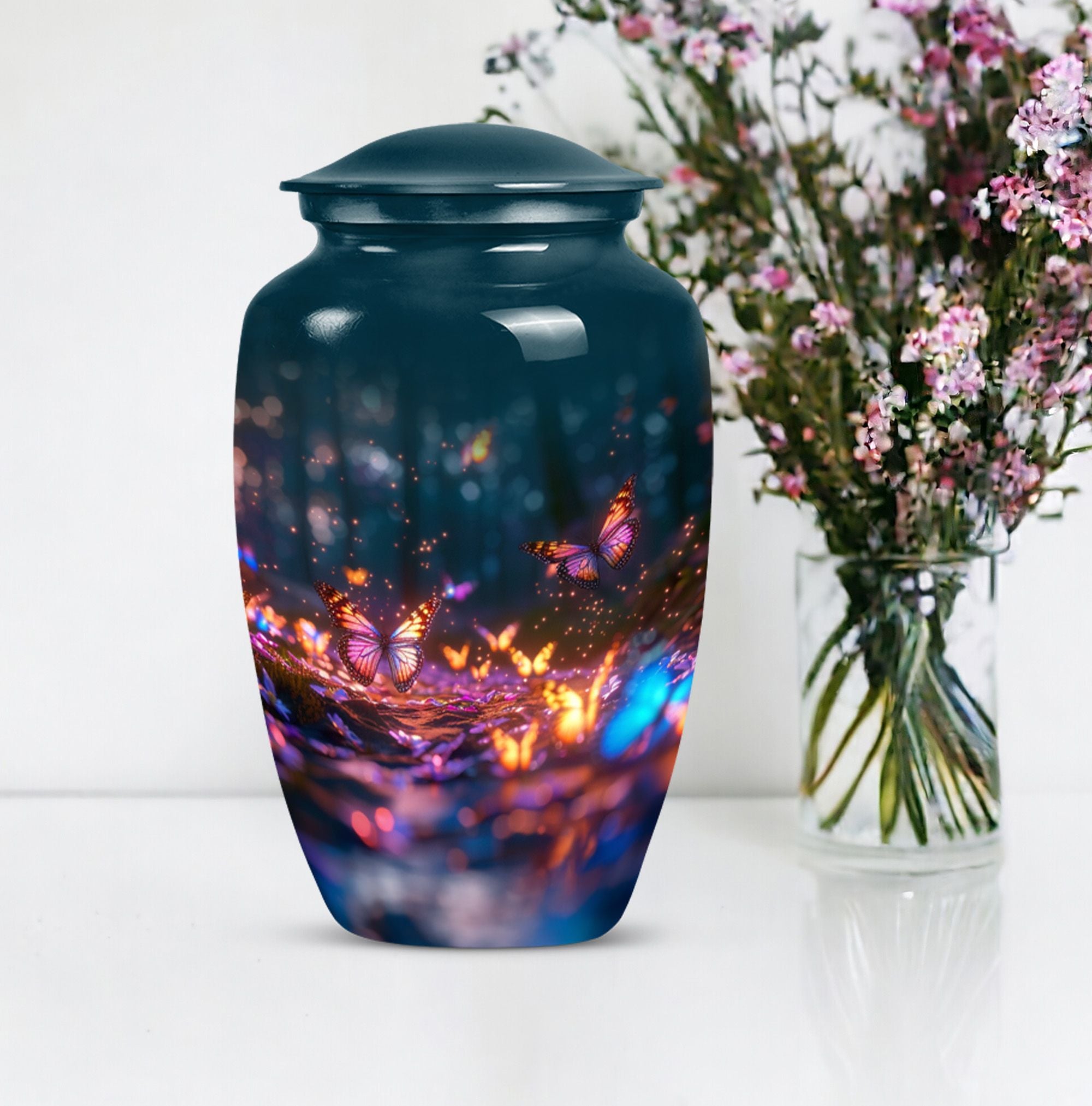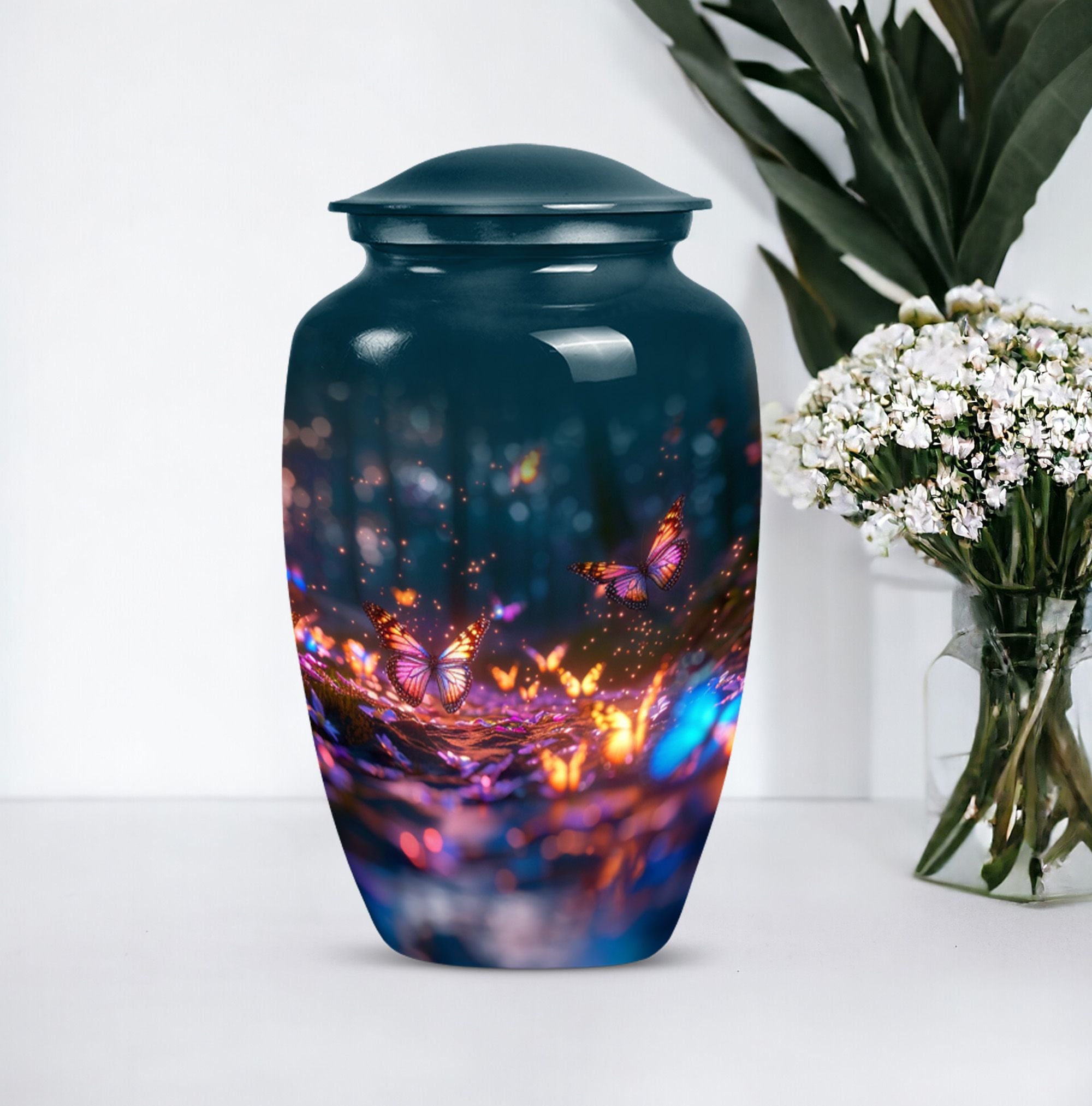 Bring honor to a loved one with our stunning Butterfly Urn, an elegant and fitting tribute for funerals or memorial ceremonies. Our product is exclusively sized at a height of 10 inches and crafted from high-quality Aluminium, rendering it a durable and timeless choice. The Abstract theme adds a unique touch to its appearance. With a capacity of 200 cubic inches, this large urn can comfortably contain the ashes of the deceased. To enhance your remembrance, we offer the service to personalize the urn with engraved names, making it a truly individual commemoration of your loved one. The urn weighs a sturdy 3.3 pounds and ensures safe storage of cremated remains, shipping with a lavish velvet pouch for guardianship of the ashes. Whether you're considering funeral urns for human ashes adult, looking for memorial urns for burial in the ground, or require cremation rings for ashes, our meticulously designed Butterfly Urn serves all your needs. The terms 'human ash urn adult' or 'large metal urn for ashes' are perfect to find our urn online, offering beauty and refinement in remembrance of those we hold dear.