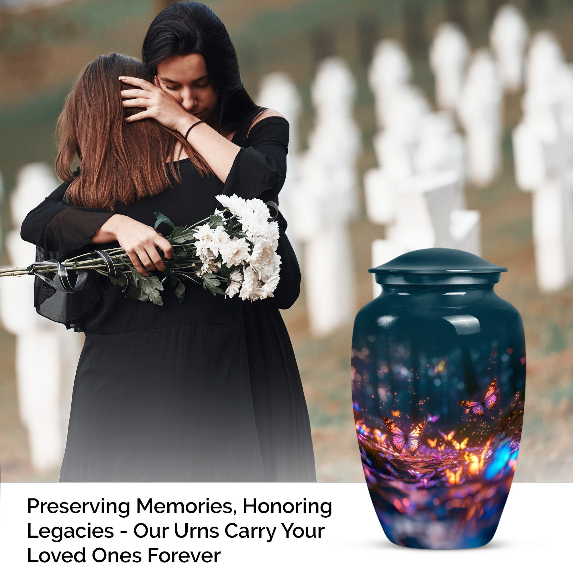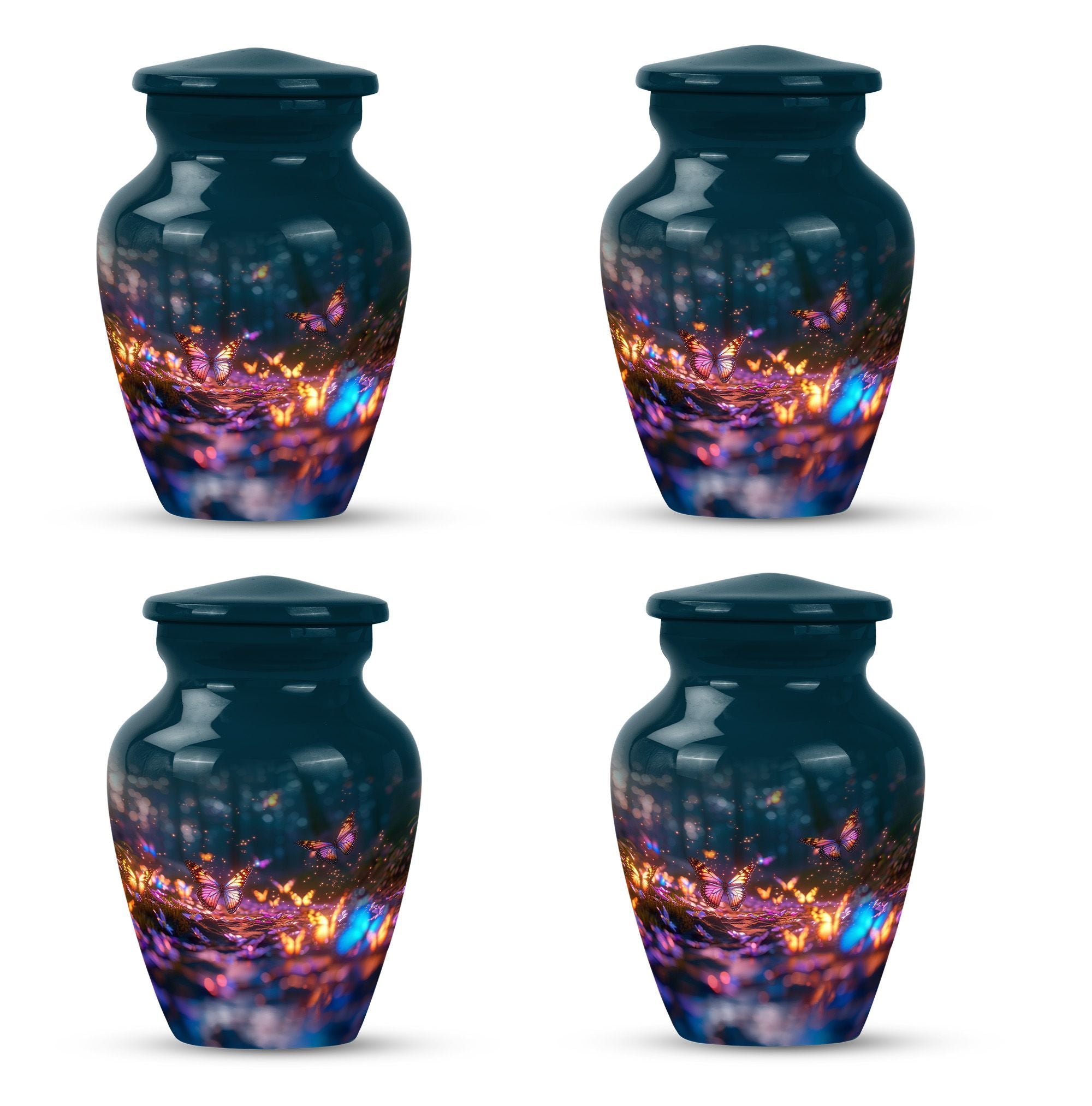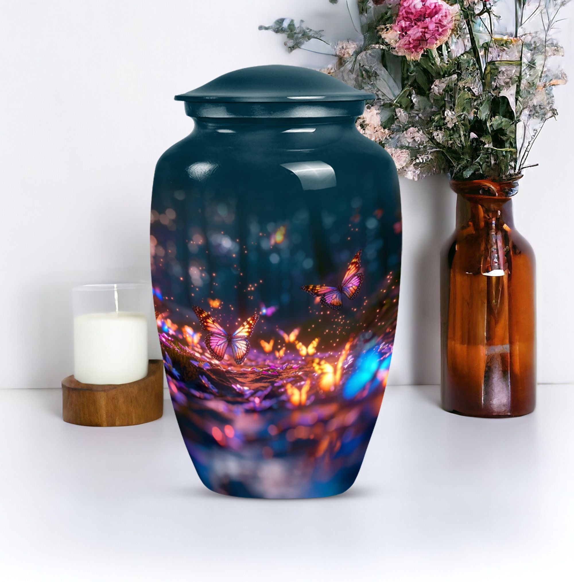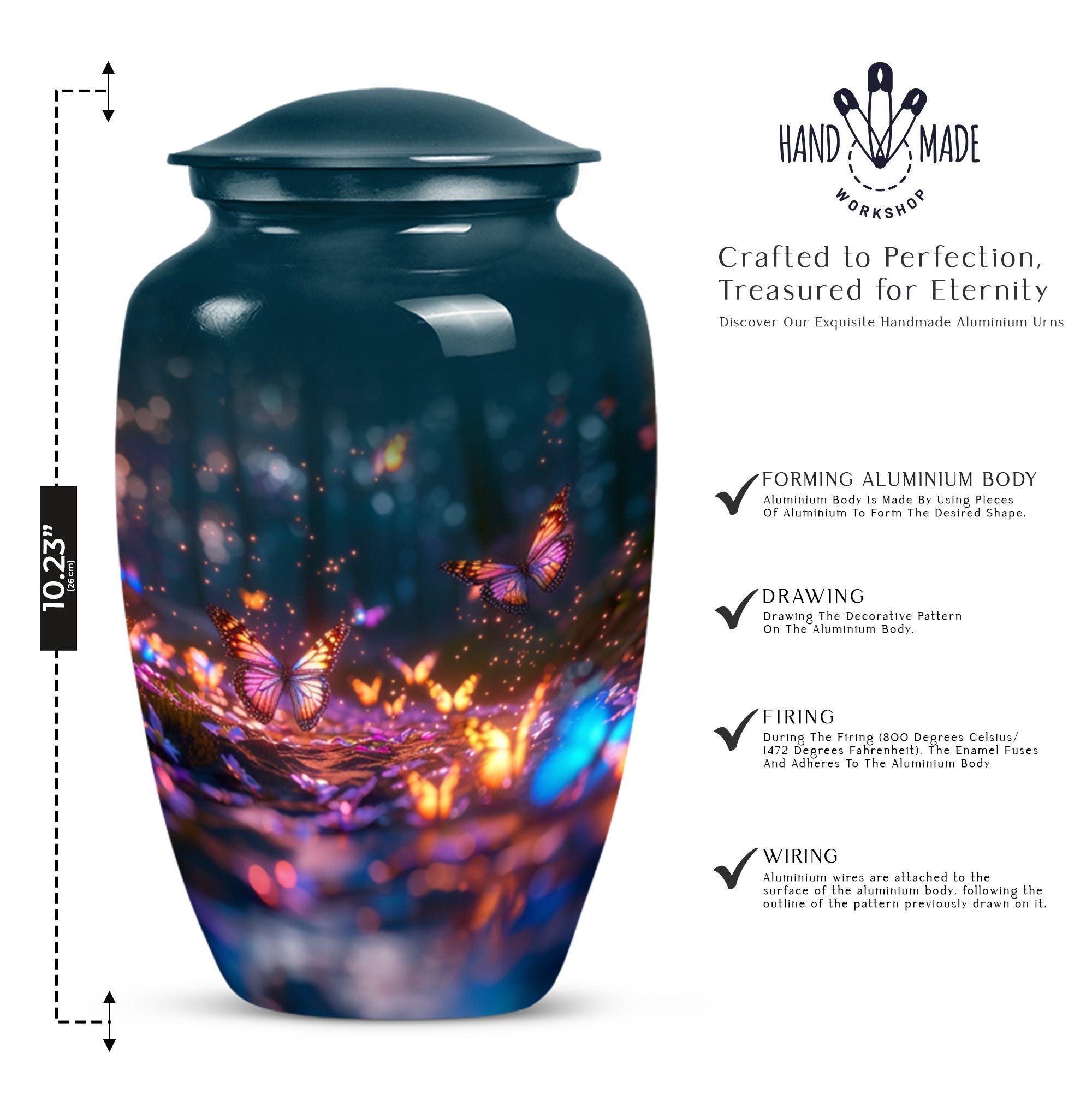 Bring honor to a loved one with our stunning Butterfly Urn, an elegant and fitting tribute for funerals or memorial ceremonies. Our product is exclusively sized at a height of 10 inches and crafted from high-quality Aluminium, rendering it a durable and timeless choice. The Abstract theme adds a unique touch to its appearance. With a capacity of 200 cubic inches, this large urn can comfortably contain the ashes of the deceased. To enhance your remembrance, we offer the service to personalize the urn with engraved names, making it a truly individual commemoration of your loved one. The urn weighs a sturdy 3.3 pounds and ensures safe storage of cremated remains, shipping with a lavish velvet pouch for guardianship of the ashes. Whether you're considering funeral urns for human ashes adult, looking for memorial urns for burial in the ground, or require cremation rings for ashes, our meticulously designed Butterfly Urn serves all your needs. The terms 'human ash urn adult' or 'large metal urn for ashes' are perfect to find our urn online, offering beauty and refinement in remembrance of those we hold dear.