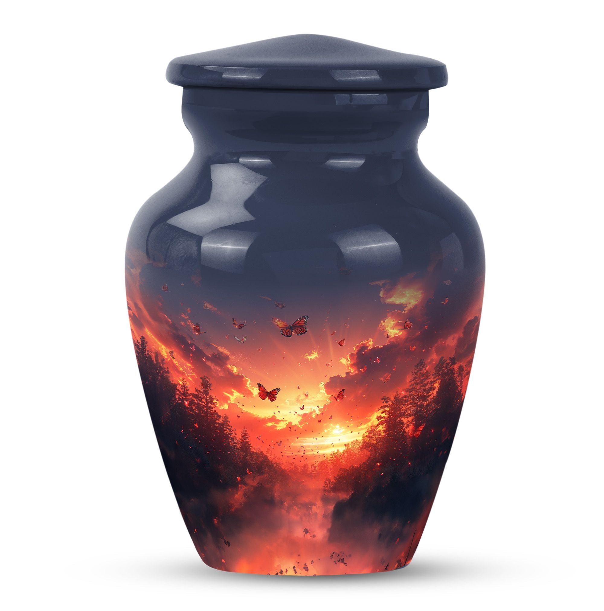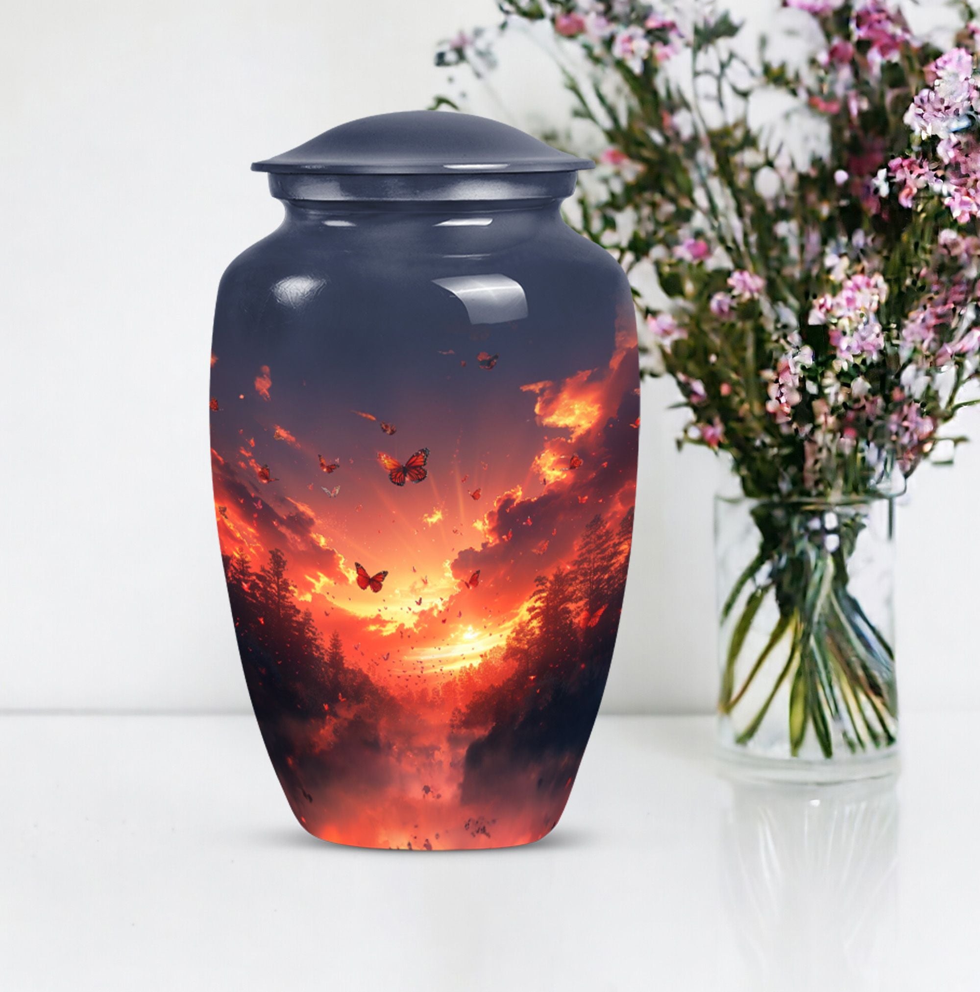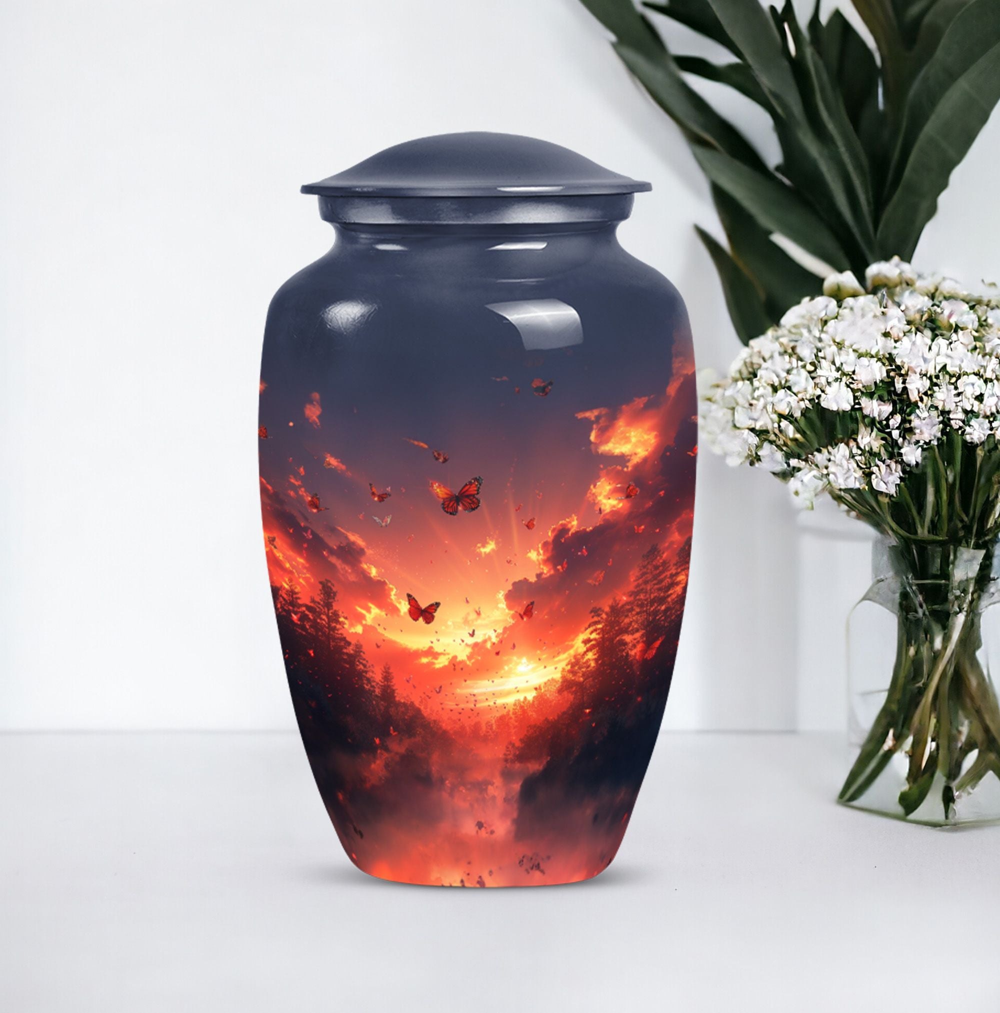Explore the profound beauty of our Pink Butterfly Urn, a token of remembrance in the Memorial Ceremony Supplies category. Our 10-inch aluminium urn exquisitely caters to the need for funeral cremation urns for women. Its classic urn style, themed with a graceful butterfly, emits an essence of peace and eternal tranquility. Weighing a mere 3.3 pounds, this urn has a generous capacity to accommodate 200 cubic inches of ashes. Unlike the conventional ash urn, ours arrives with a luxurious velvet pouch to preserve the sacred remains of your loved ones securely. We also offer a touching customization - personalizing it with engraved names. The urn comes in a large size variant for adaptability to your needs. Our uniquely shaped urn provides a dignified resting place and a comforting reminder of the enduring bonds of love and faith. Be it for your private contemplation or a memorial service, this pink butterfly urn stands as an epitome of remembrance beyond measure.