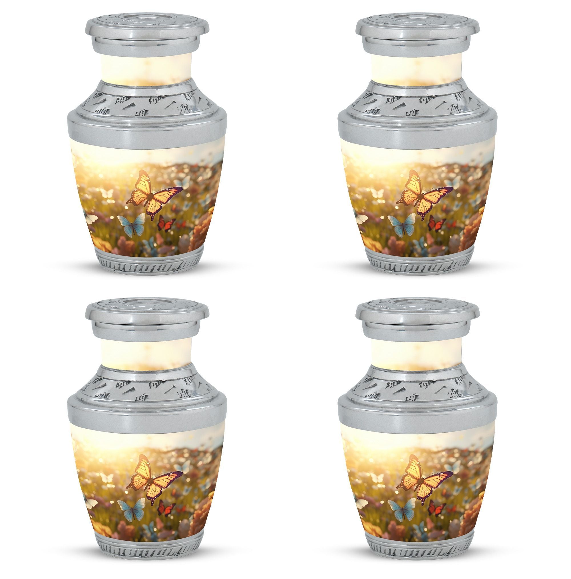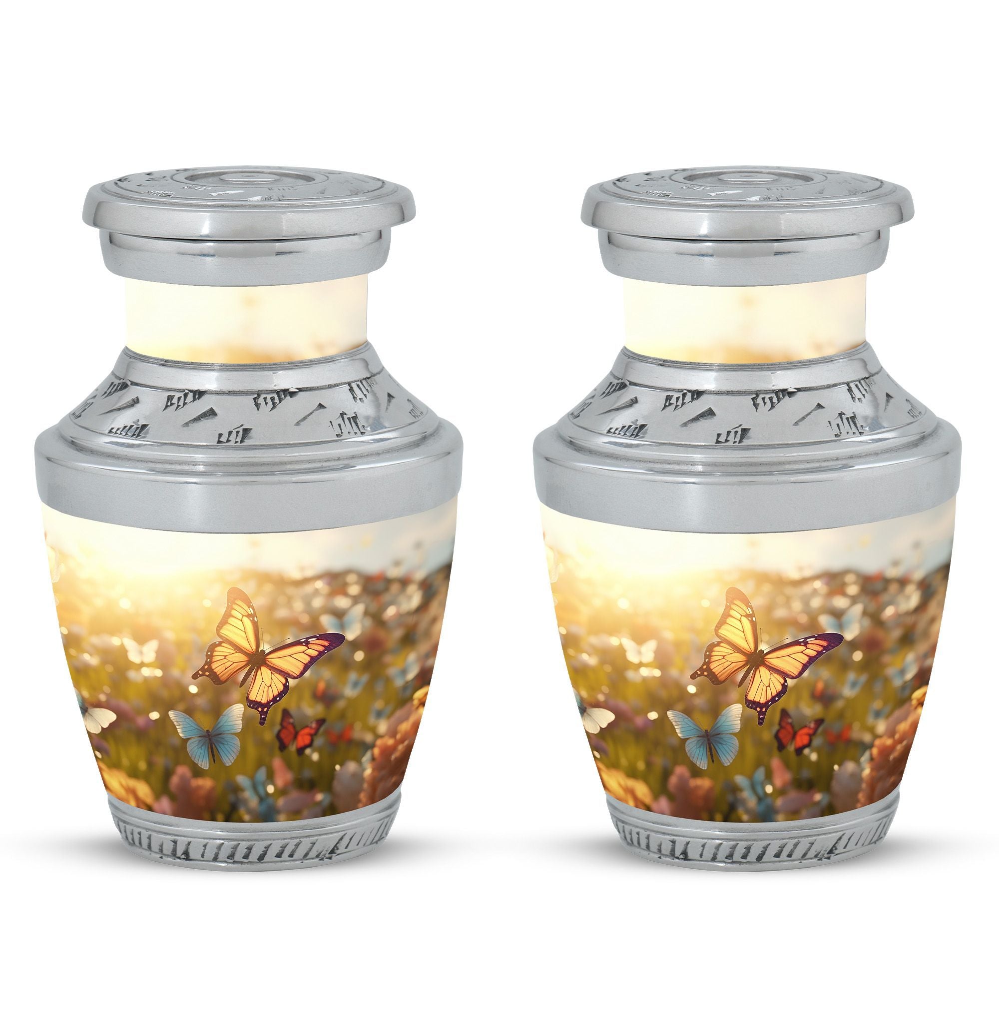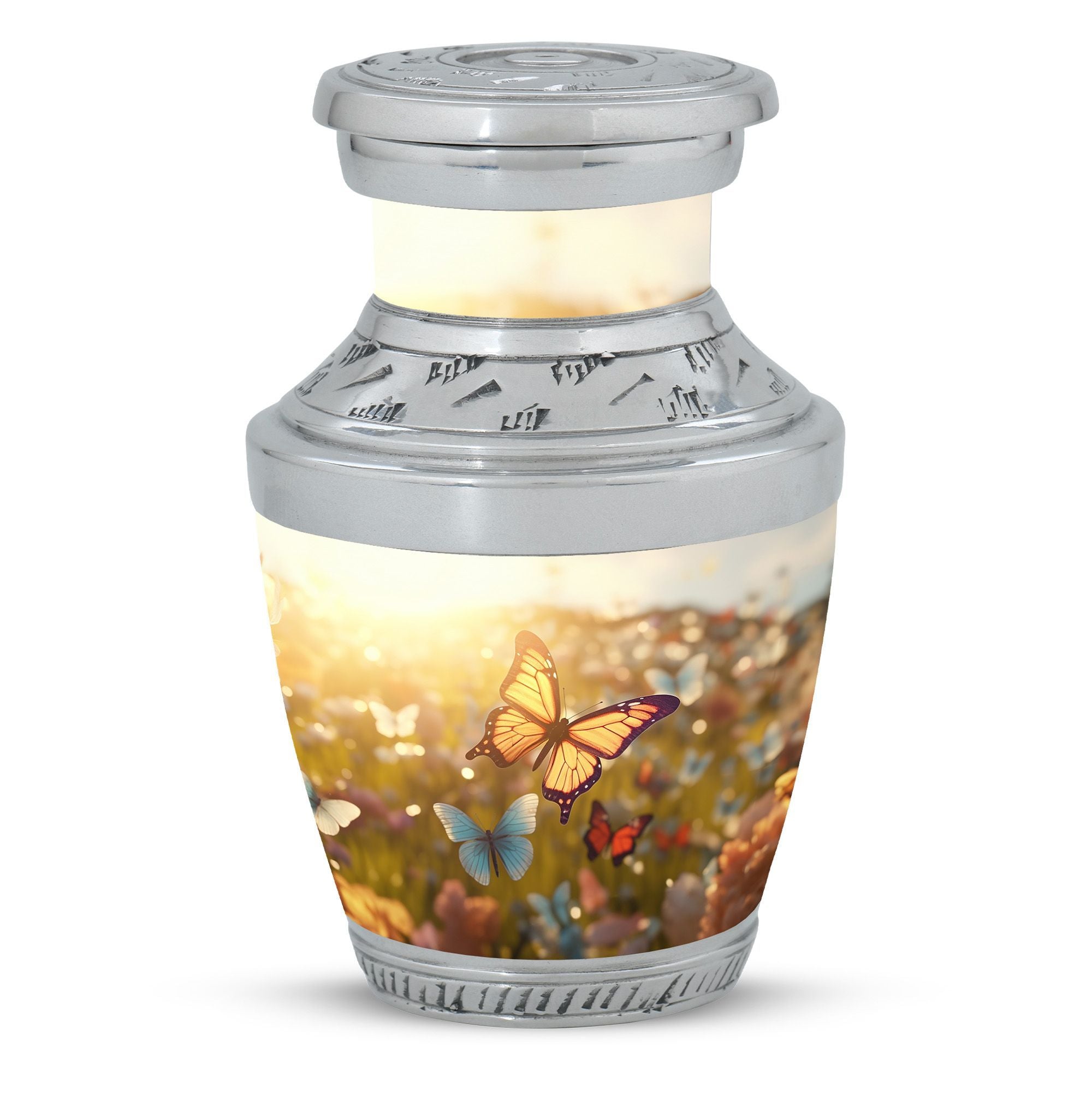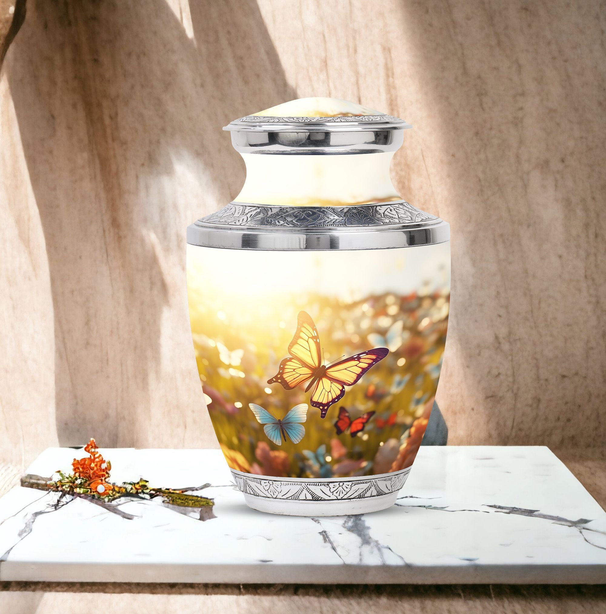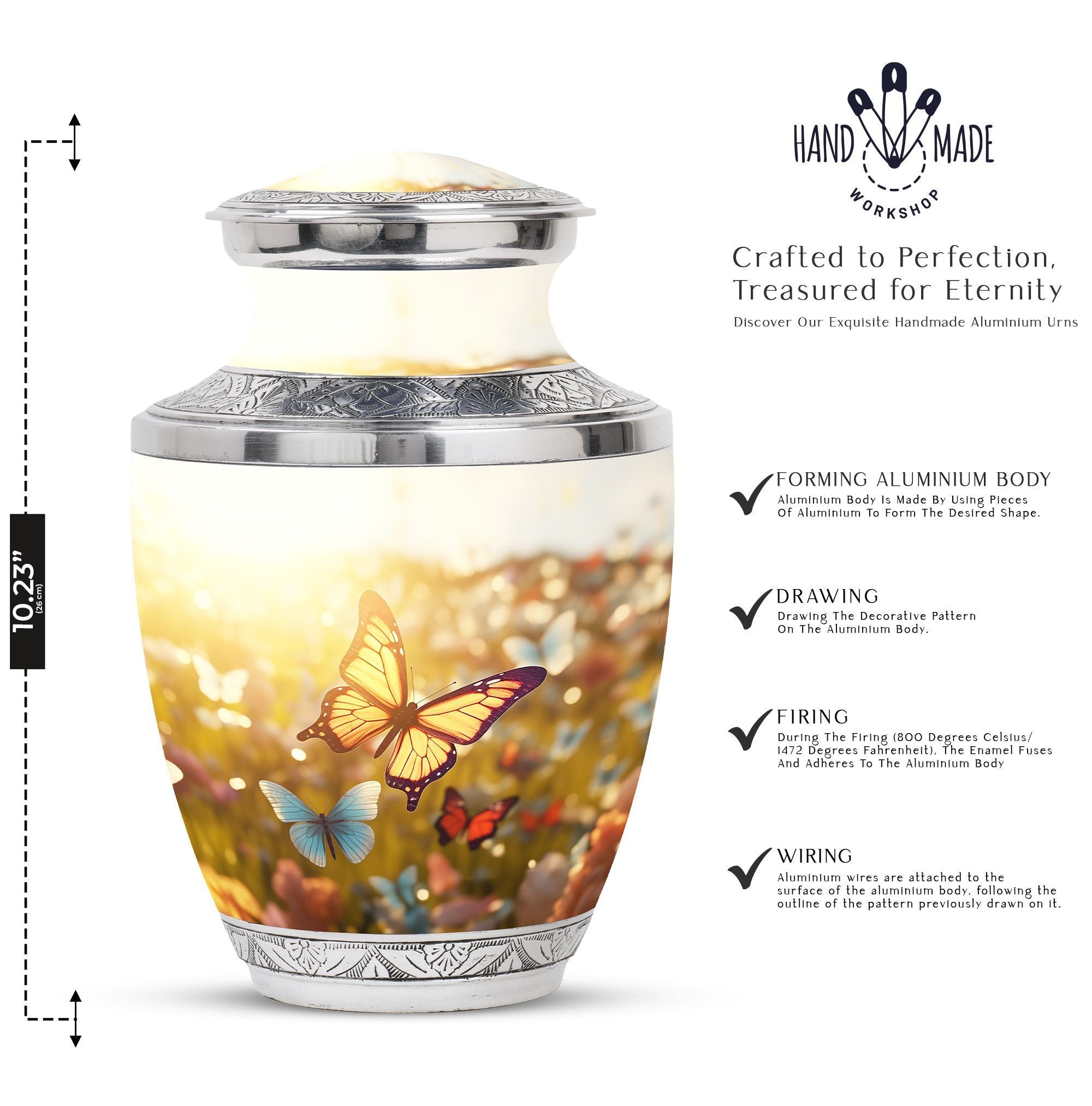 Our Butterflies Memorial Urn is a dignified and graceful choice for keeping your loved ones' memories alive. Constructed from high-quality Aluminium, this cremation urn is both durable and elegant, weighing in at just 3.3 pounds and standing at 10 inches in height. This traditional and Large Urn can hold up to 200 cubic inches of ashes, making it an ideal choice for Human Remains. This urn not only serves a functional purpose but also acts as a decorative piece, adding a touch of reverence to any space. The package also includes a velvet pouch, ensuring safe containment and facilitating transportation of the ashes with utmost respect and discretion. Moreover, providing a chance to personalize it with engraved names, this urn offers a unique way to remember and honor your loved ones.
