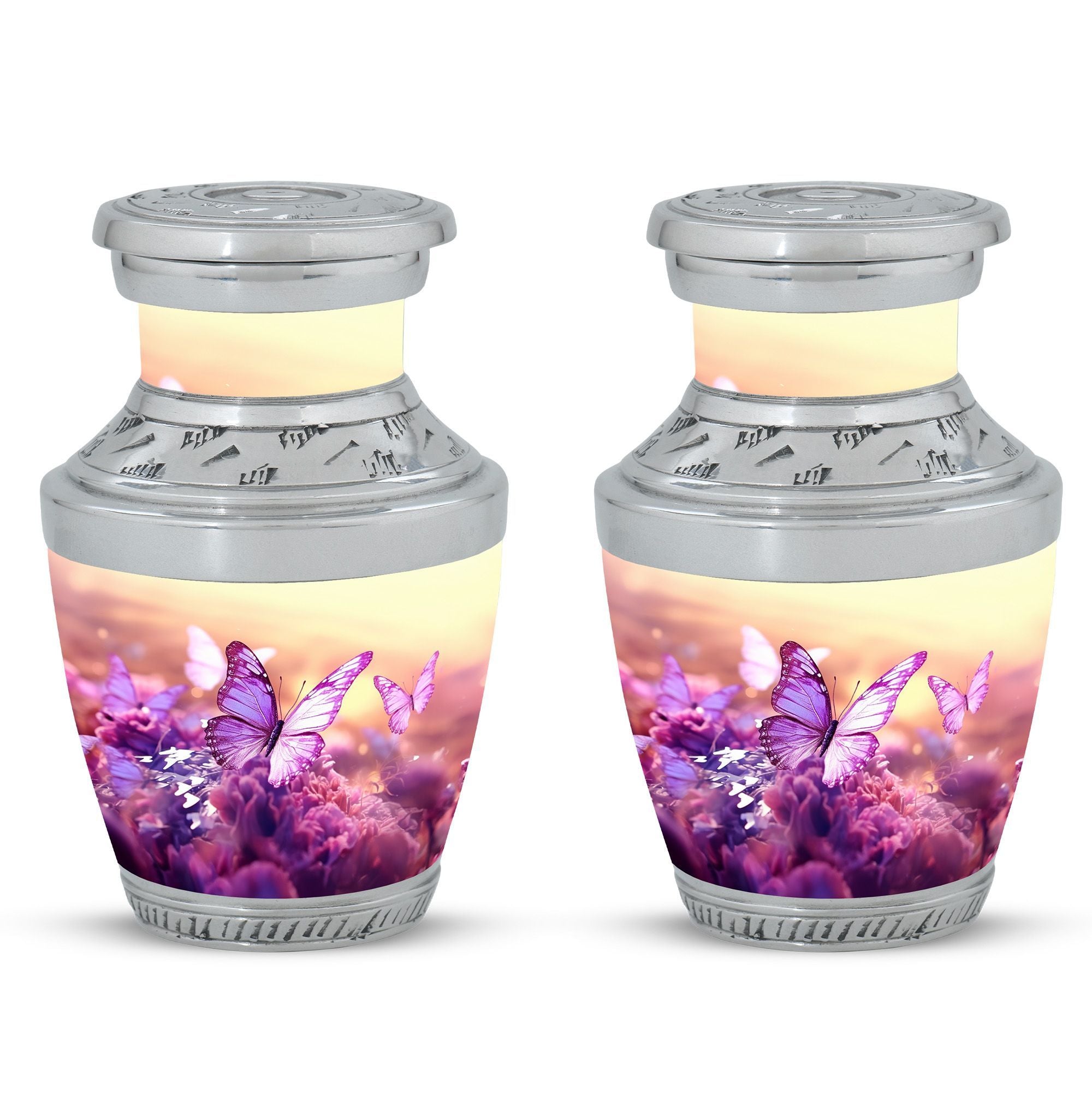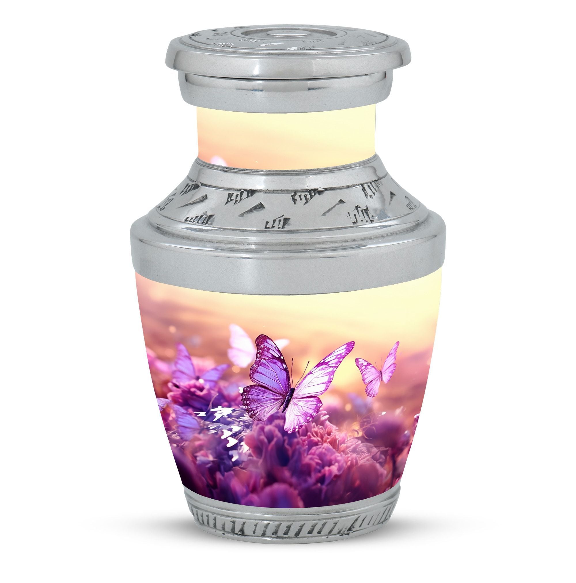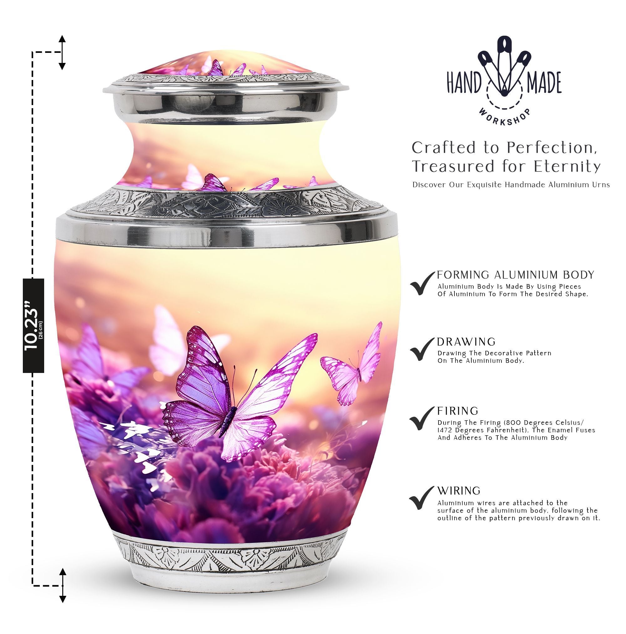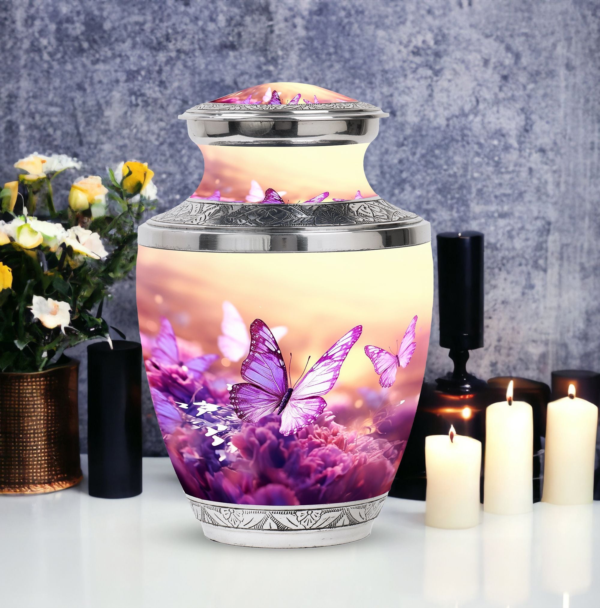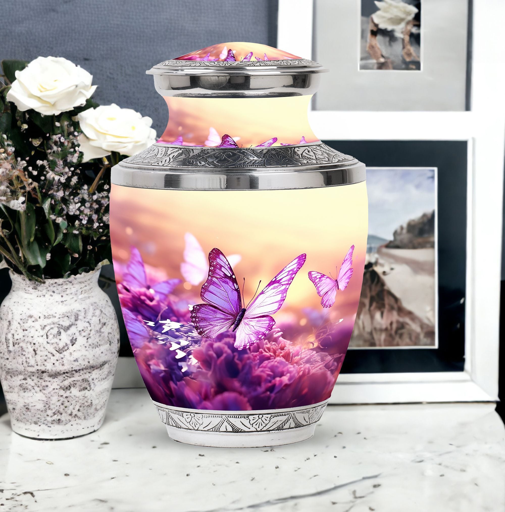 Discover a unique way to commemorate your loved ones with Butterfly in Meadow Urns for Human Ashes. These unique urns offer a size of 3 inches, and a sturdy weight of 3.3 pounds. They stand proud at 10 inches in height and made of long-lasting aluminium. The lunar design combined with the classic urn design allows for a vibrant and soothing symbol for the memory of the departed. Our Large Urns come with a gentle velvet pouch for the secure containment of ashes. Their more significant capacity allows for the containment of up to 200 cubic inches of ash, ensuring your loved one's memory stays intact. Make it personal with our customization features - have the urn engraved with your loved one's name, creating a truly unique memorial. These custom urns not only serve as secure ashes holders for cremation but also double as decorative urns, particularly perfect for Moms Ashes. So, Discover our Butterfly in Meadow urns, redefining the experience of memorial urns.