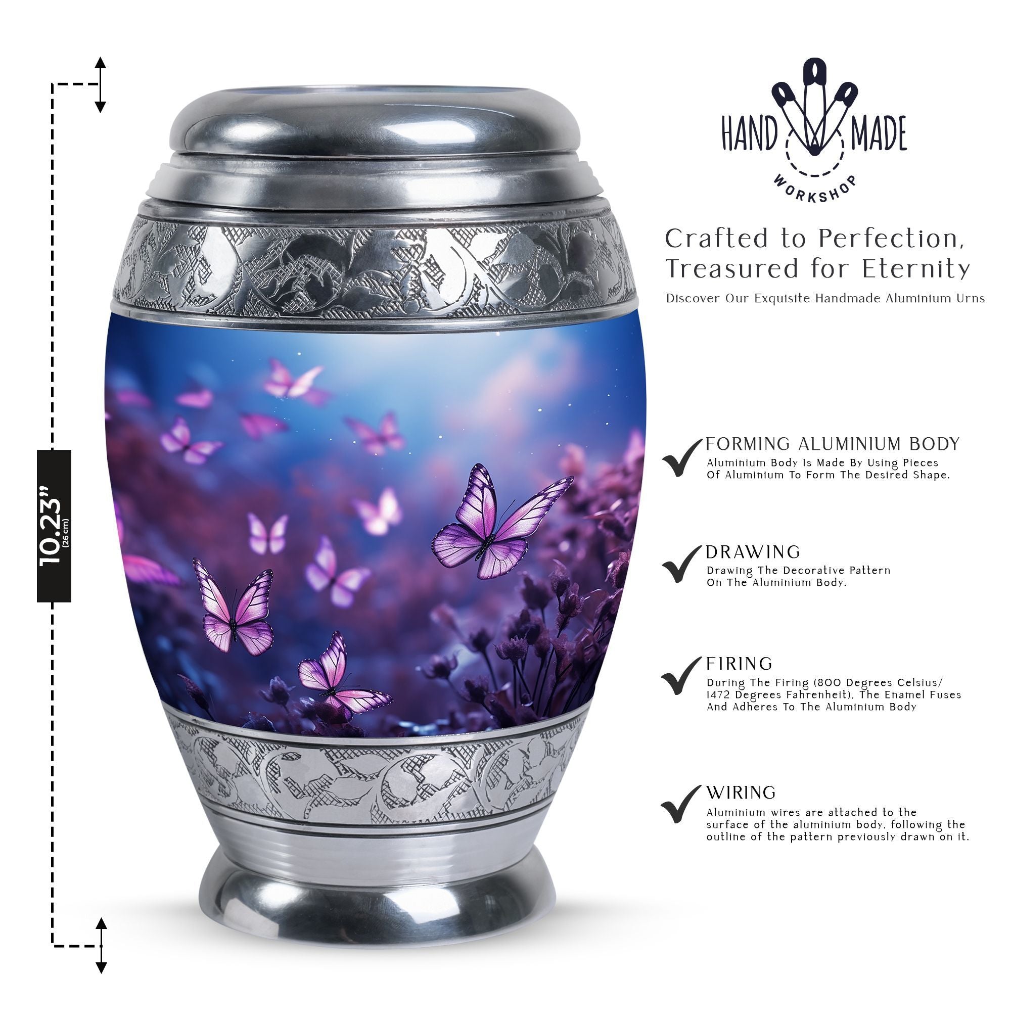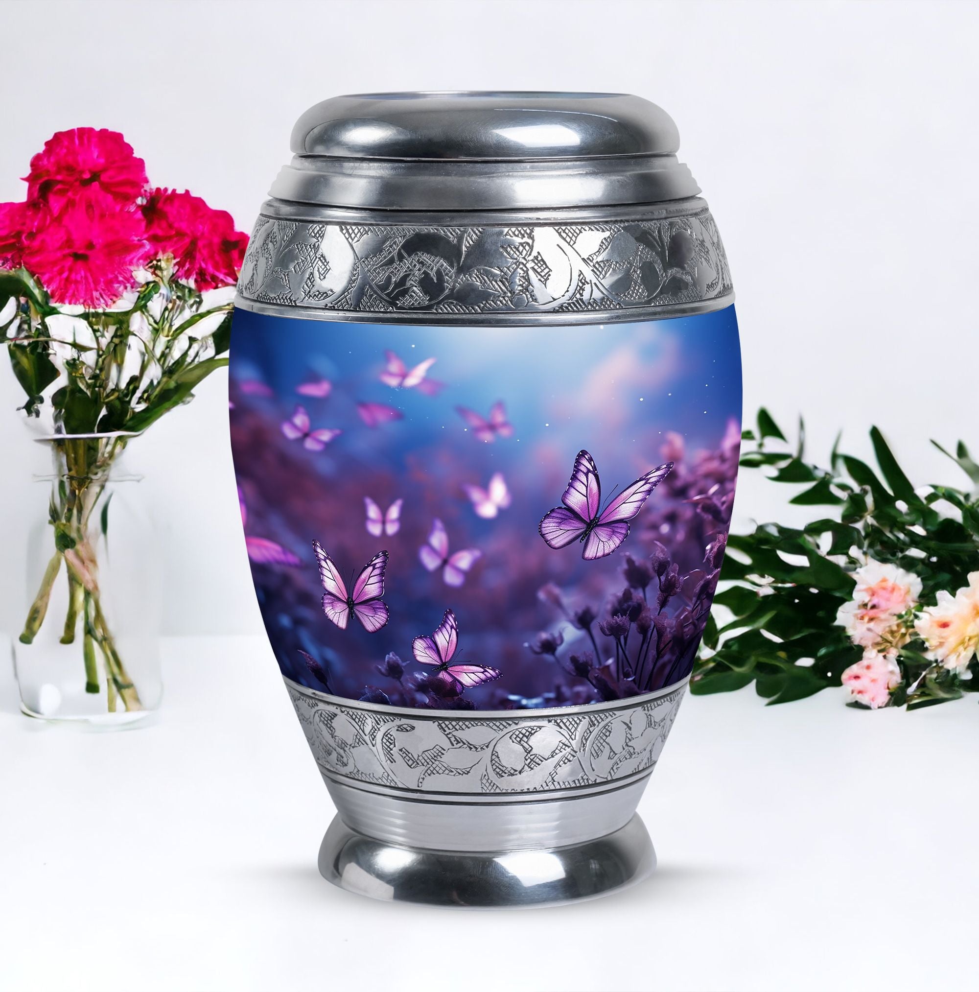 Pay tribute to your loved one in style with our special 'Butterflies in Forest Memorial Urn'. Specifically designed for adults and senior citizens, this urn is an optimal choice for anyone who is looking for high-quality cremation urns. With a size of 3 inches and weighing 3.3 pounds, its classic urn shape gives a timeless appeal. This large cremation urn is meticulously crafted from durable aluminium, ensuring long-lasting memorability. The urn comes with a velvet pouch, providing a secure containment for ashes. Boasting an impressive 200 cubic inches of capacity, it can comfortably hold the ashes of an adult. To give a more personal touch, individual names can be engraved on it, making it not just a burial urn for ashes, but something much more meaningful. Our 'Butterflies in Forest Memorial Urn' stands at 10 inches in height, and is a modern ashes holder that combines traditional elegance with a unique flair.