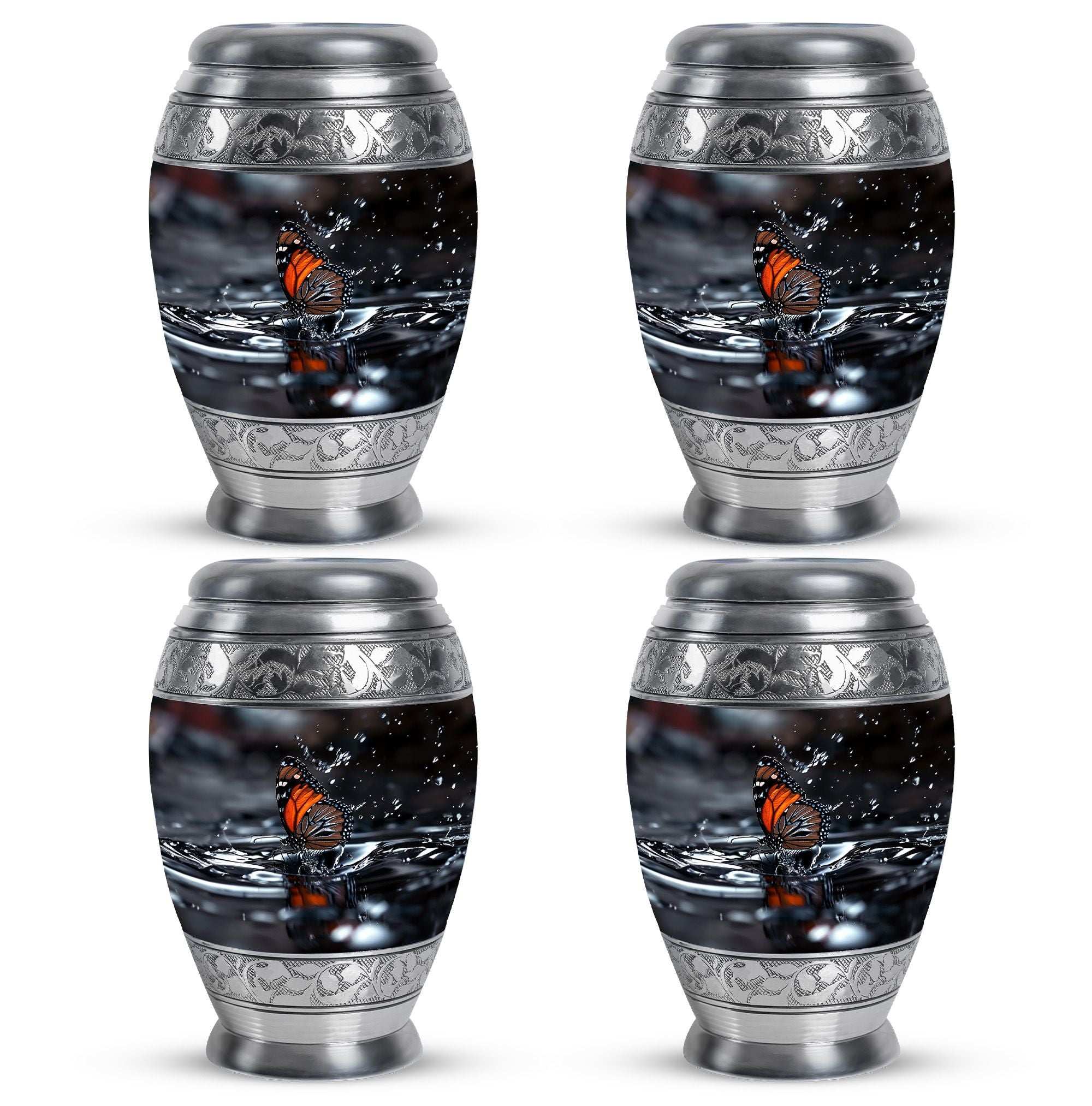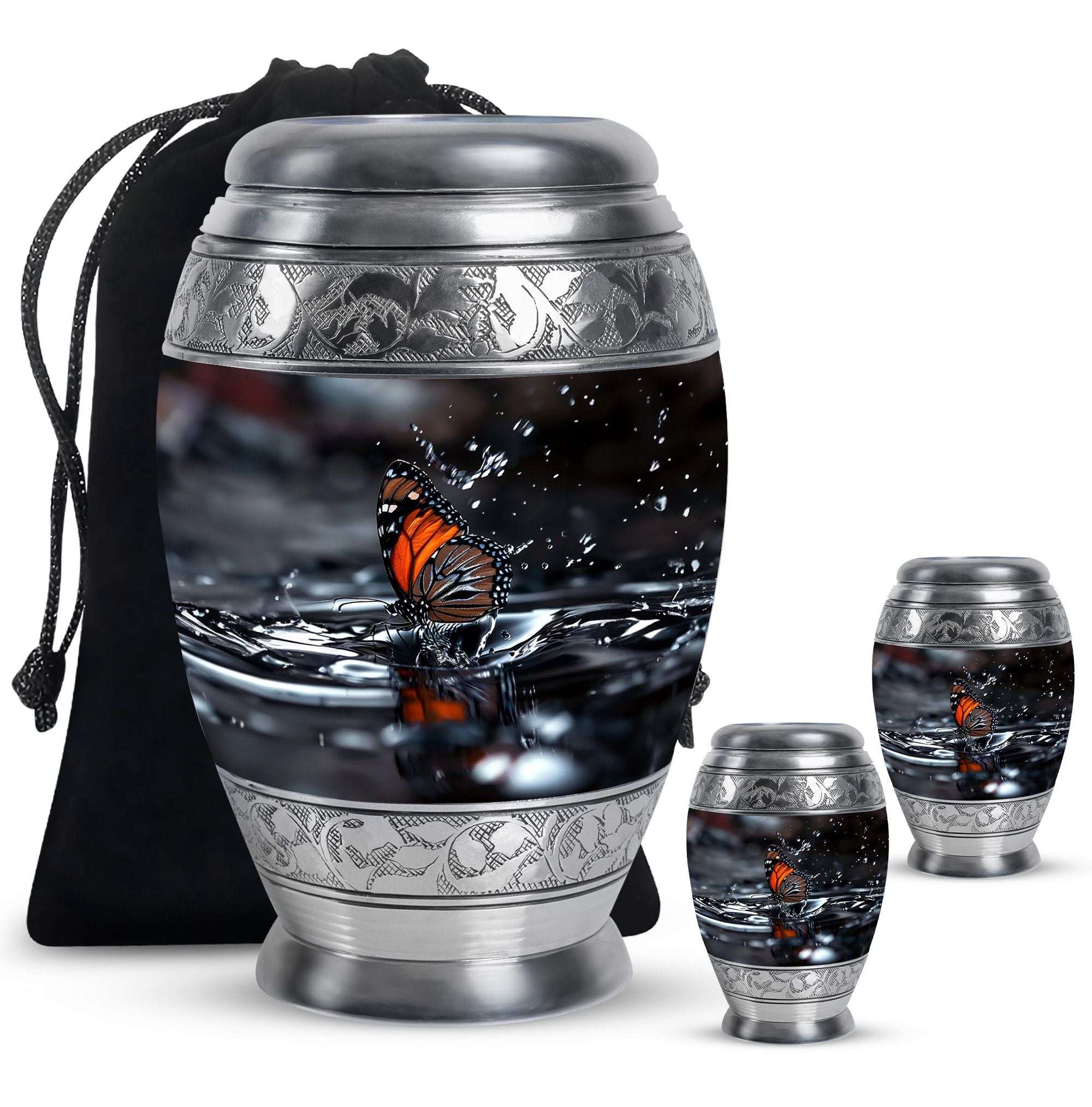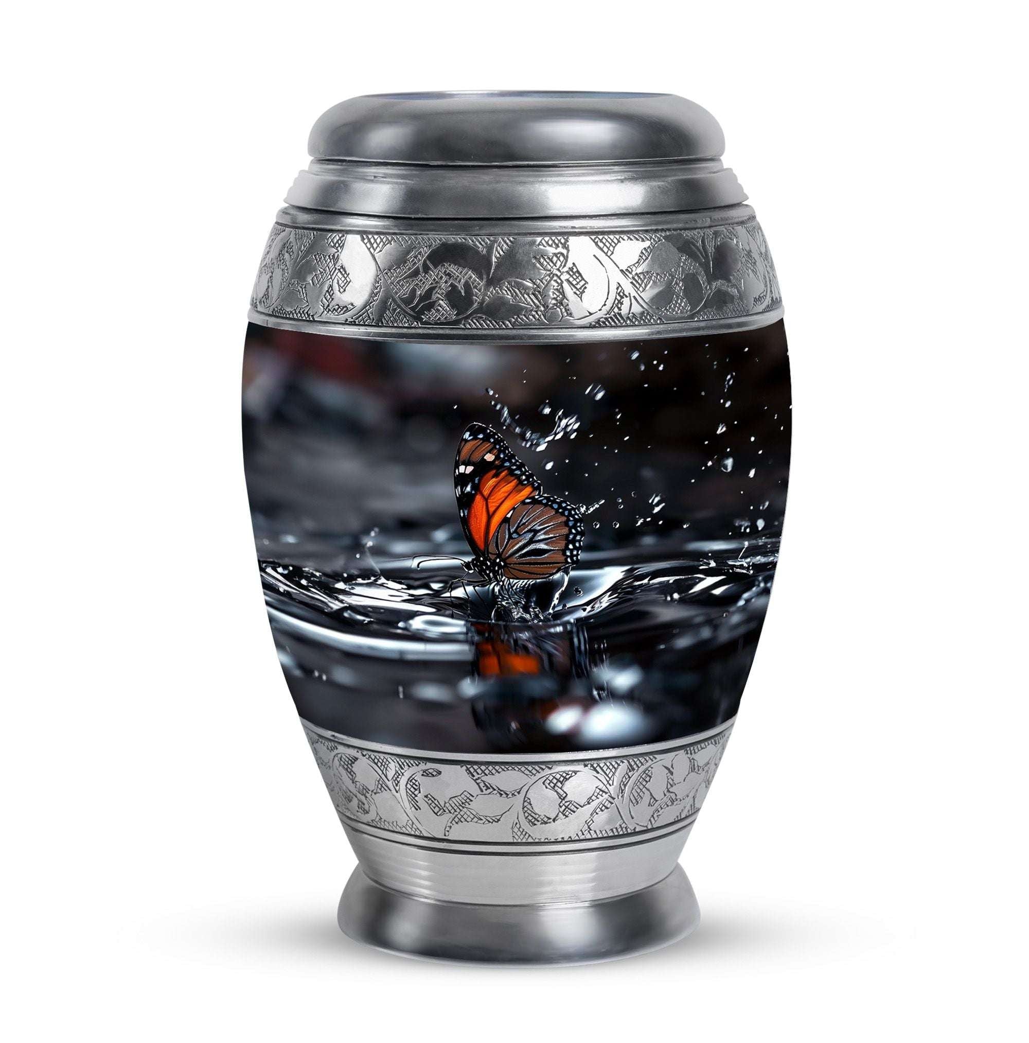 Designed with meticulous craftsmanship, this cremation urn large features a serene water reflection pattern adorned with delicate black butterflies. Made from durable aluminium, it balances beauty with lasting strength. Its classic style and secure screw-top lid ensure safe storage, making it a versatile choice for both display and ceremonial use. Among large funeral urns, it stands out for its meaningful design and thoughtful attention to detail.