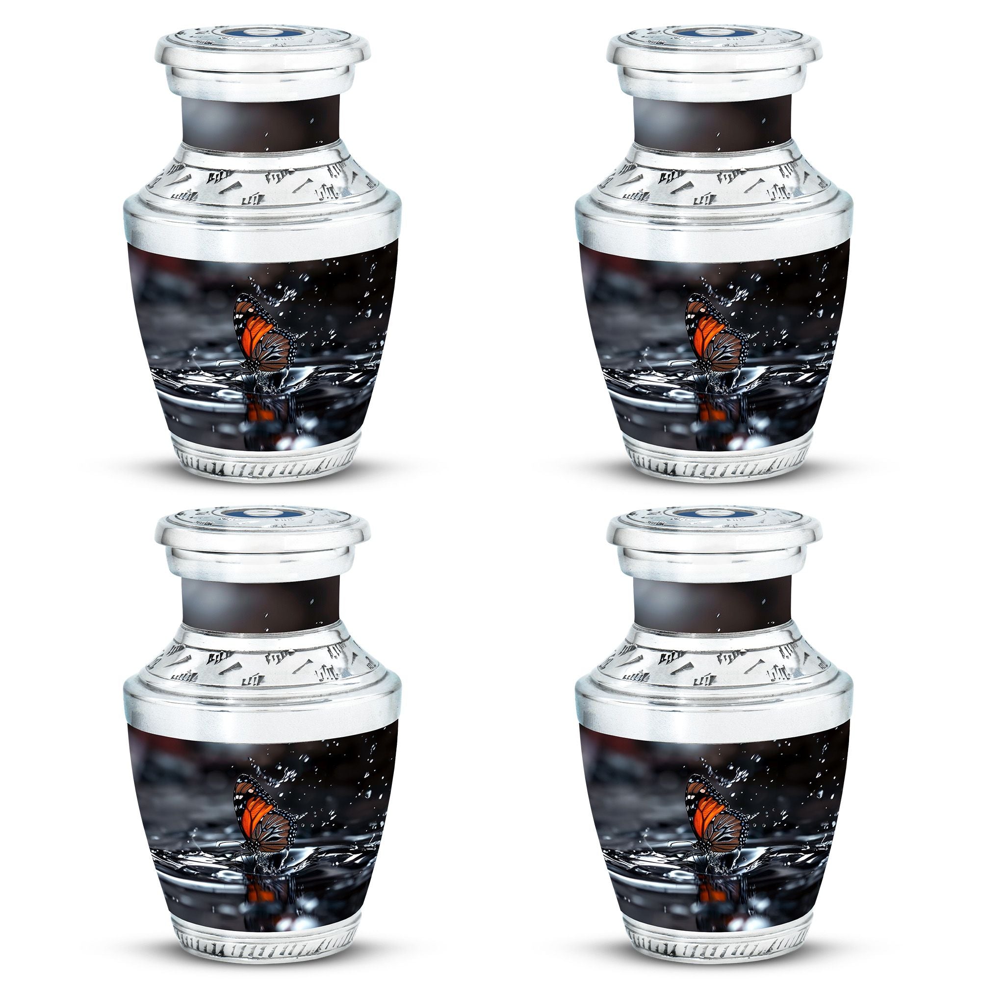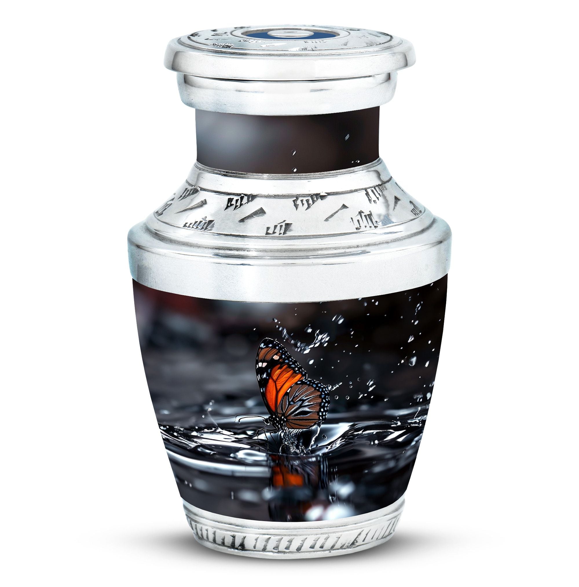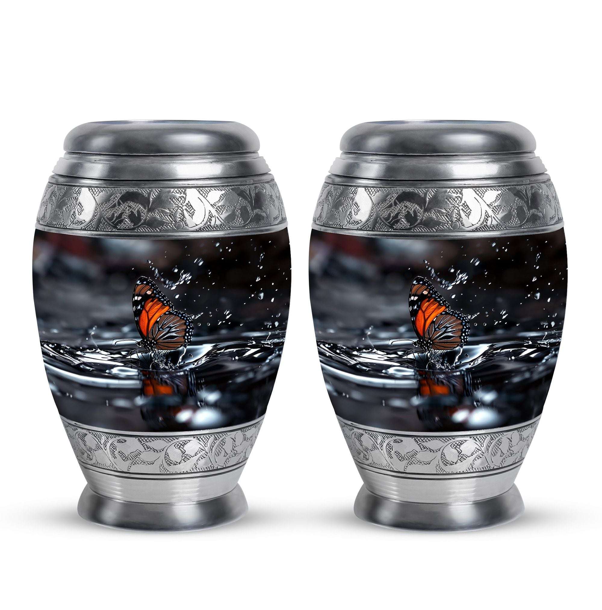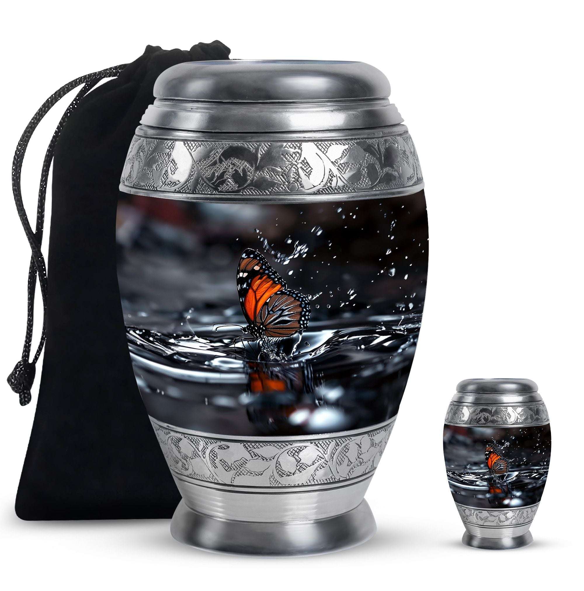 Designed with meticulous craftsmanship, this cremation urn large features a serene water reflection pattern adorned with delicate black butterflies. Made from durable aluminium, it balances beauty with lasting strength. Its classic style and secure screw-top lid ensure safe storage, making it a versatile choice for both display and ceremonial use. Among large funeral urns, it stands out for its meaningful design and thoughtful attention to detail.