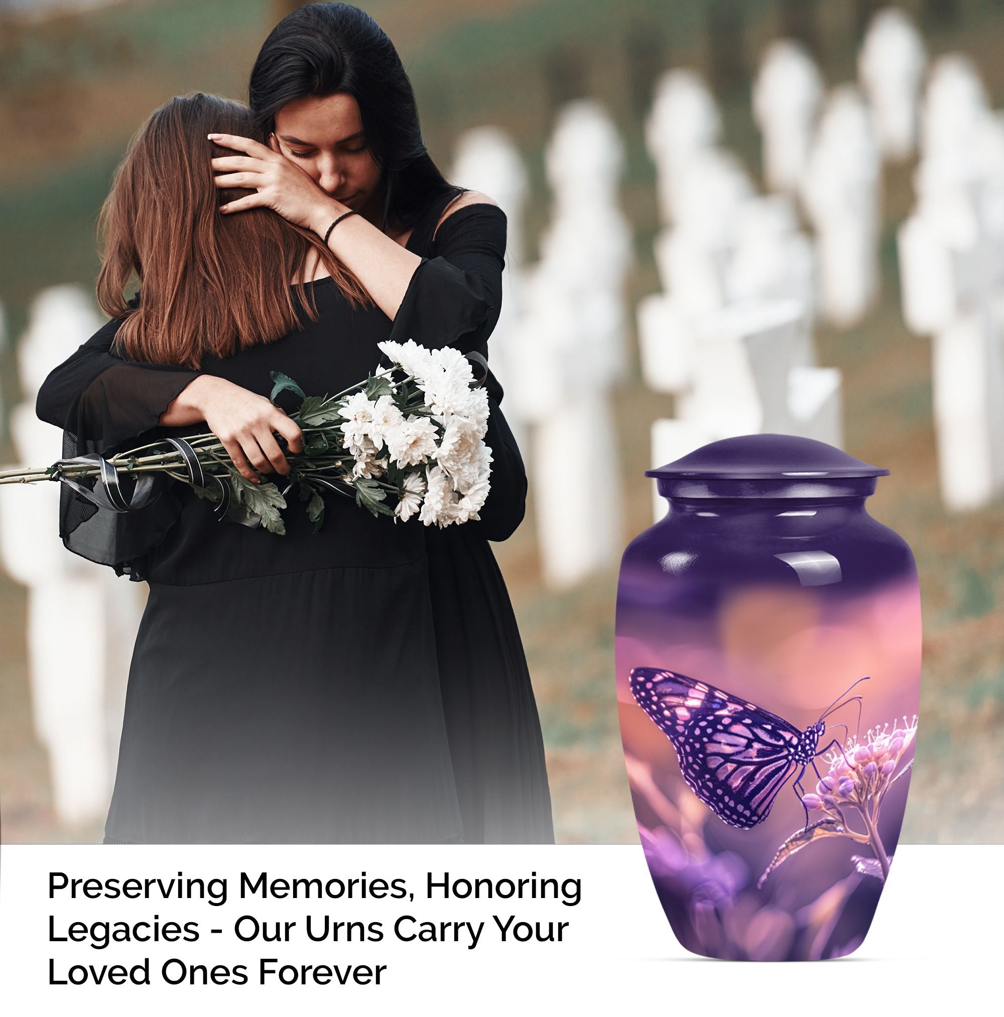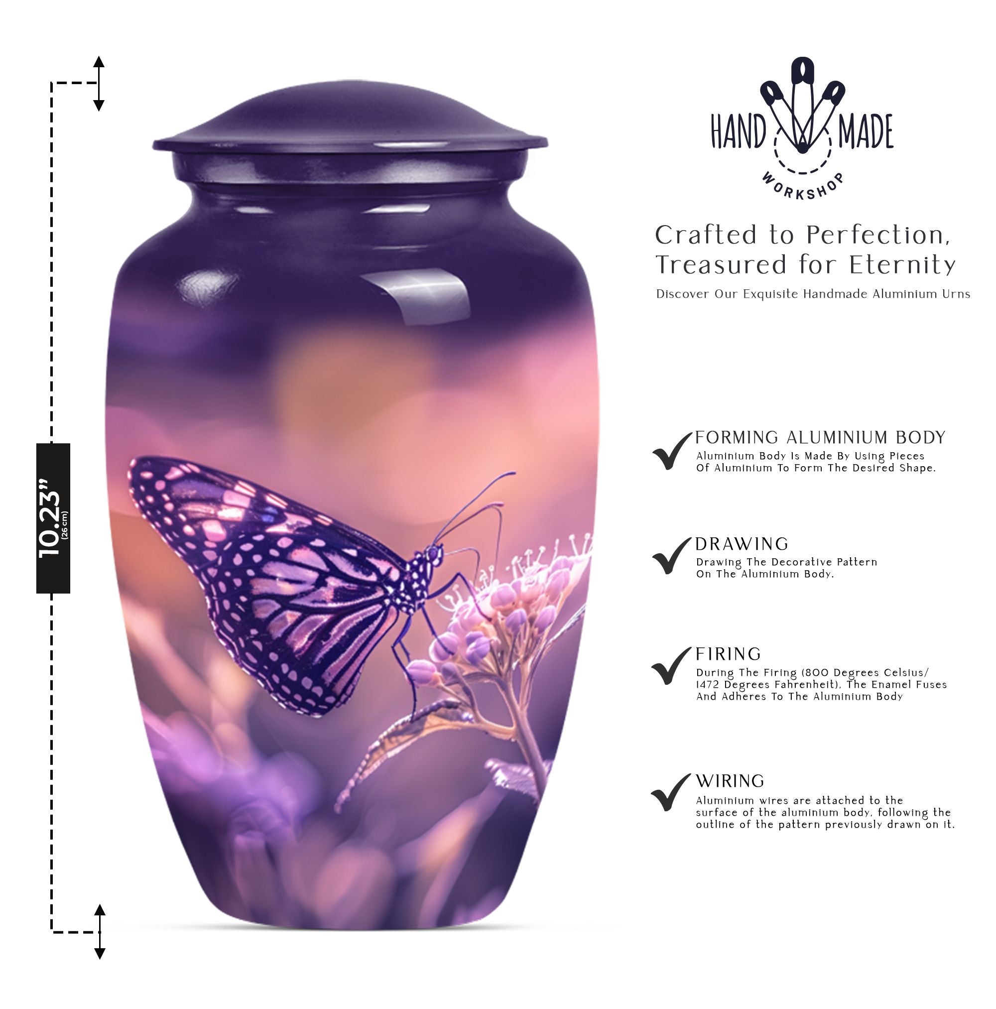 Our Butterfly Urn, designed for those wishing to honor their loved ones in a distinctive way, blends tradition with innovation. This 10-inch masterpiece, crafted from robust aluminium, stands as an immortal commemoration of an extraordinary life. Weighing in at 3.3 pounds, its dimensional framework allows for the containment of up to 200 cubic inches of ashes, ensuring an appropriate memorial for an adult male or a larger proportioned woman. Complete with a velvet pouch for the respectful containment of remains, the urn is not only a symbol of remembrance but also a piece of decor that subtly complements your interior design. Even more distinctly, it offers personalization options that allow you to engrave names, adding a touch of intimacy to your memorial. Echoing the graceful transition emblematic of a butterfly, this memorial urn transforms mourning into an eternal celebration of life. A harmonious blend of aesthetics and sentimentality lies at the heart of our urn, offering a comforting presence in times of sorrow.