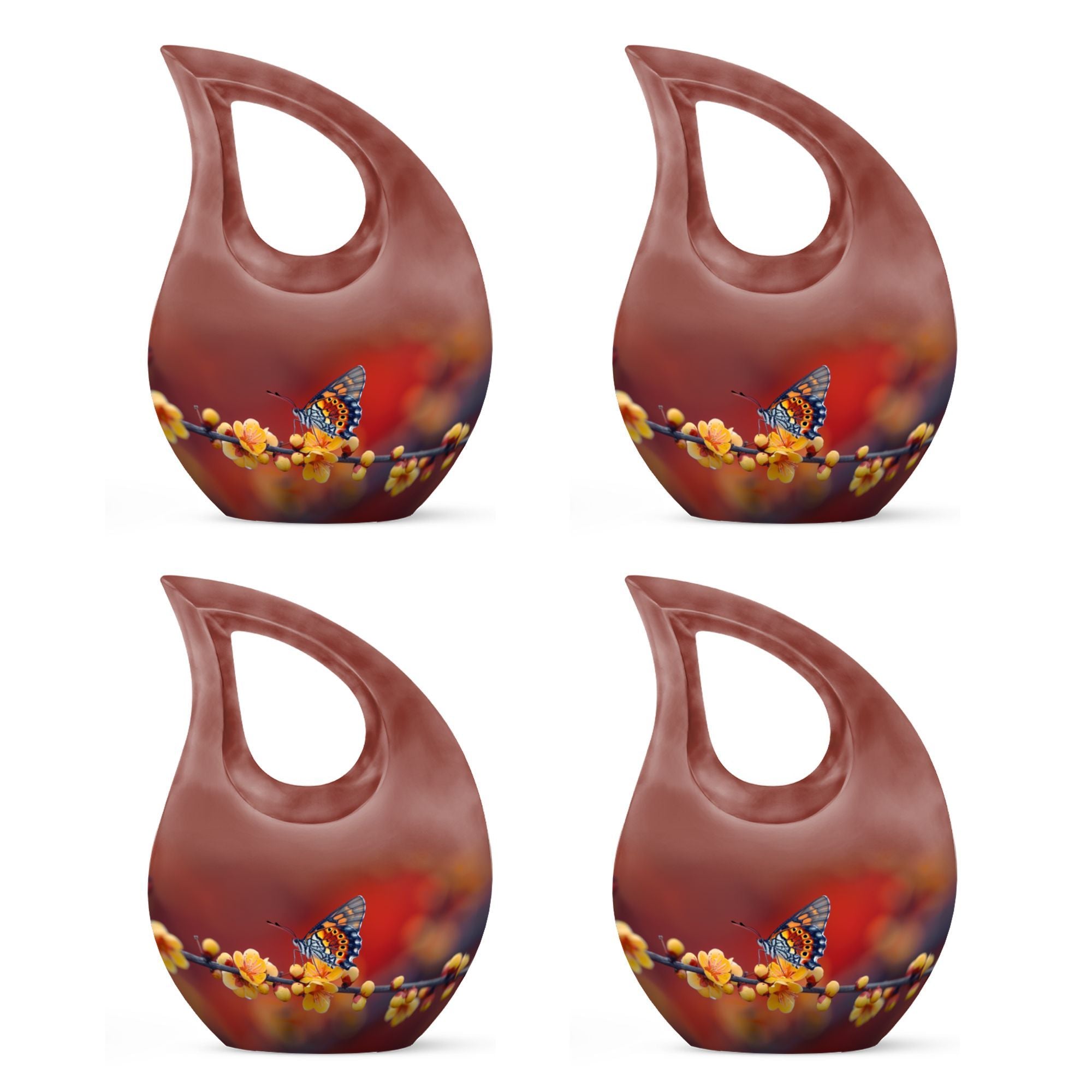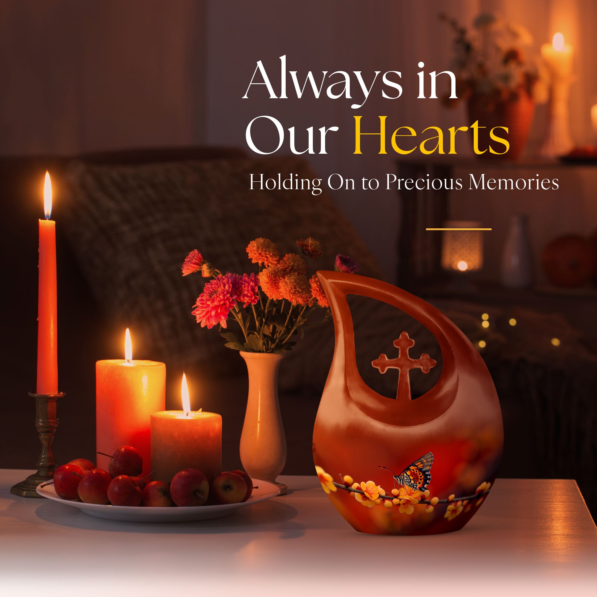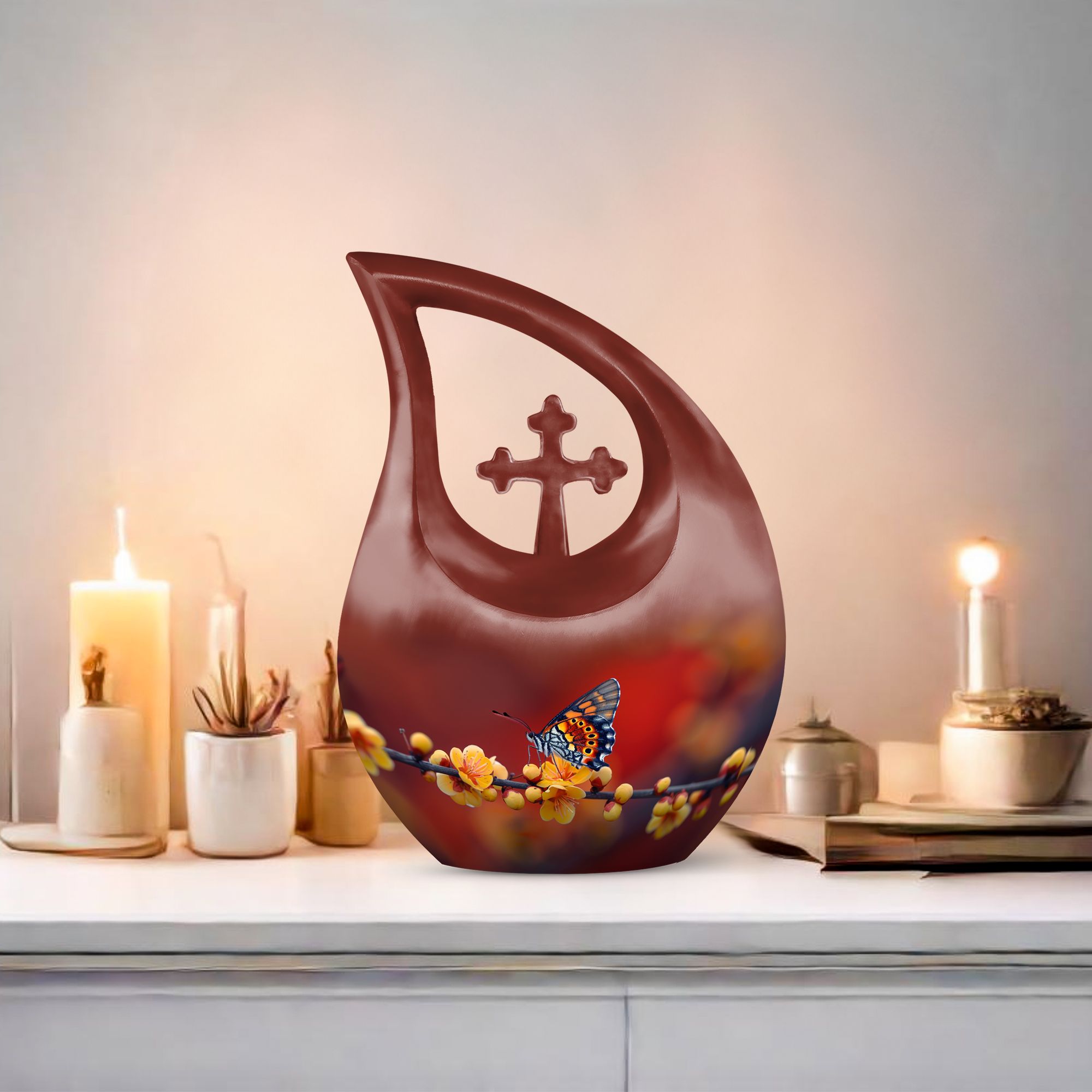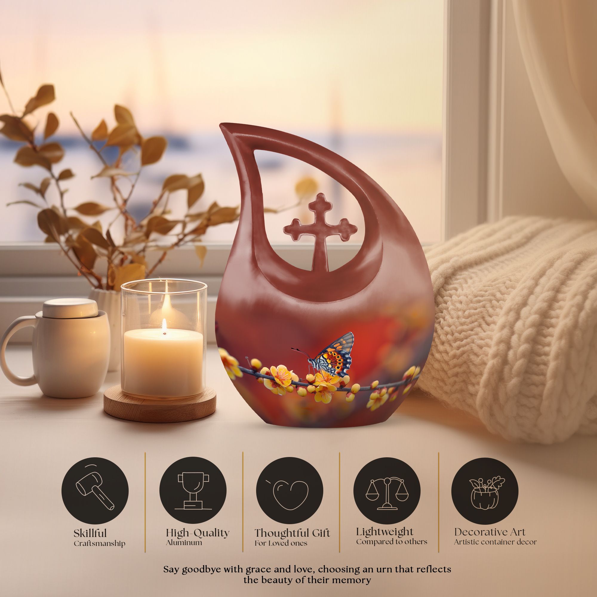 Carefully crafted and elegant, our 10 Inch Butterfly themed Garden Urn is the perfect memorial urn for your loved one's ashes. Made from sturdy aluminium, this Large Urn weighs 3.3 pounds, and measures 10 inches in height, ~its weight and dimensions creating a sense of grounding presence yet comfortingly lightweight allowing for portability. Its design feature a beautiful 'Cross-Drop' emblem, ensuring it's not just an urn, but a piece of decor that fits comfortably in your sacred spaces. One of the key highlights of this urn is its impressive capacity of 200 cubic inches, creating ample space for containment. Further enhancing the distinctiveness of the urn is the opportunity to personalize it with engraved names, adding a touch of bespoke remembrance. Each unit comes with a luxurious velvet pouch, serving as an additional layer of protection for the ashes. This product flawlessly balances between function and aesthetics, making it one of the best urns for ashes available. Please note, design elements are not the focal point here, rather the alluring blend of practicality and bespoke symbolism the urn brings. With keywords including 'butterfly urn', 'garden urns for ashes' and 'memorial urns' likely to lead you to this product, your online search for personalized urns for ashes just got easier.
