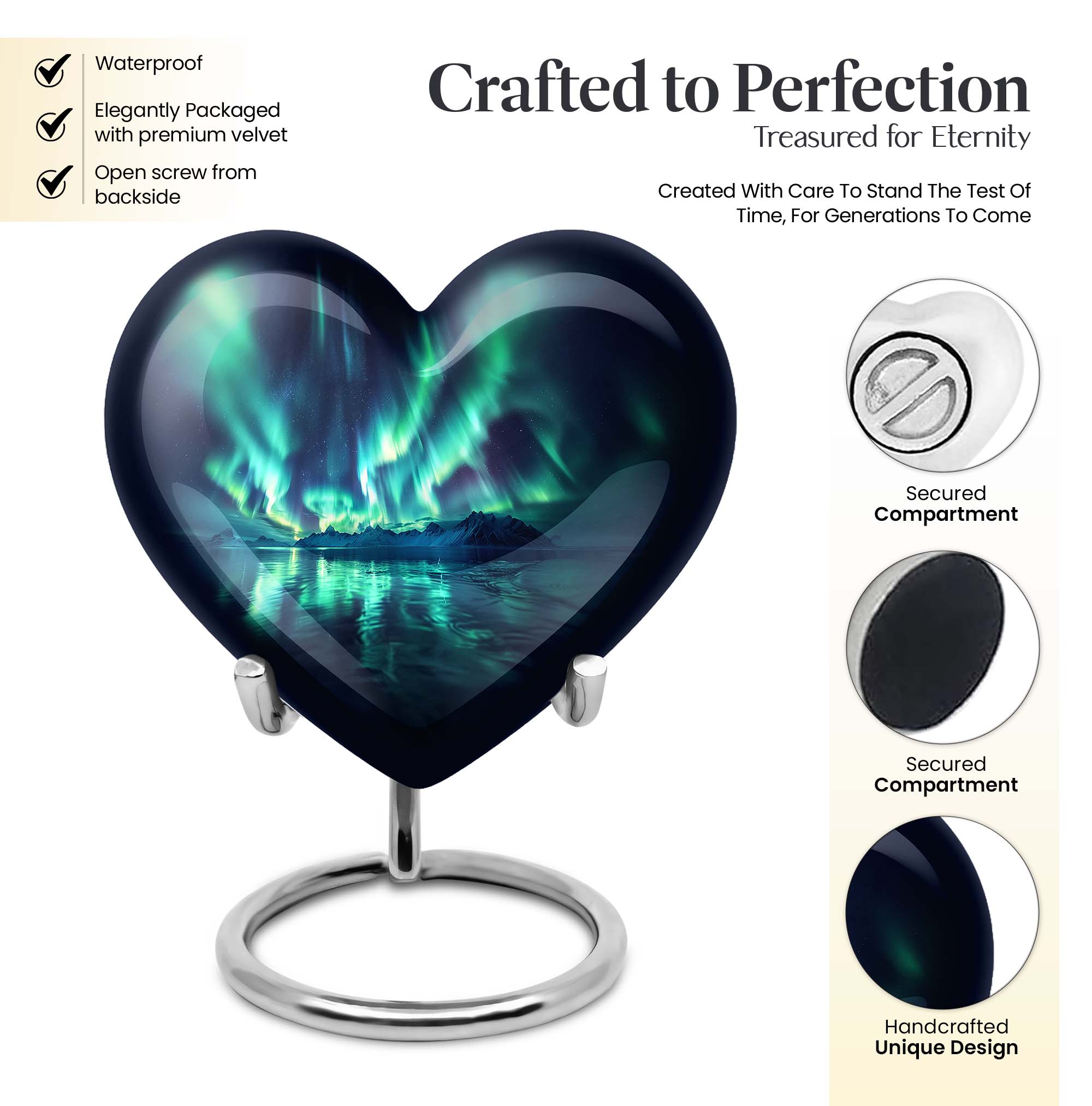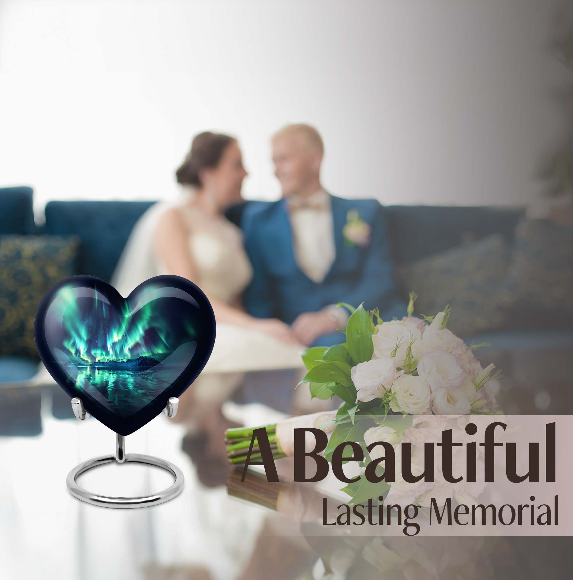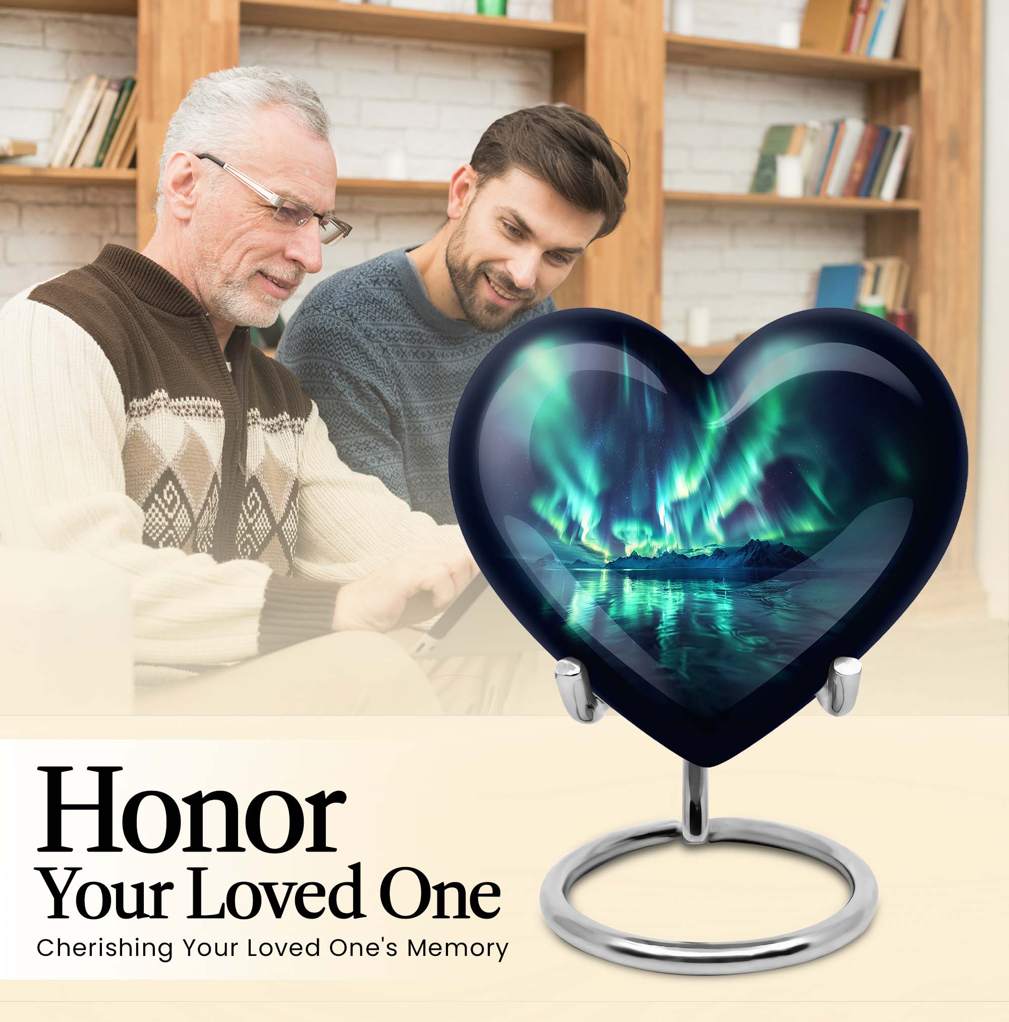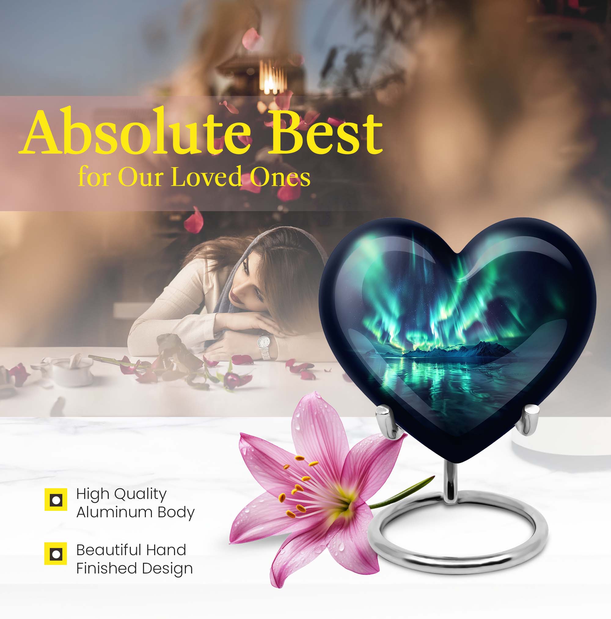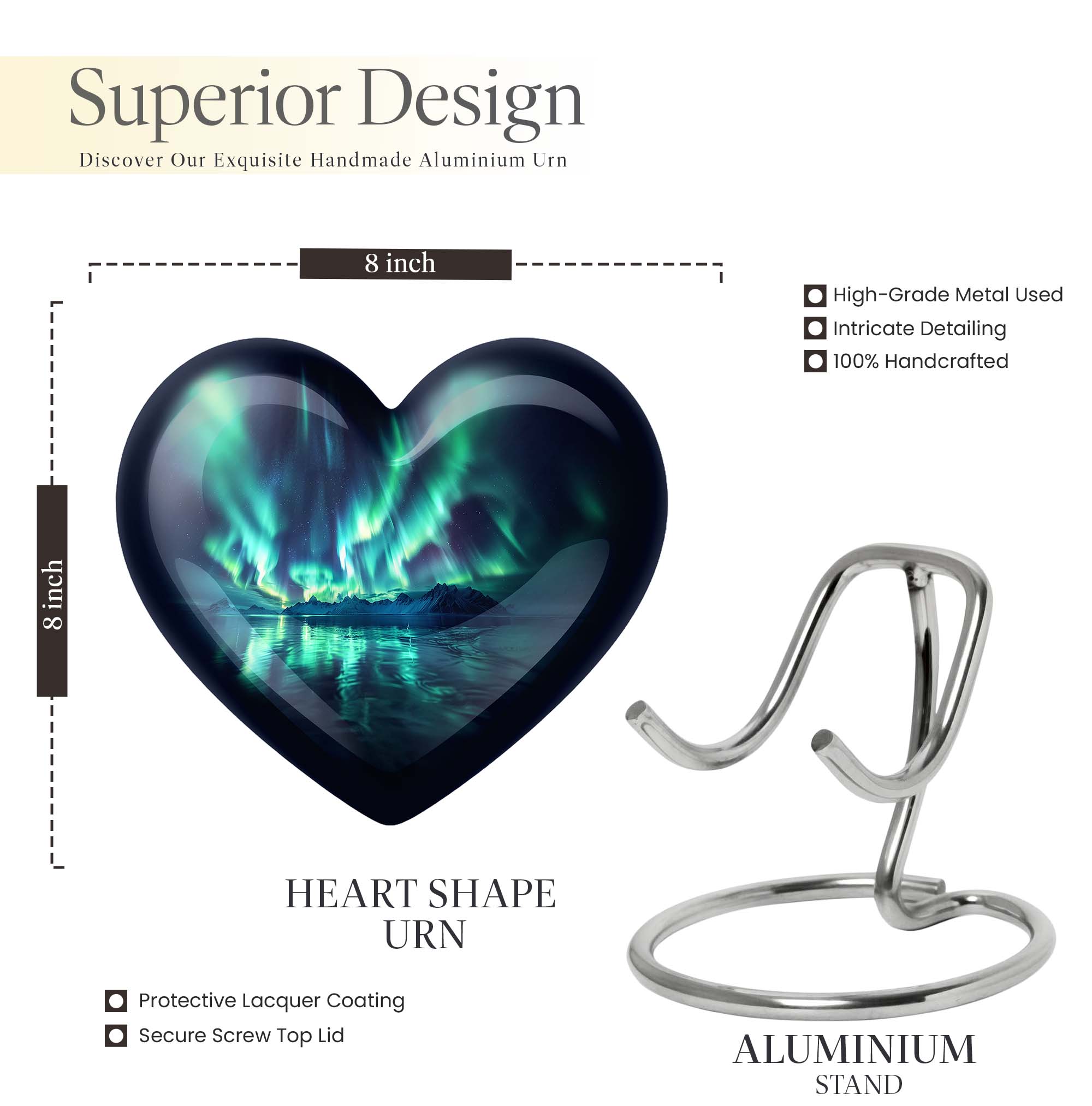 Elegantly crafted and inspired by Northern Lights, this 'Heart Urn' cremation urn is ideal for those seeking solace in memorializing their loved ones in a unique way. Our large urn is constructed from high-quality, durable aluminium, ensuring it will weather the test of time, whether buried or placed in a special location at home. The urn measures 10 inches in height and weighs 3.3 pounds, offering a capacity of 200 cubic inches - suitable for most adults. Adorned with a beautiful butterfly theme, this urn showcases a perfect blend of strength and delicacy. The package also includes a velvet pouch, providing a dignified way to hold the ashes of your dearly departed. Further, add a personal touch with our customization options that allow you to engrave the name of your loved one, cherishing their memory for a lifetime. Distinct and eminent, these specially created funeral urns, suitable for both male and female, reflect your deep and personal affection for your beloved ones. Embrace this heartfelt way of honouring your beloved mother or any female figure in your life.