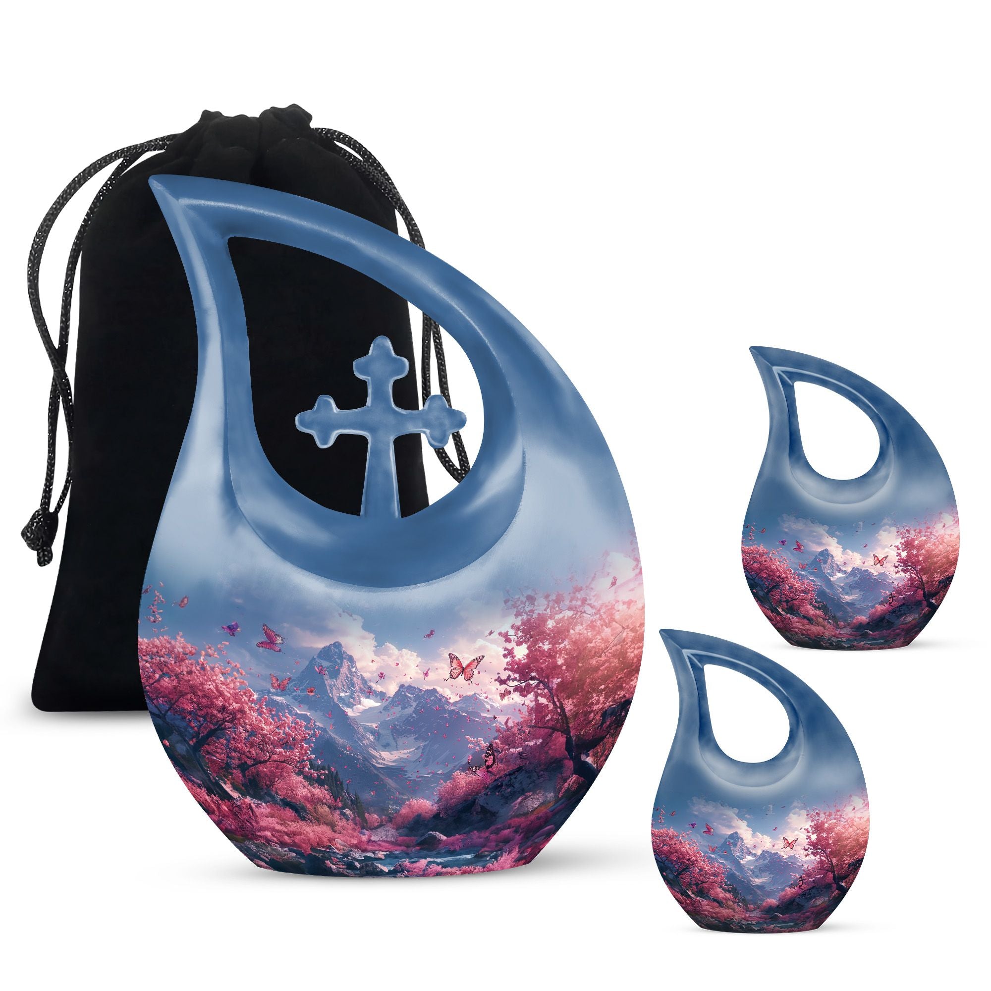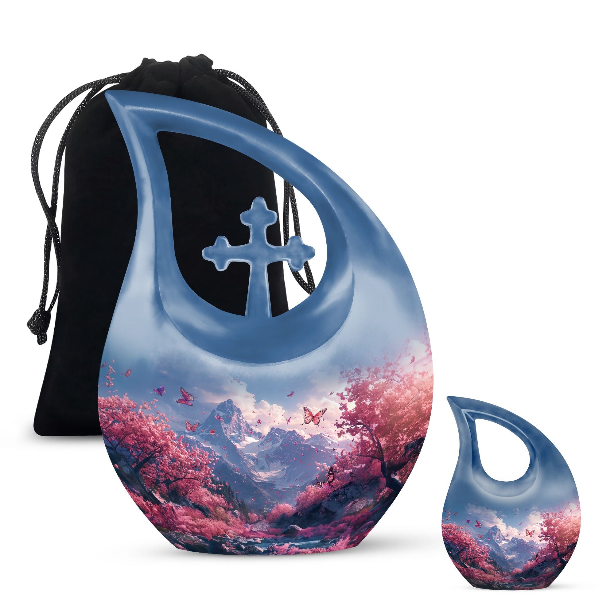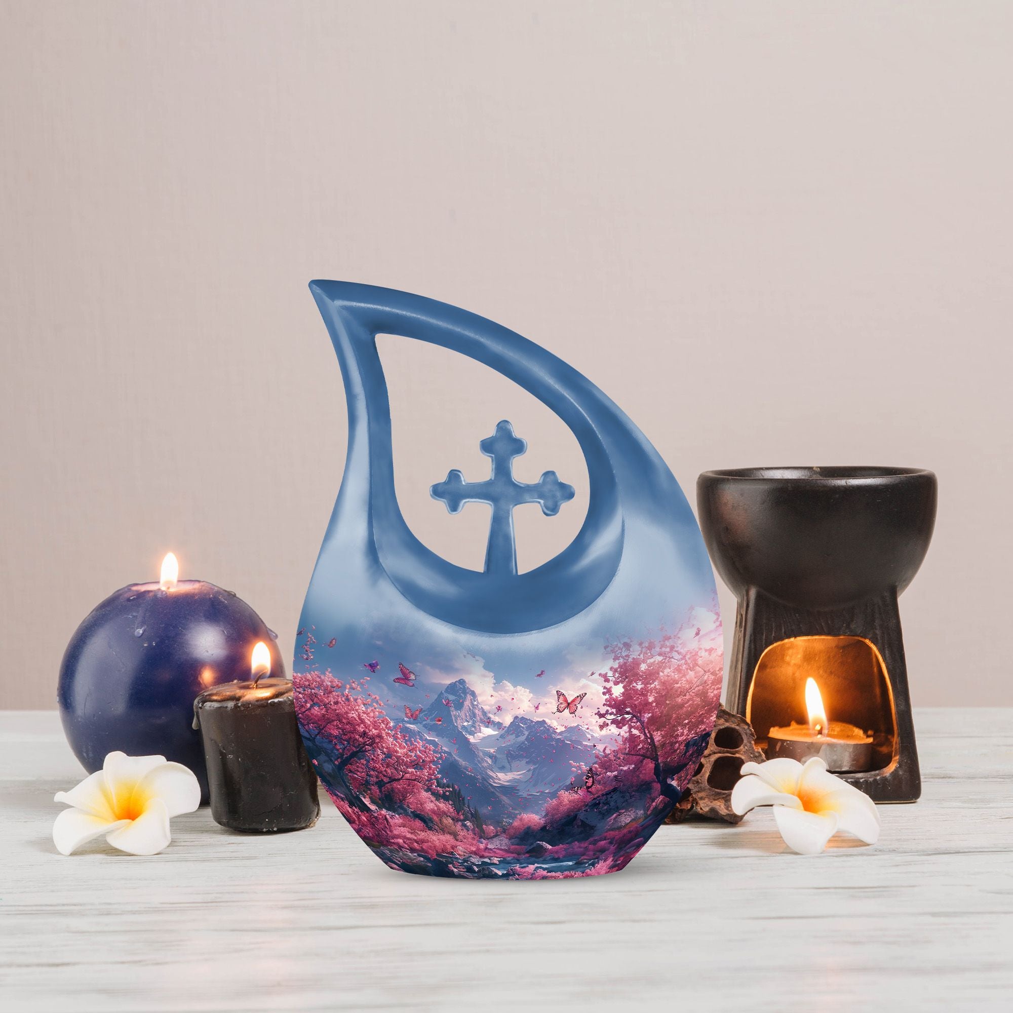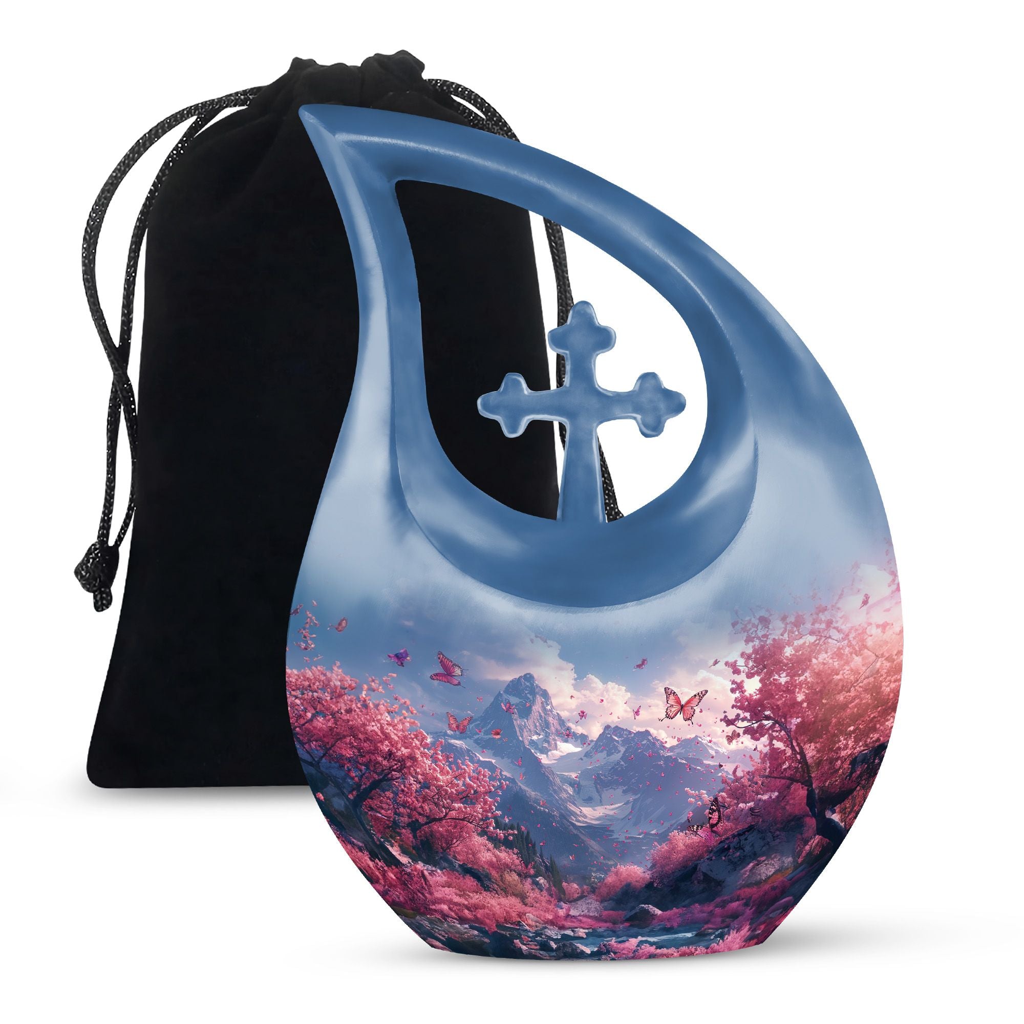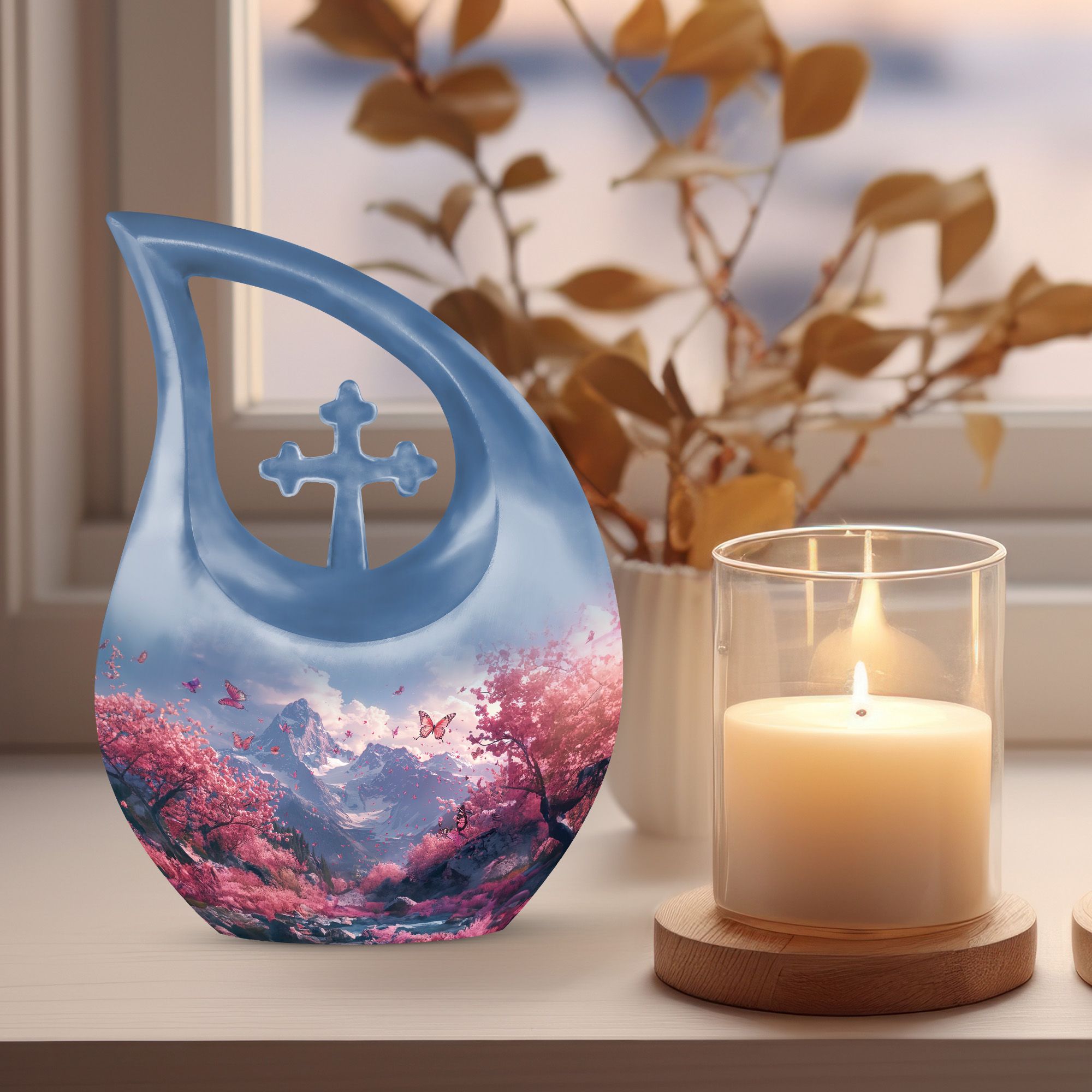 The Pink Butterfly Cross Drop Urn for Ashes captures the beauty of transformation, faith, and eternal love. Adorned with delicate cherry blossoms and butterfly artwork, this urn represents renewal and serenity — a fitting tribute for honoring your loved one’s memory. Crafted for both men and women, it serves beautifully as an urn for human ashes adult male or female memorial urn.