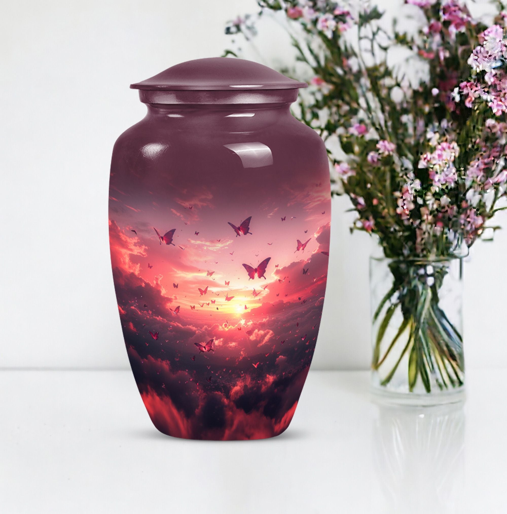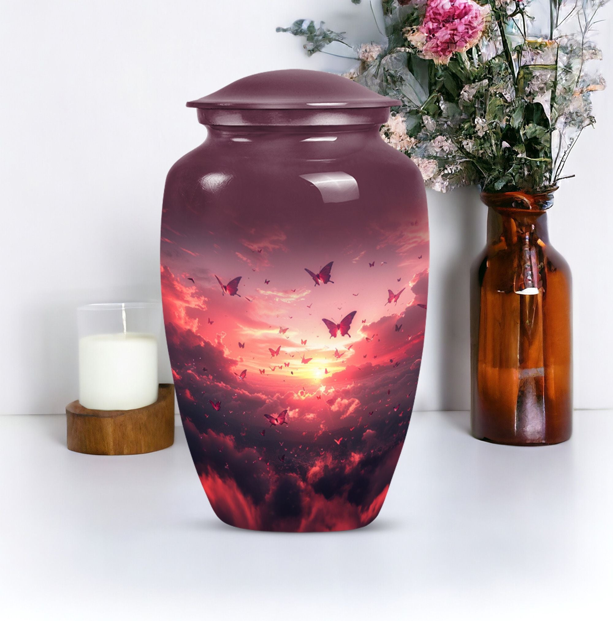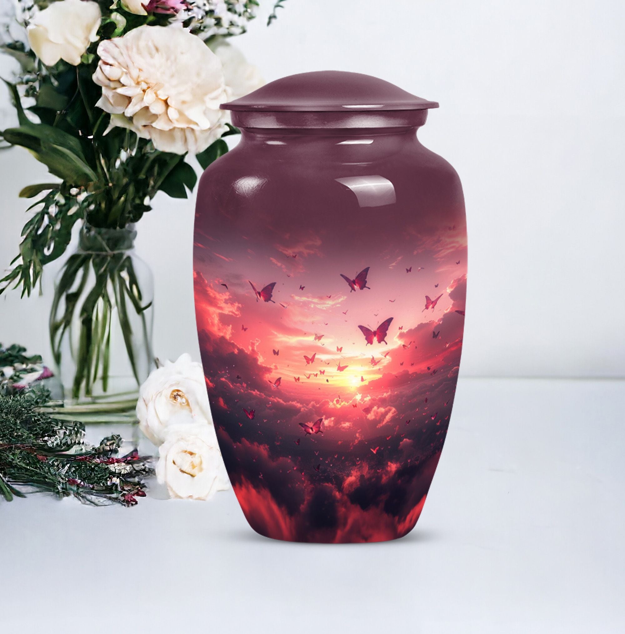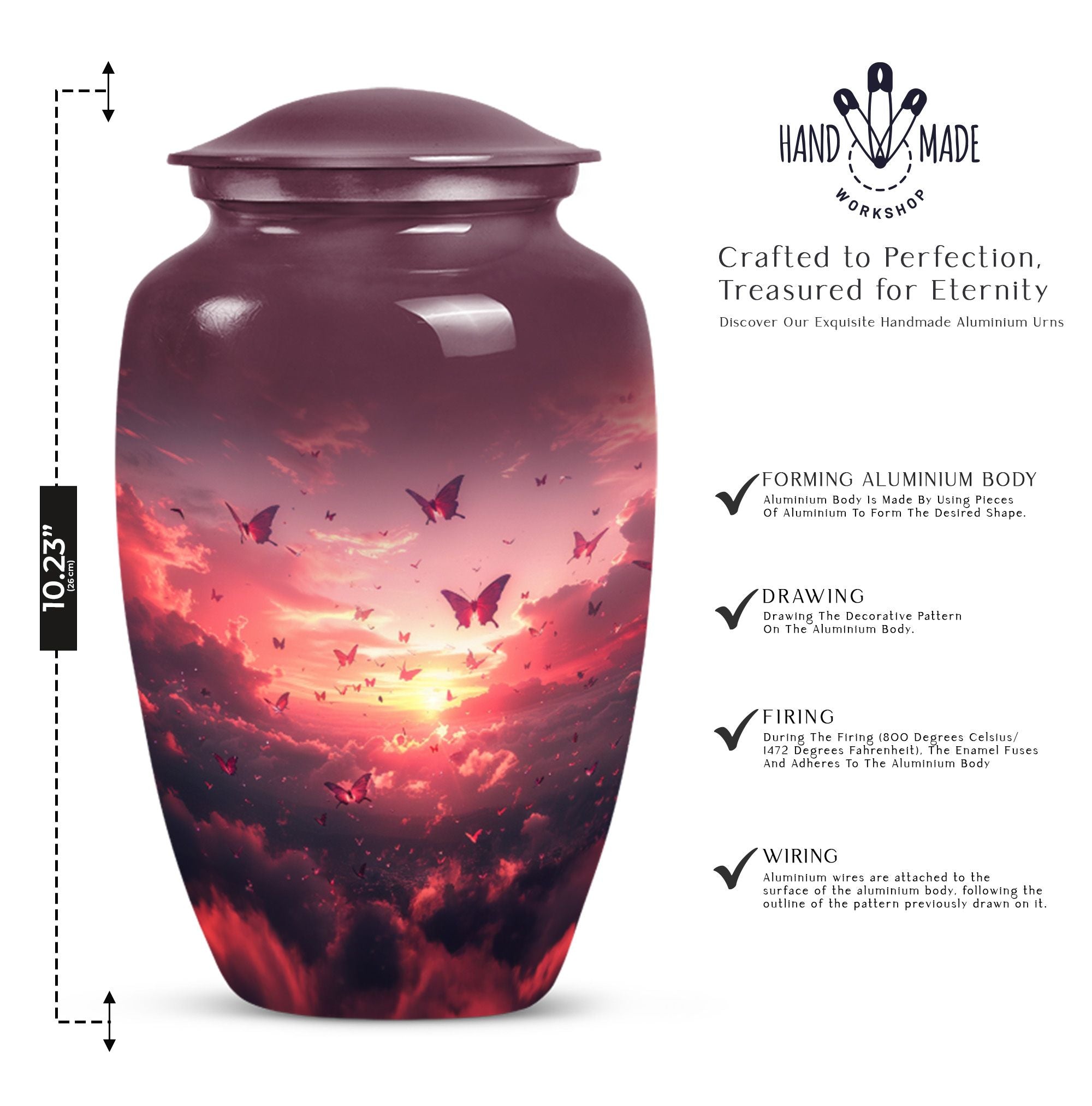Cherish your dearly departed with the elegant 10-inch Pink Butterfly Urn, a premium-grade burial cremation urn meticulously crafted from sturdy aluminium material. This large urn weighs 3.3 pounds and boasts a classic design for a sober, poignant tribute to your lost loved one. Our funeral urn for adult human ashes holds a capacity of 200 cubic inches, gracefully shaped like a butterfly symbolising the freeing of the spirit and the transition into a new phase of existence. The package includes a velvet pouch, a chic and respectful way to securely encase the ashes. With the option to personalize it with engraved names, our urn becomes a heartfelt token of remembrance. This uniquely-crafted cremation urn is well-suited for adults and seniors who wish to honour their loved ones in a dignified manner. Its classic appeal and thematic design make it more than just a container, transforming it into a piece of memorial art.