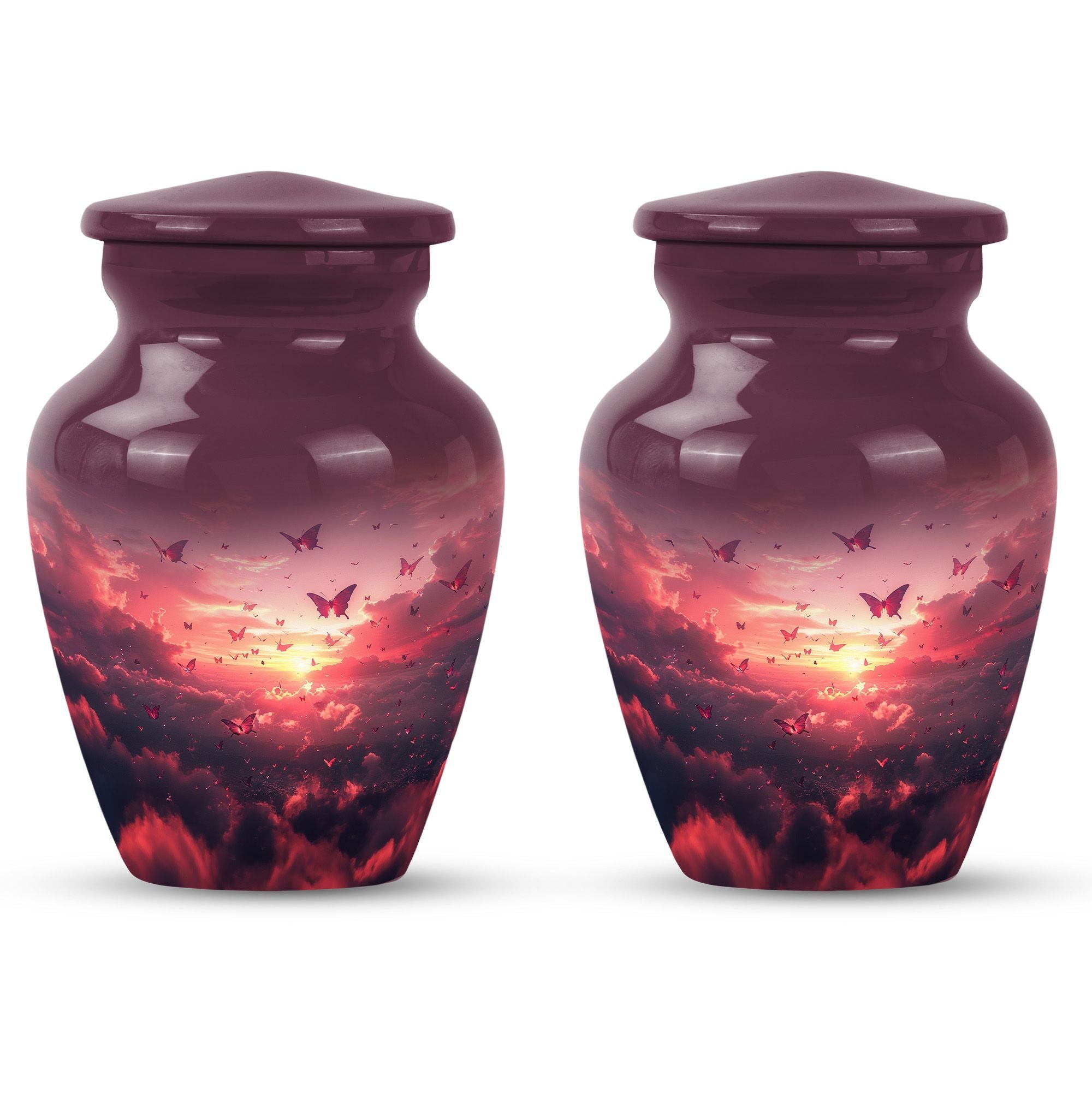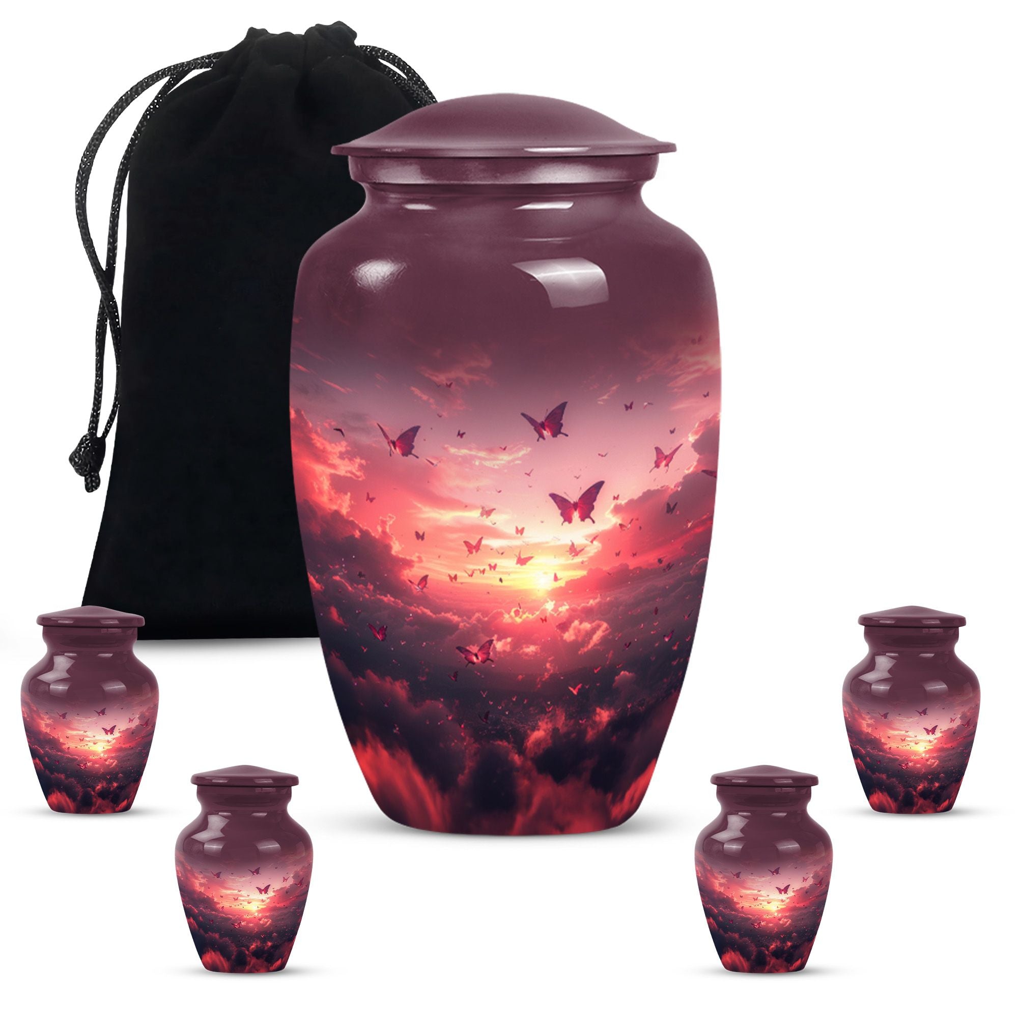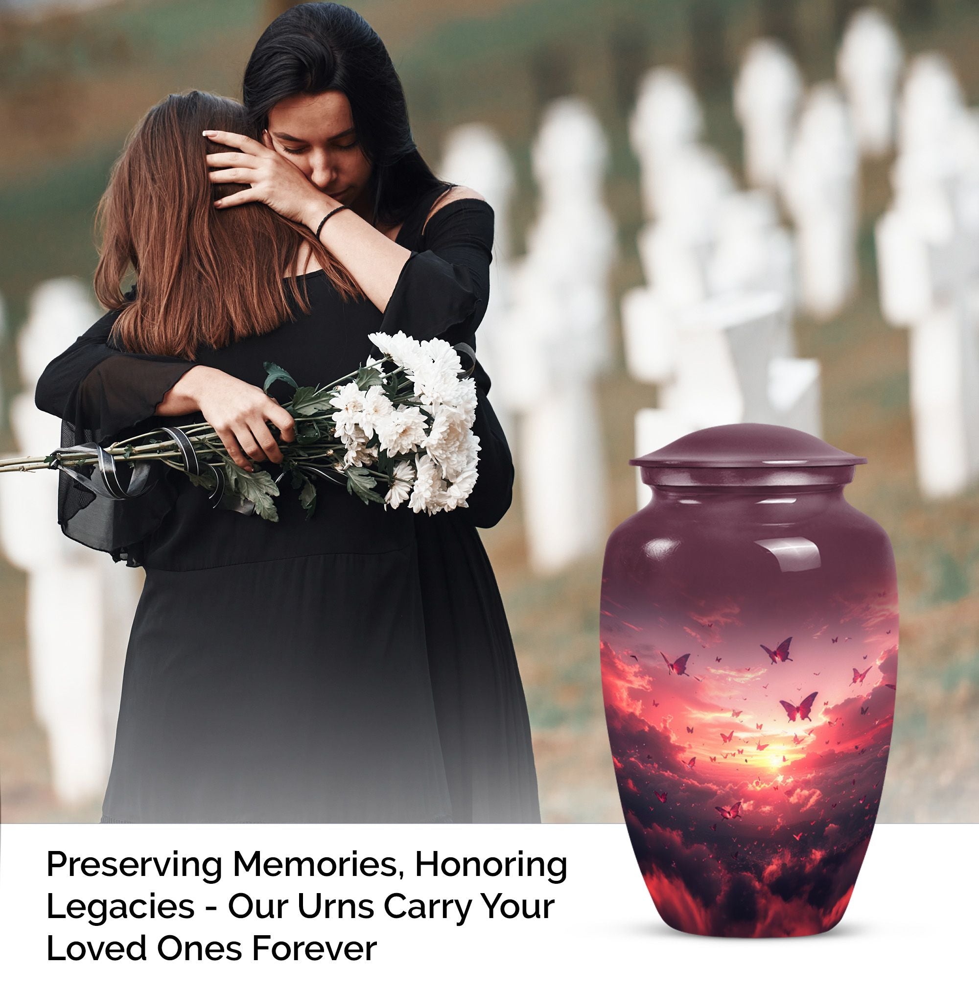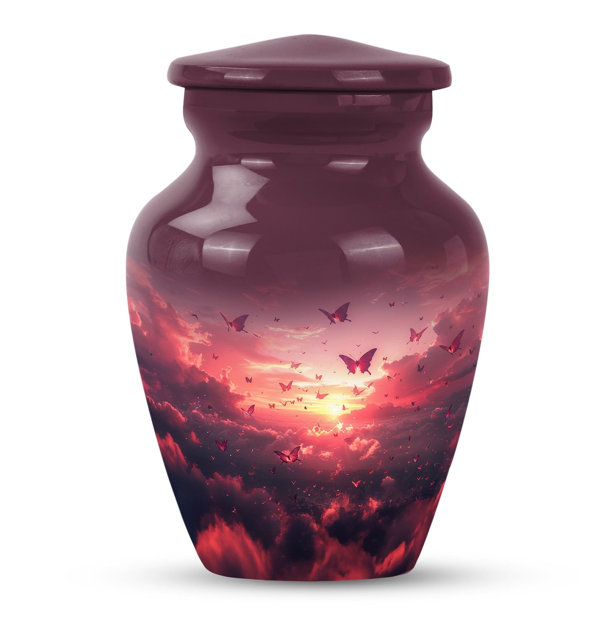 Cherish your dearly departed with the elegant 10-inch Pink Butterfly Urn, a premium-grade burial cremation urn meticulously crafted from sturdy aluminium material. This large urn weighs 3.3 pounds and boasts a classic design for a sober, poignant tribute to your lost loved one. Our funeral urn for adult human ashes holds a capacity of 200 cubic inches, gracefully shaped like a butterfly symbolising the freeing of the spirit and the transition into a new phase of existence. The package includes a velvet pouch, a chic and respectful way to securely encase the ashes. With the option to personalize it with engraved names, our urn becomes a heartfelt token of remembrance. This uniquely-crafted cremation urn is well-suited for adults and seniors who wish to honour their loved ones in a dignified manner. Its classic appeal and thematic design make it more than just a container, transforming it into a piece of memorial art.