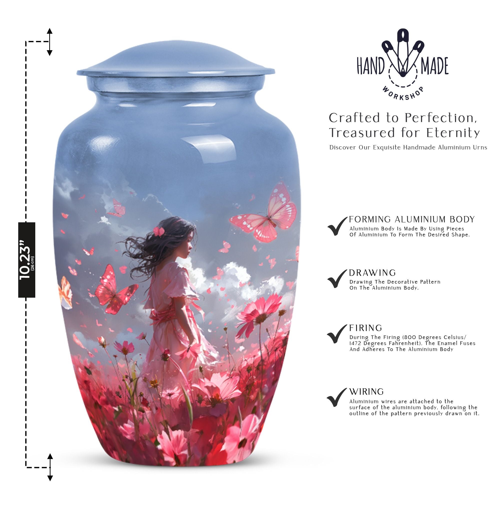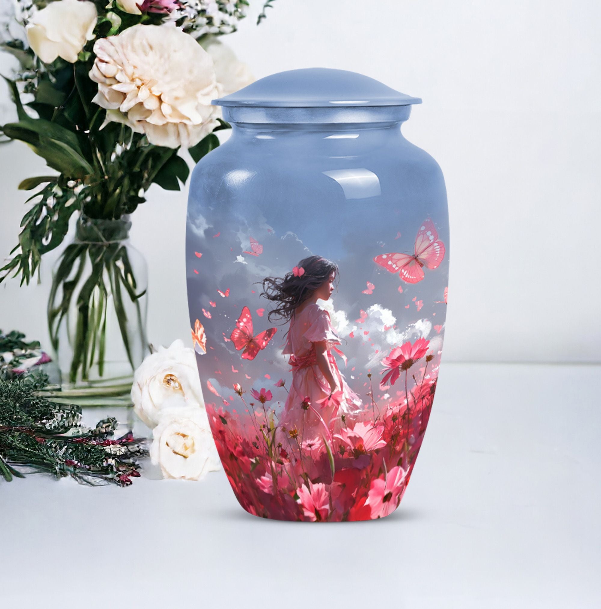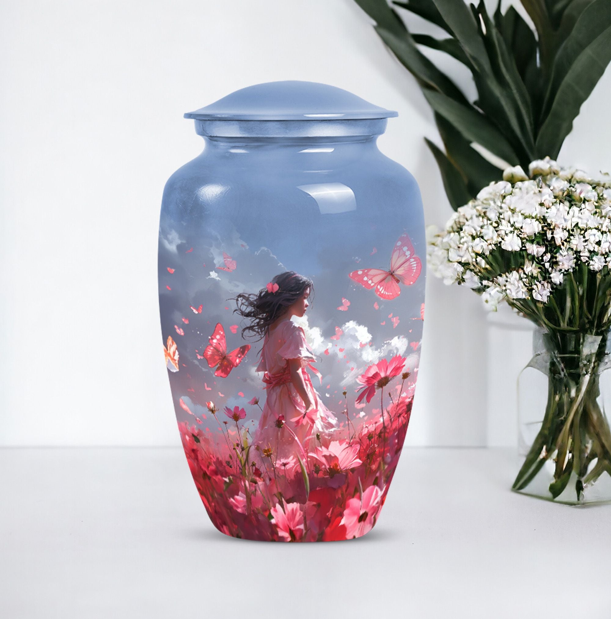 Grace your memories of a loved one, adult male and female alike, with our pink butterfly urn, a testament to life's fleeting beauty. Our 10-inch urn, emerging from aluminium, evokes a classic, enduring sentiment. Its butterfly theme is tastefully executed, paying homage to the transformation and journey of the soul. Weighing 3.3 pounds, this large urn measures precisely 10 inches in height and can accommodate 200 cubic inches of ashes. It excels in every functional aspect and transcends into an aesthetic masterpiece, never distracting from its noble purpose. The urn comes with a velvet pouch, treating your loved one's ashes with dignity and respect. And for a truly touching tribute, this urn can be personalized with engraved names. Preferred keywords for this product are 'pink butterfly urn,' 'memorial urns,' 'funeral urns for human ashes,' and 'funeral urns for adult ashes women large.' Make those heartfelt moments count with our dignified urns.