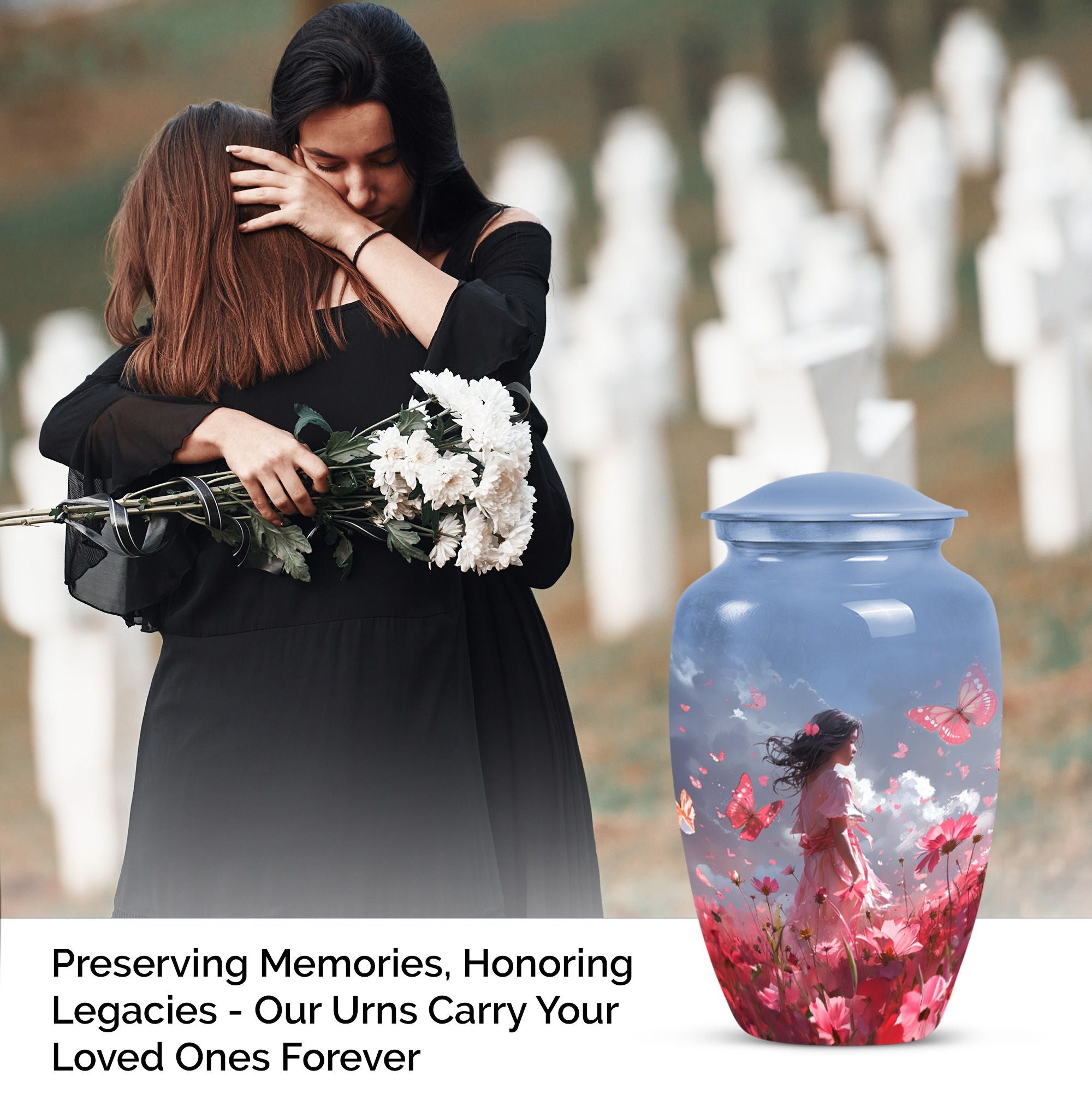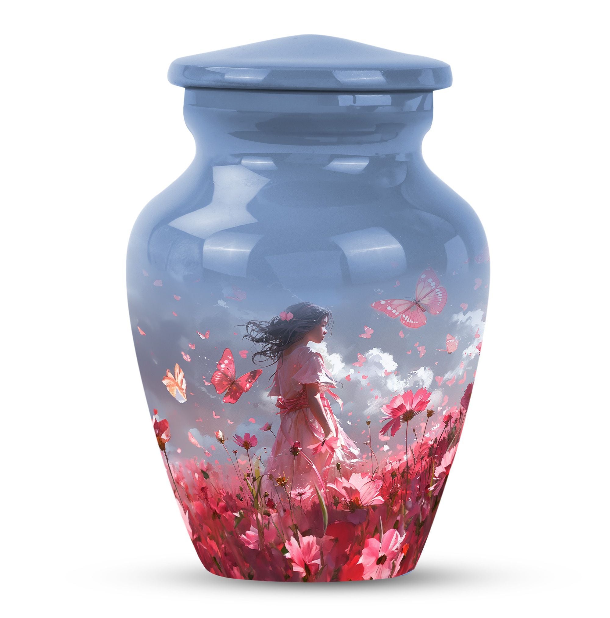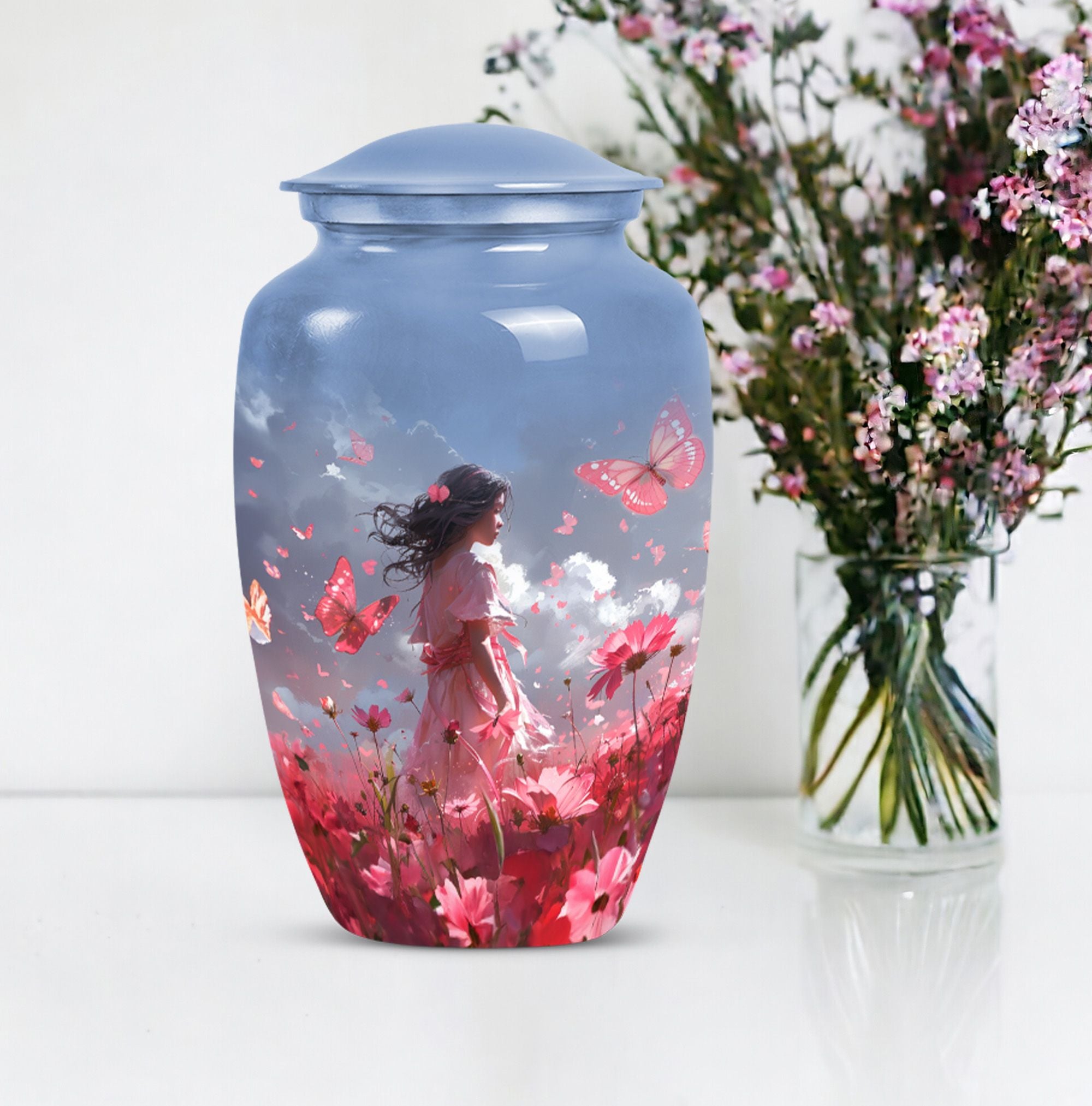 Grace your memories of a loved one, adult male and female alike, with our pink butterfly urn, a testament to life's fleeting beauty. Our 10-inch urn, emerging from aluminium, evokes a classic, enduring sentiment. Its butterfly theme is tastefully executed, paying homage to the transformation and journey of the soul. Weighing 3.3 pounds, this large urn measures precisely 10 inches in height and can accommodate 200 cubic inches of ashes. It excels in every functional aspect and transcends into an aesthetic masterpiece, never distracting from its noble purpose. The urn comes with a velvet pouch, treating your loved one's ashes with dignity and respect. And for a truly touching tribute, this urn can be personalized with engraved names. Preferred keywords for this product are 'pink butterfly urn,' 'memorial urns,' 'funeral urns for human ashes,' and 'funeral urns for adult ashes women large.' Make those heartfelt moments count with our dignified urns.